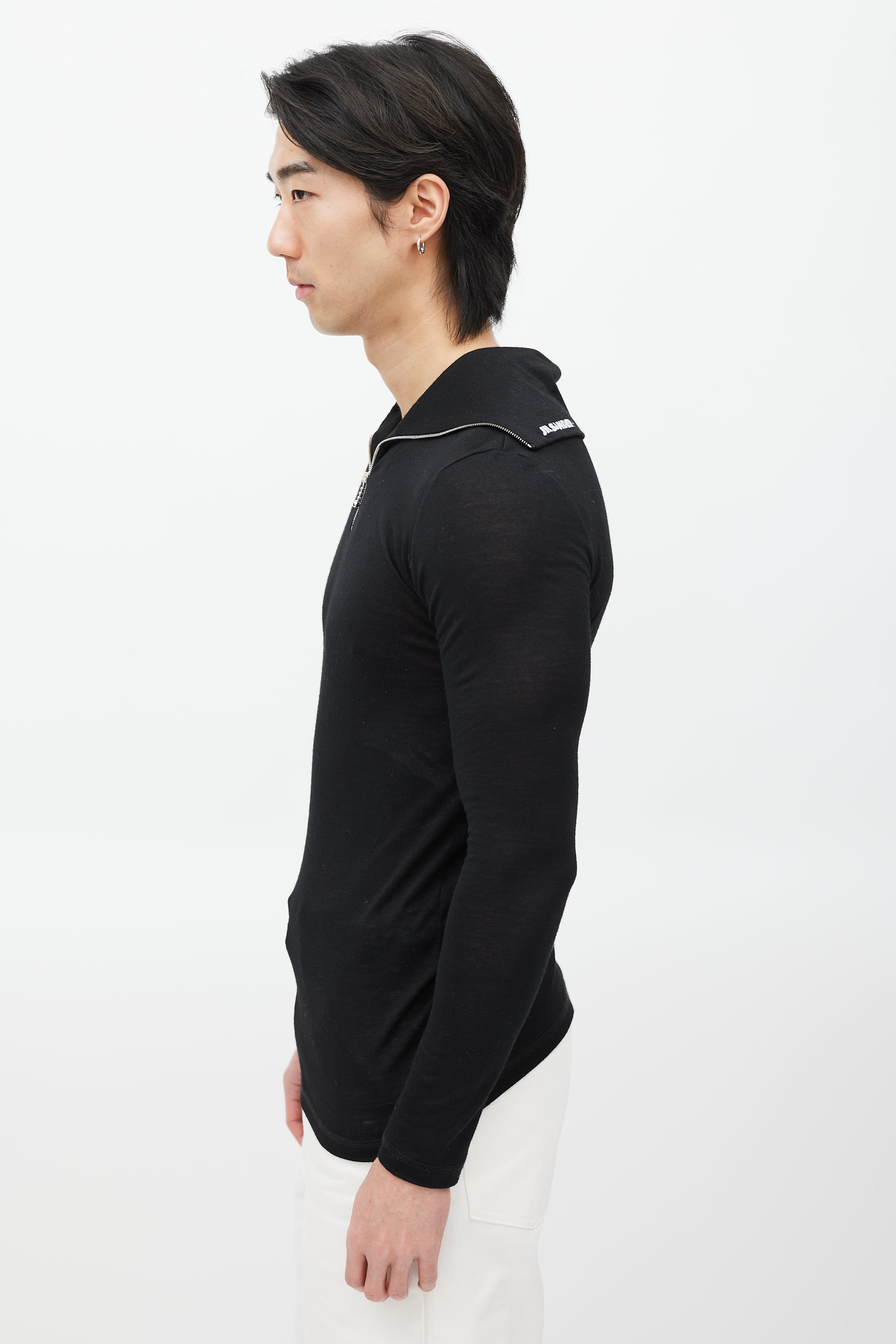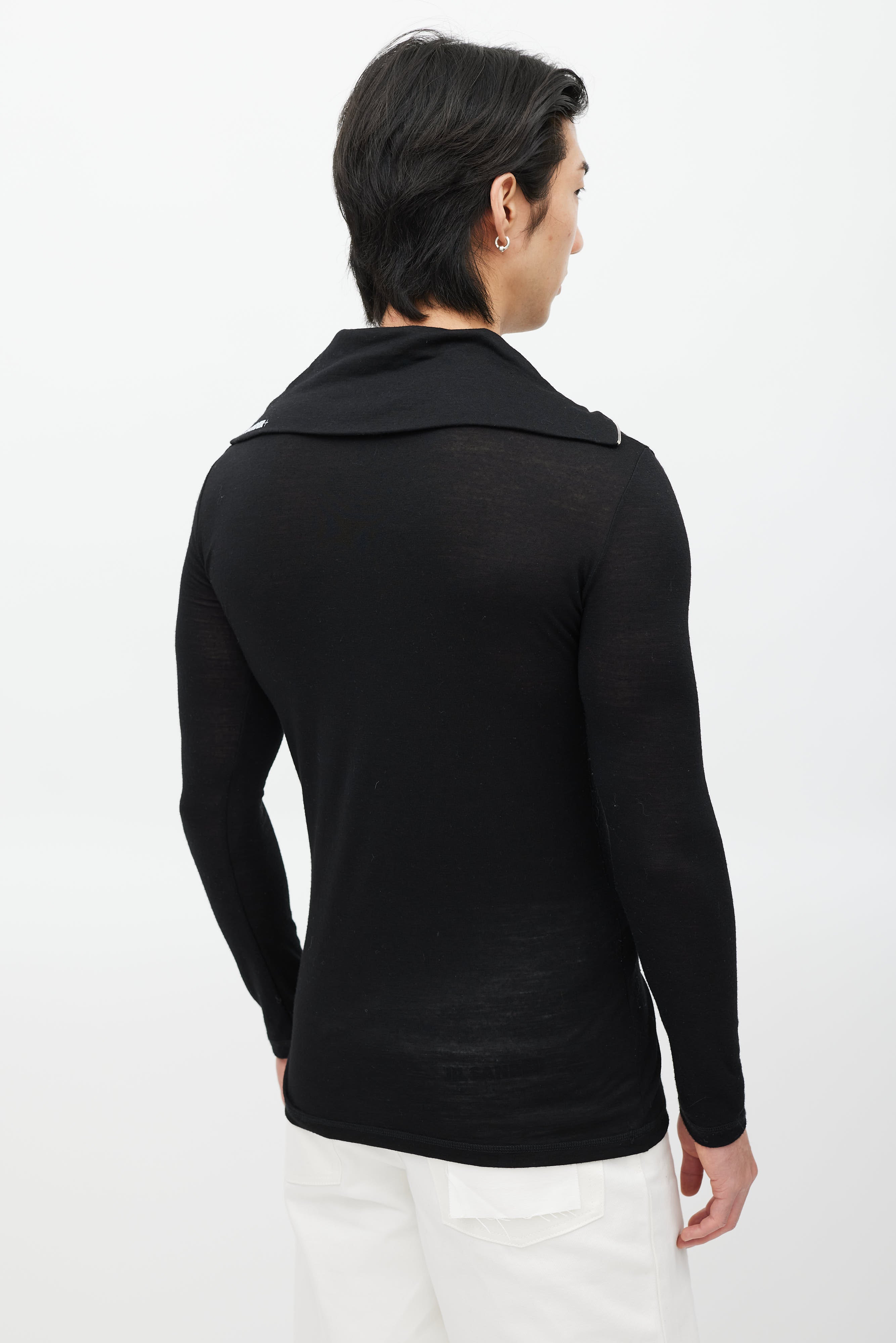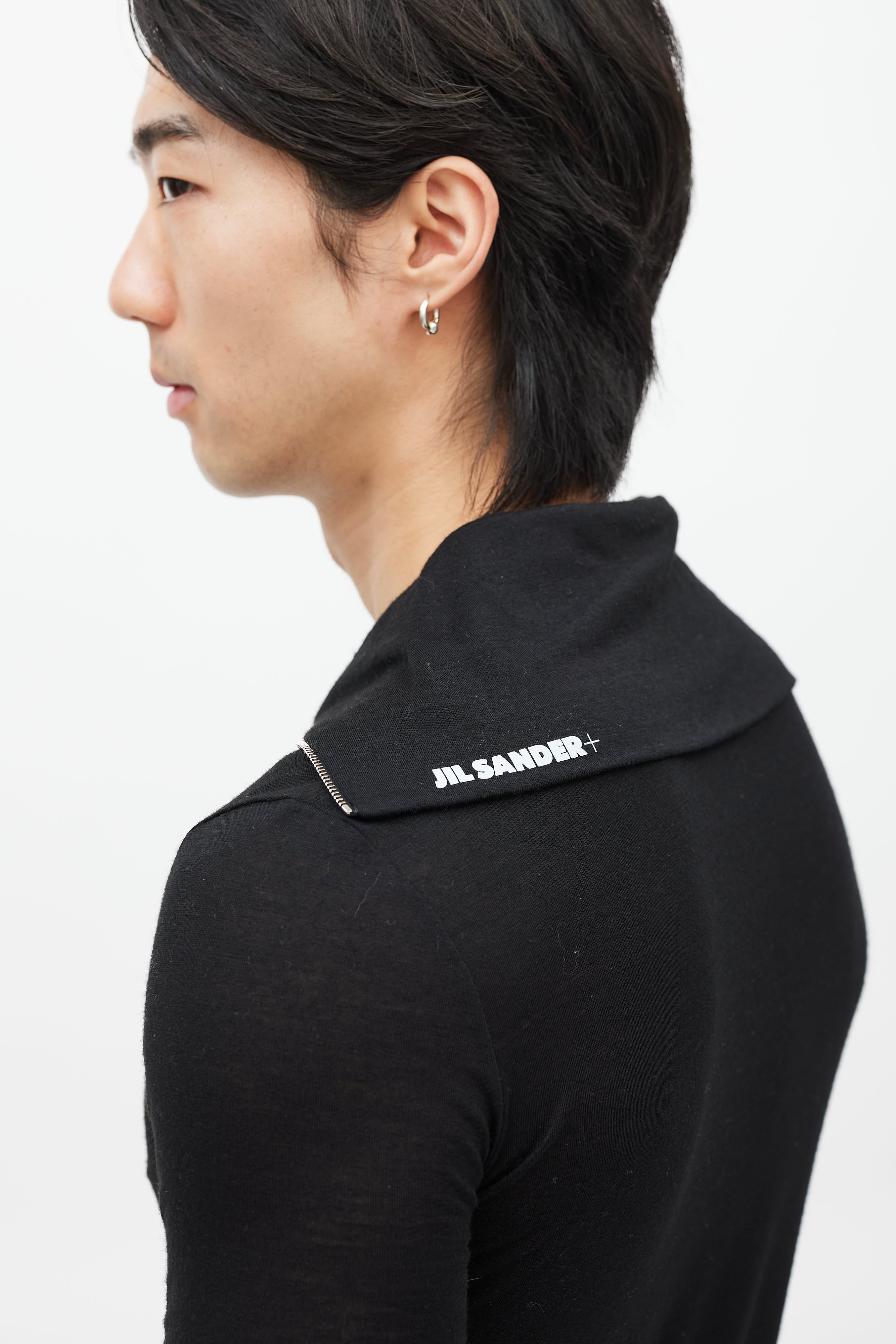 Pre-owned Jil Sander black top featuring a zip sailor collar with white logo print, and long sleeves.