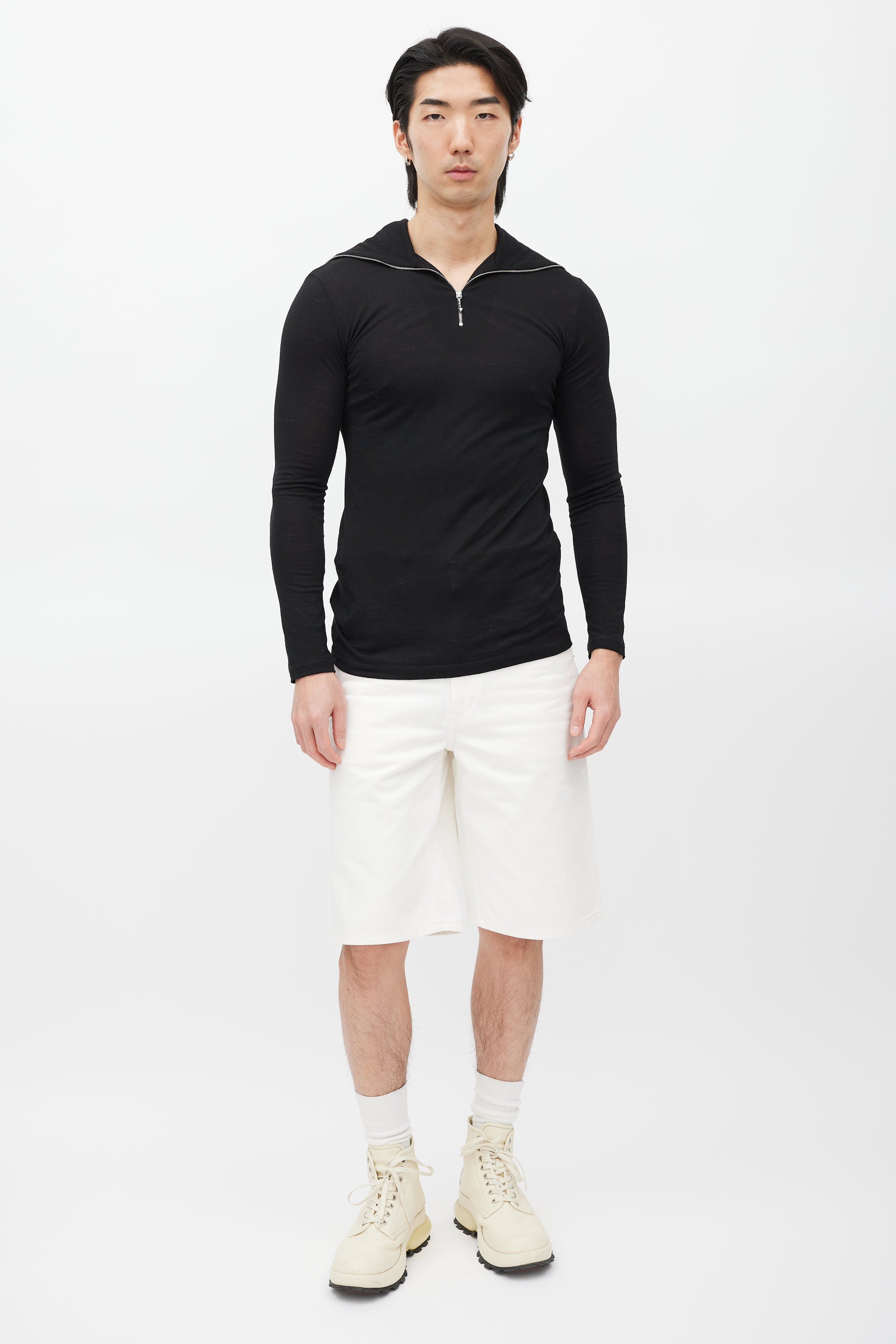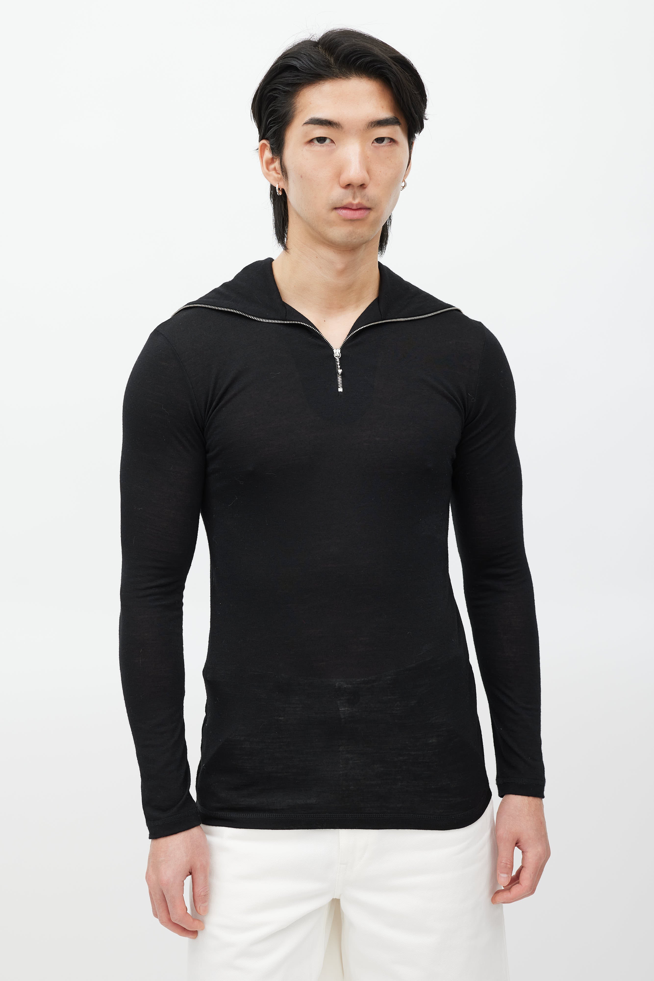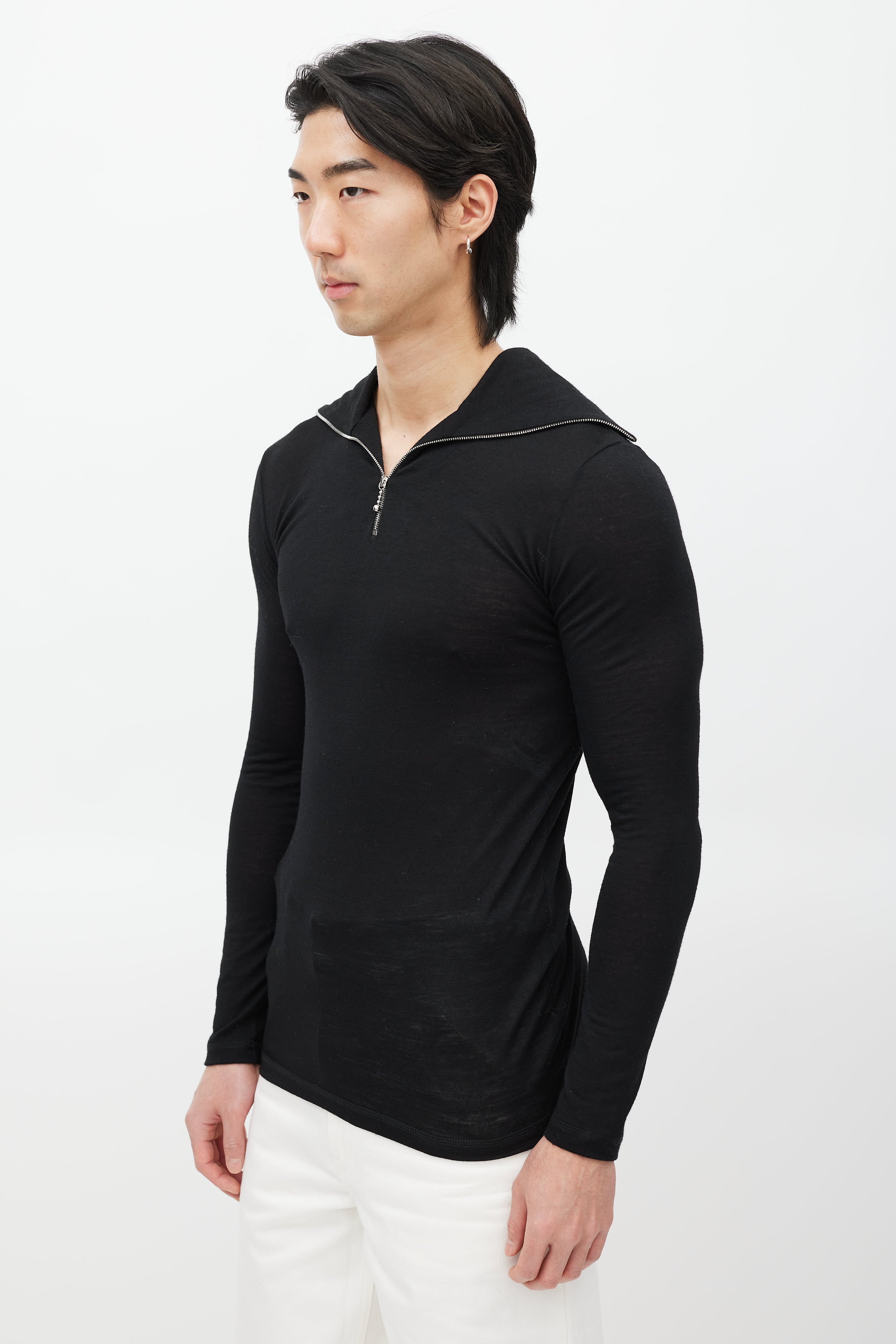 Pre-owned Jil Sander black top featuring a zip sailor collar with white logo print, and long sleeves.