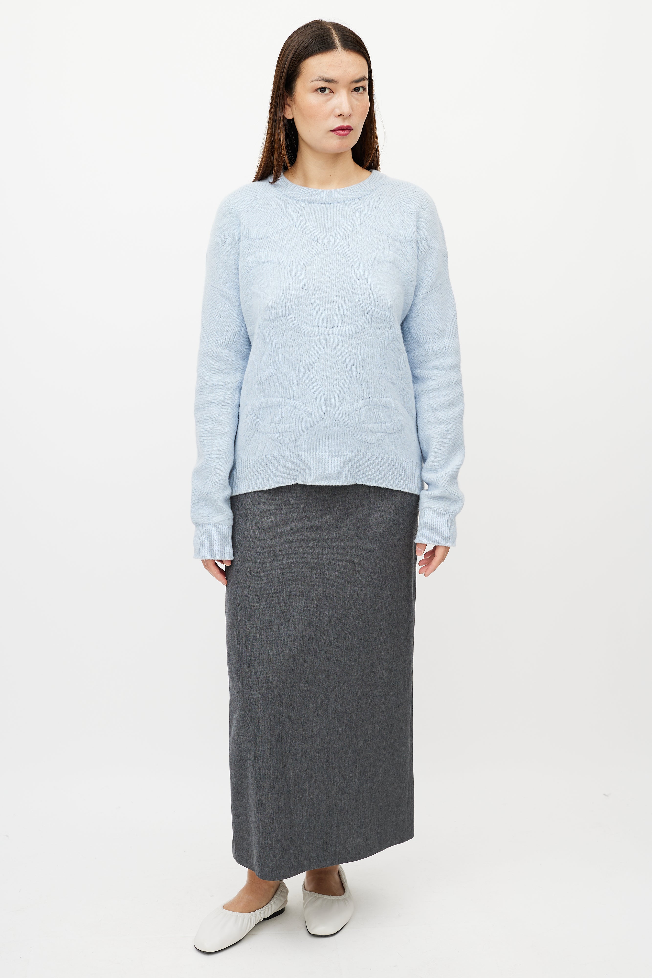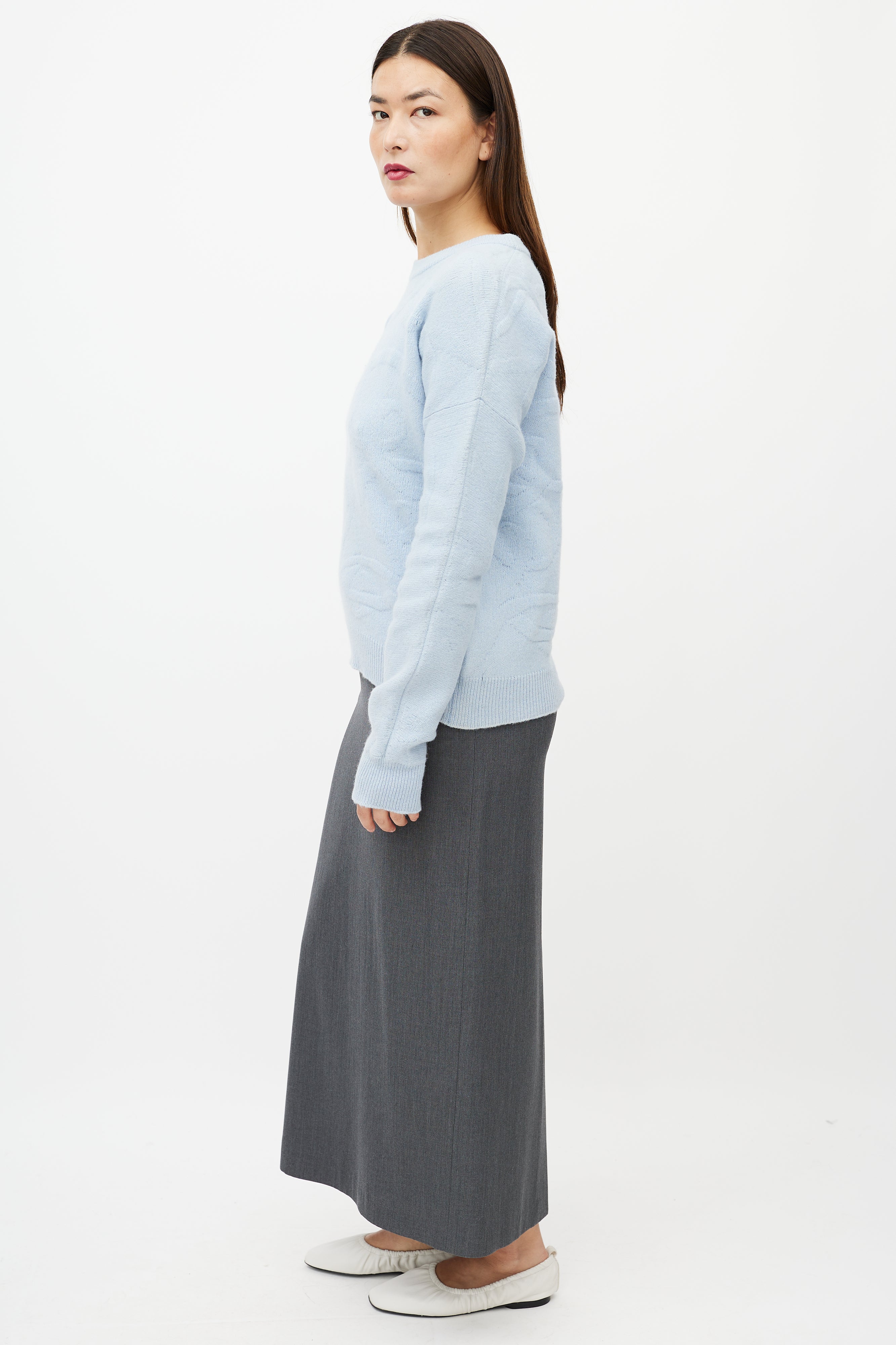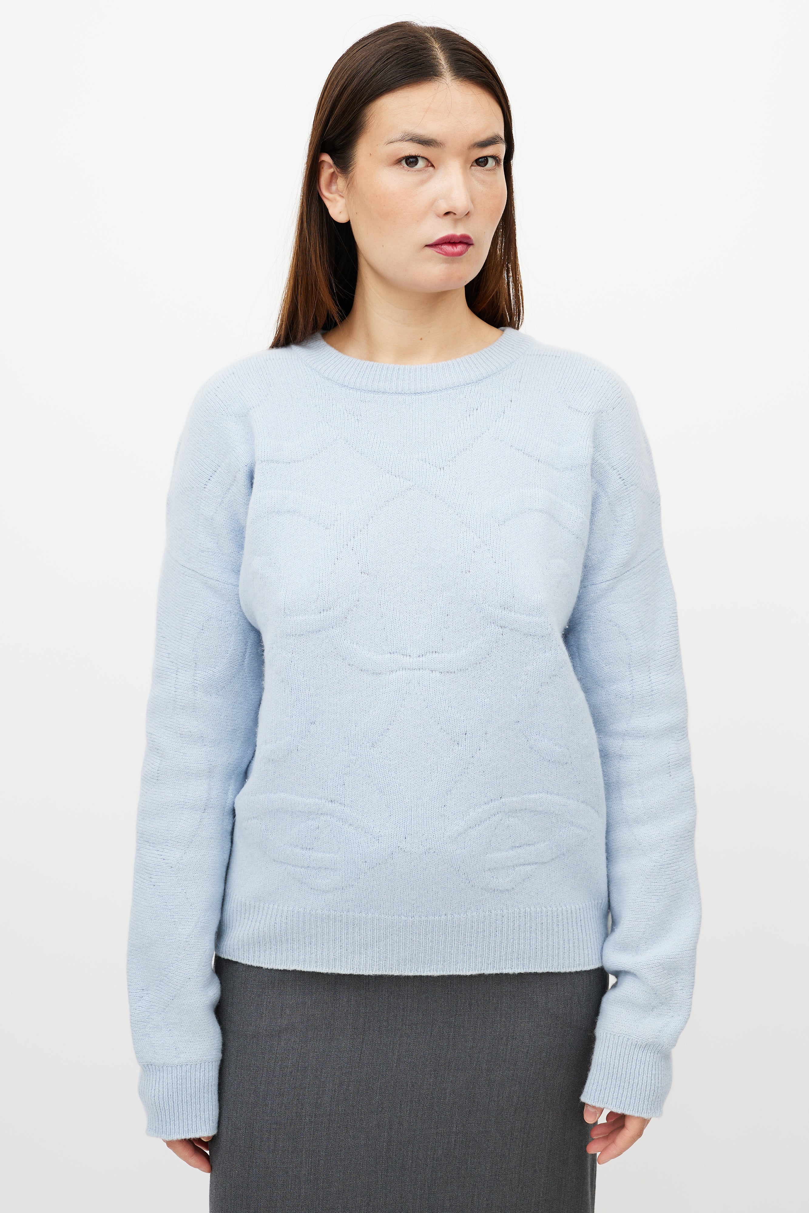 Pre-owned Jil Sander pastel blue wool sweater featuring crew neckline, ribbed hem and cuffs, and abstract intarsia.