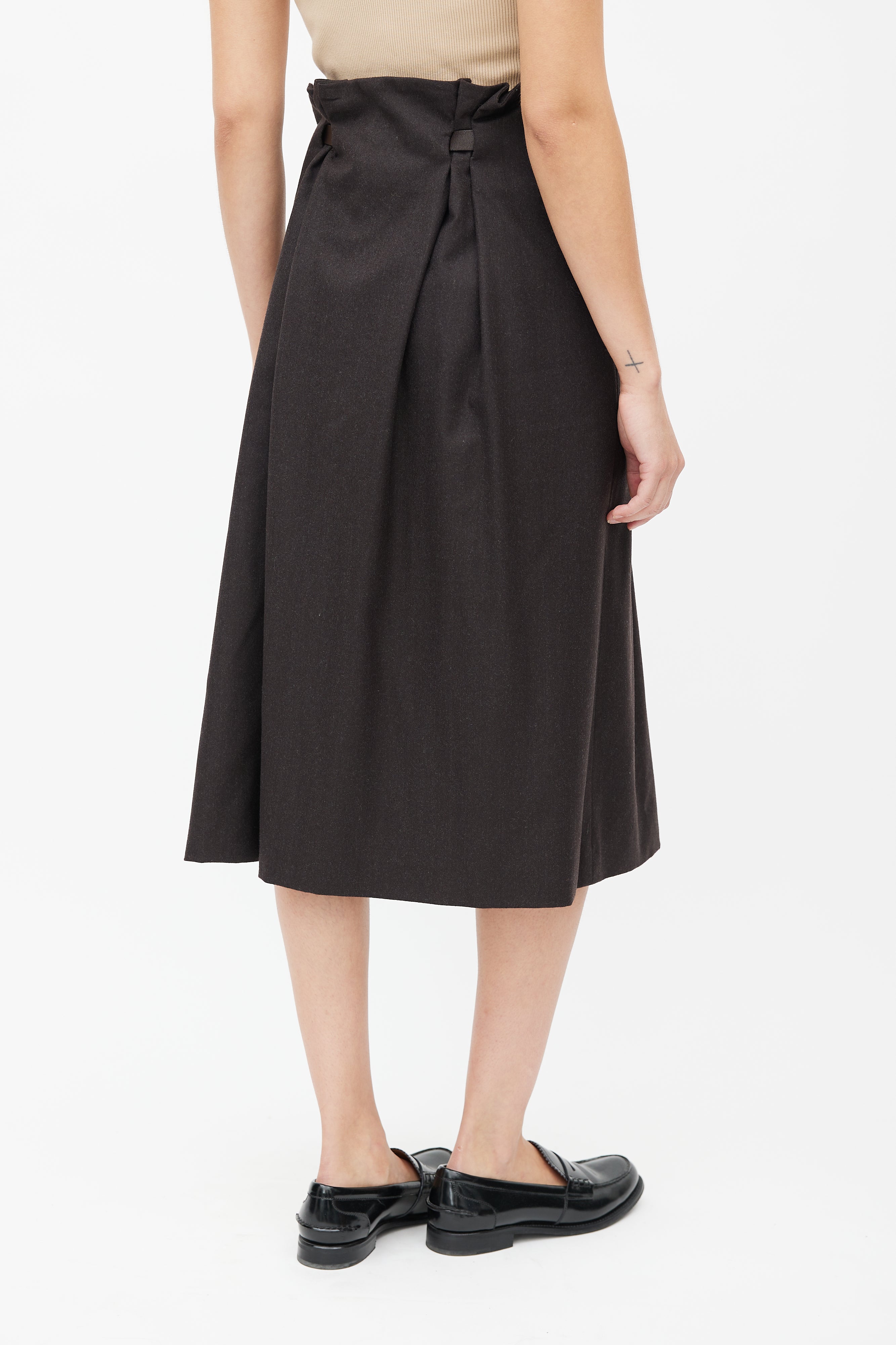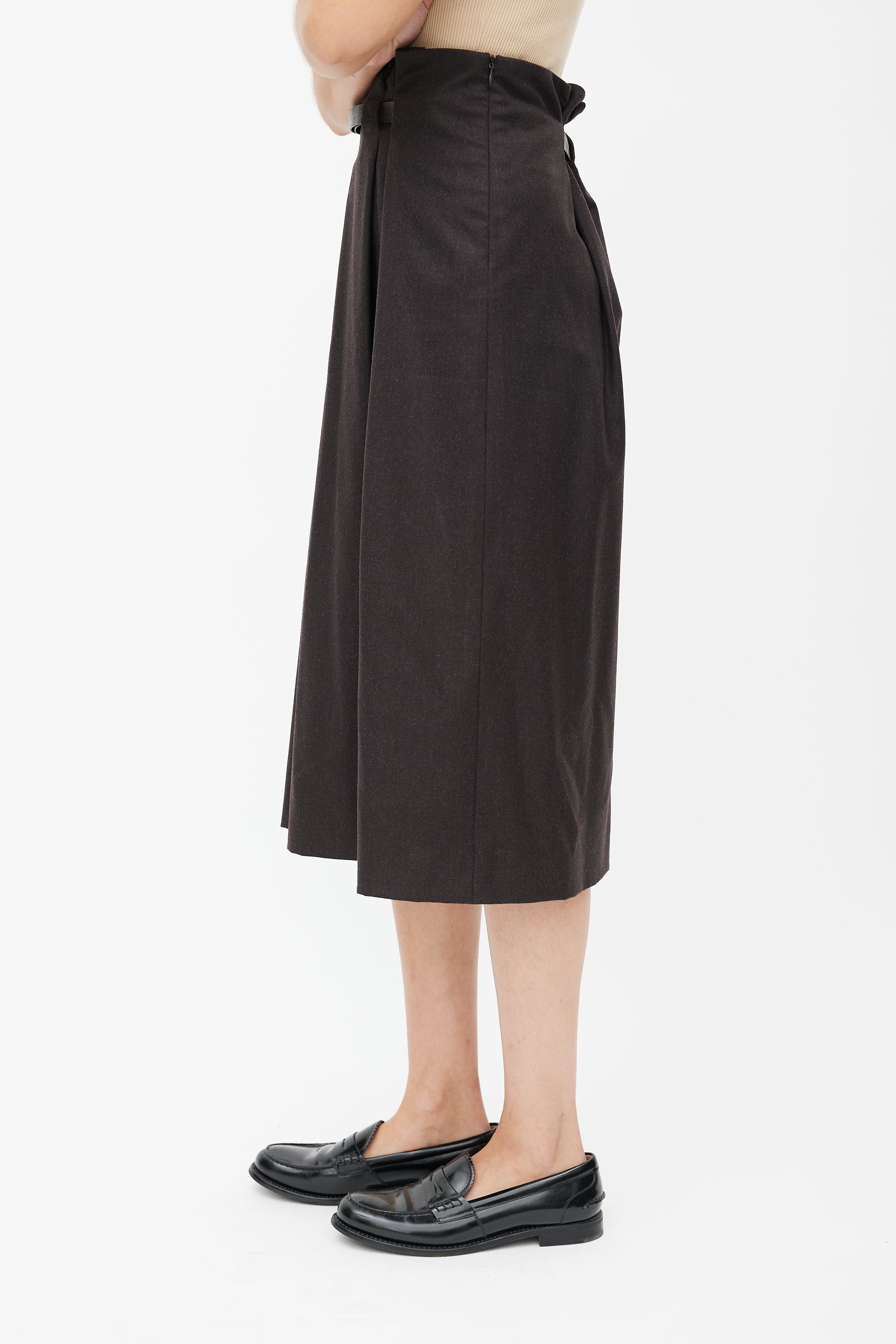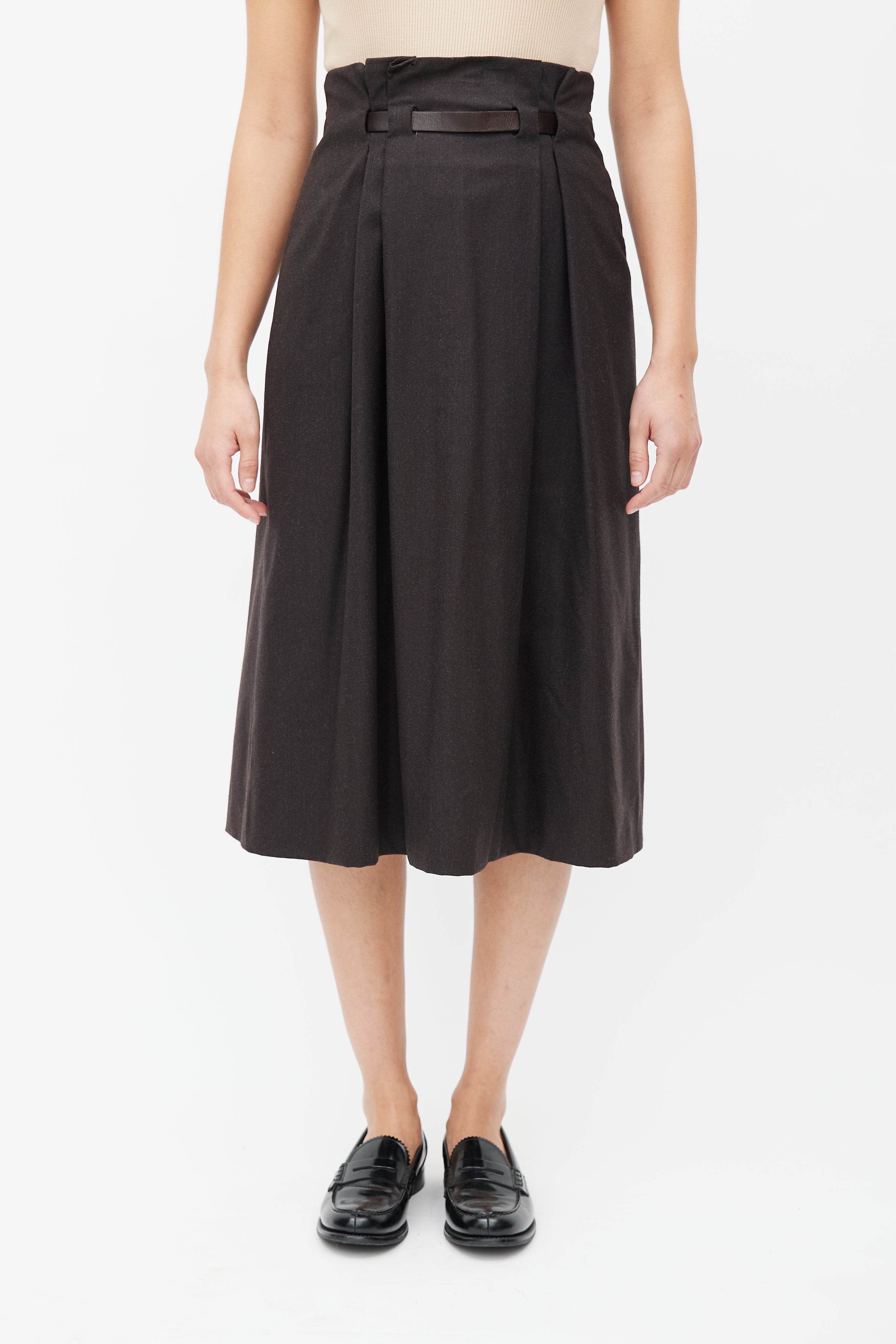 Pre-owned Jil Sander brown wool skirt featuring pleated detailing, interior snap belt, and and zip closure at side. Lined. Clipped to fit model. Lined.