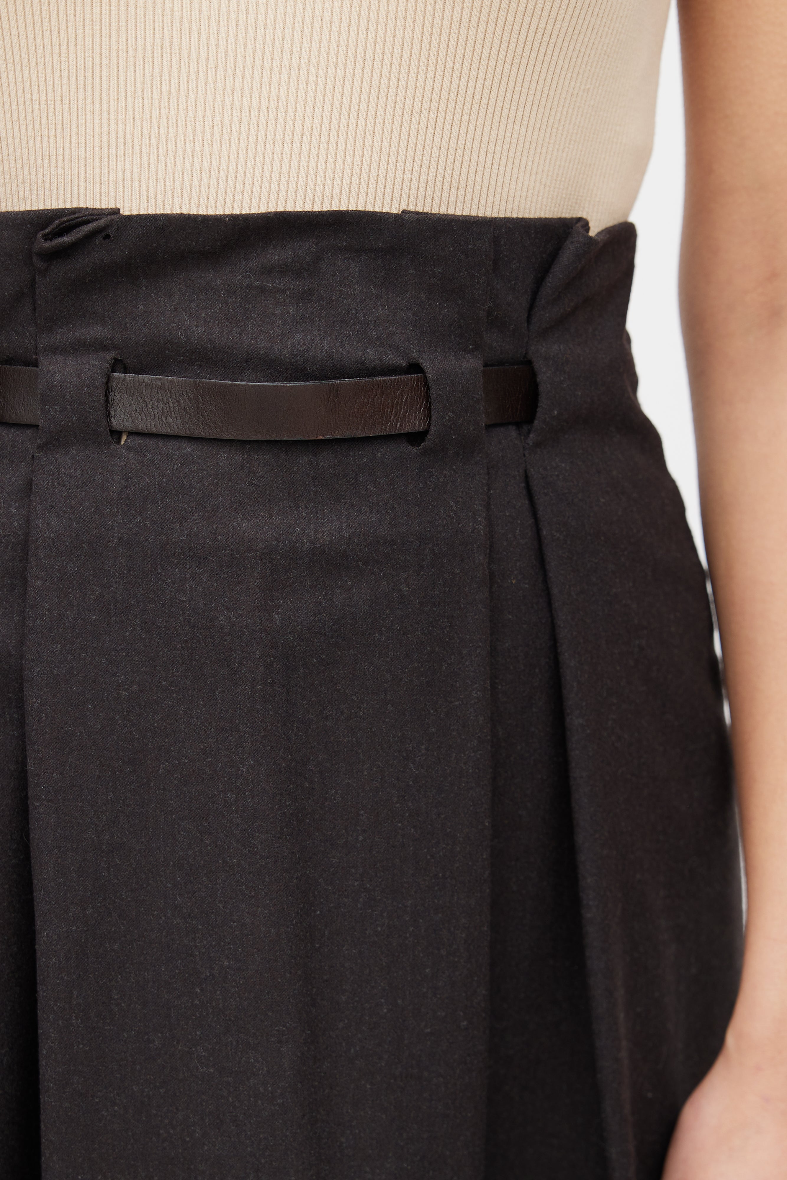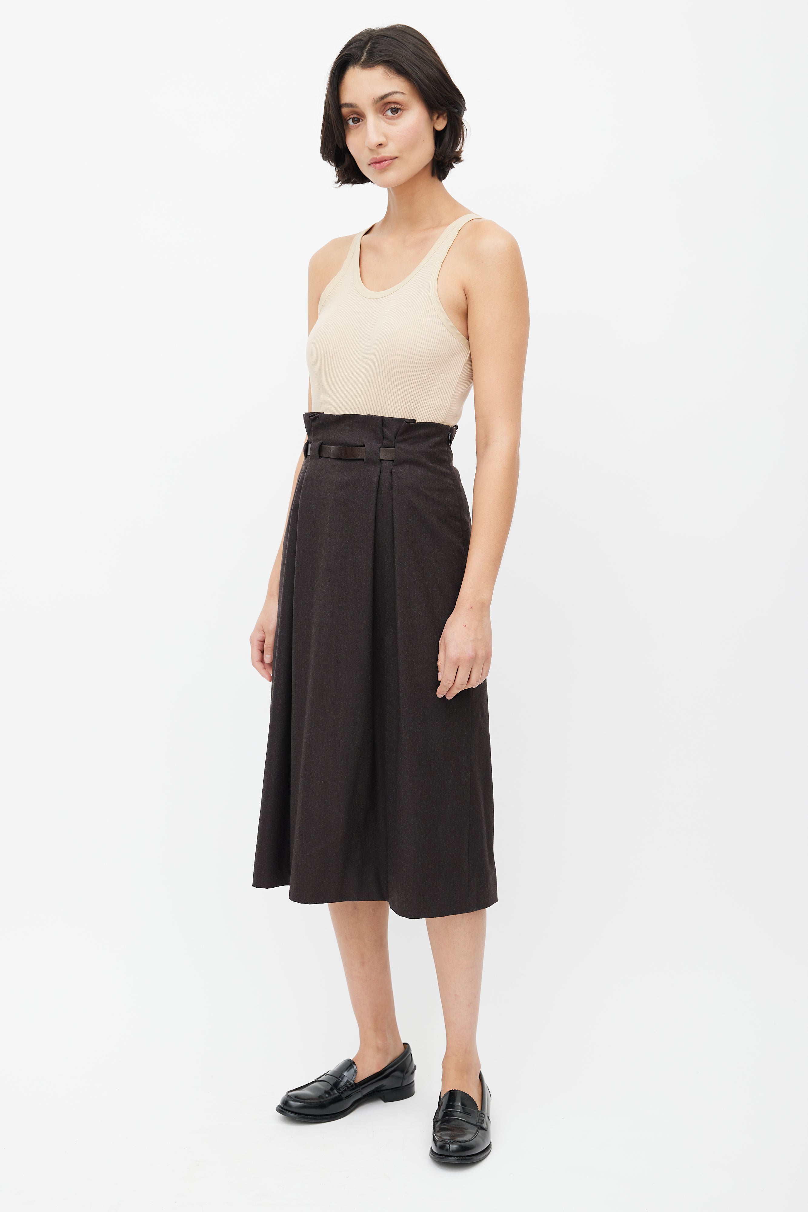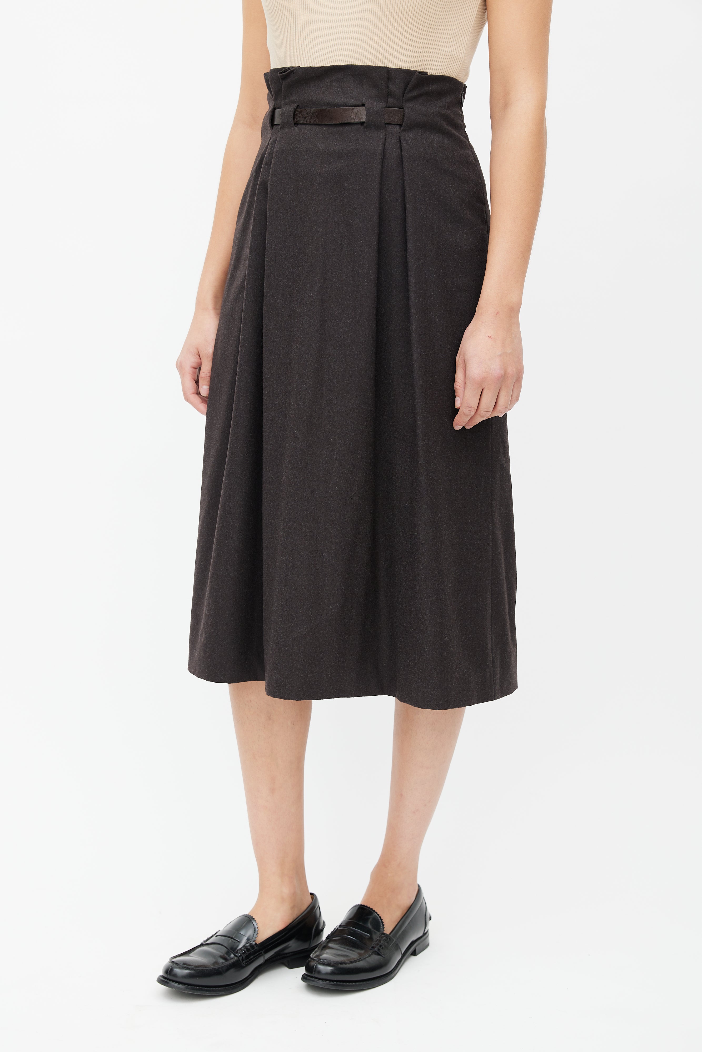 Pre-owned Jil Sander brown wool skirt featuring pleated detailing, interior snap belt, and and zip closure at side. Lined. Clipped to fit model. Lined.