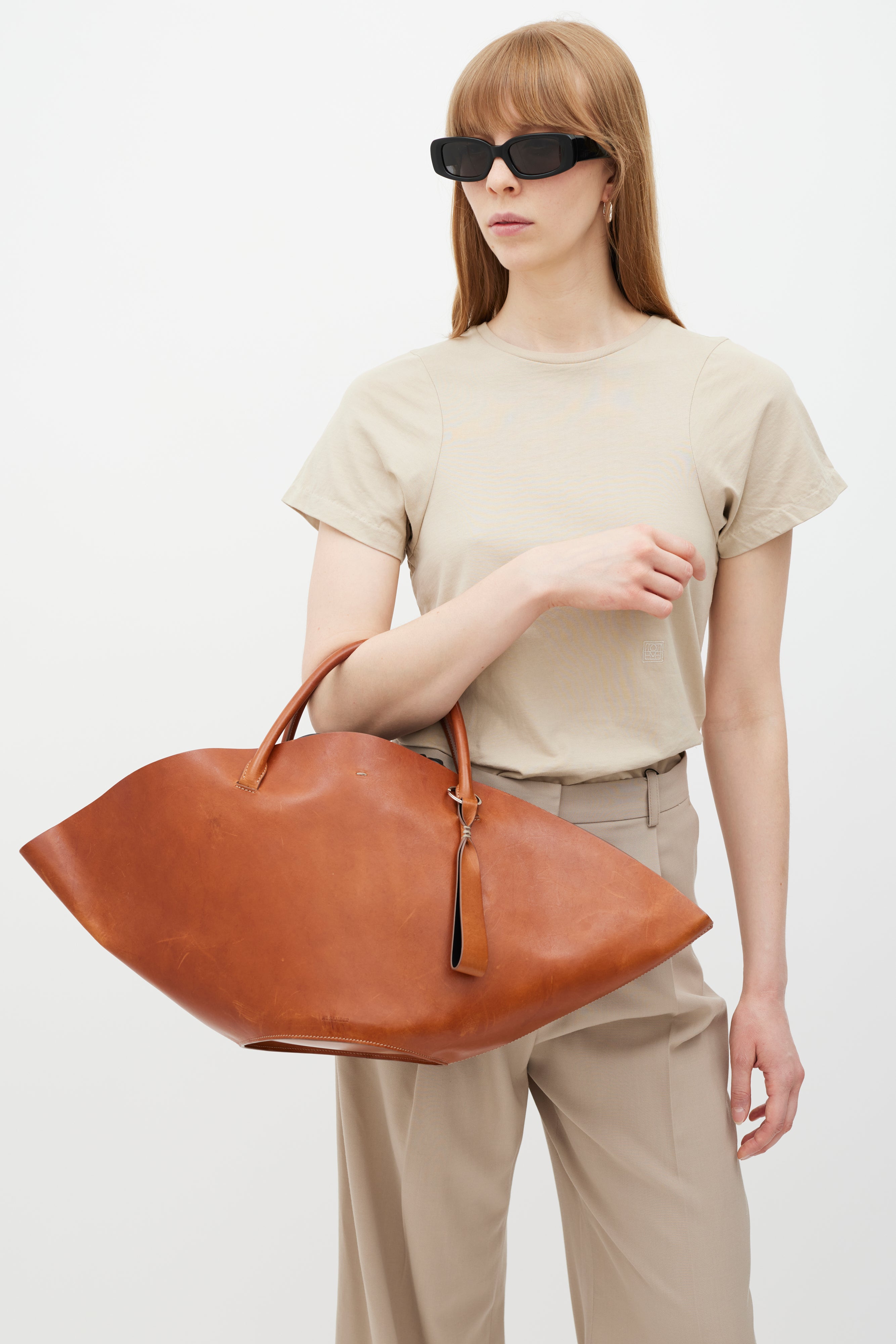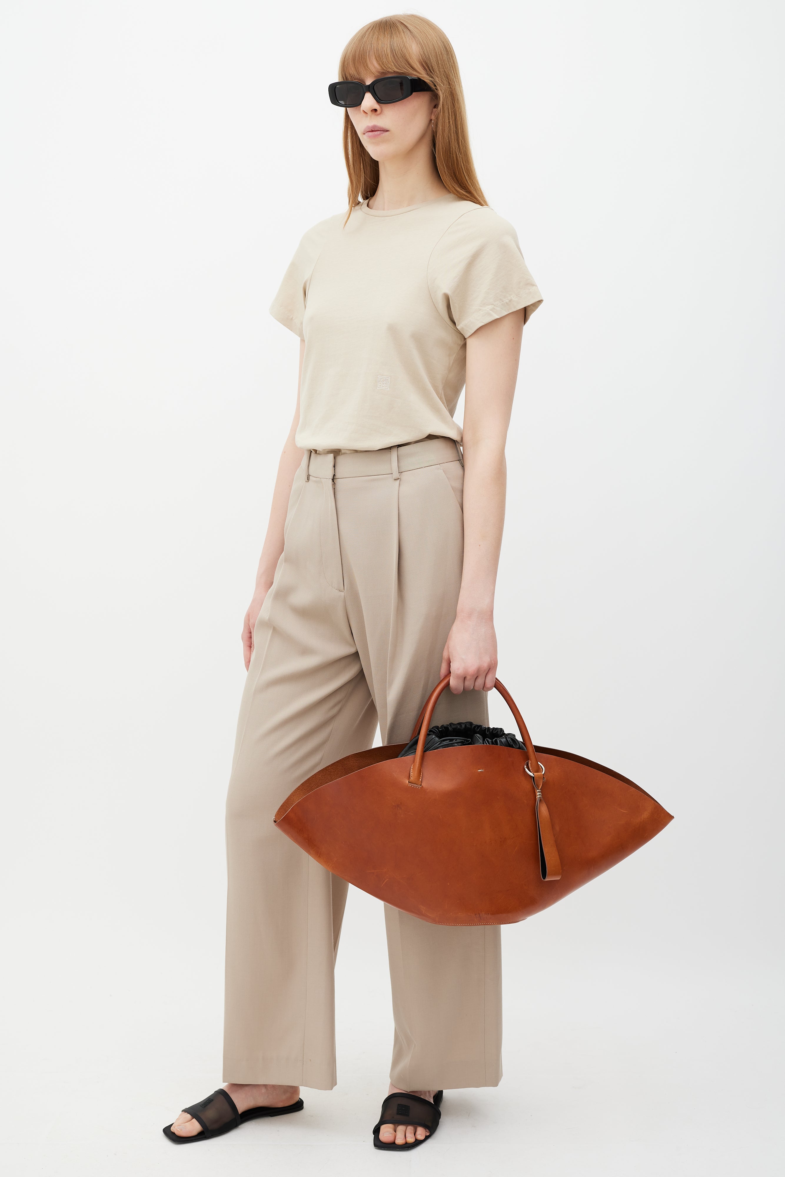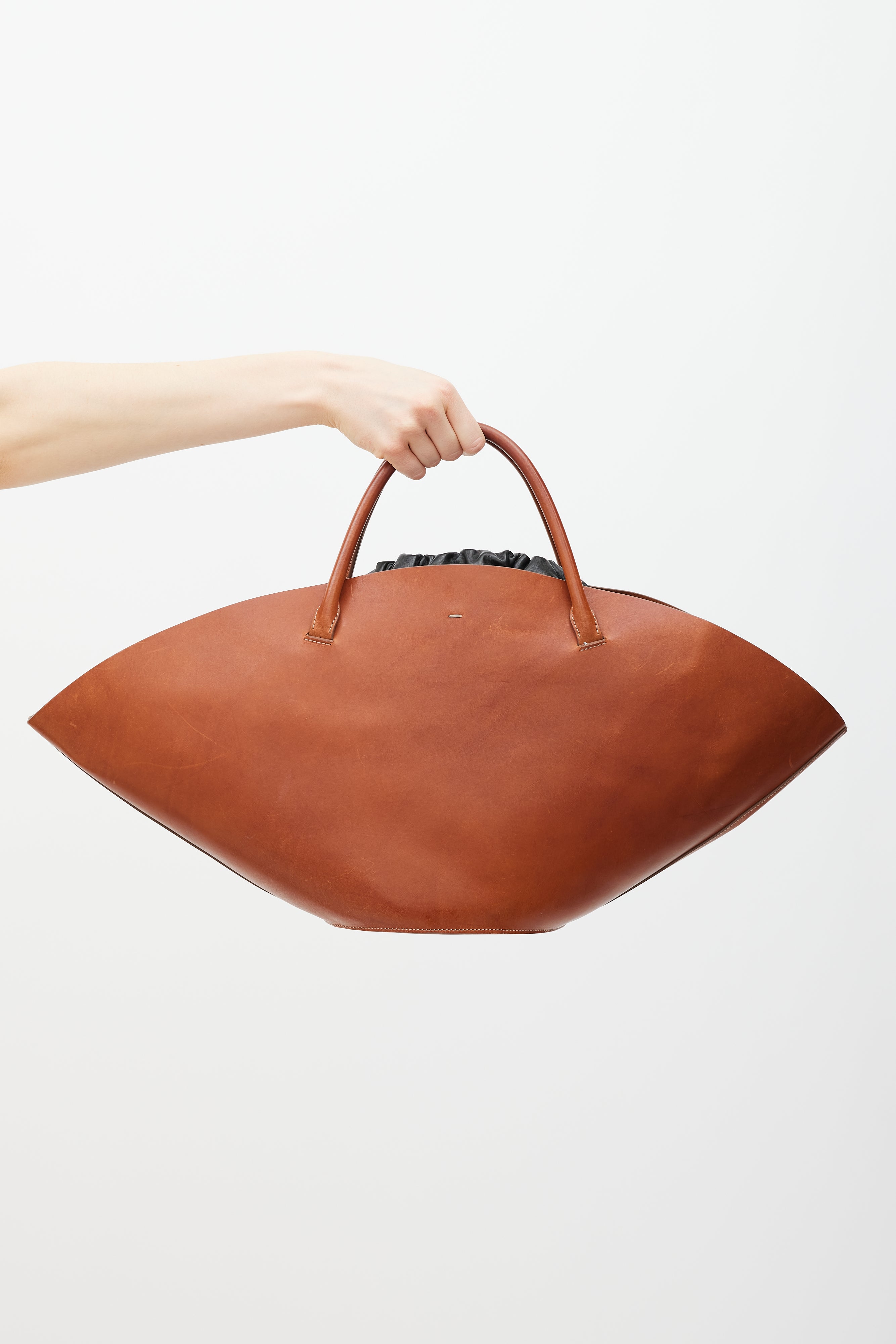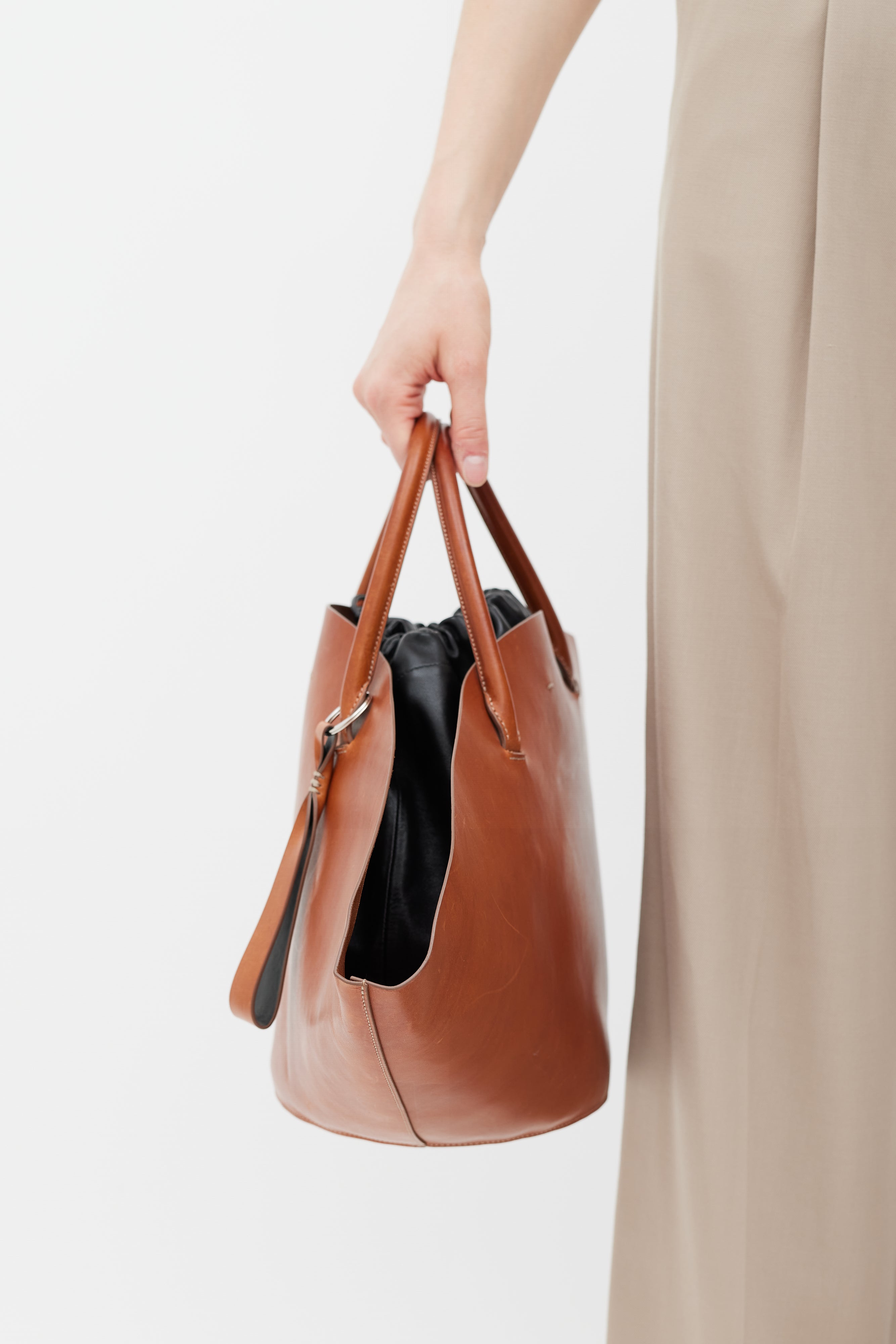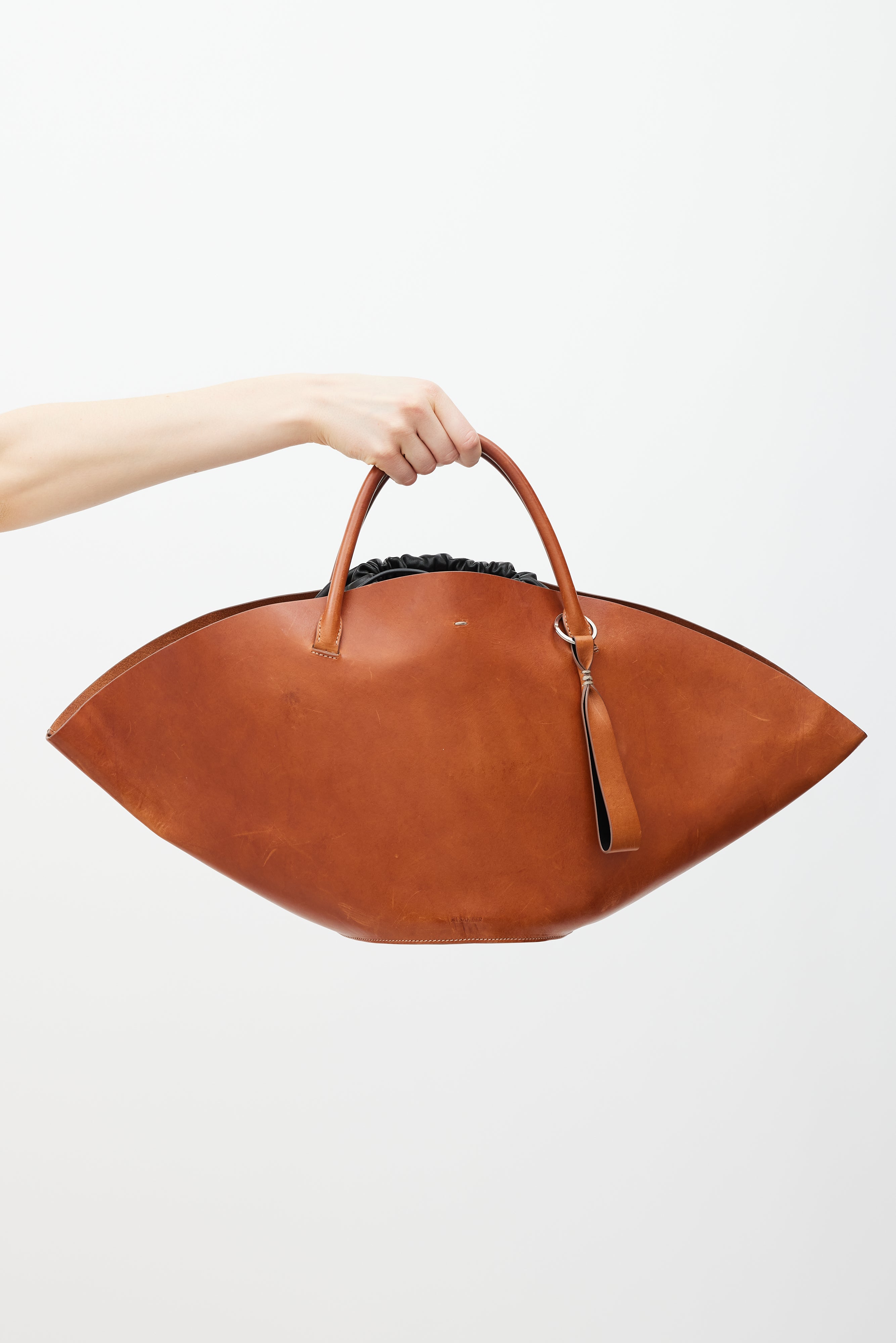 Pre-owned Jil Sander Sombrero Tote bag featuring a brown leather outer body, silver tone hardware, beige contrast stitching throughout, wide top opening, dual rolled top handles, keyring with leather tab, top hook closure, and detachable black leather insert with top drawstring closure and bottom snap button fastenings.