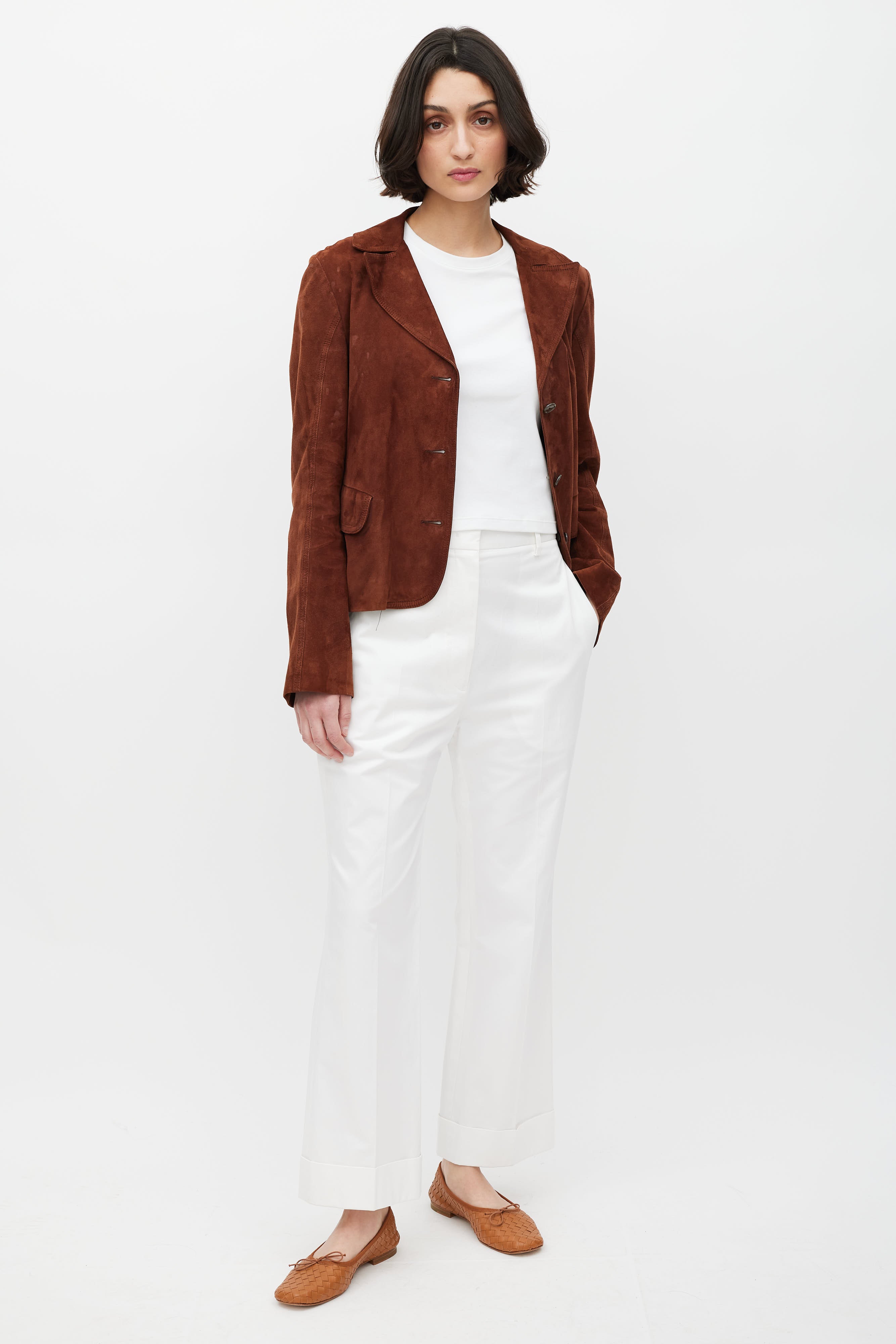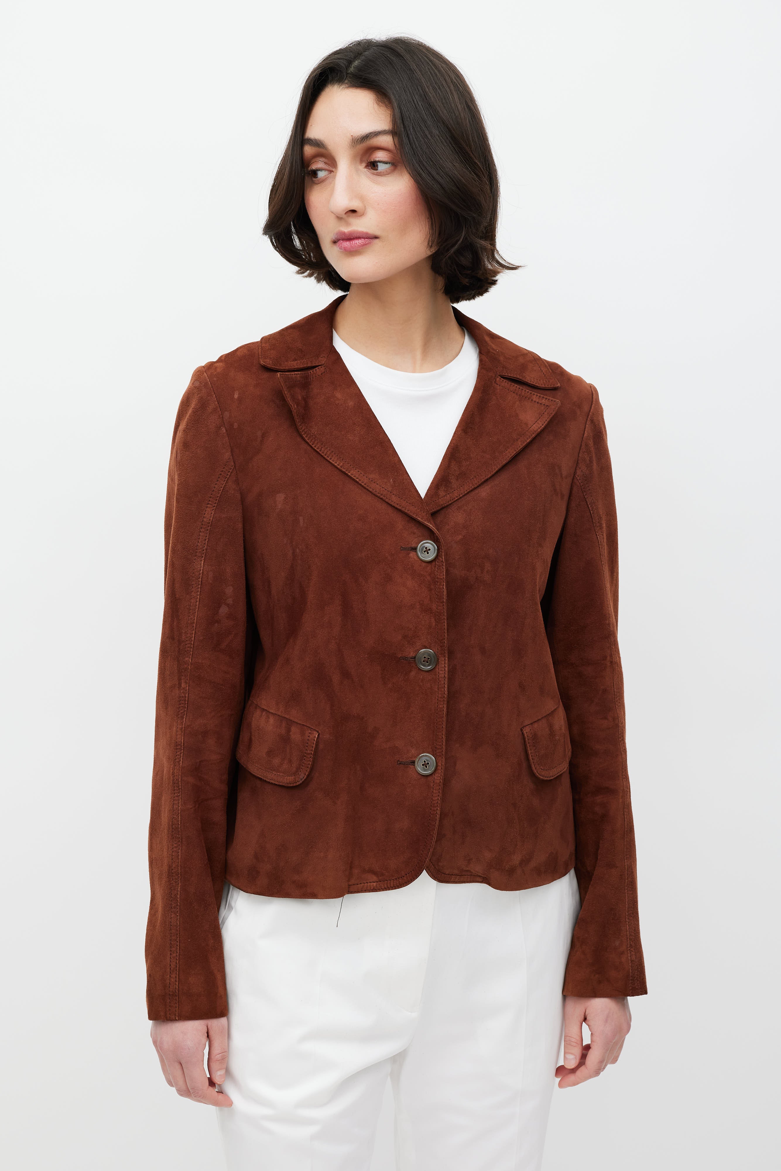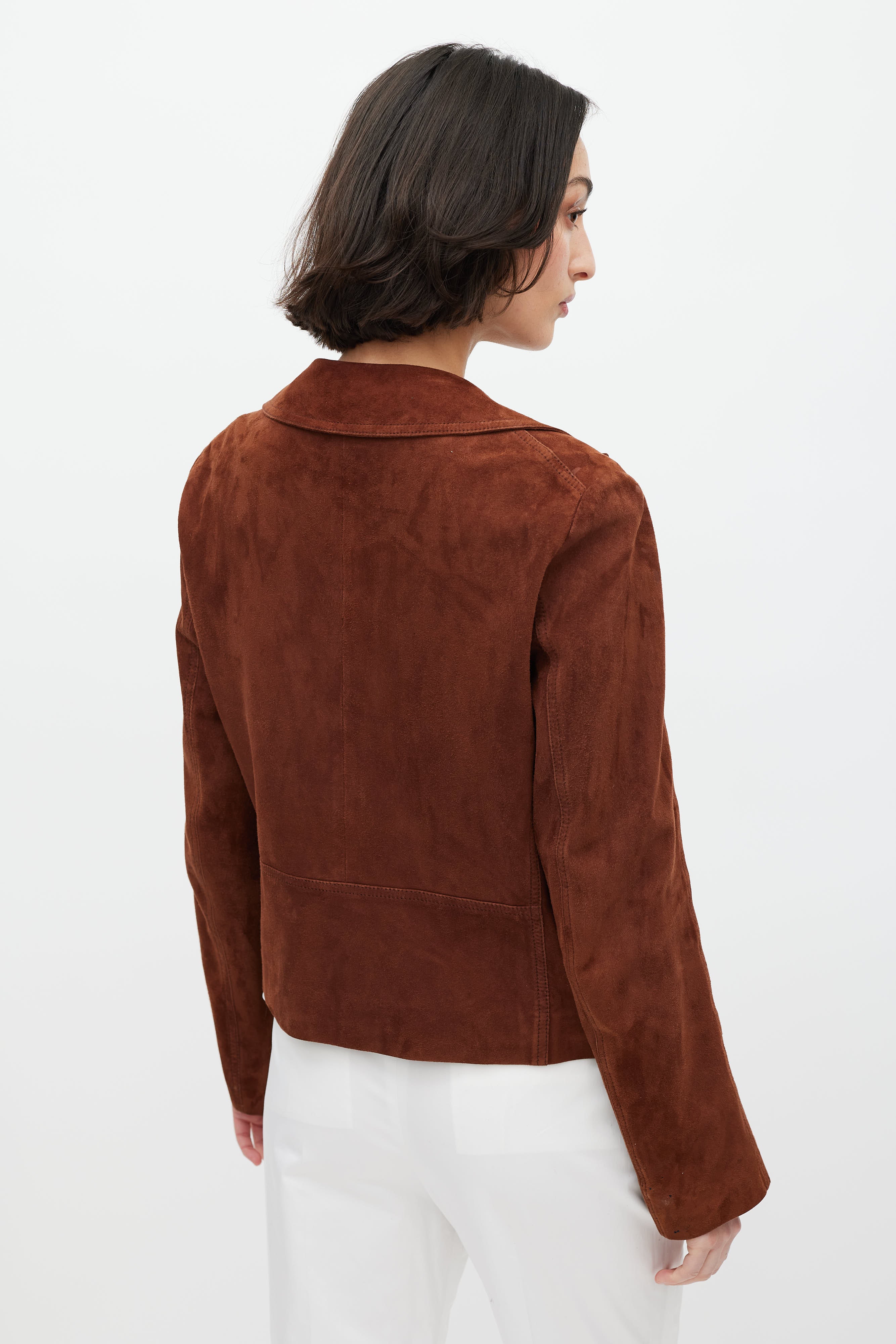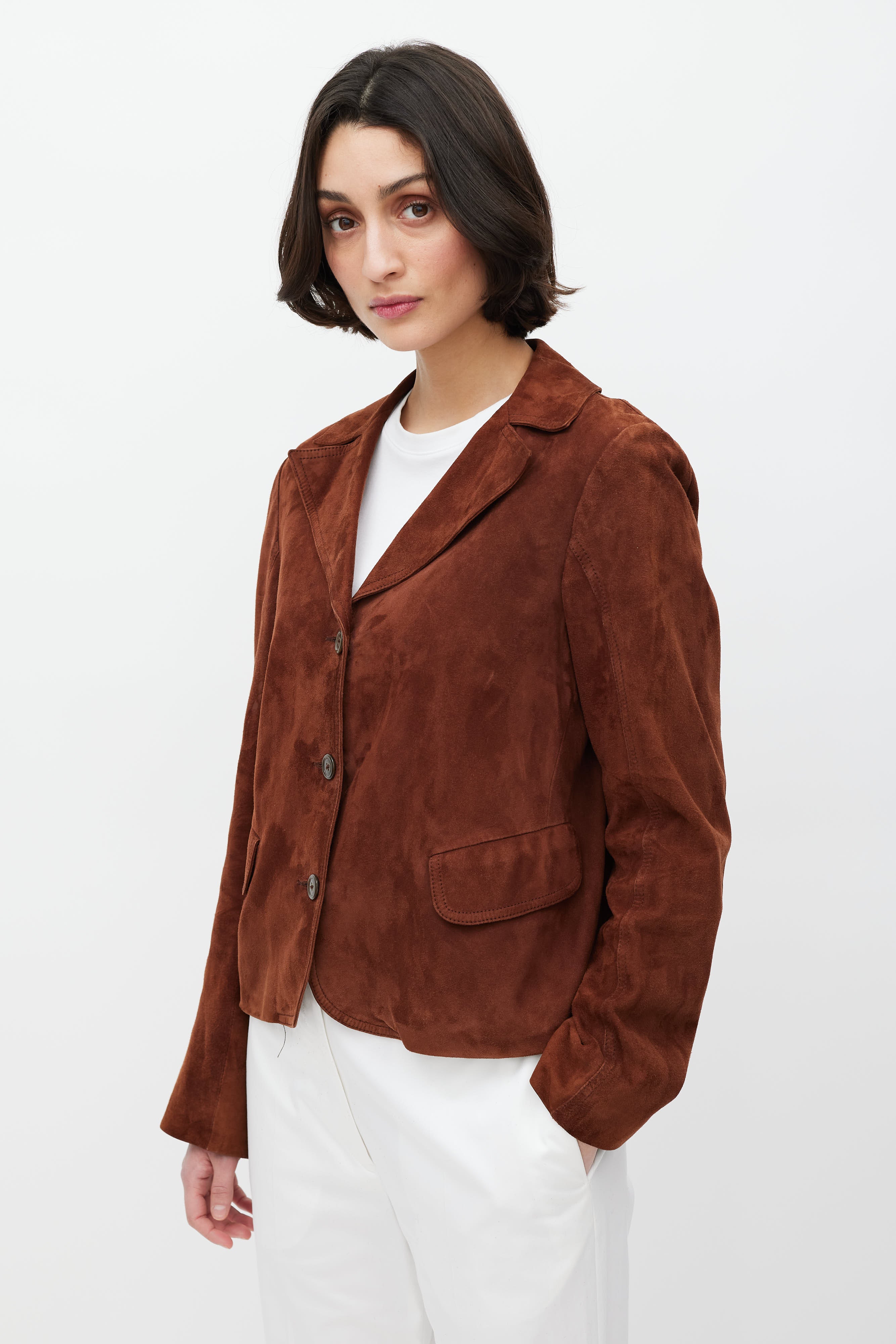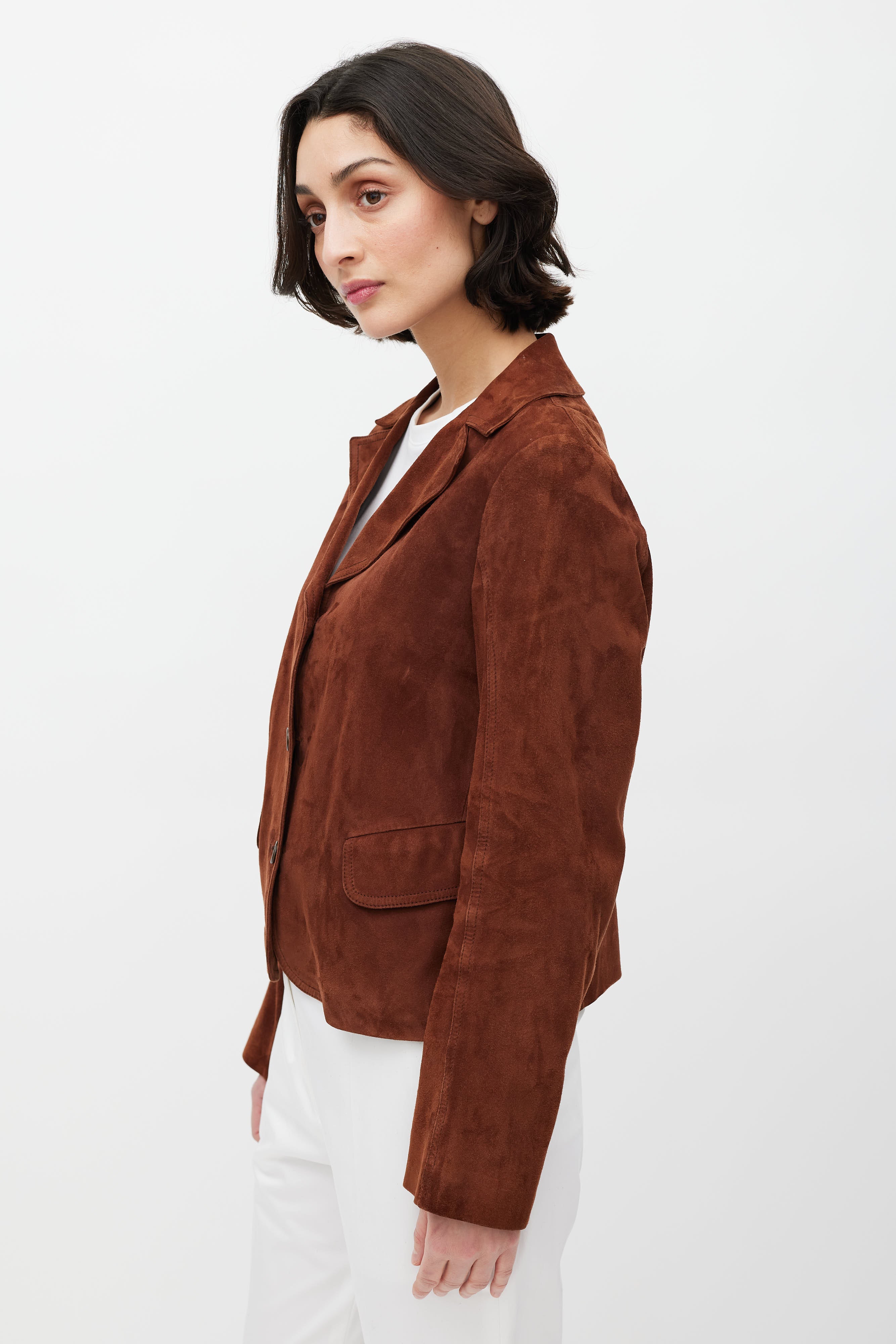 Pre-owned Jil Sander brown suede jacket featuring a pointed collar, long sleeves, two flap pockets at hip, and button up closure. Lined.