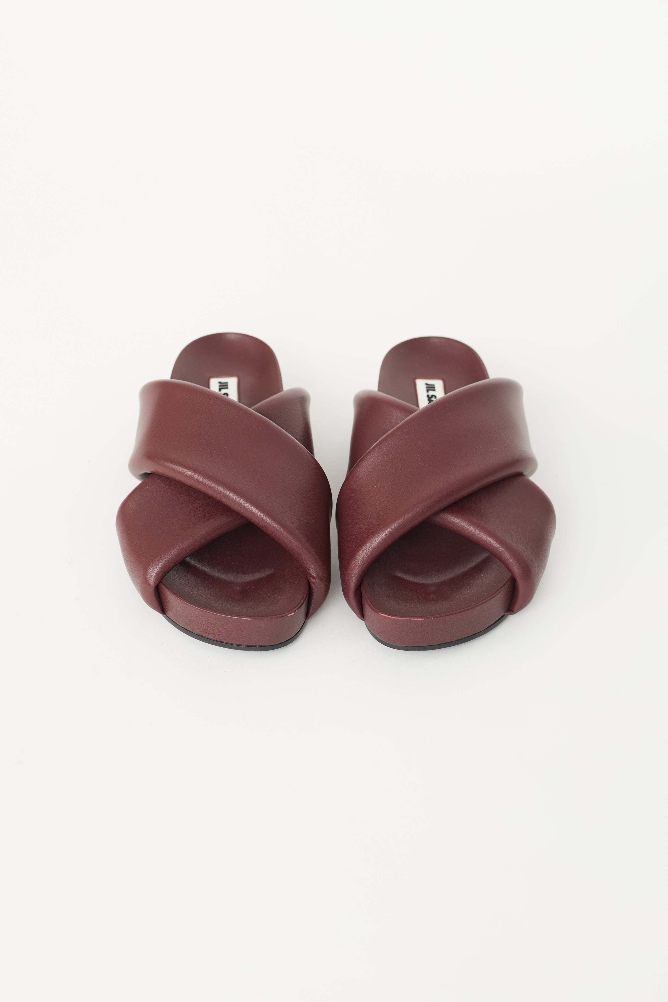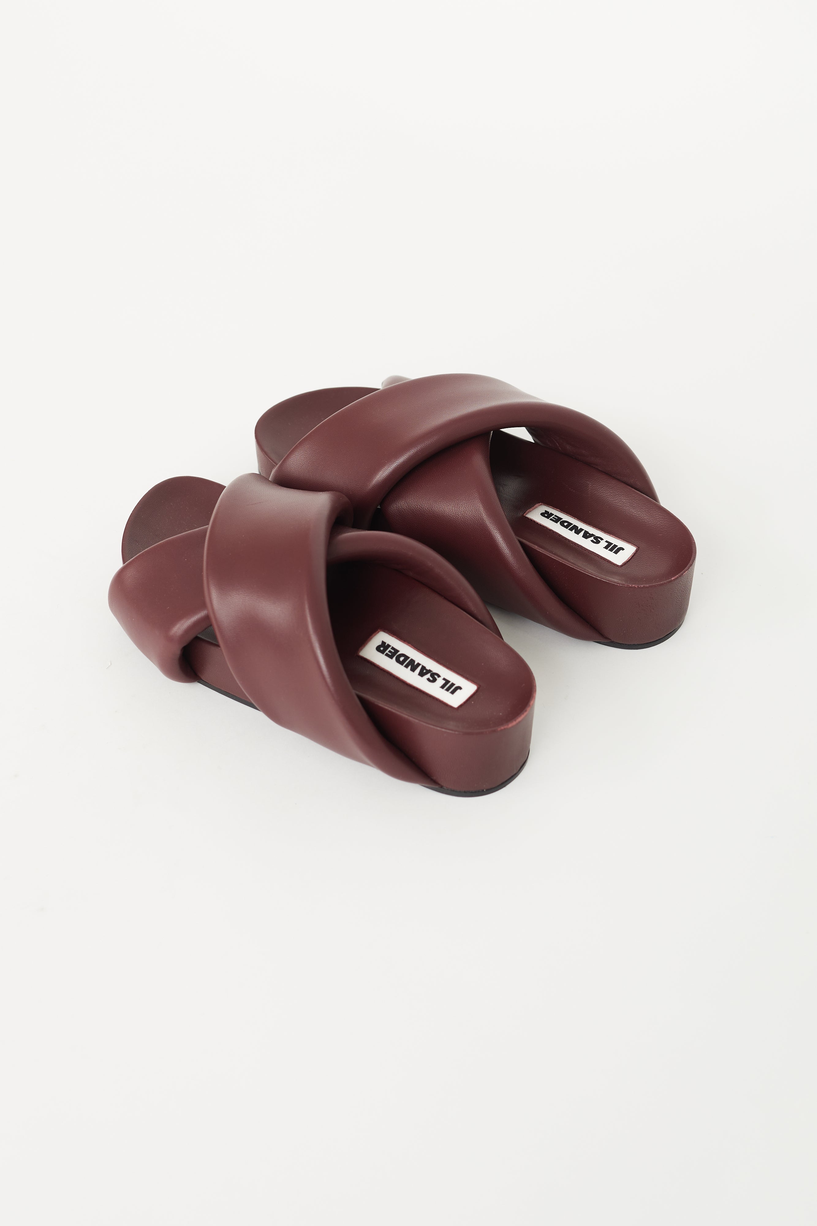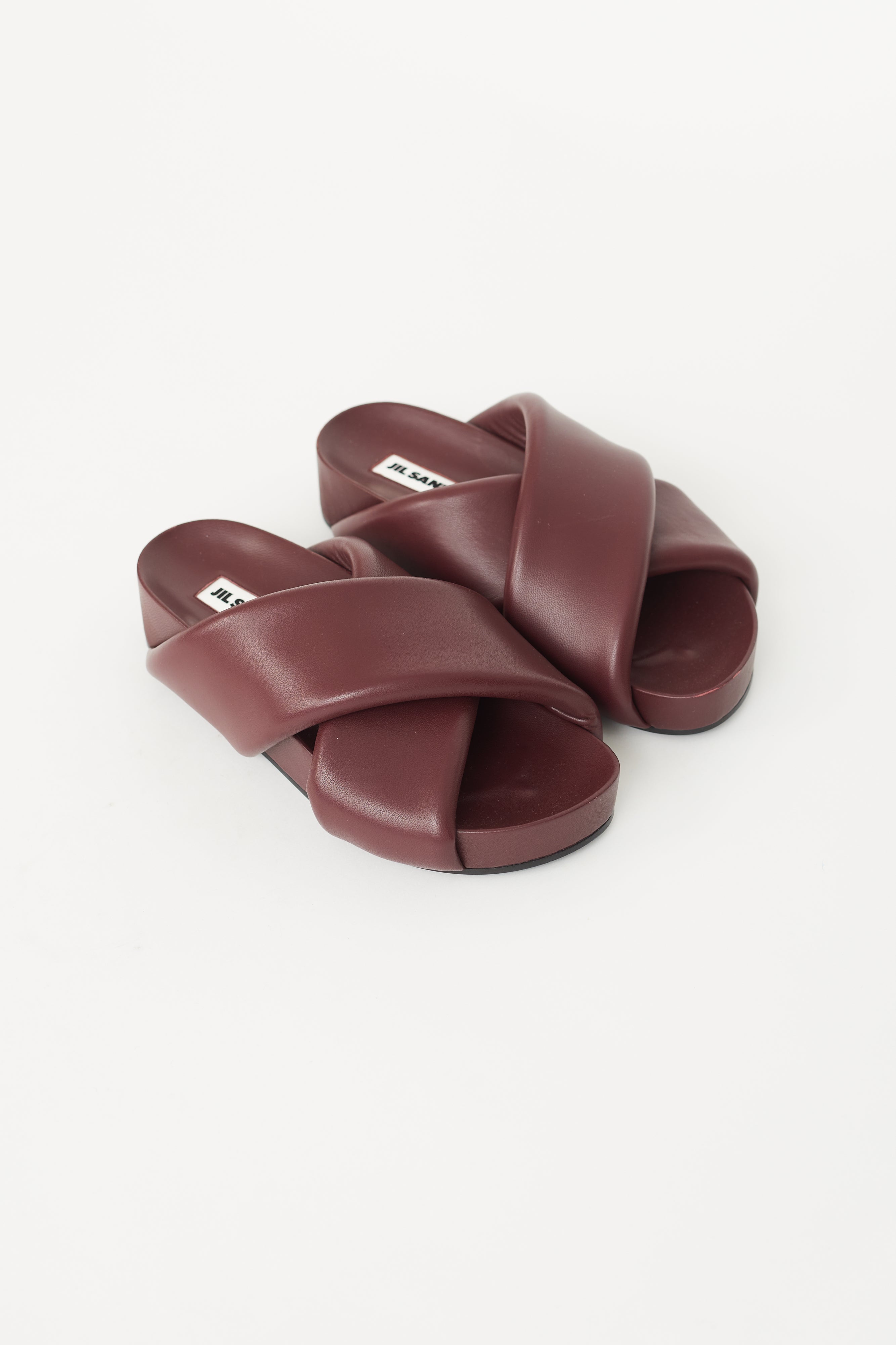 Pre-owned Jil Sander burgundy sandals featuring tapered rounded toe, padded criss cross at vamp, and white logo tab at insole. Original dust bag included.