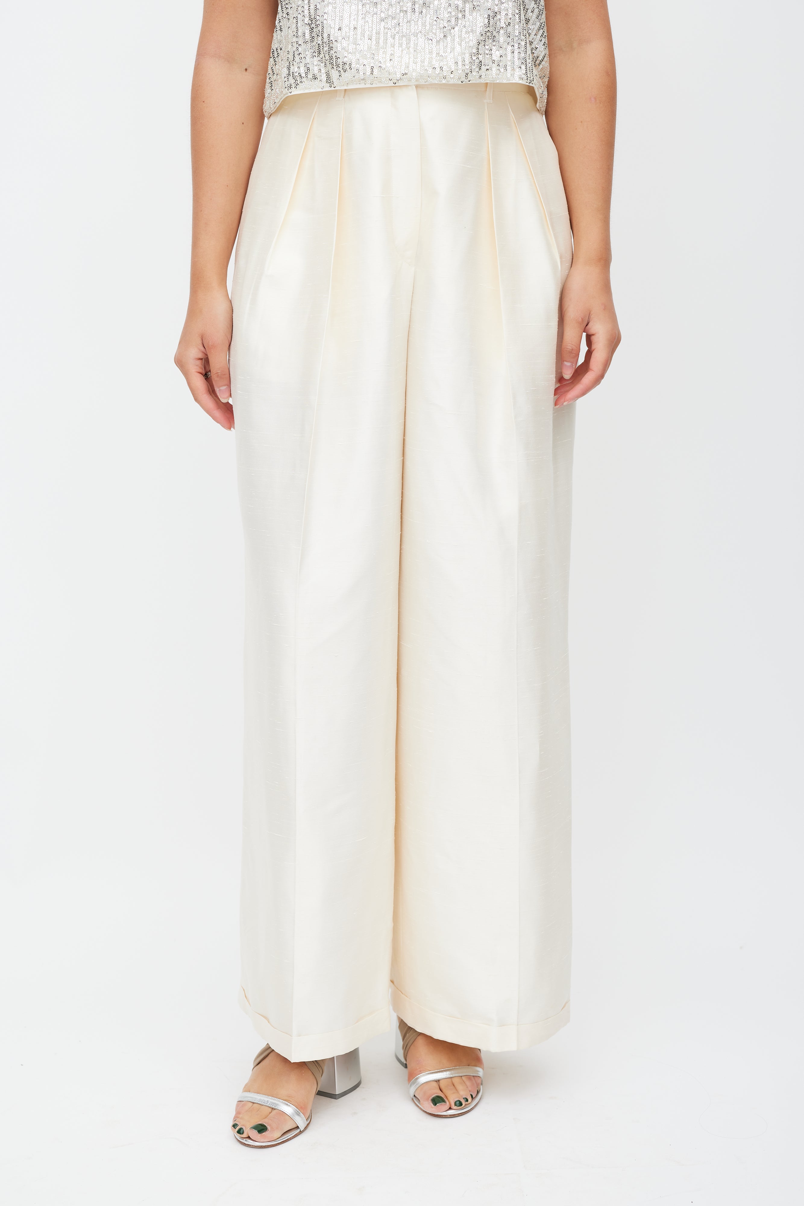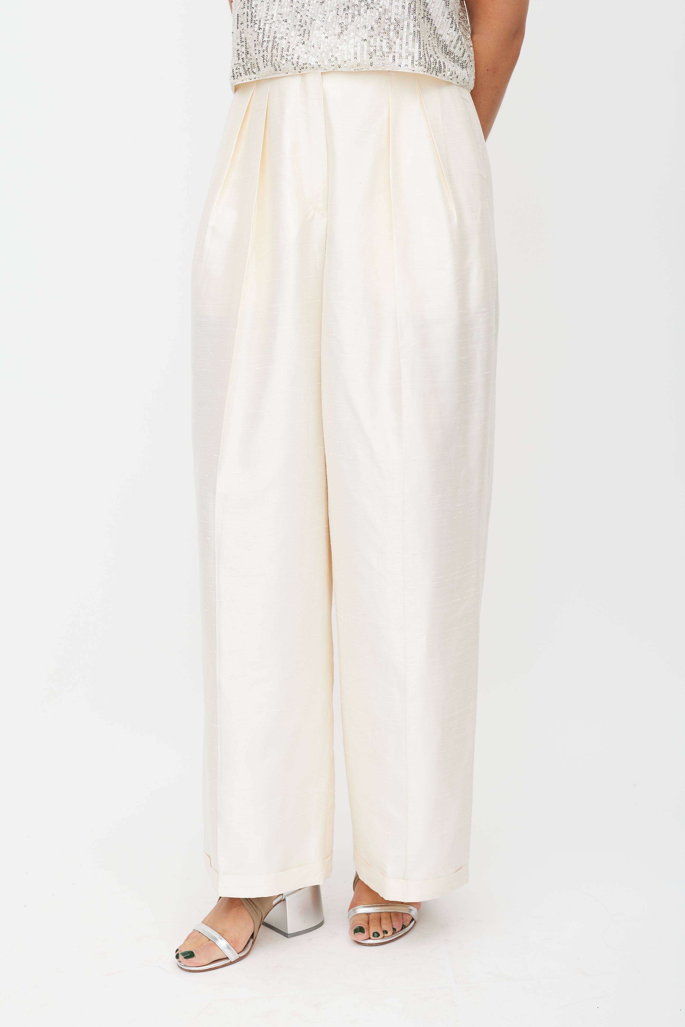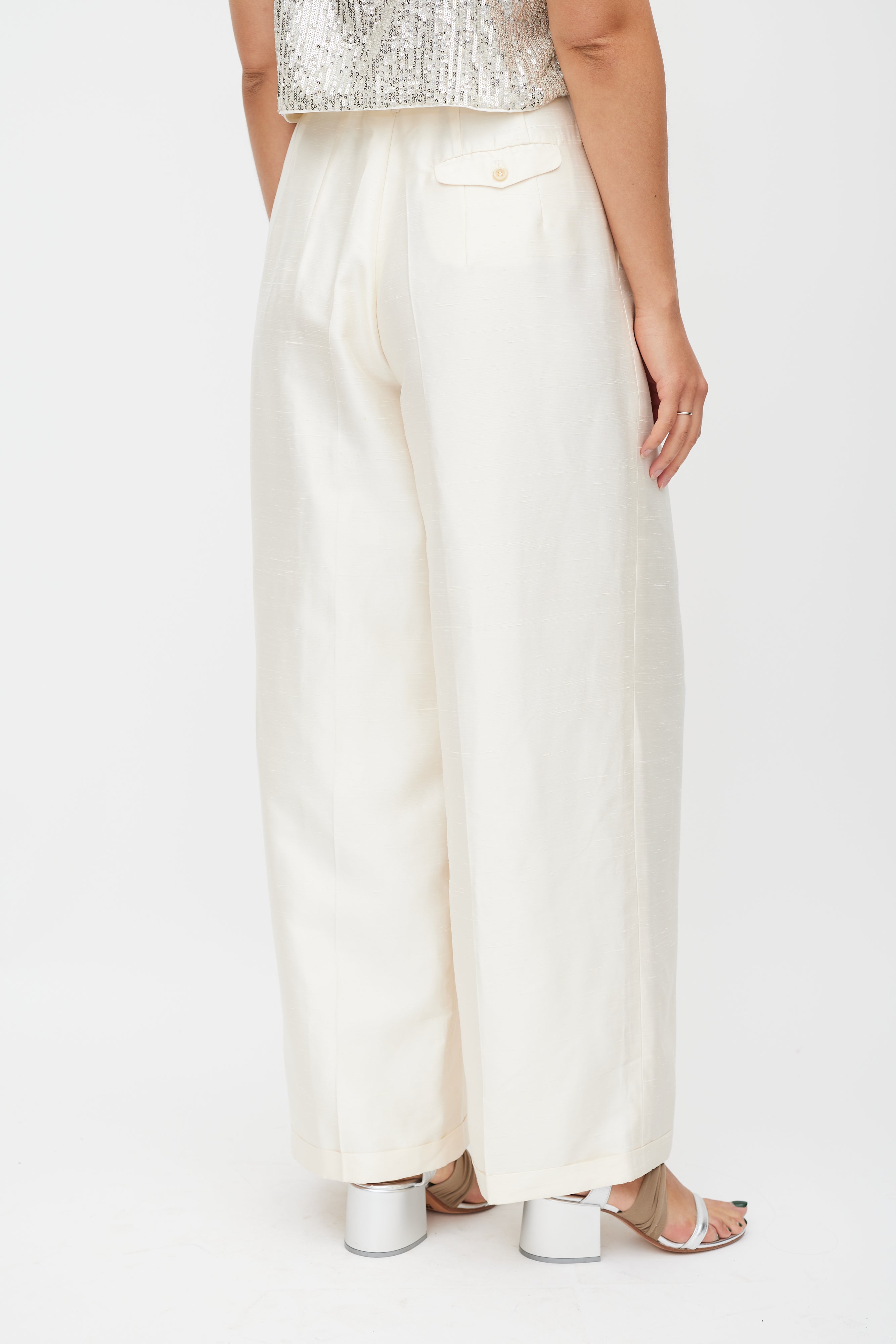 Pre-owned Jil Sander white silk textured trousers featuring two slip pockets at hip, one flap pocket at back, pleated front, wide leg, cuffed hem, and zip fly with button closure.