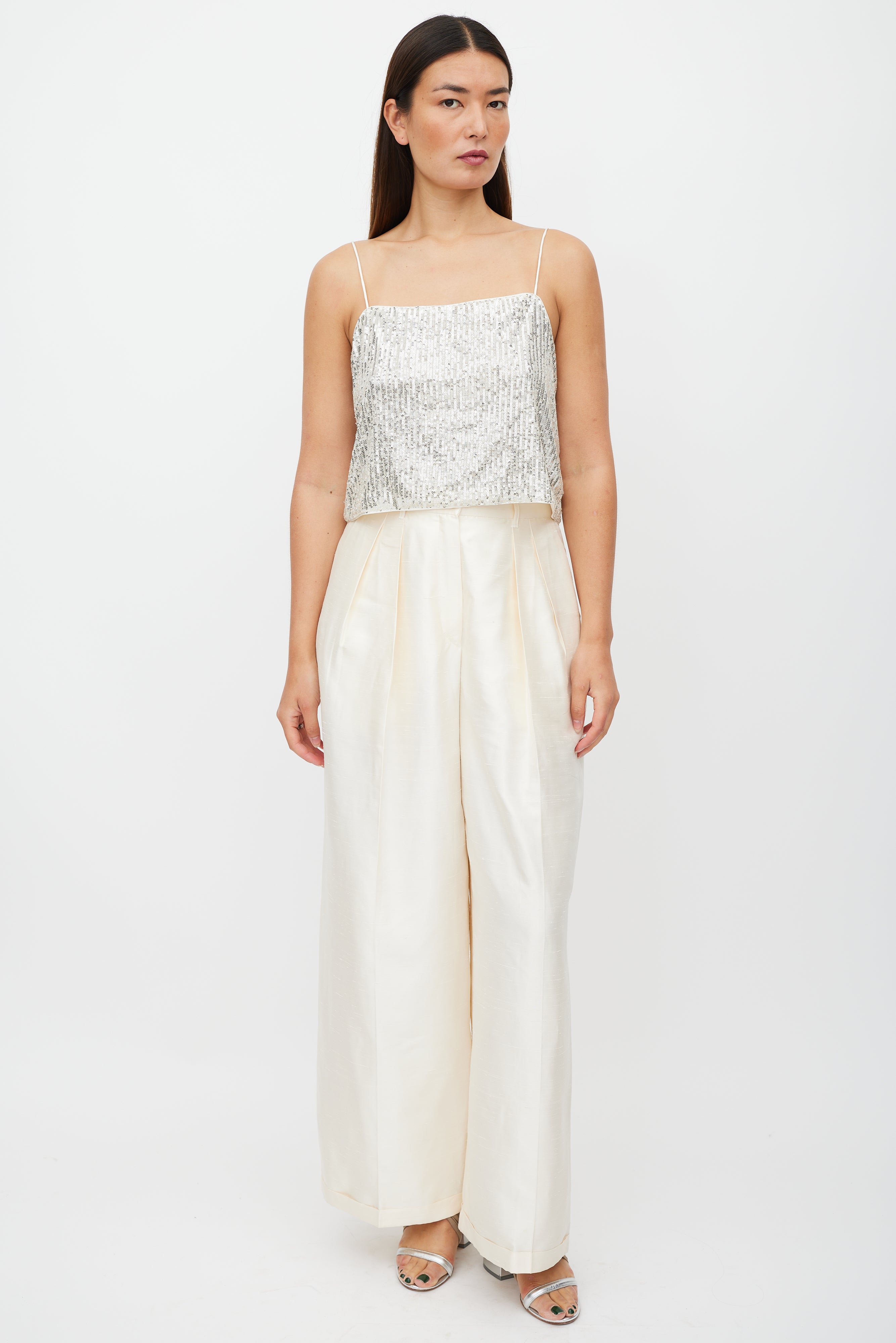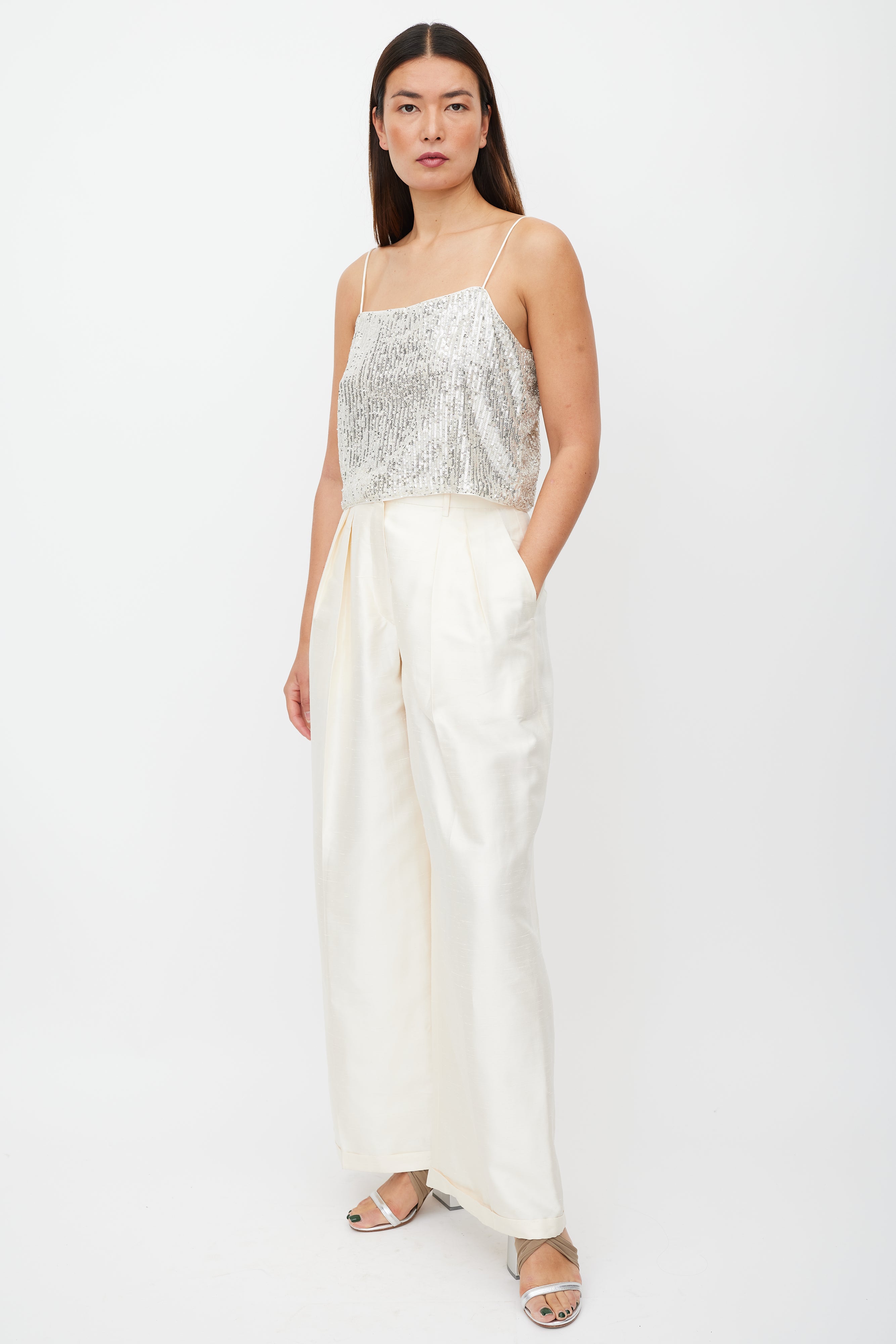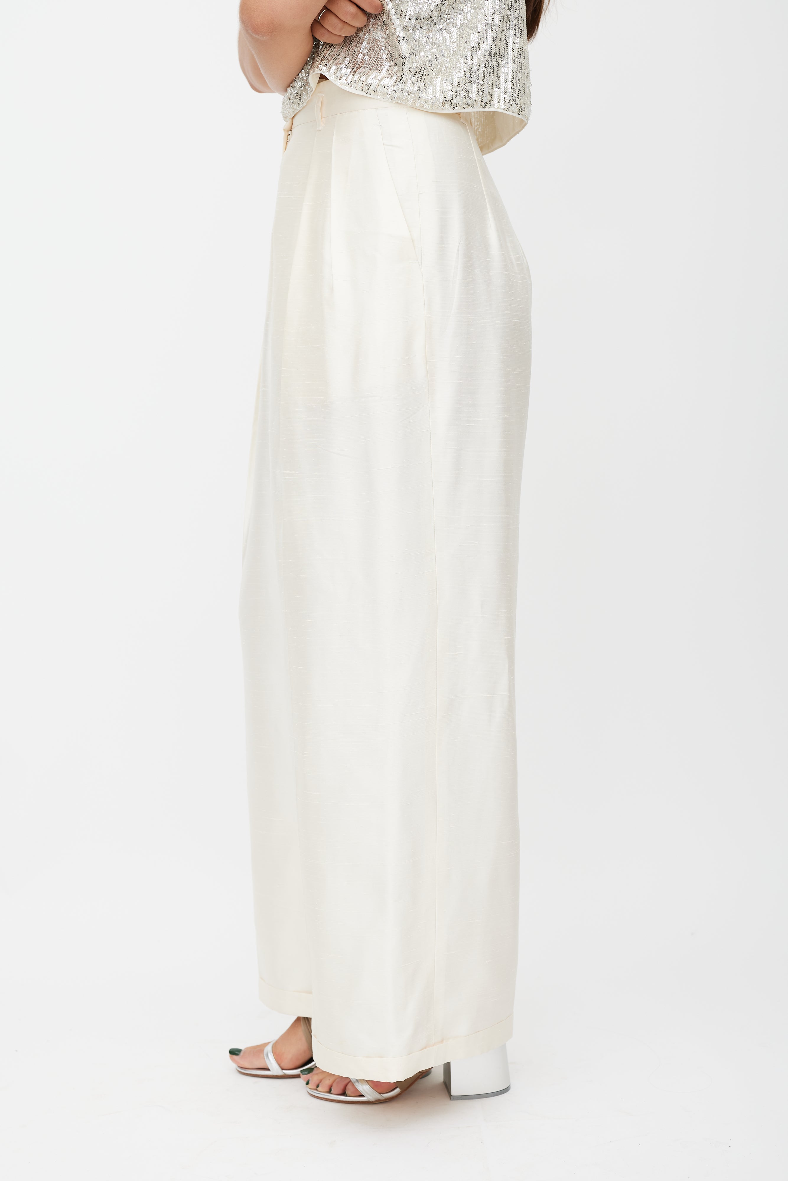 Pre-owned Jil Sander white silk textured trousers featuring two slip pockets at hip, one flap pocket at back, pleated front, wide leg, cuffed hem, and zip fly with button closure.