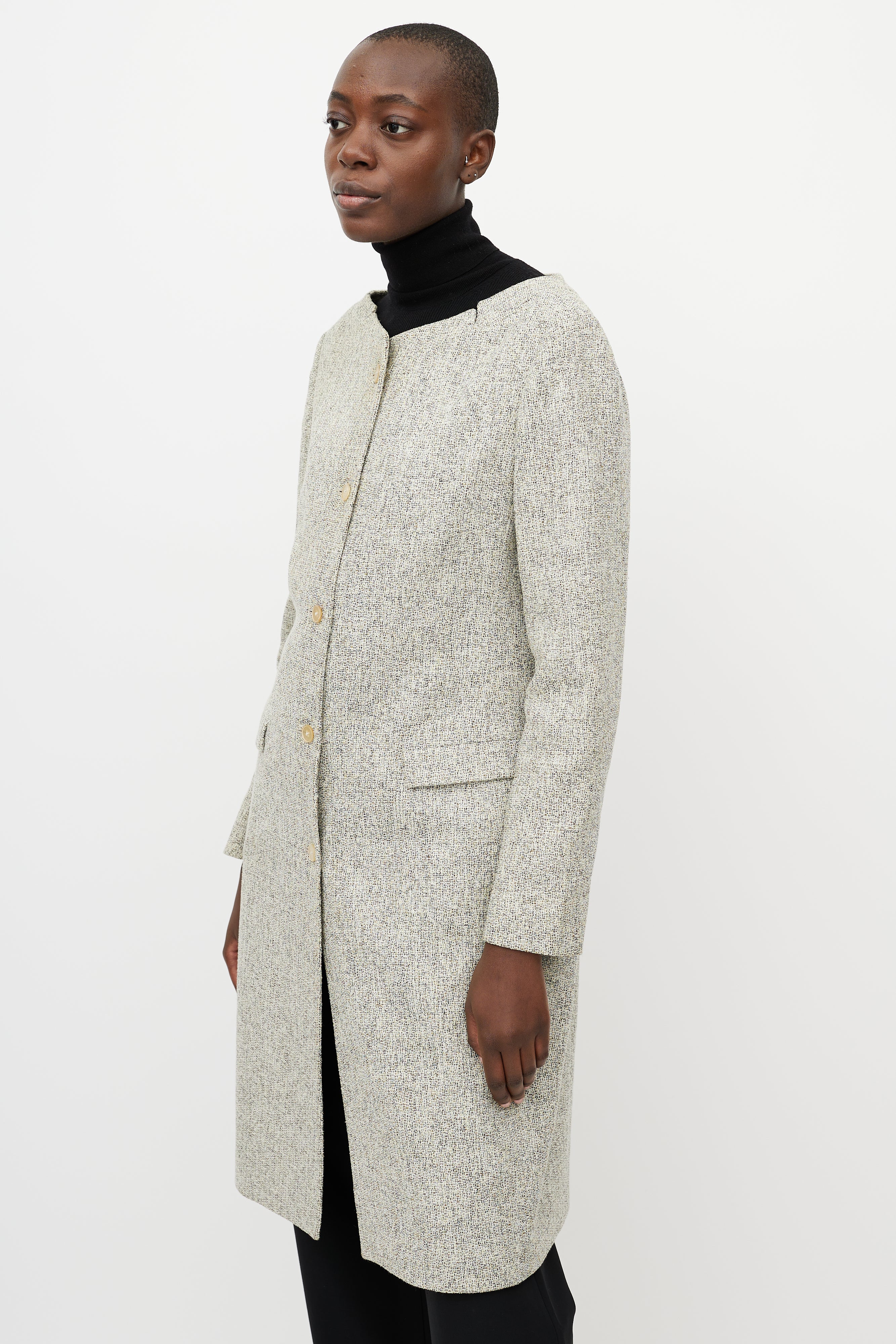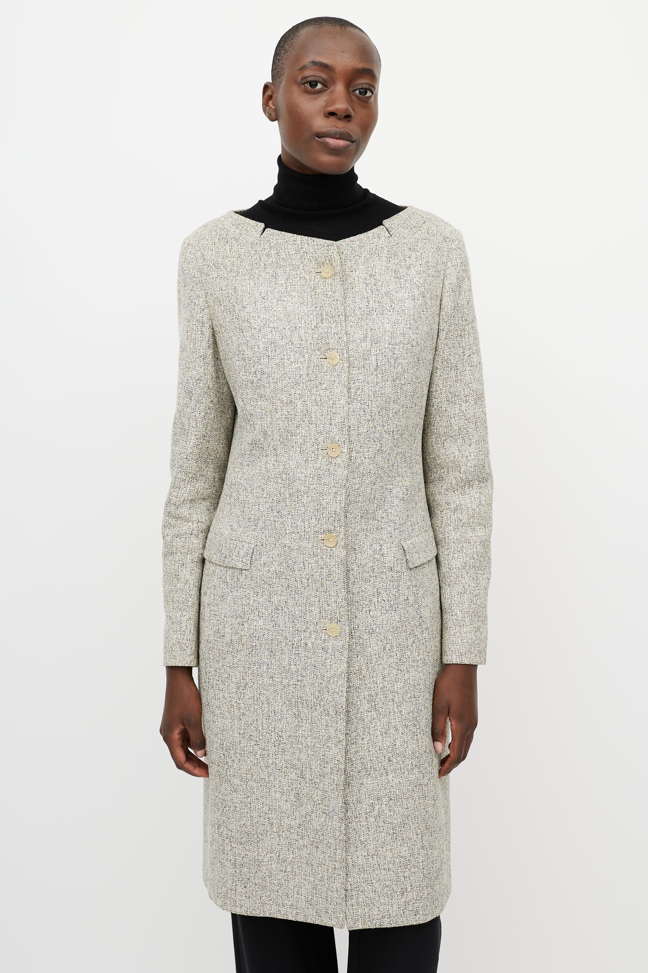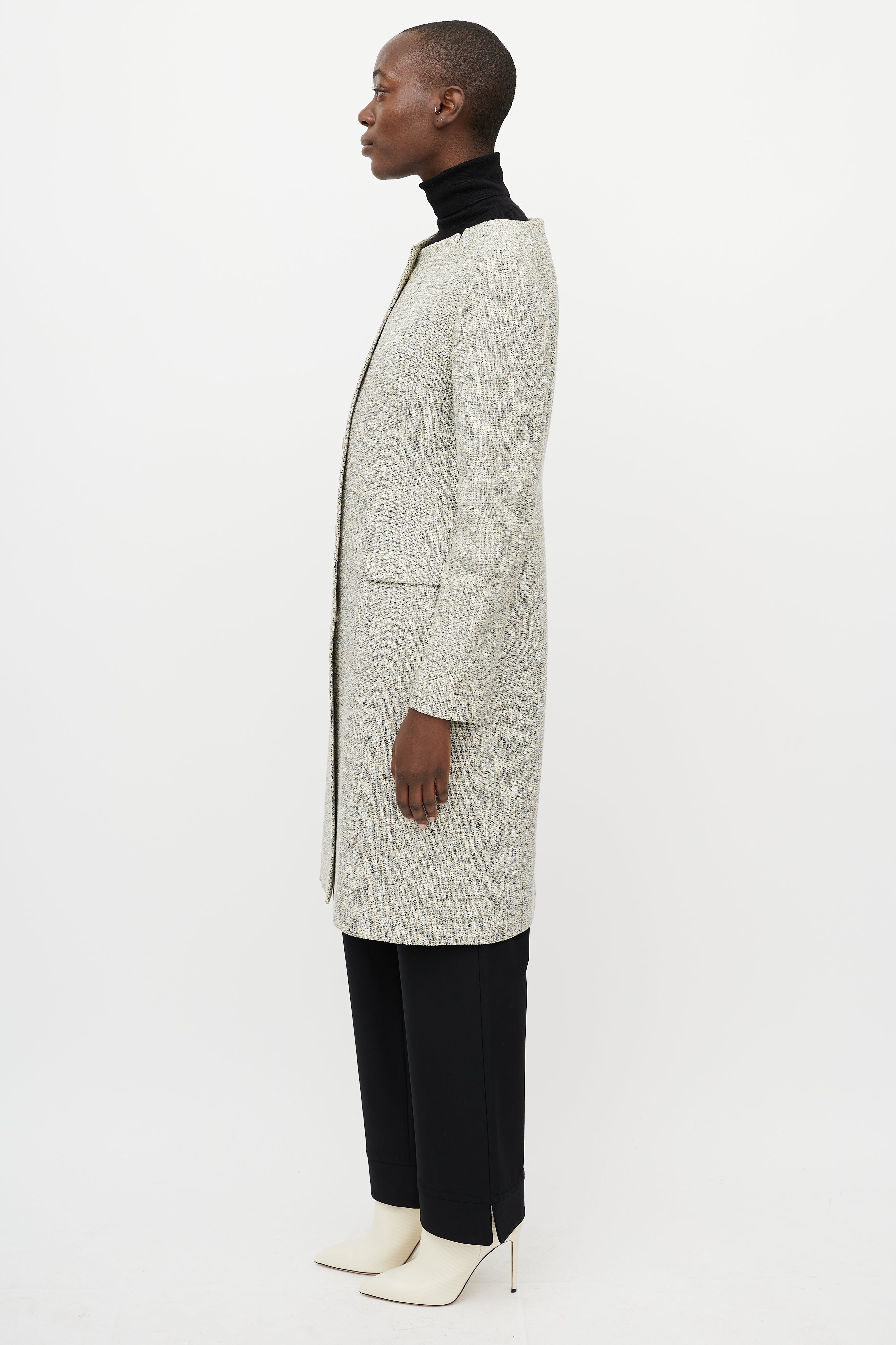 Pre-owned Jil Sander green tweed coat featuring wide collar, buttons down front, two patch pockets at hip, and silk interior. Lined.