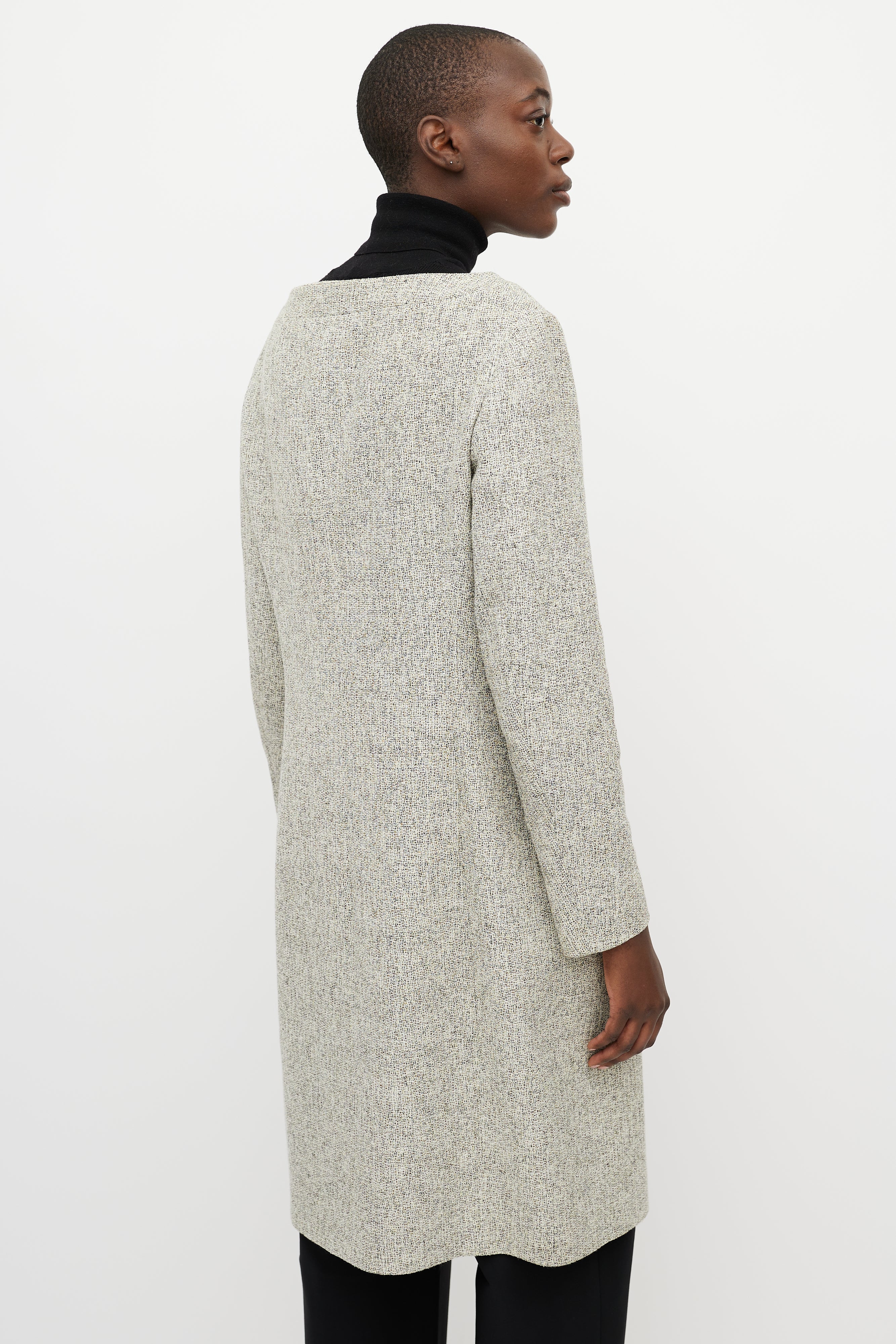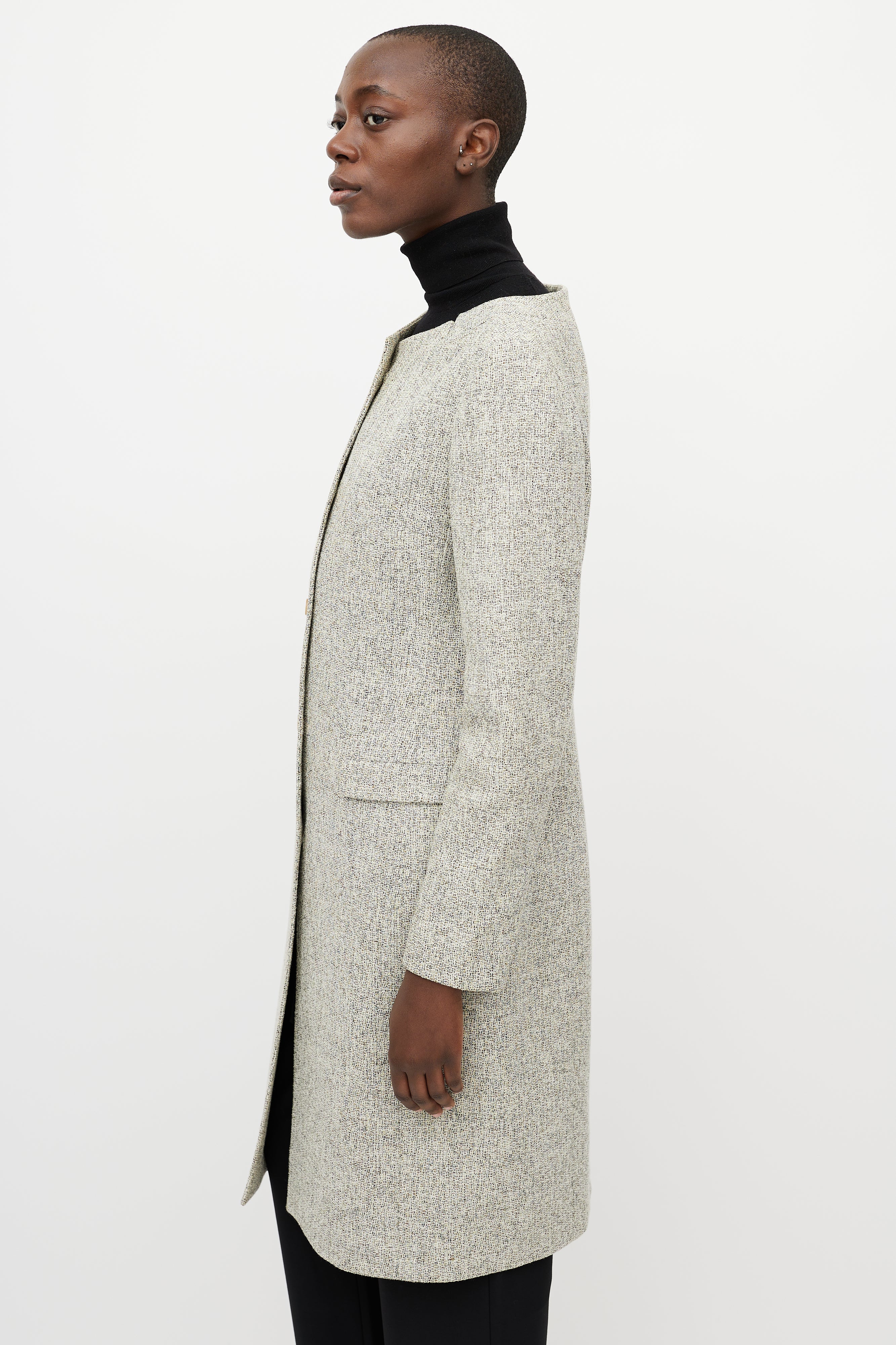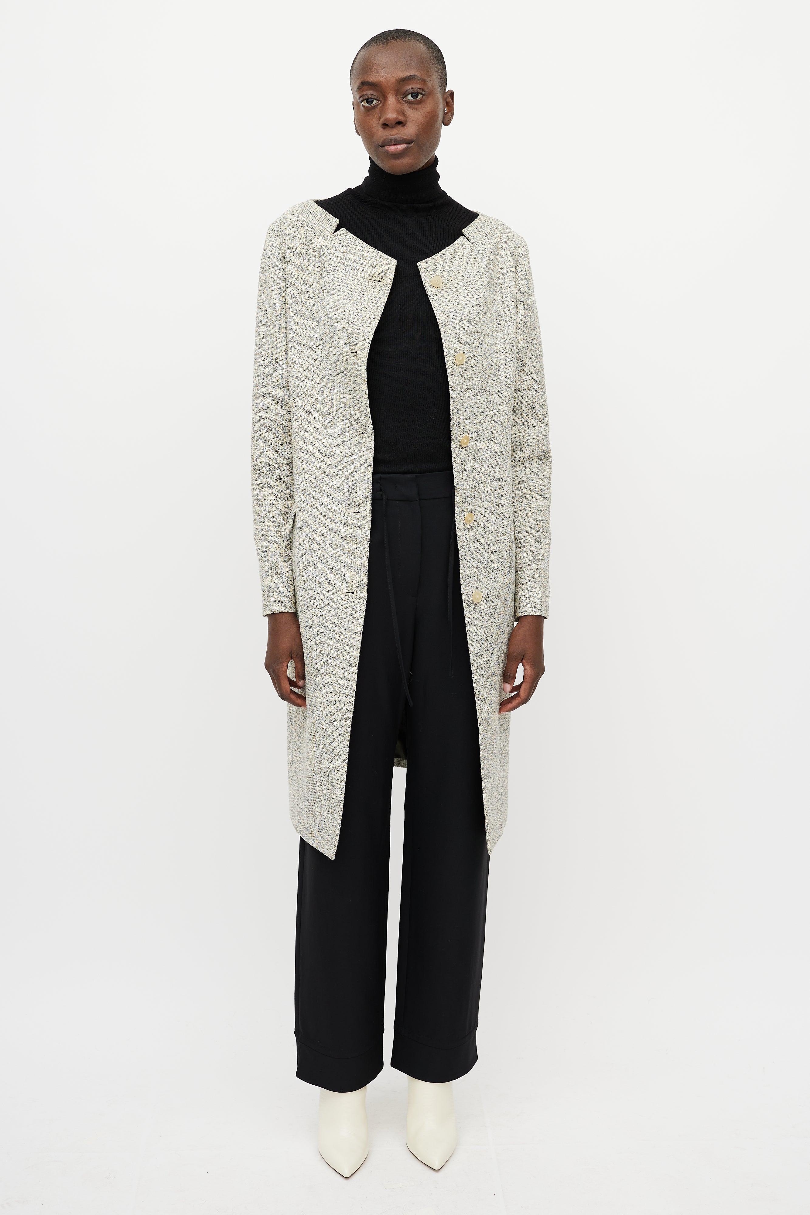 Pre-owned Jil Sander green tweed coat featuring wide collar, buttons down front, two patch pockets at hip, and silk interior. Lined.