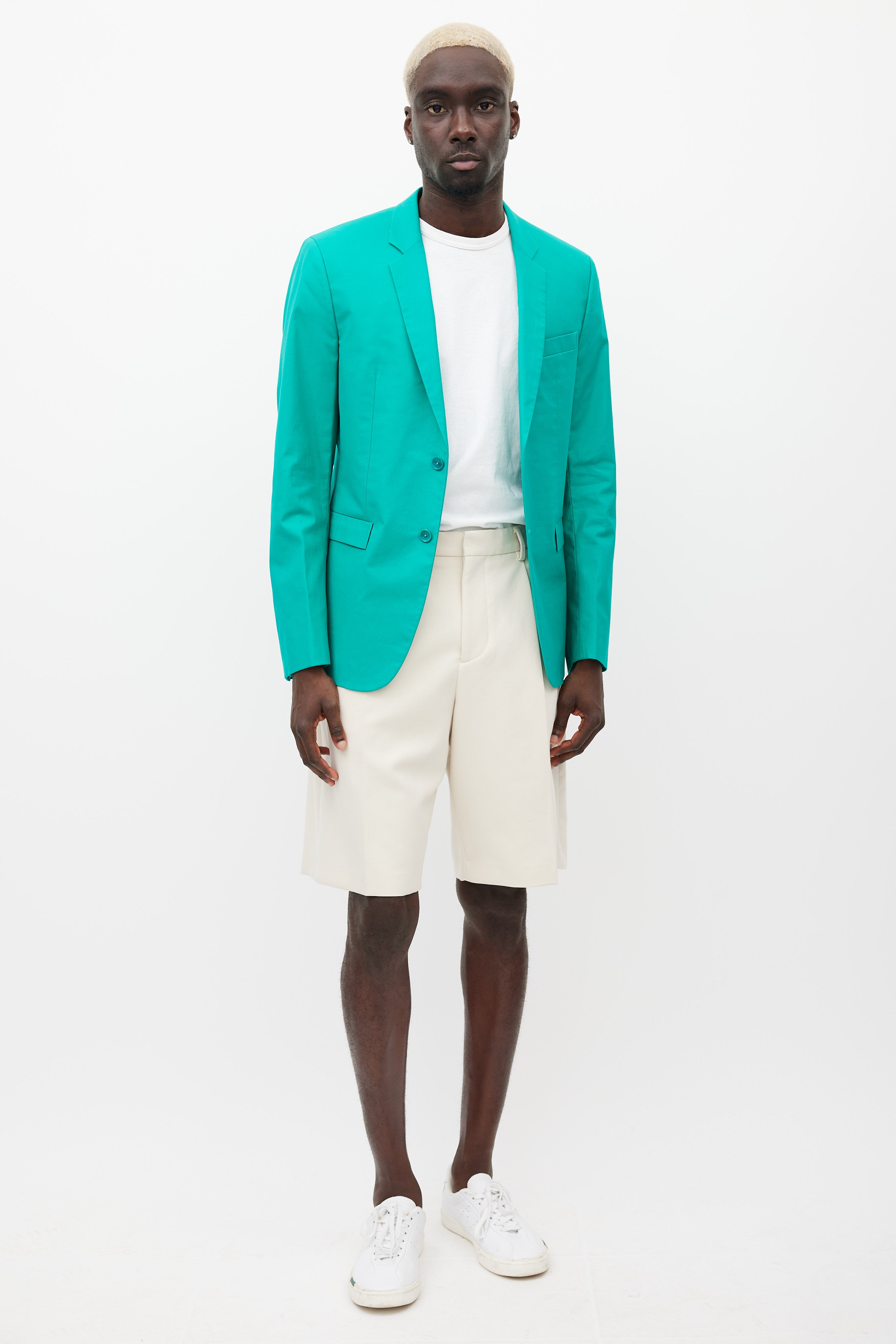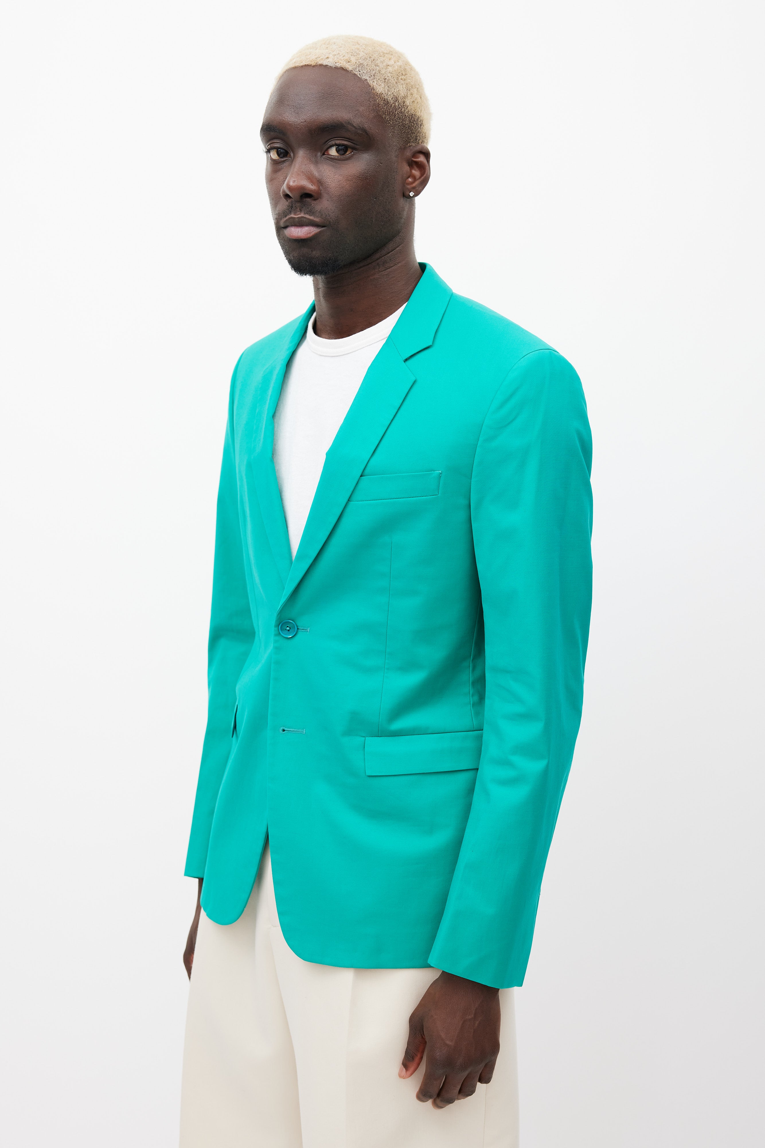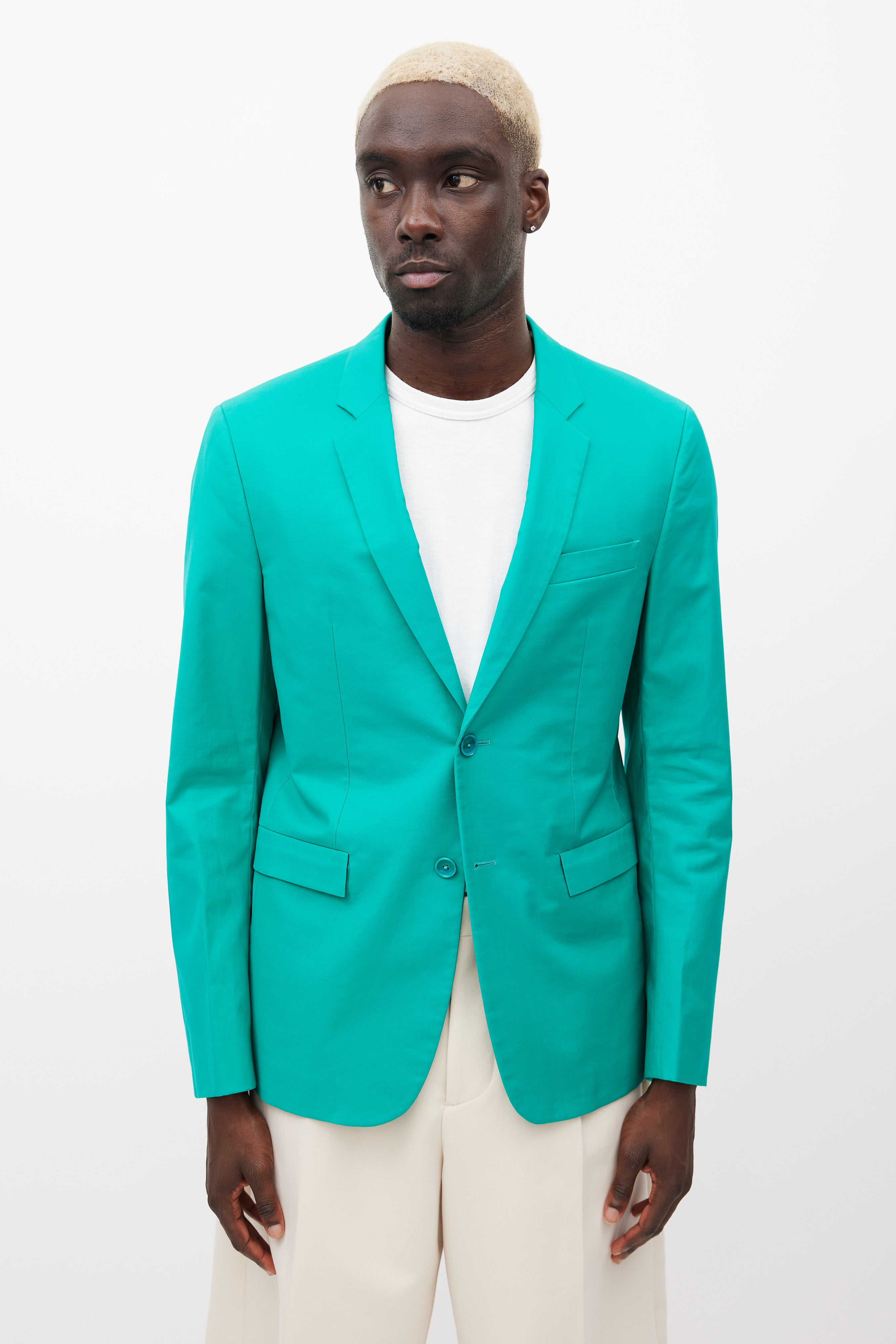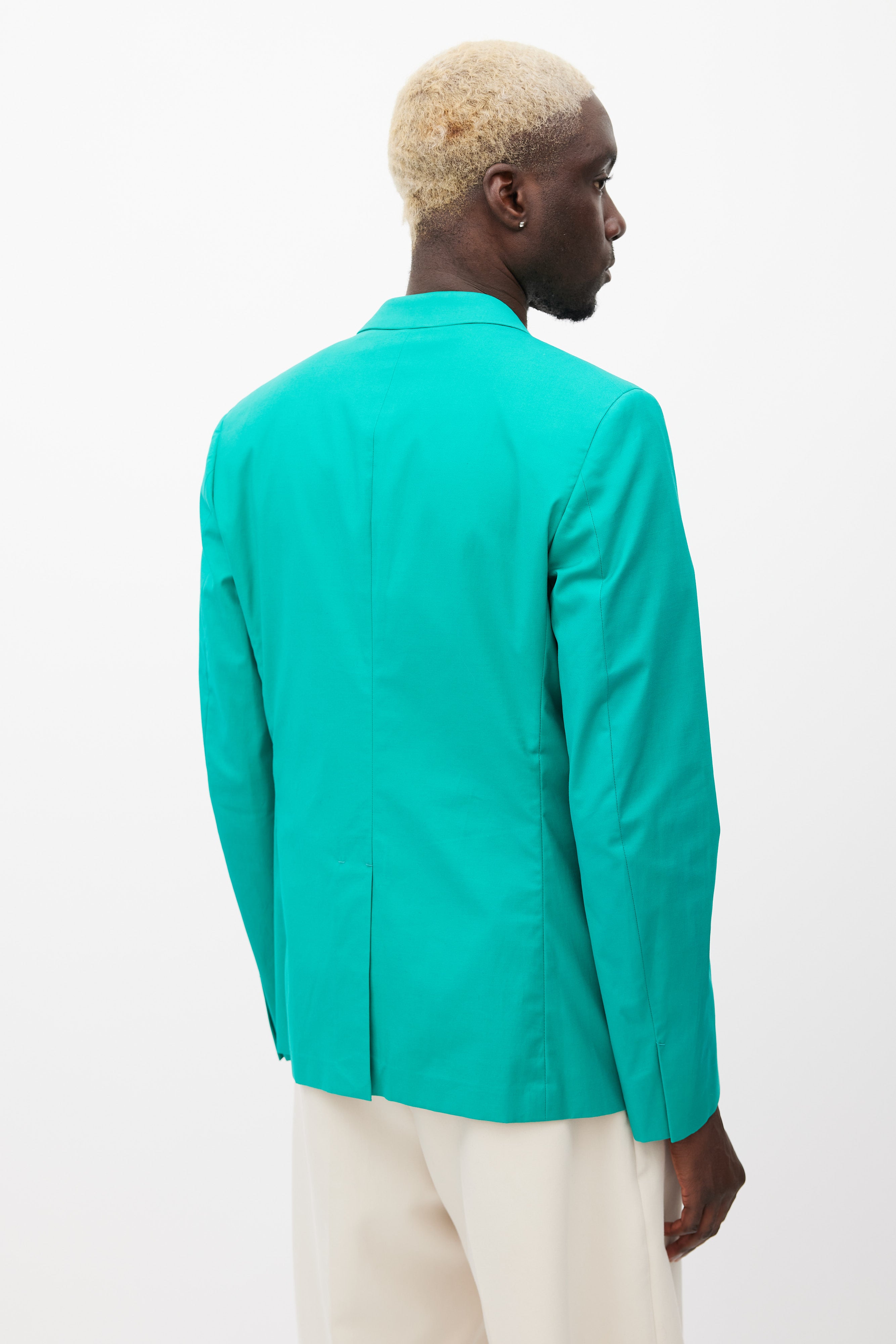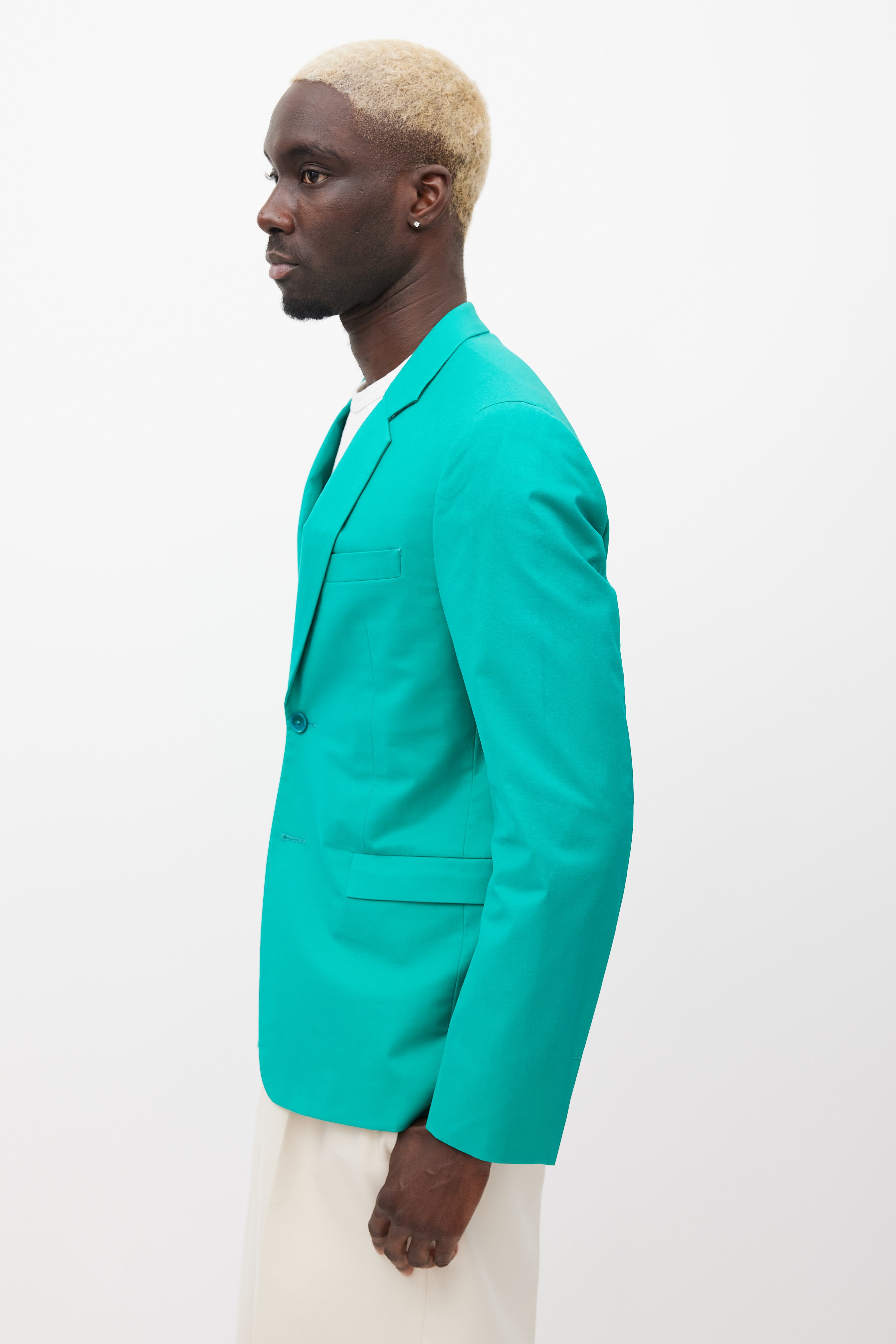 Pre-owned Jil Sander green blazer featuring a notched lapel, long sleeves, one welt pocket at chest, two flap pockets at hip, and button up closure. Lined.