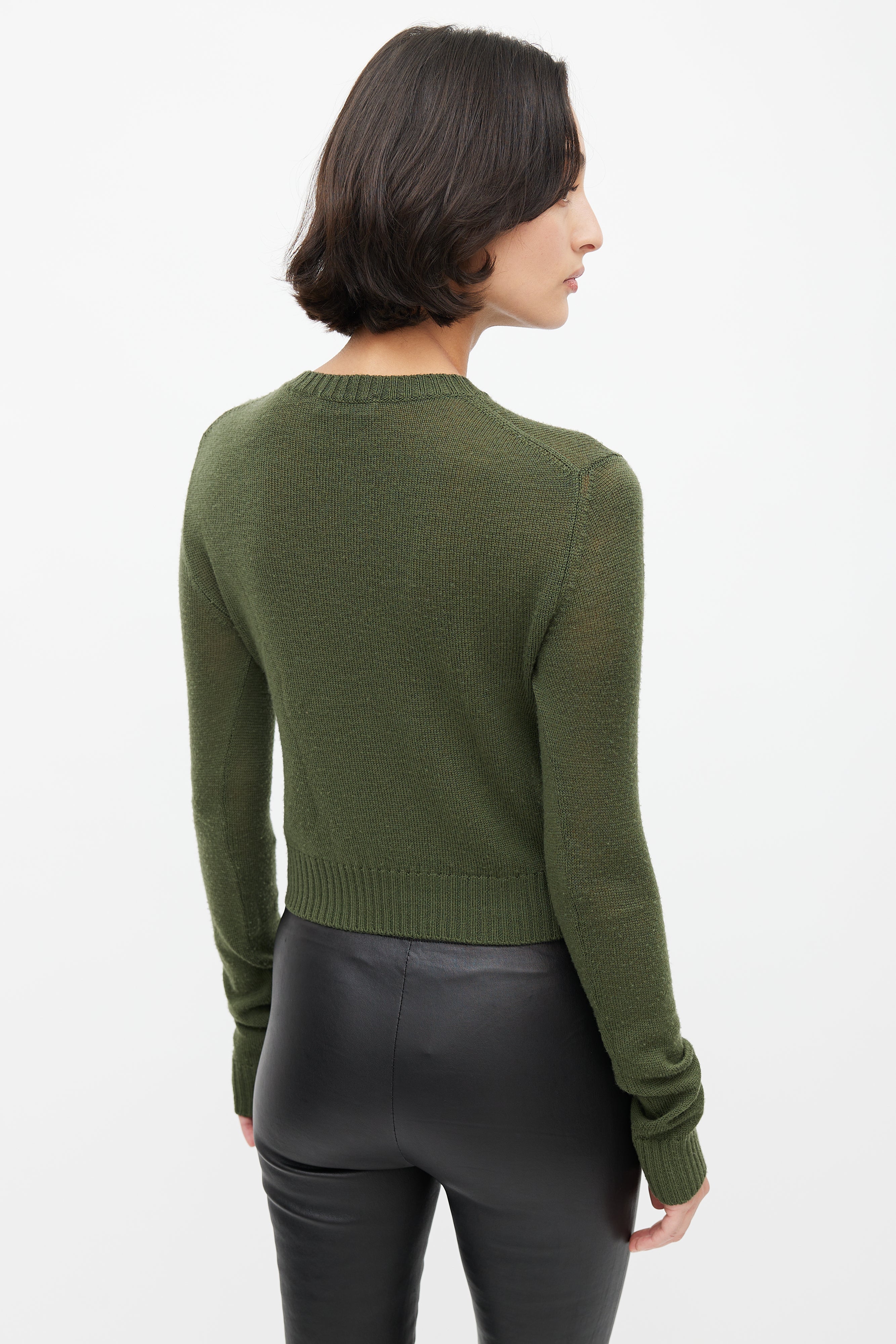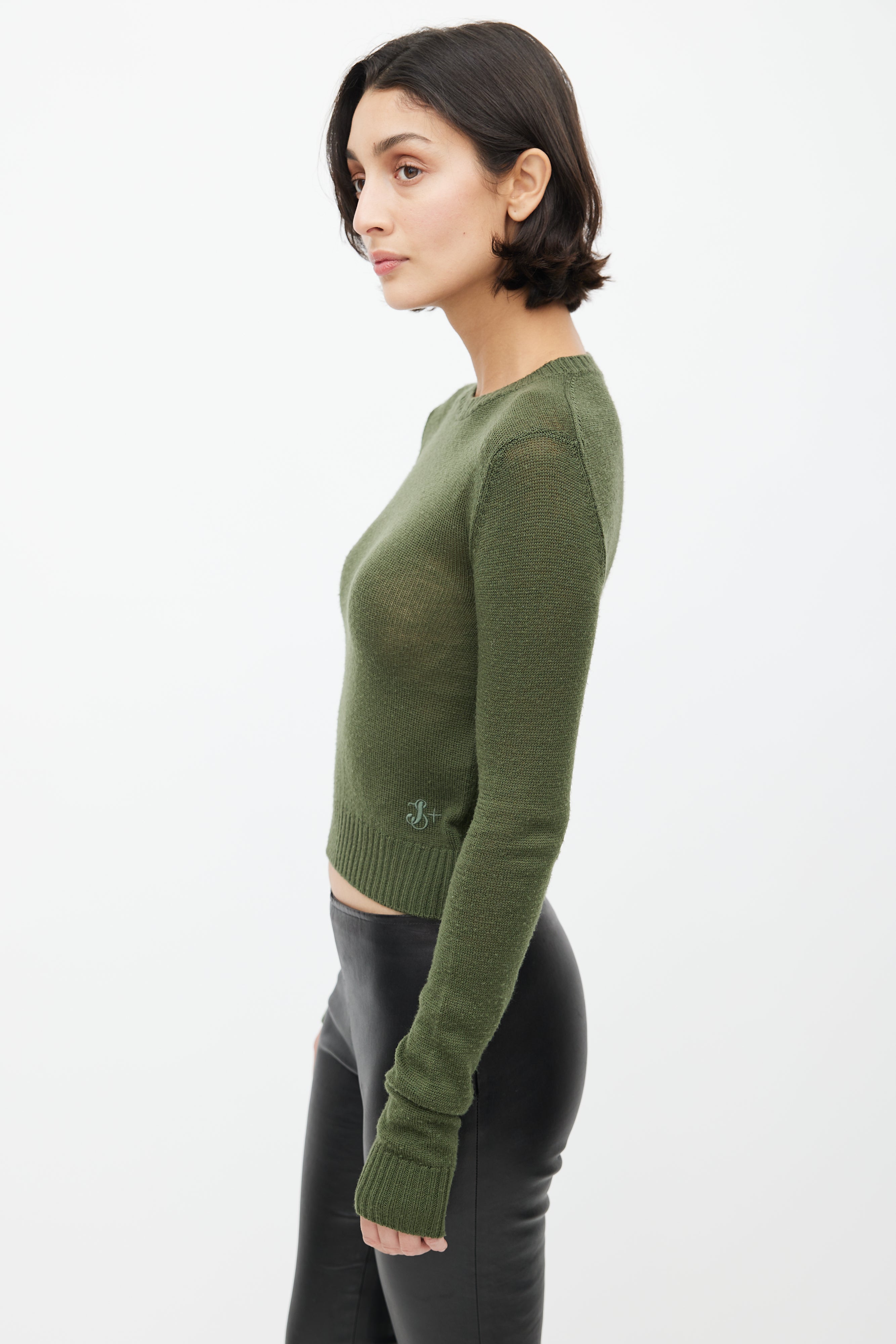 Pre-owned Jil Sander green wool knit sweater featuring a crew neckline, long sleeves, and embroidered logo detail at hip.