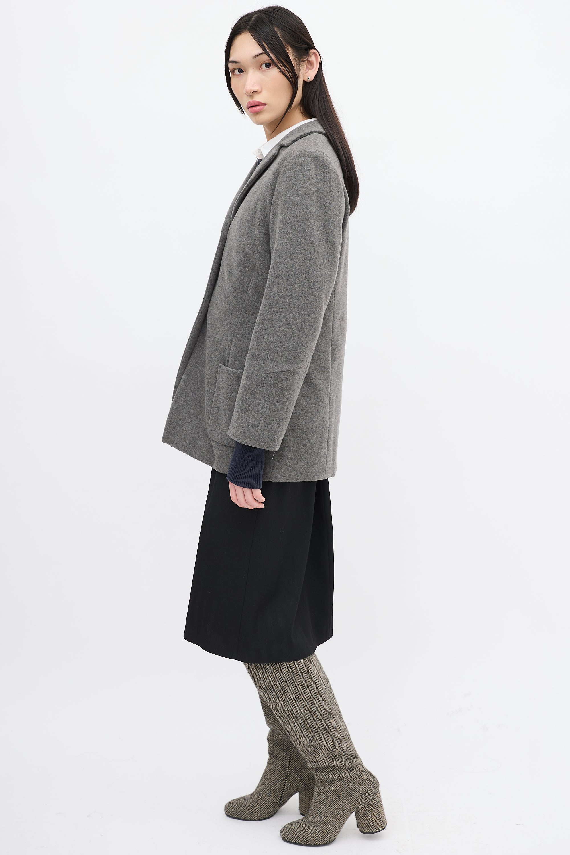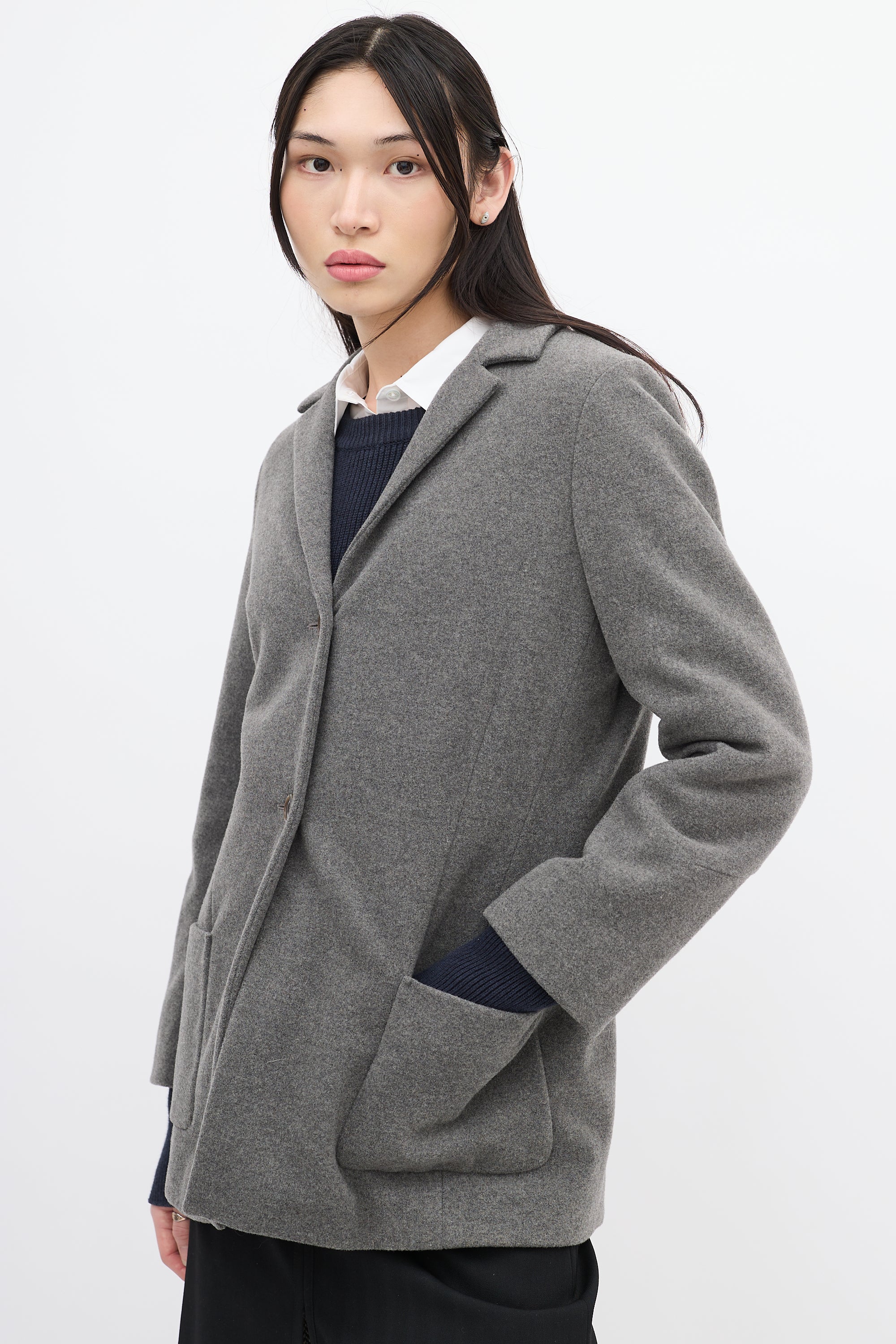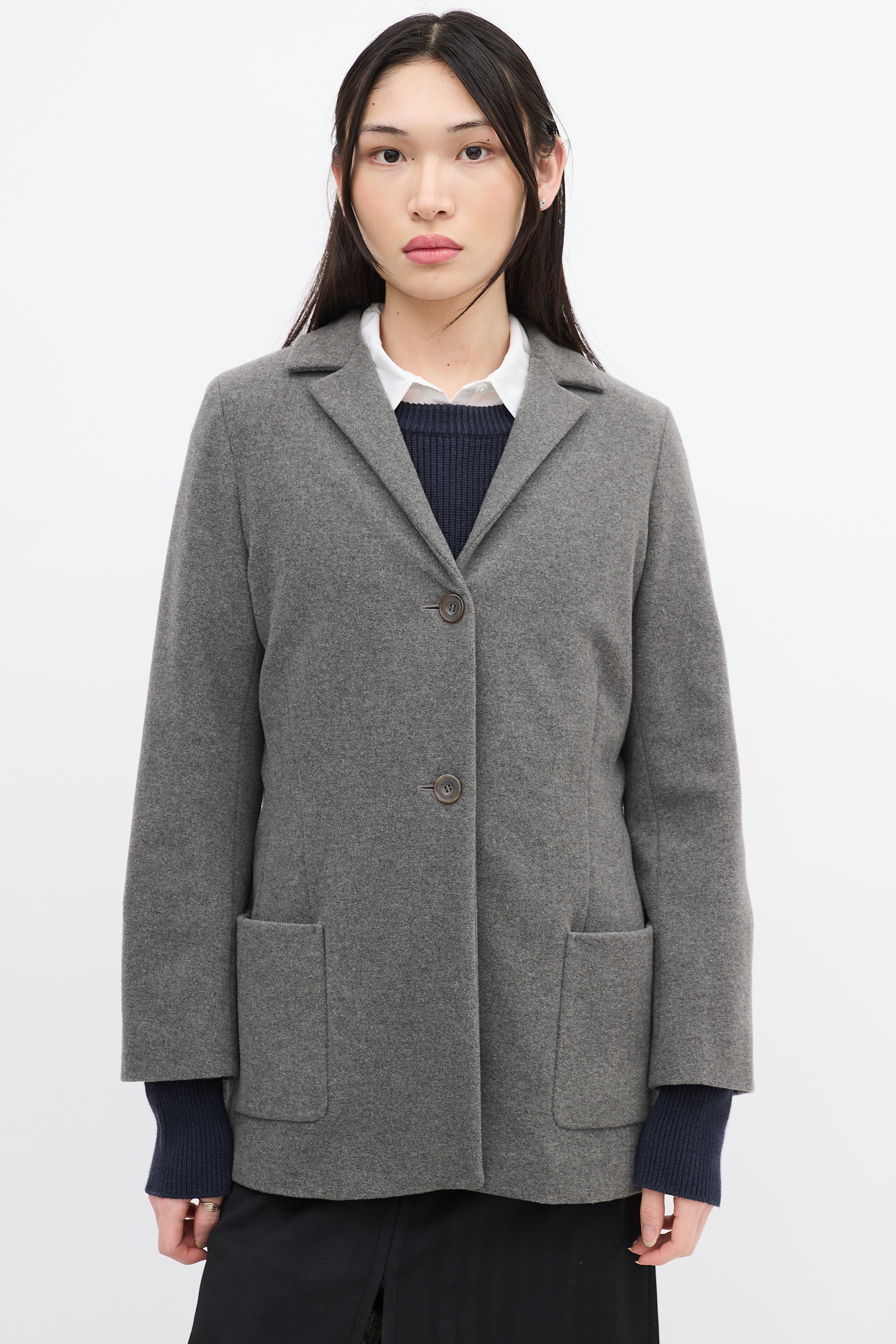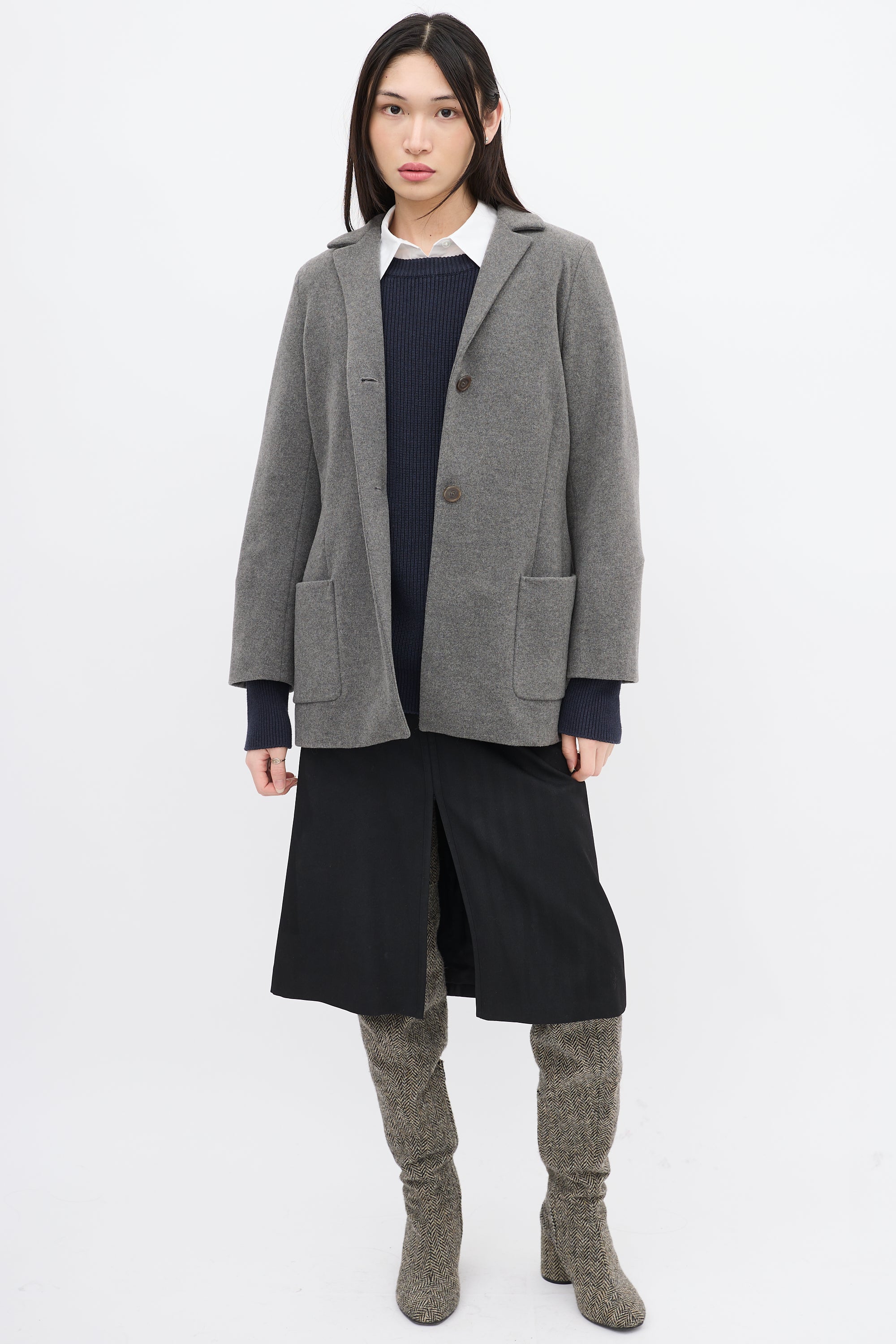 Pre-owned Jil Sander grey fleece wool jacket featuring notched lapel, button up front, and two patch pockets at hips.