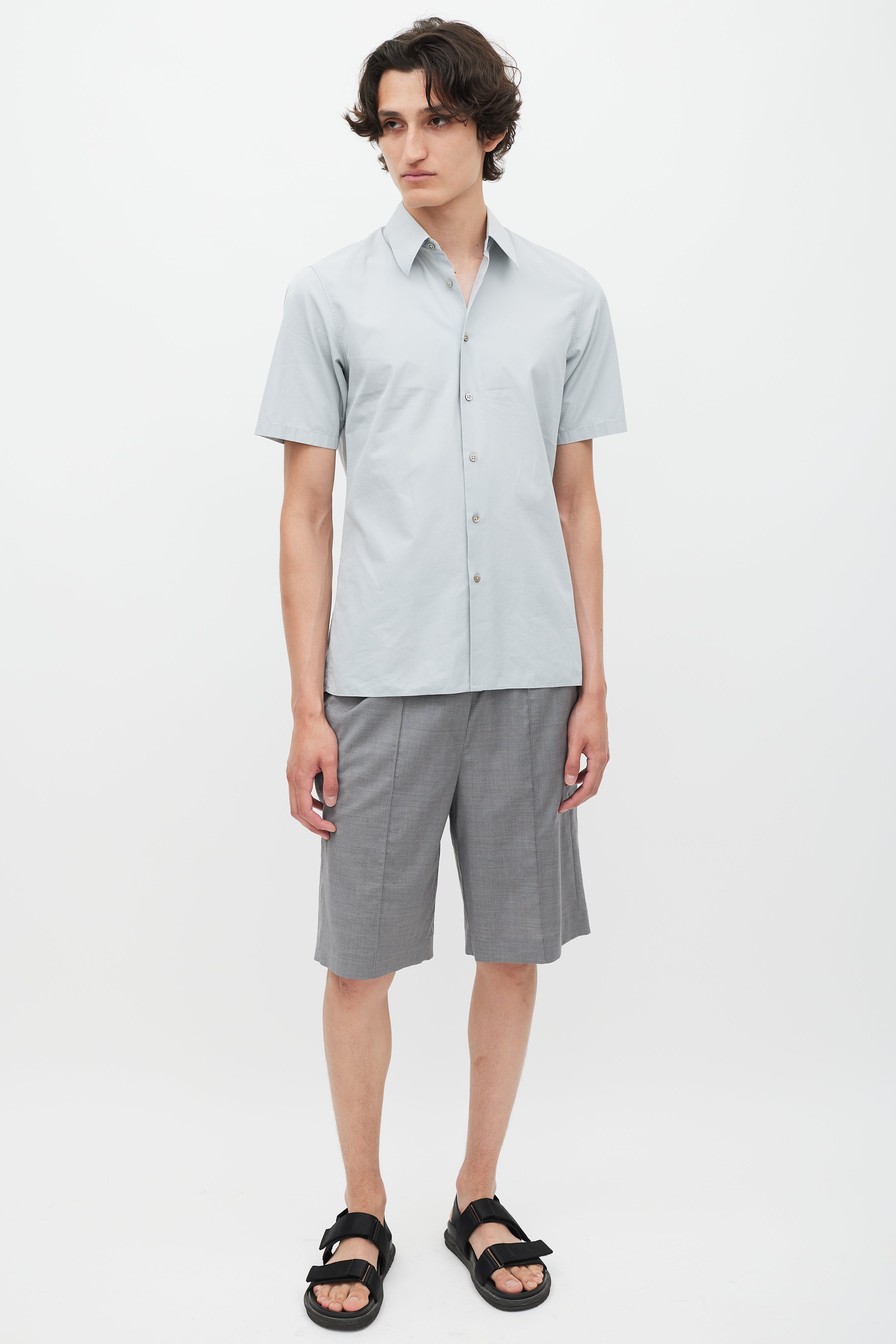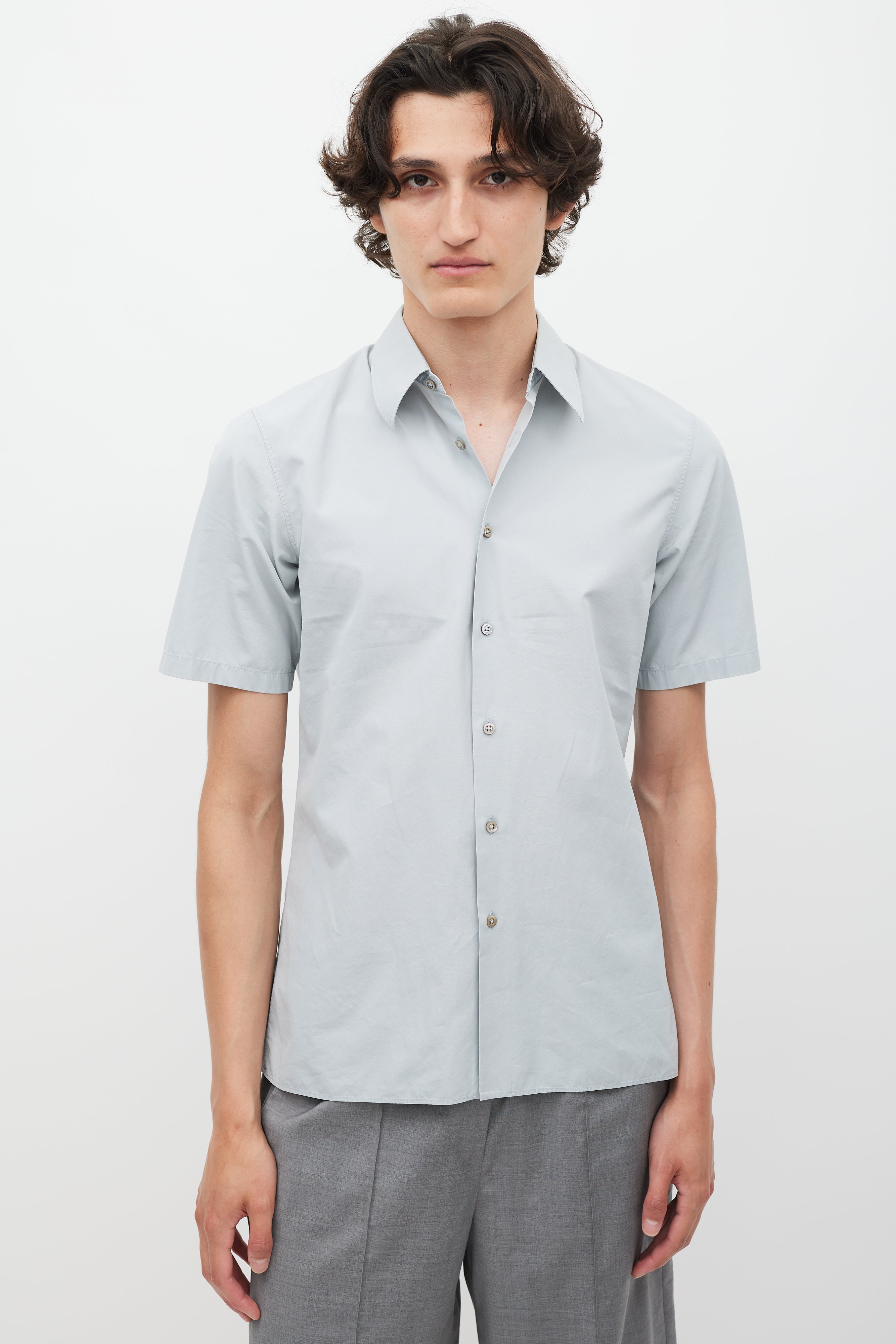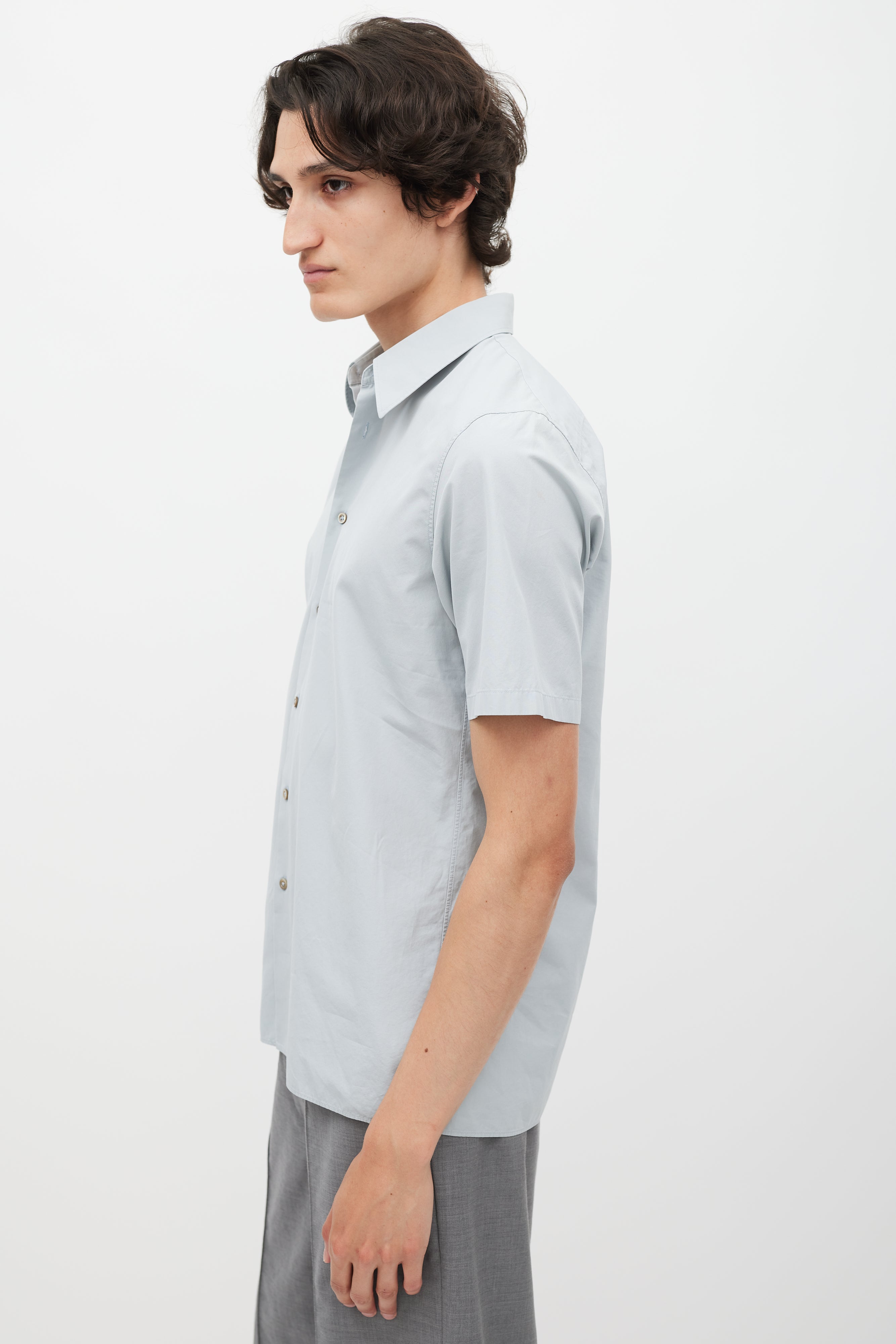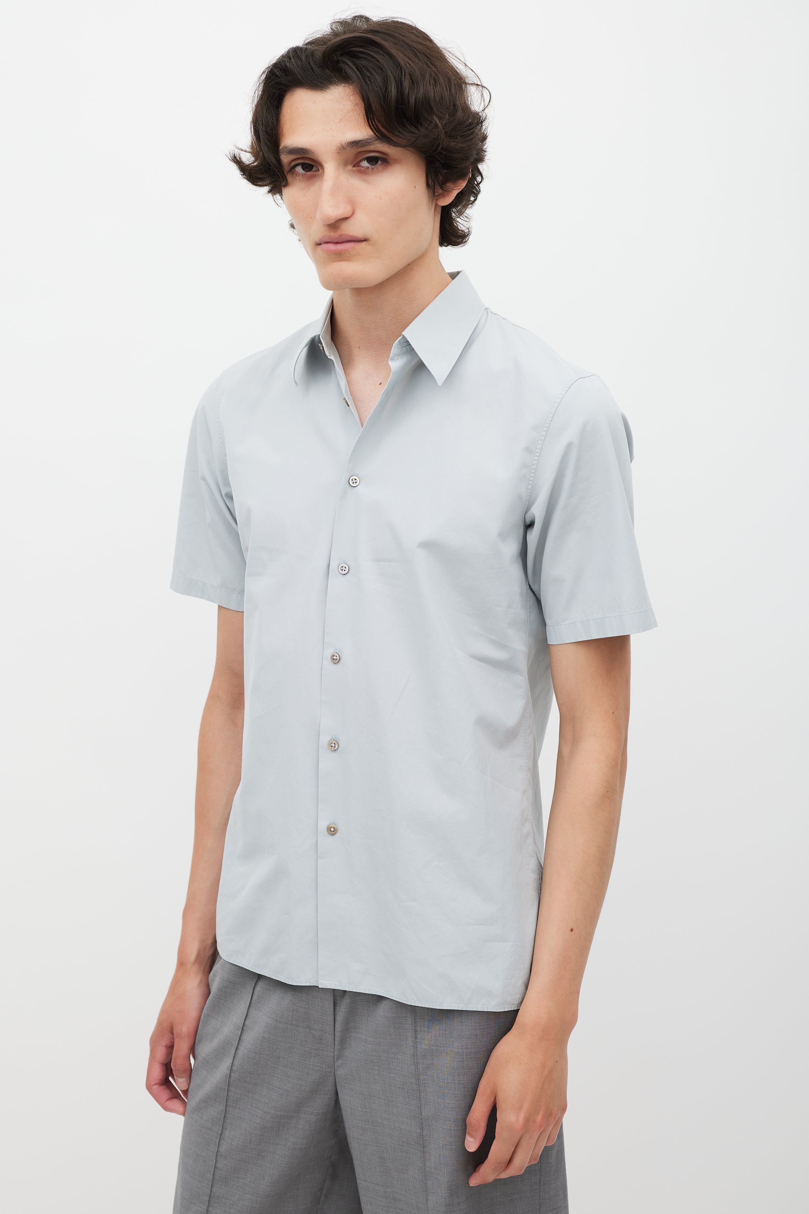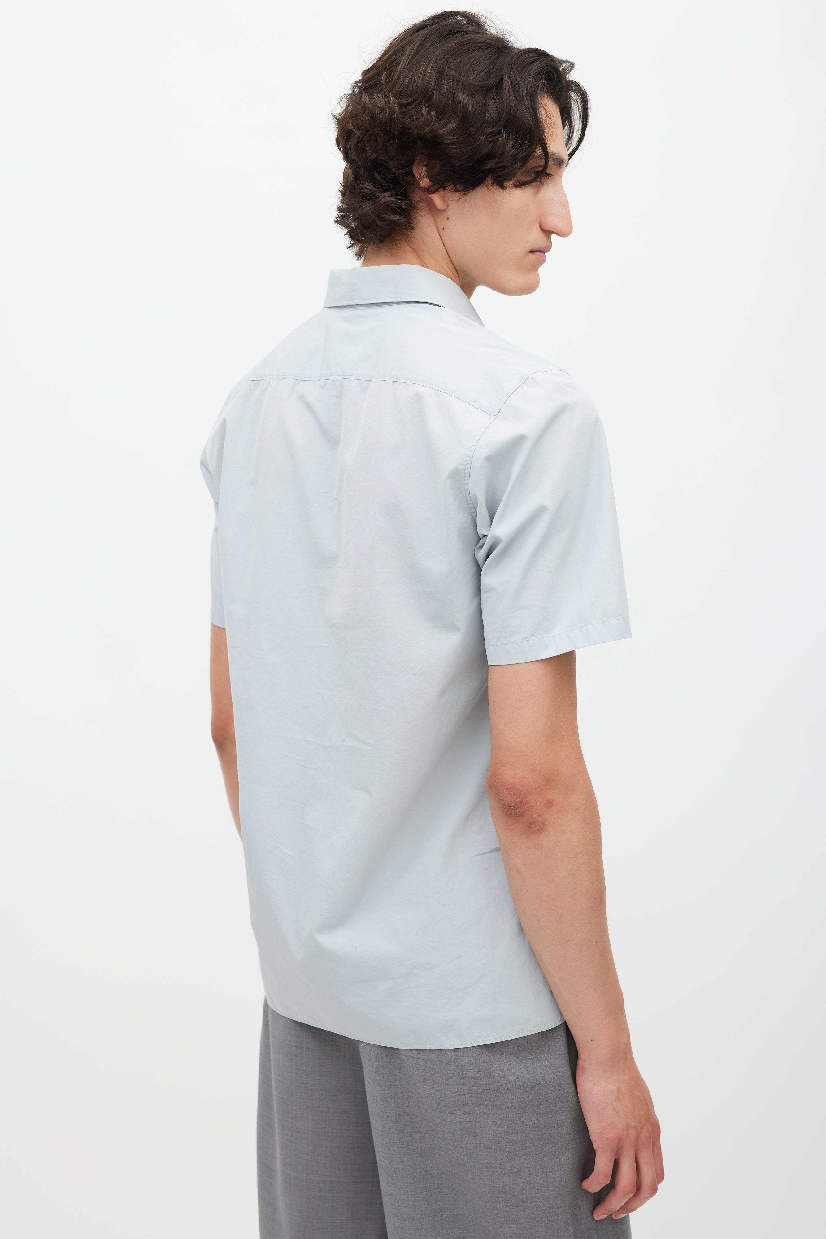 Pre-owned Jil Sander grey poplin shirt featuring a pointed collar, short sleeves, and button up closure.
