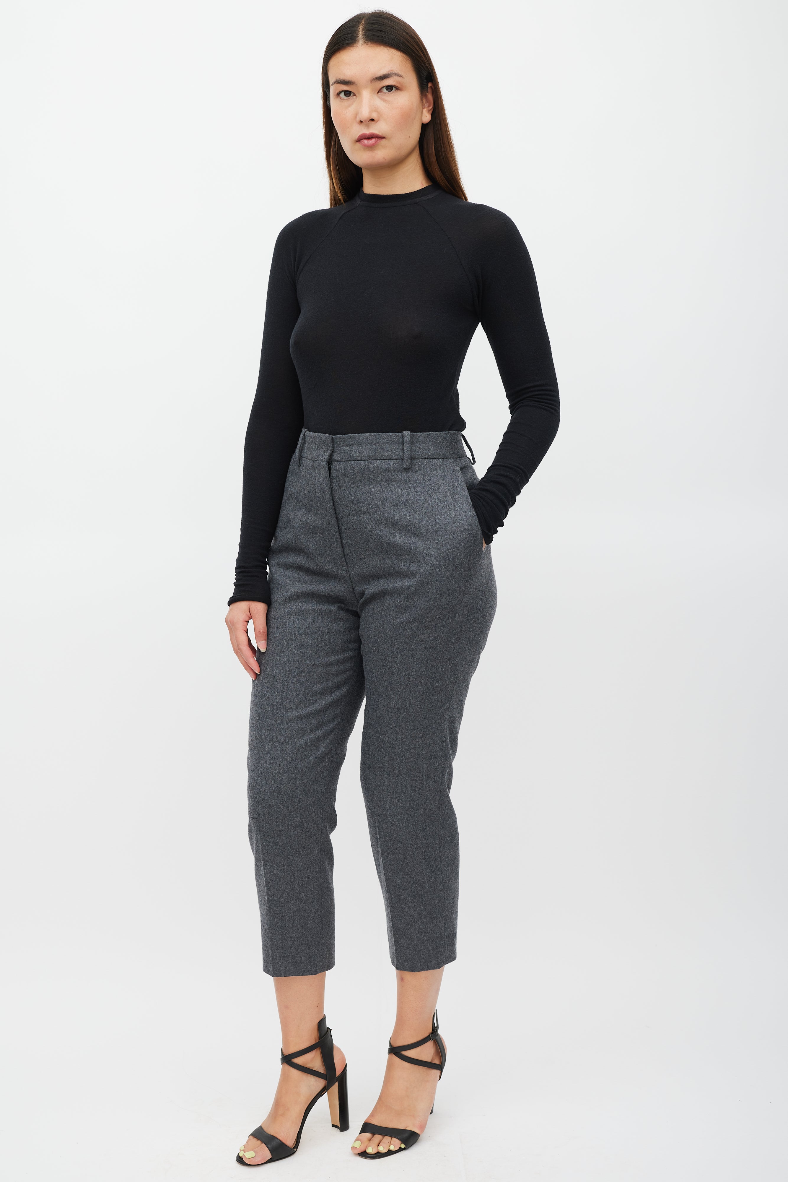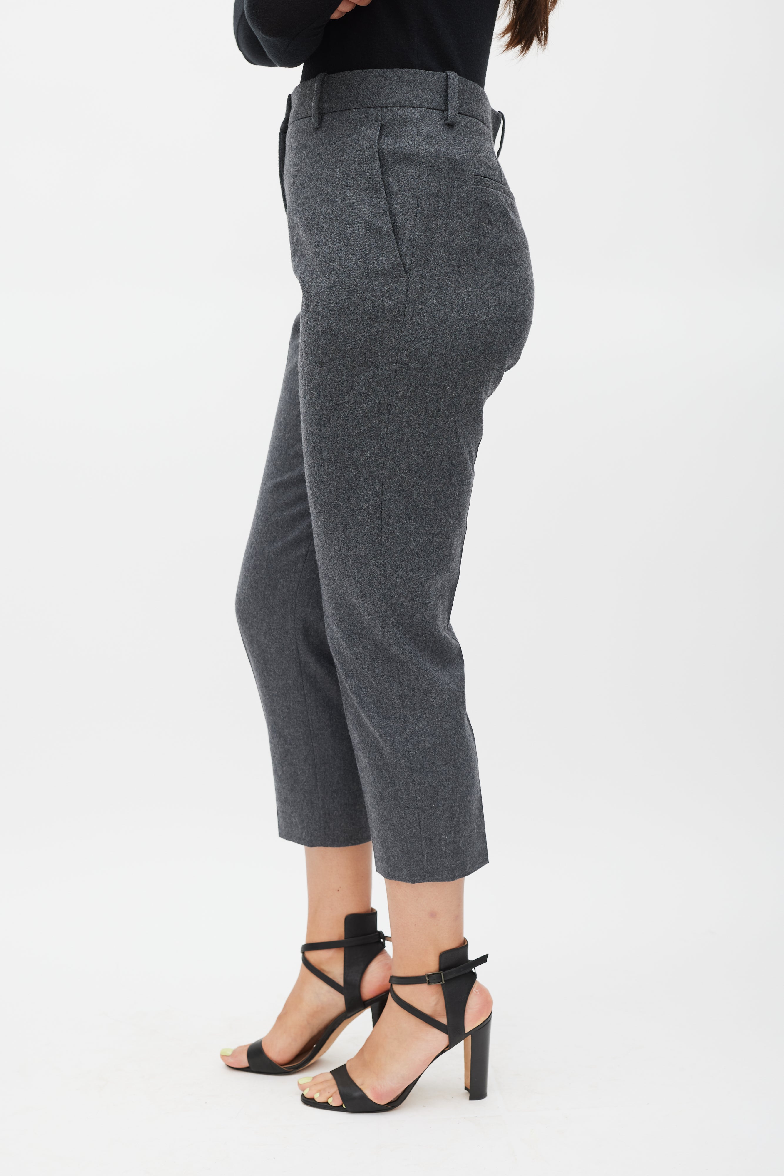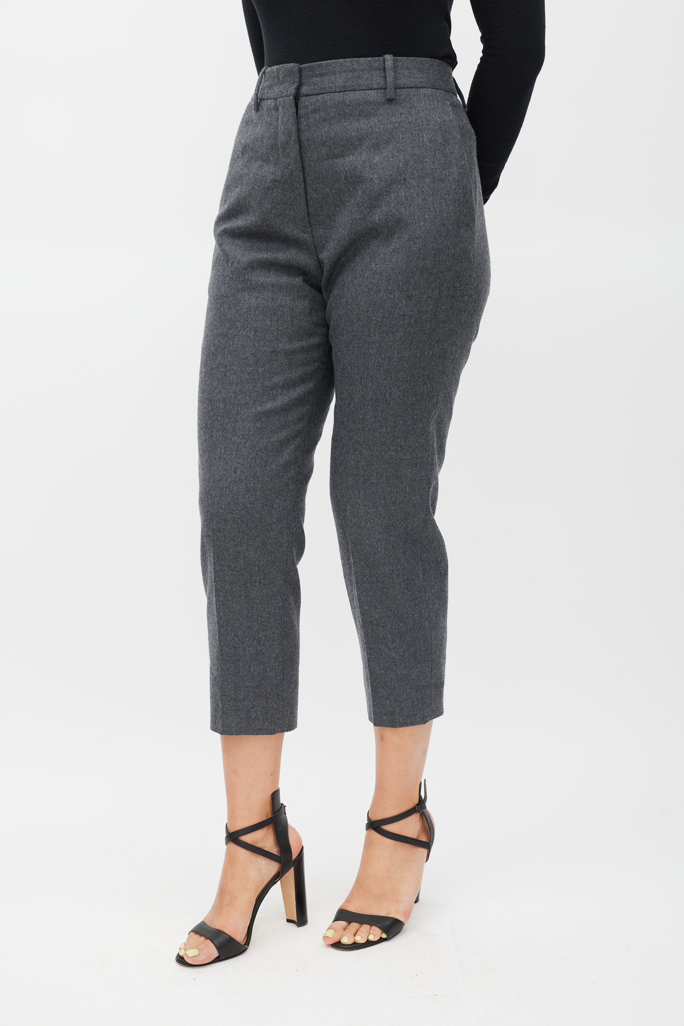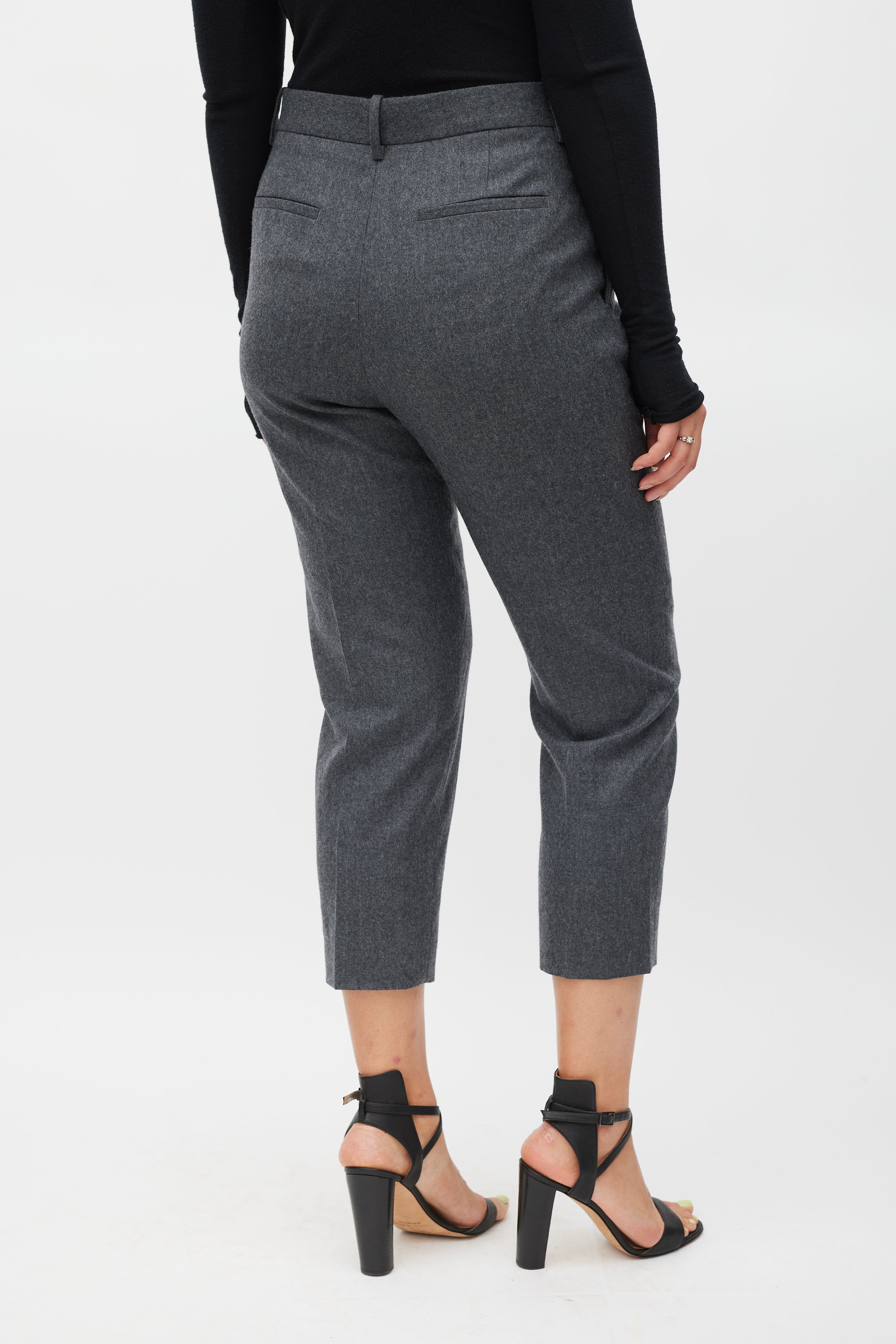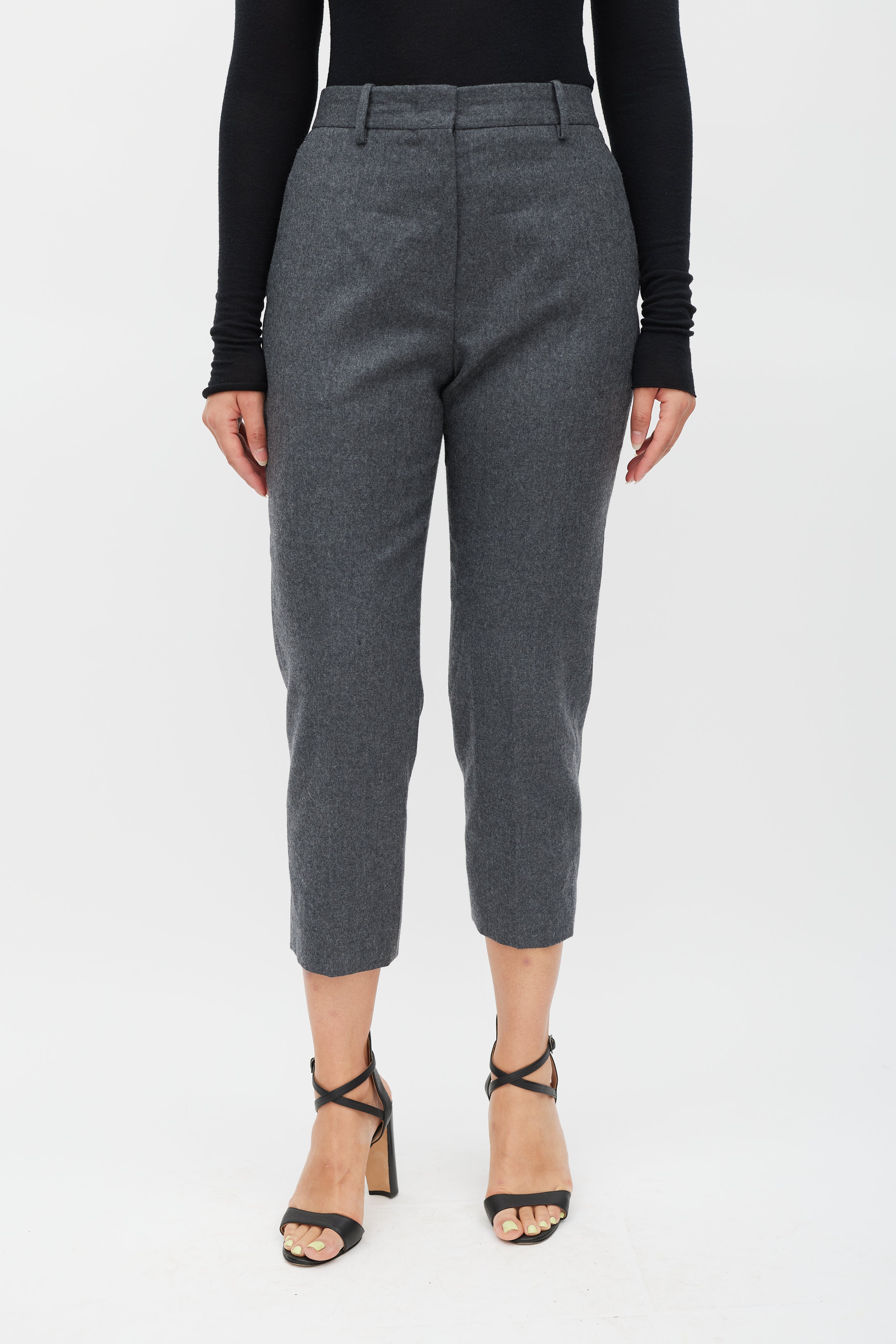 Pre-owned Jil Sander grey wool trousers featuring two slip pockets at hip, two welt pockets at back, tapered leg, and zip fly with hook and eye closure. Lined.
