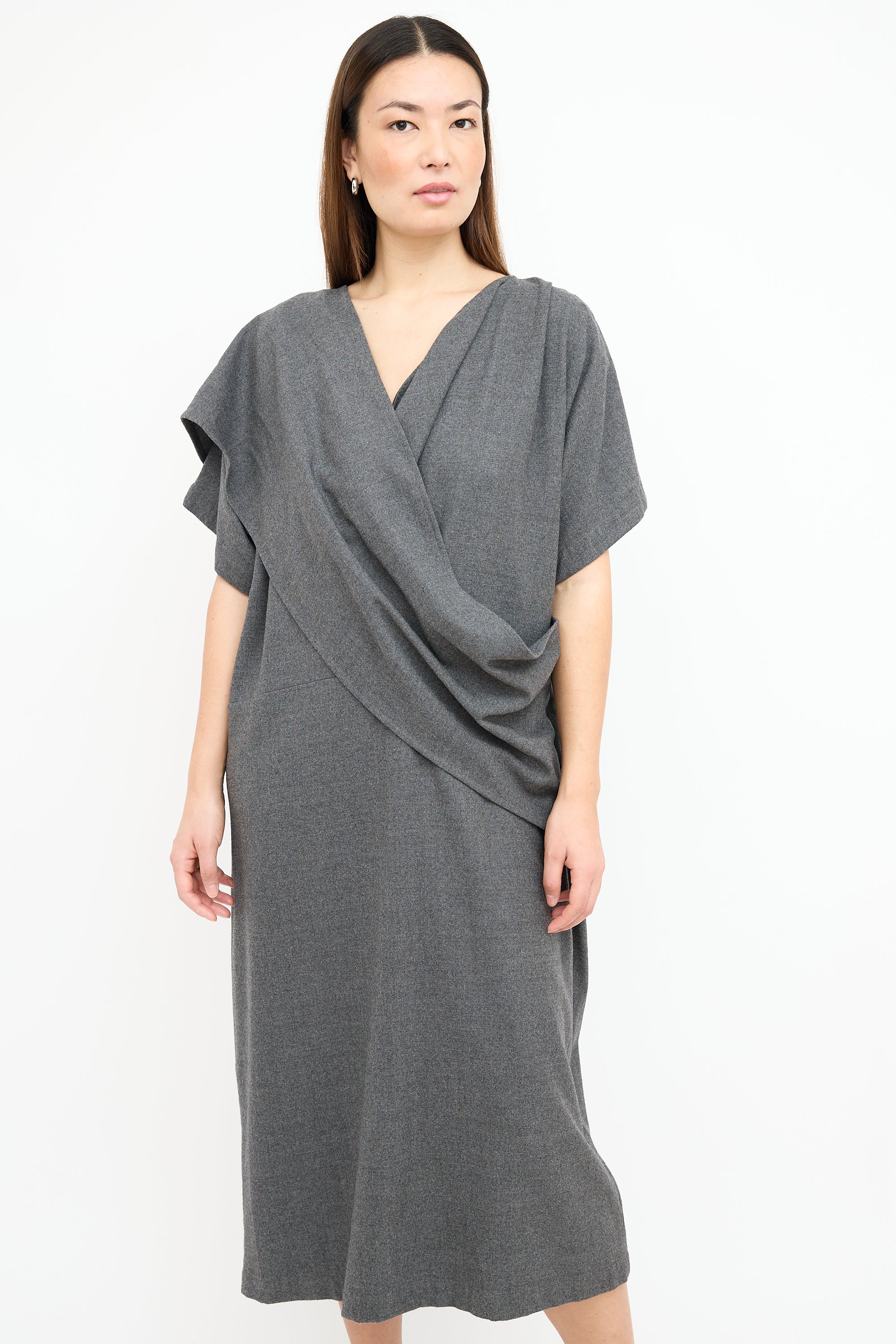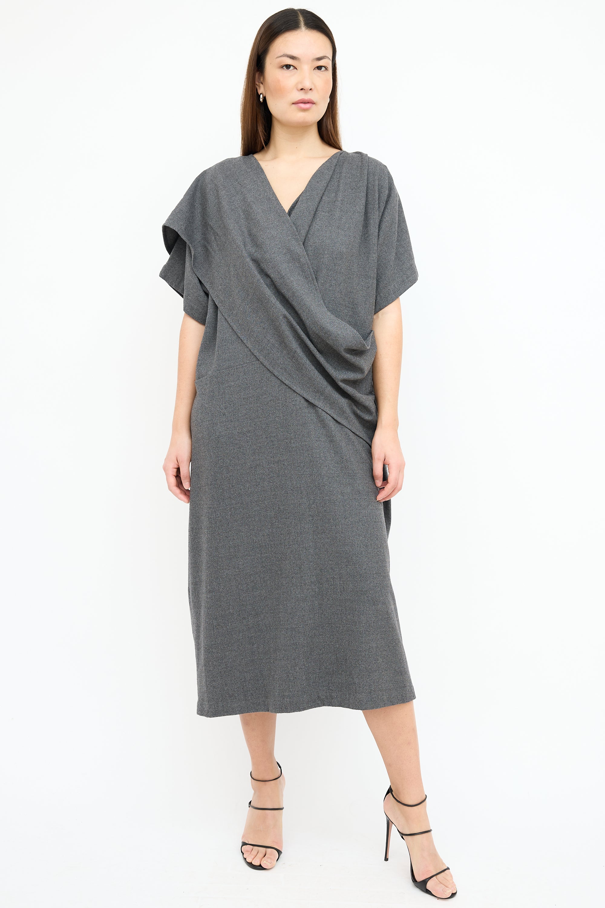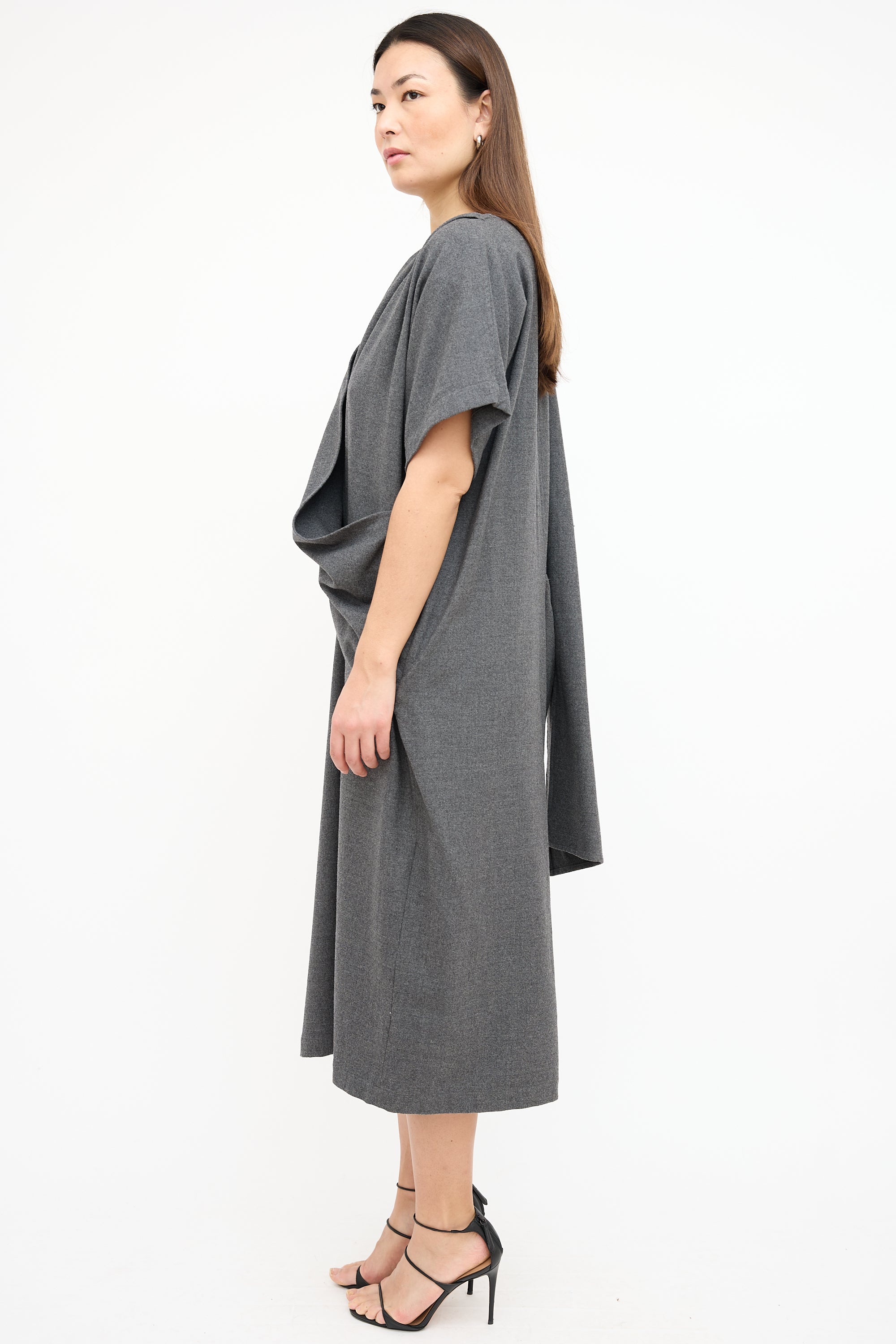Pre-owned Jil Sander grey wool dress featuring boat neck with cowl back, center seam, single slip pocket at hip, and attached multi-styling sash at hip.