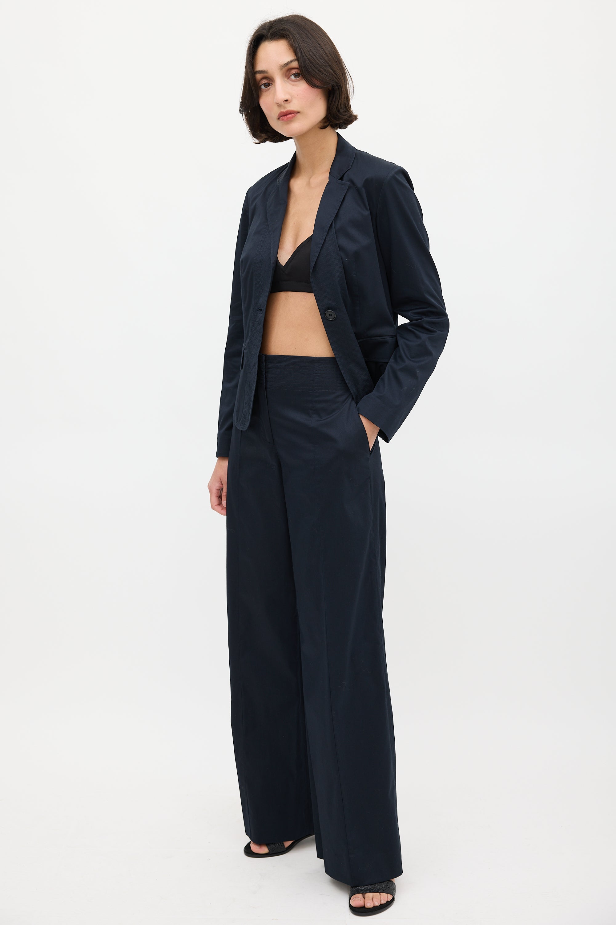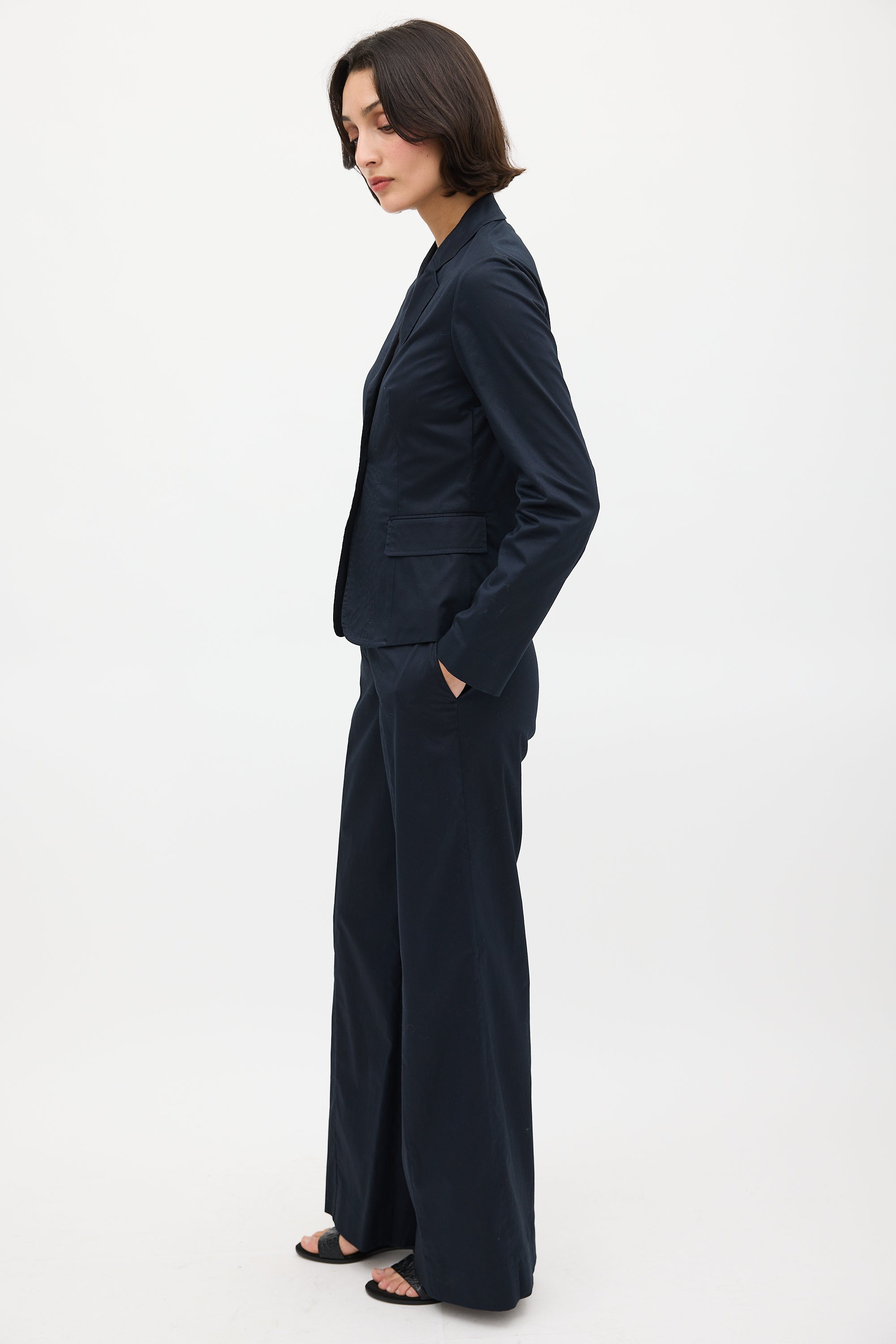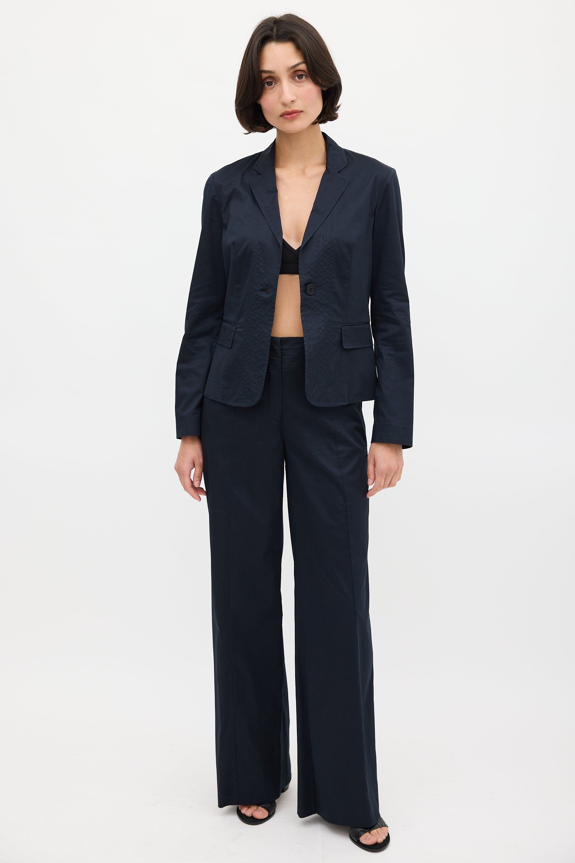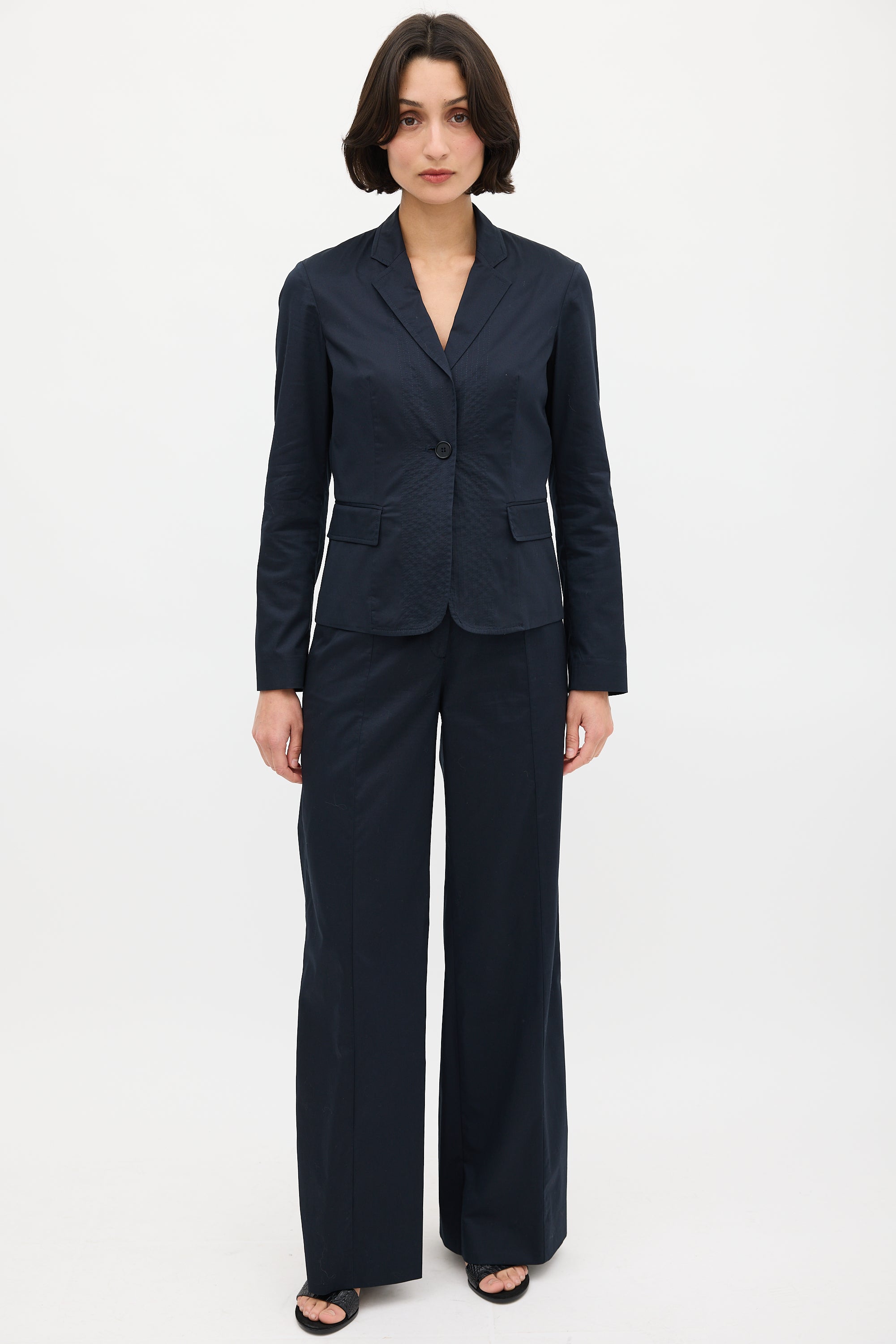 Pre-owned Jil Sander navy cotton blend suit featuring blazer with a notched collar, front quilt stitching, single front button, two front flap pockets, and long sleeves. Matching trousers feature a high quilt stitched waist, two front slip pockets, single back welt pocket, dropped seat, wide straight leg, and zip fly. Clipped to fit model.