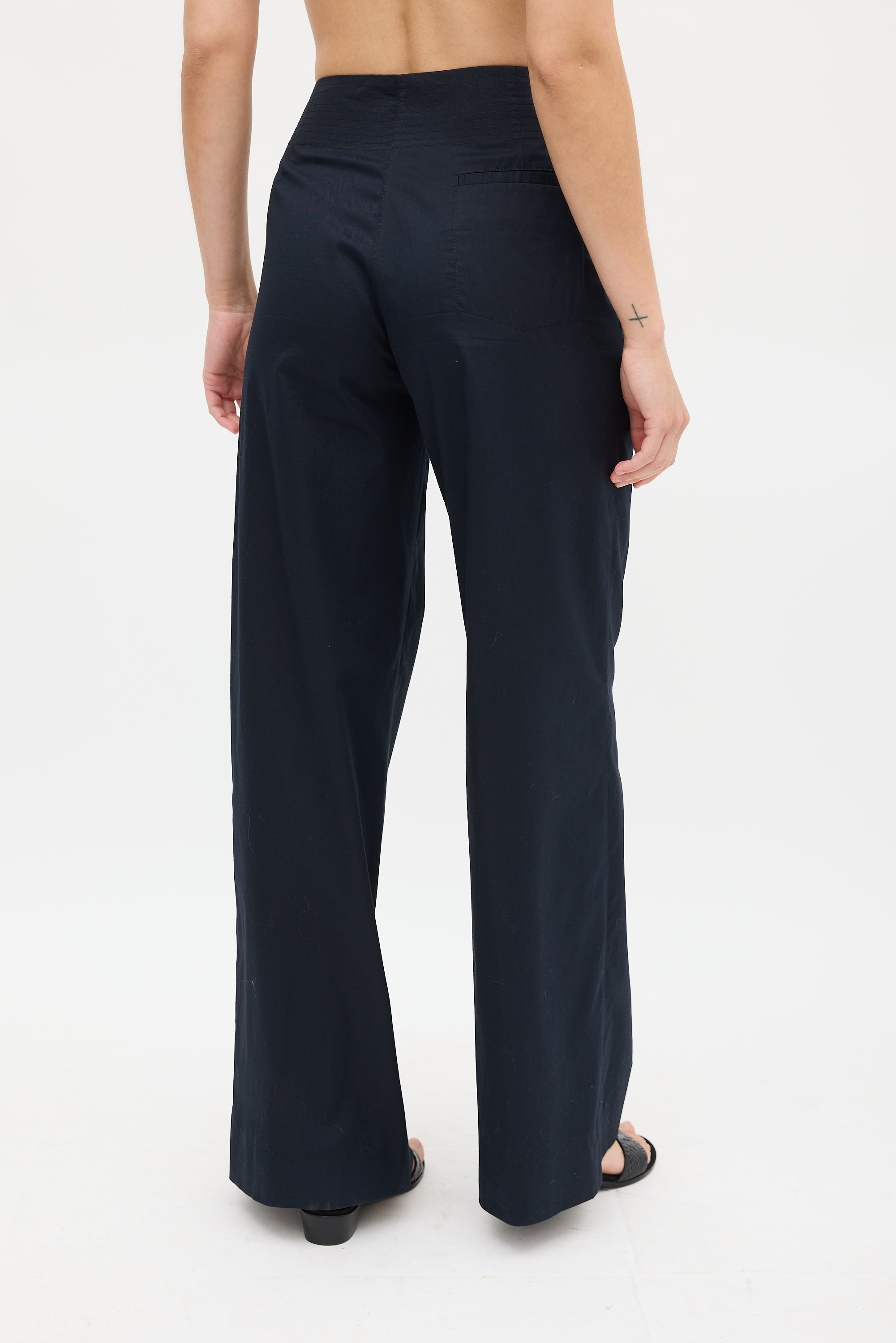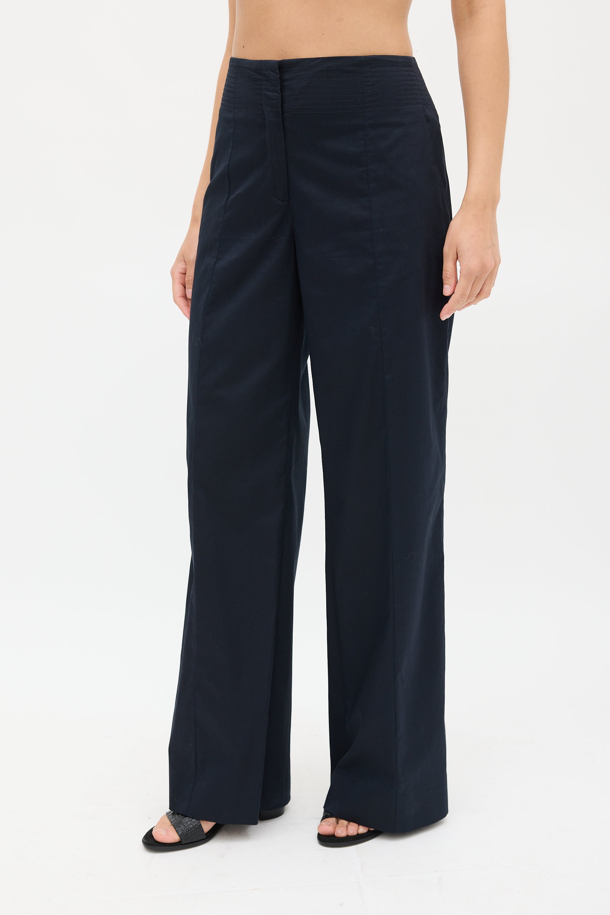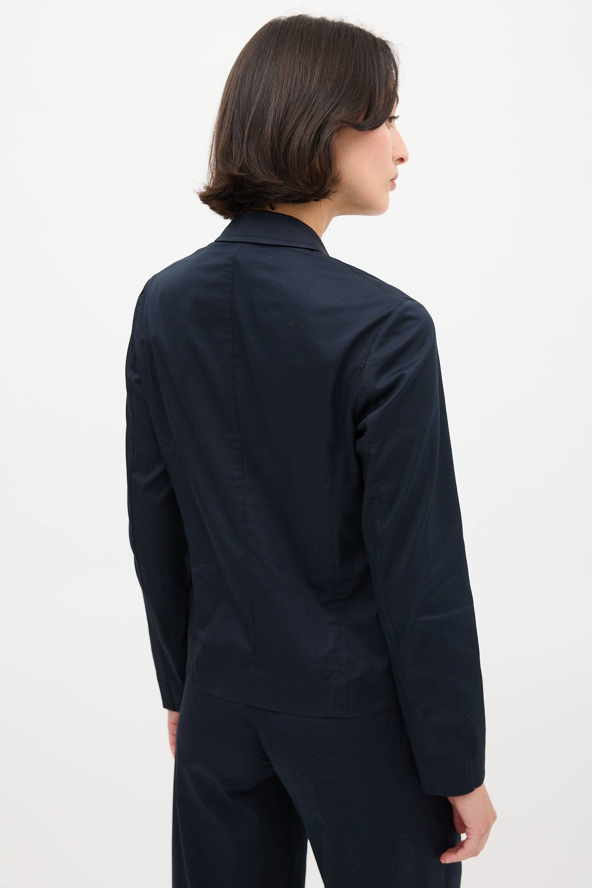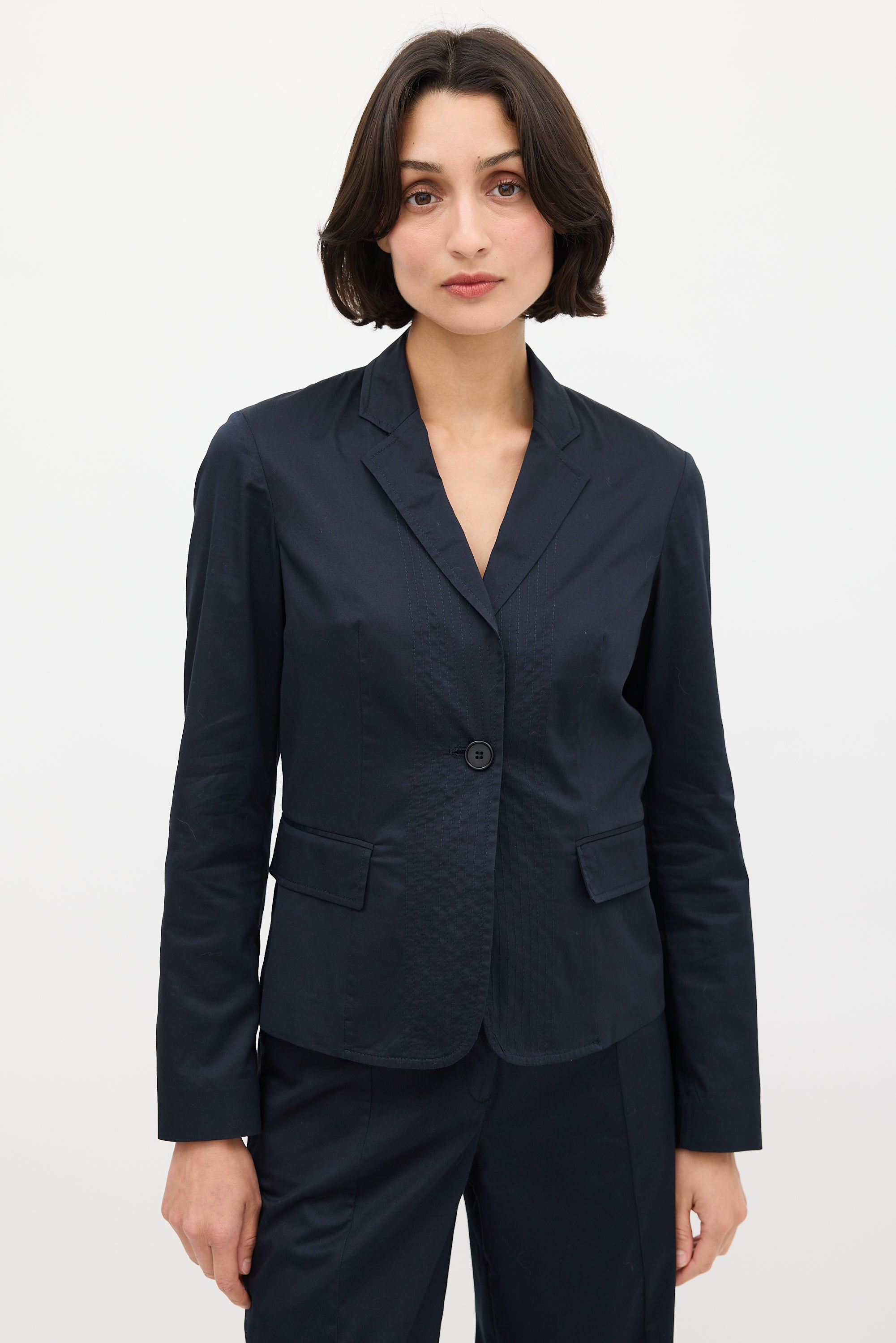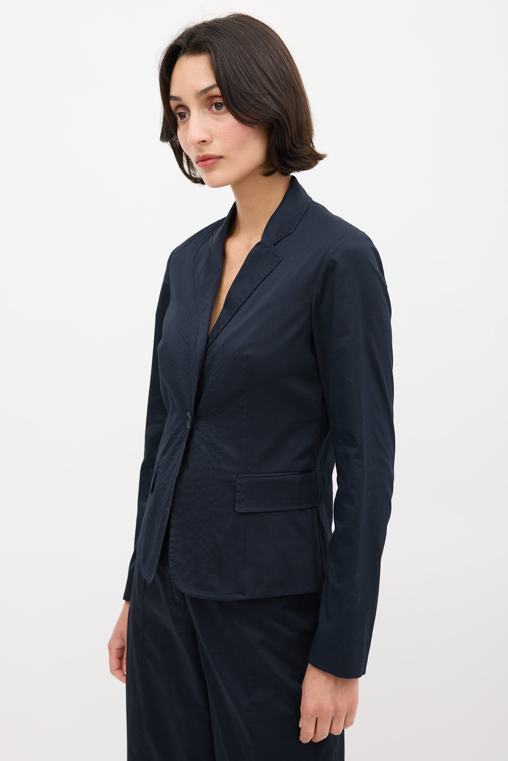 Pre-owned Jil Sander navy cotton blend suit featuring blazer with a notched collar, front quilt stitching, single front button, two front flap pockets, and long sleeves. Matching trousers feature a high quilt stitched waist, two front slip pockets, single back welt pocket, dropped seat, wide straight leg, and zip fly. Clipped to fit model.