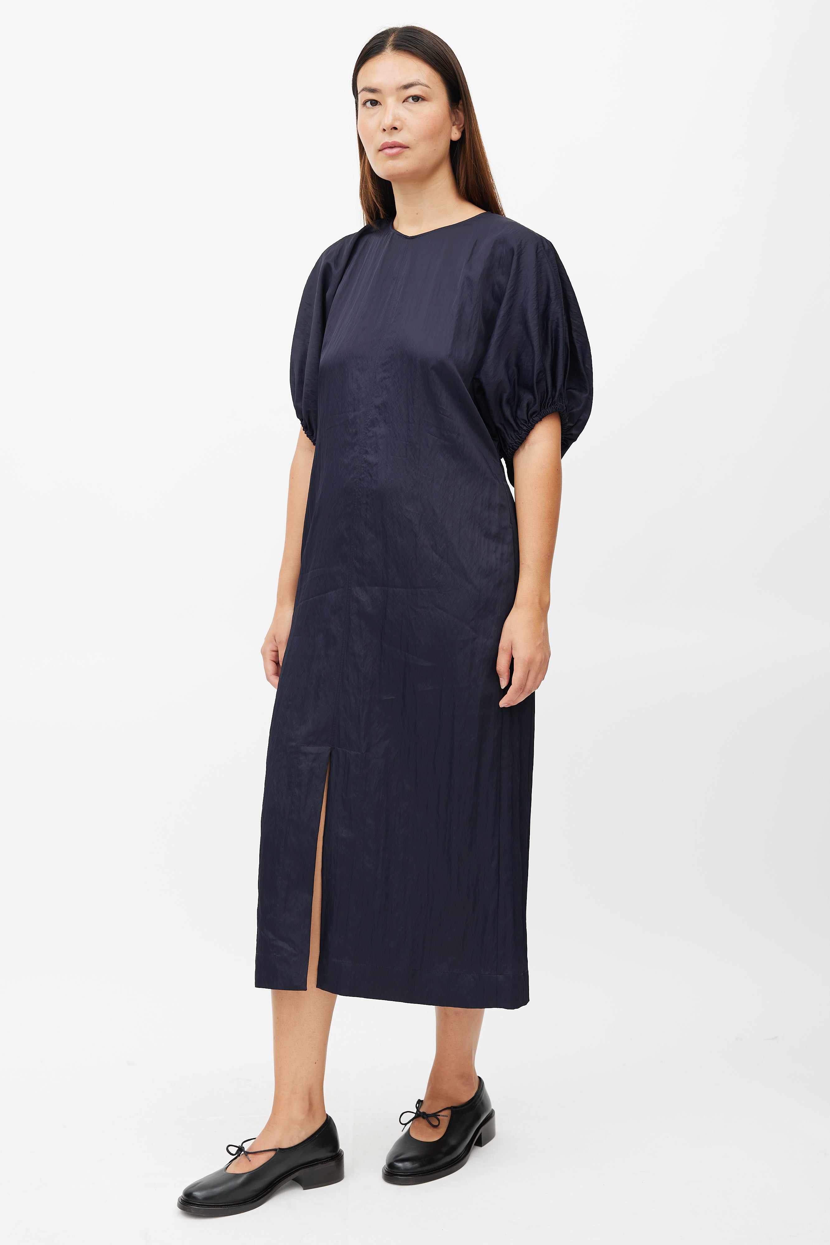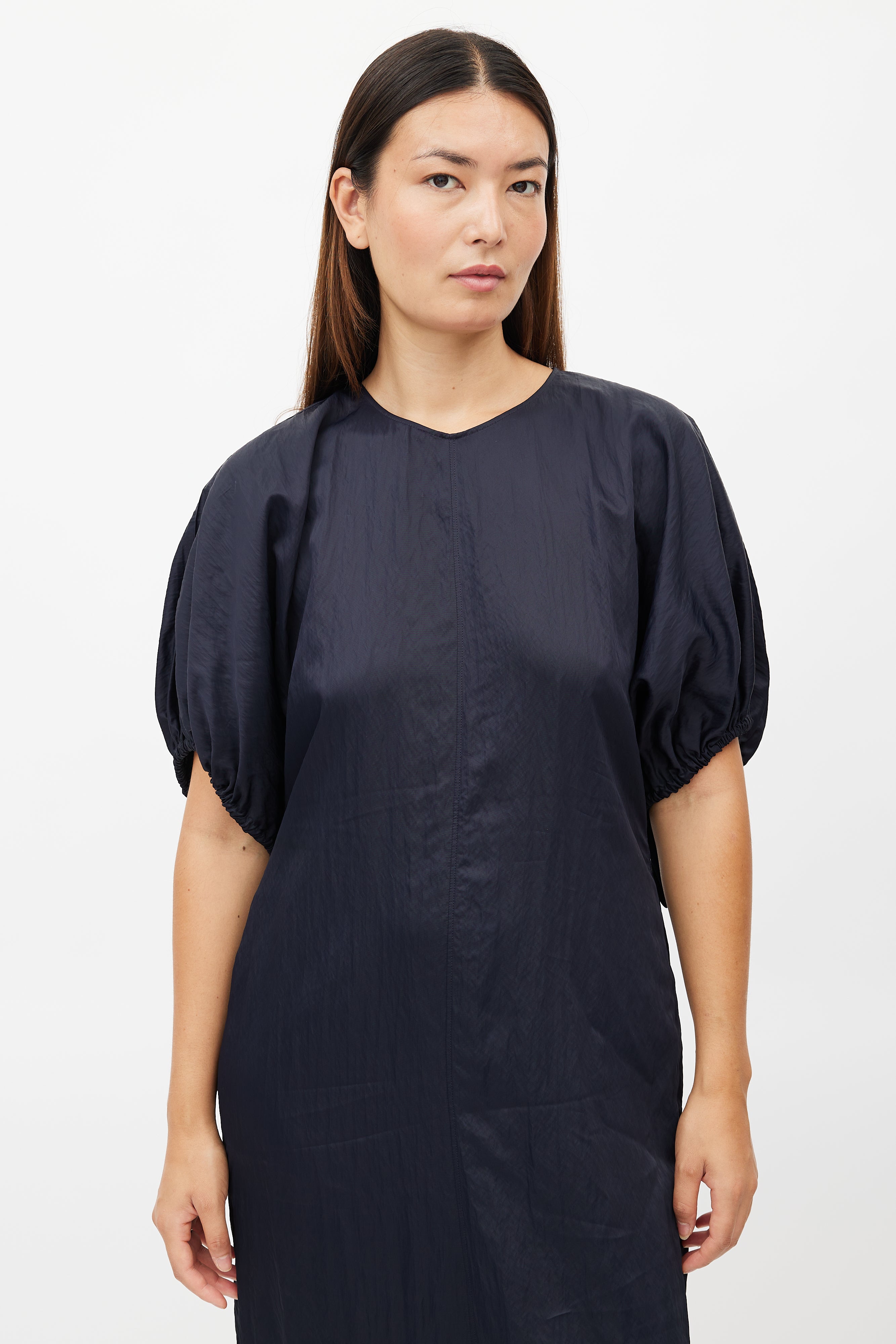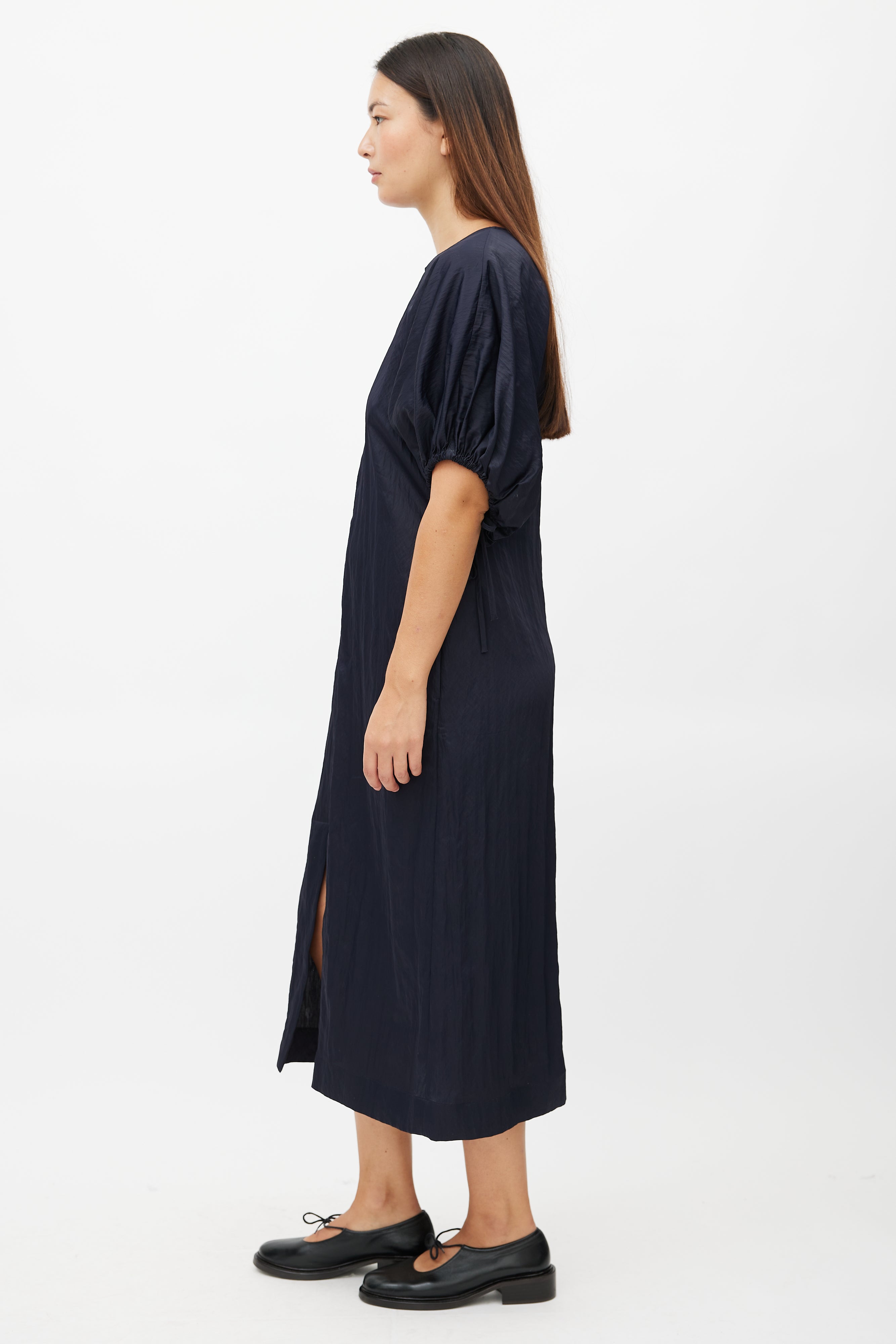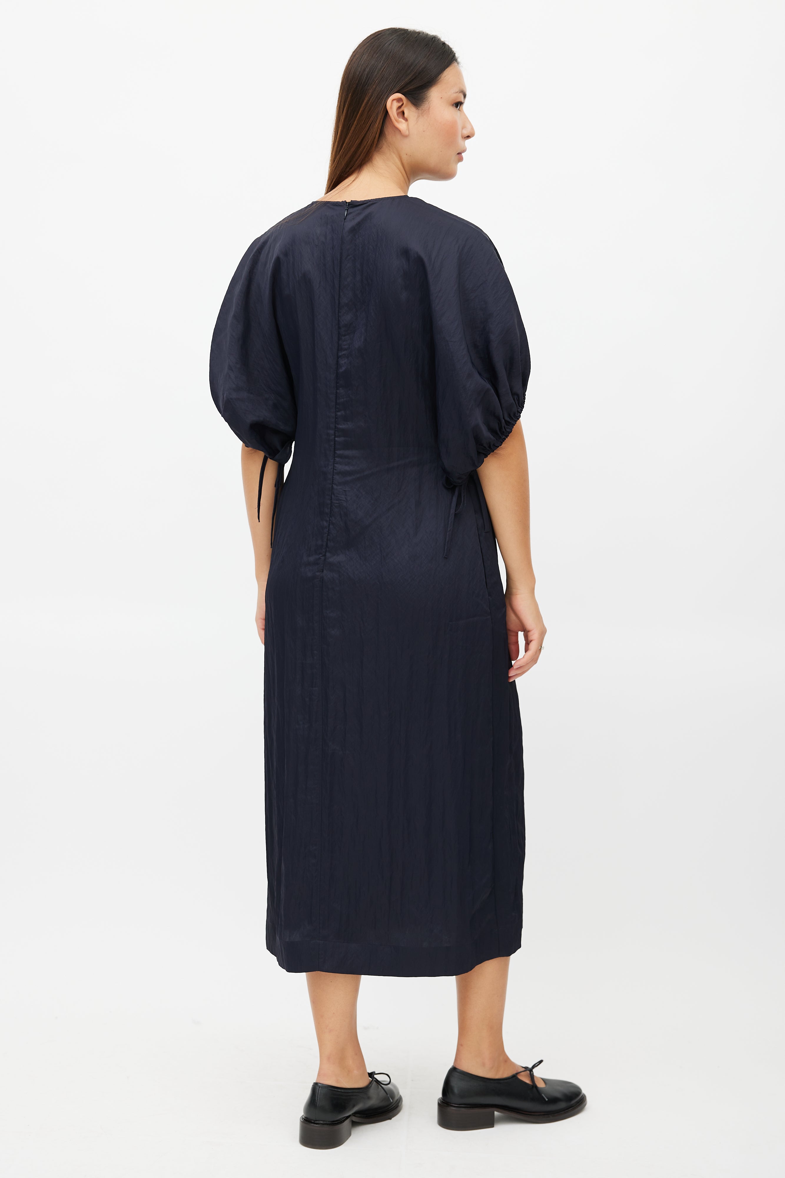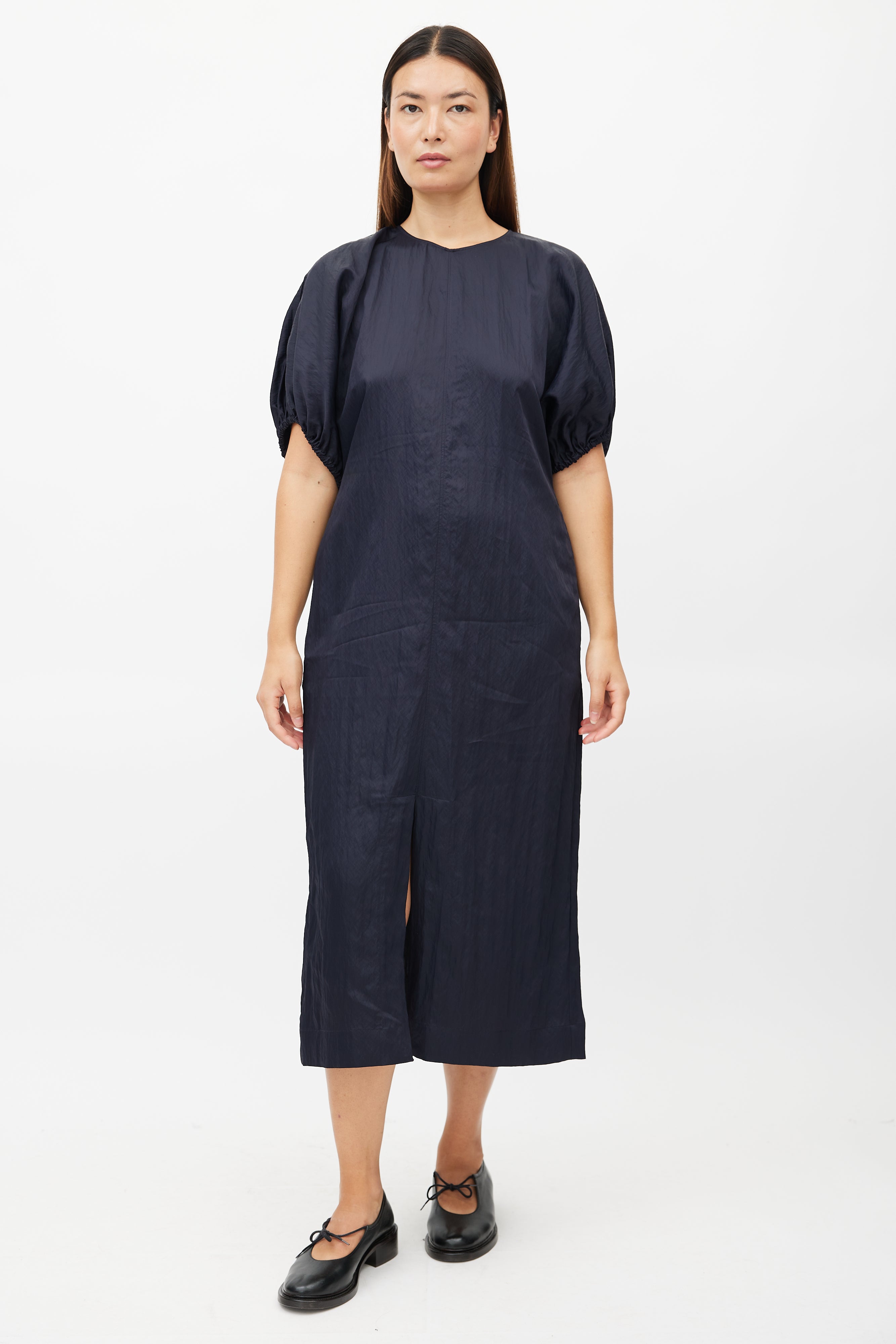 Pre-owned Jil Sander navy crinkled maxi dress featuring a round neckline, short sleeves with drawstring cuff, two slash pockets at hip, slit at hem, and zip at back with hook and eye closure.