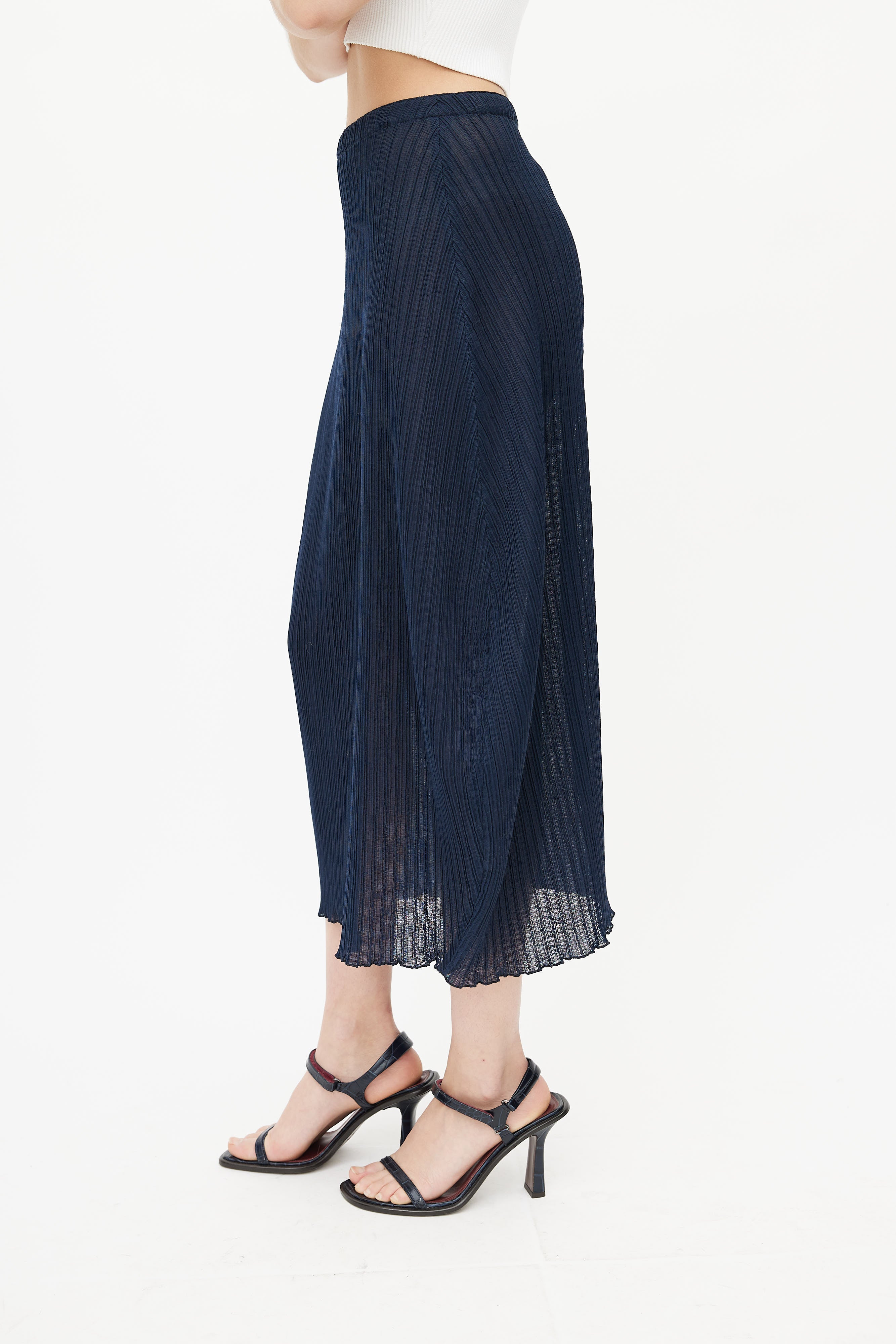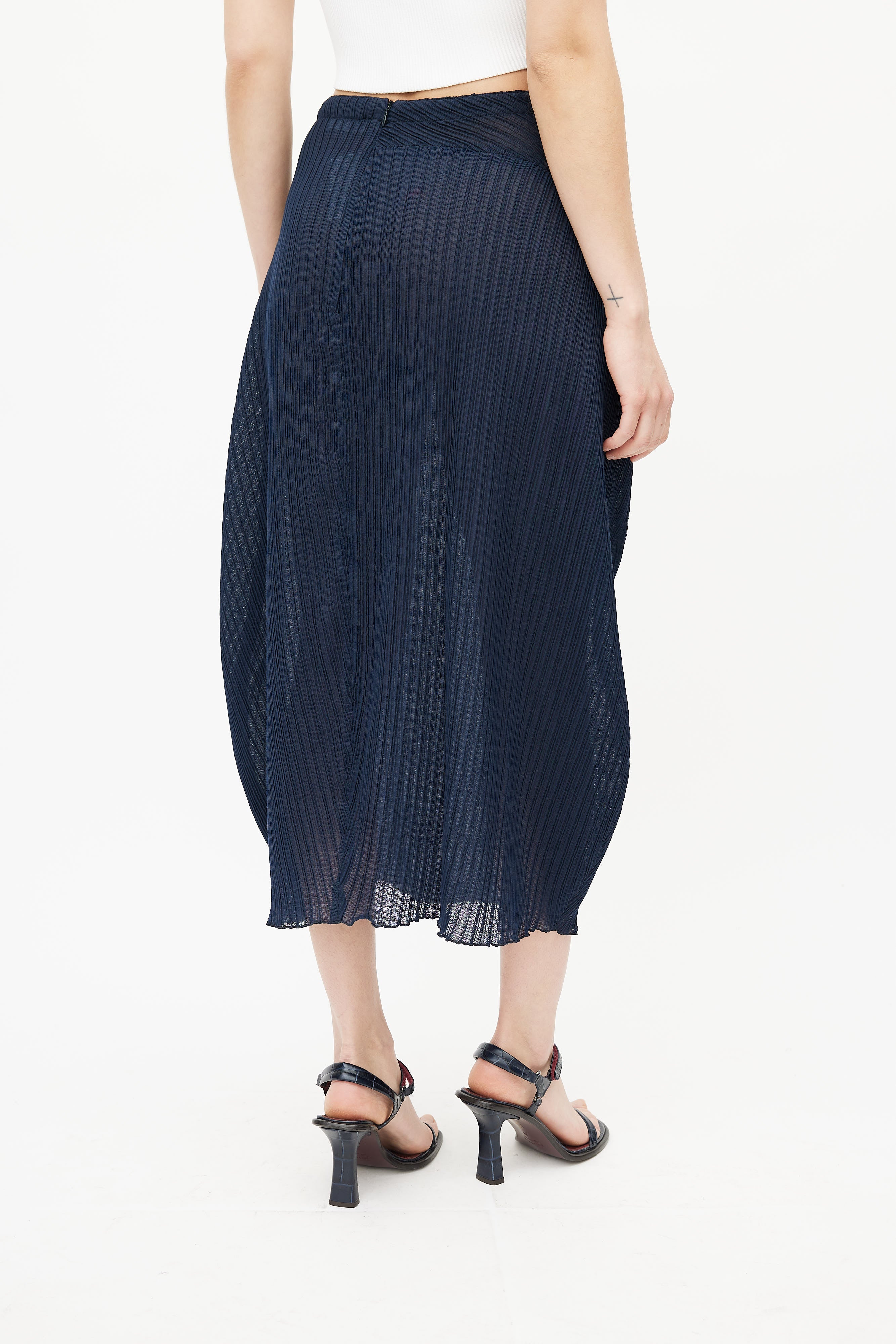 Pre-owned Jil Sander navy semi sheer midi skirt featuring fixed waistband, concealed zip closure at back, asymmetrical plissé throughout, and lettuce hem. Unlined.