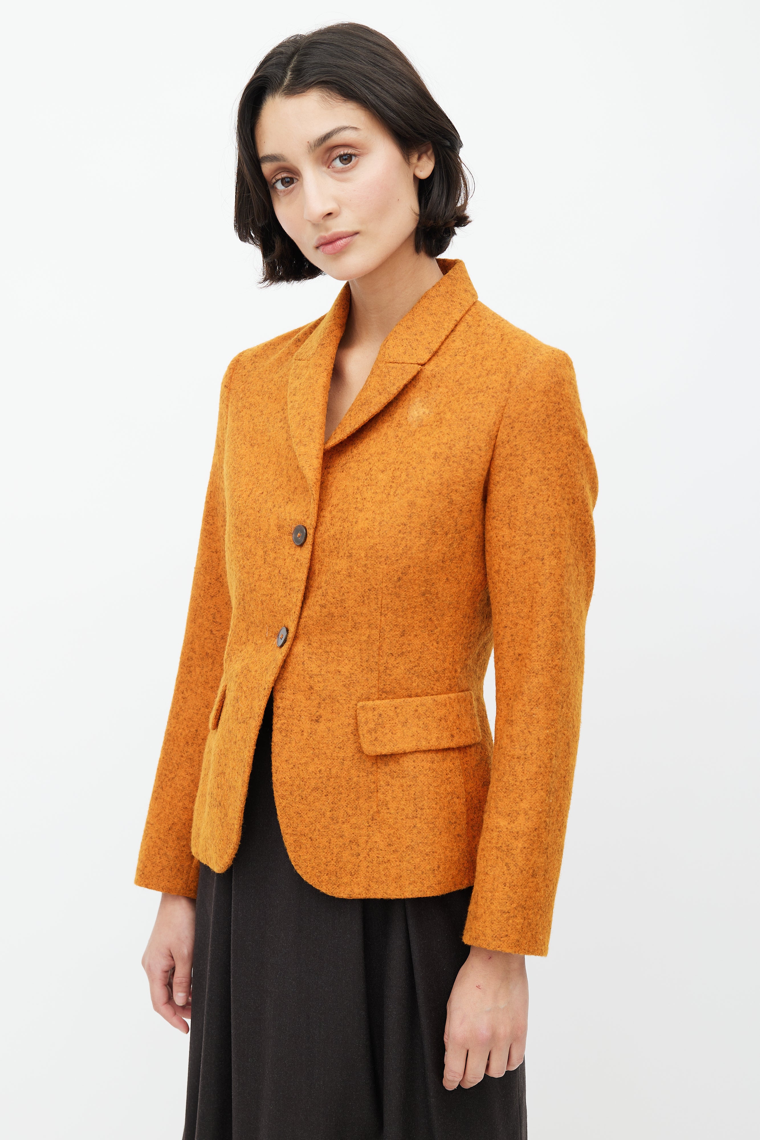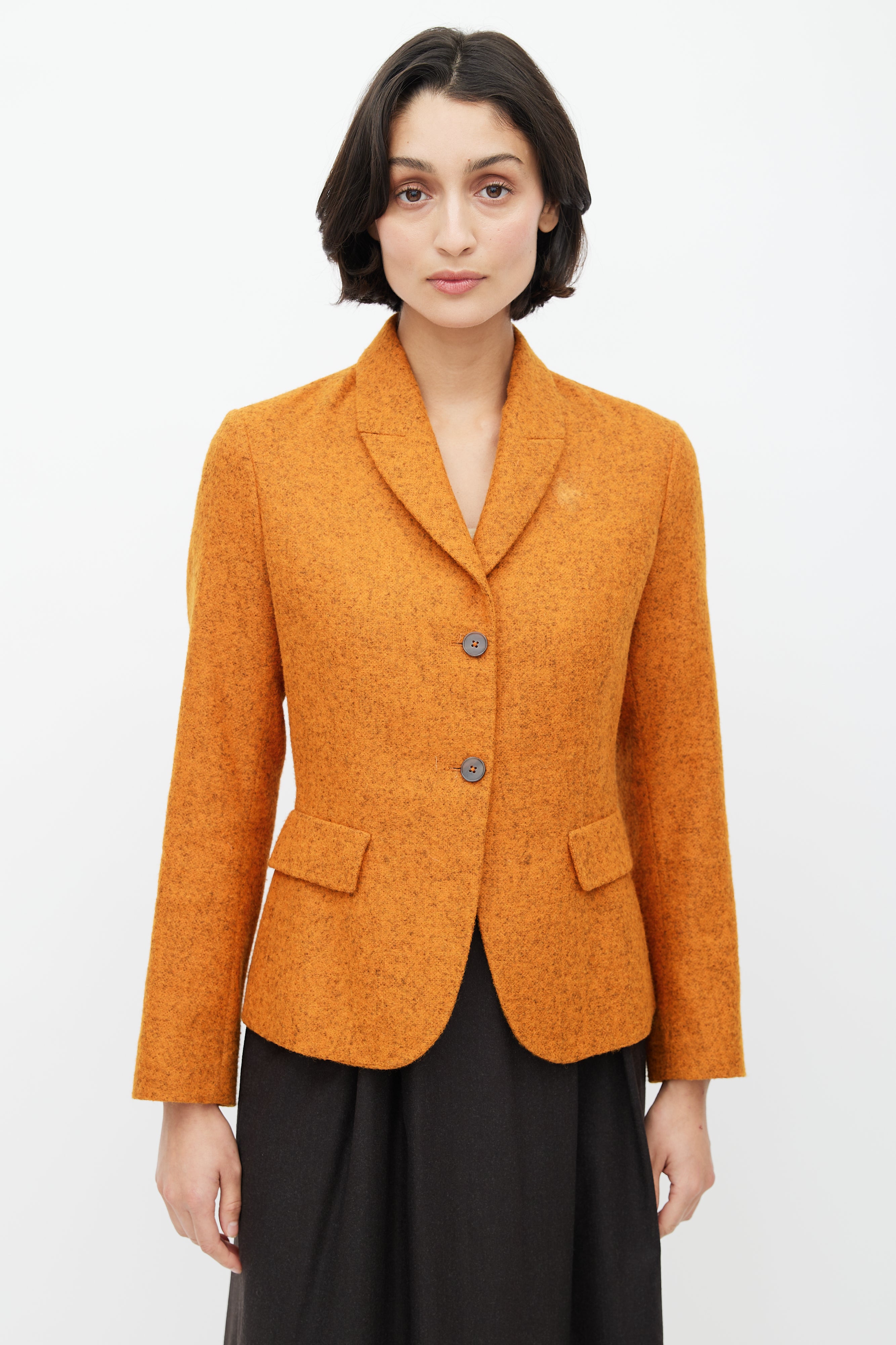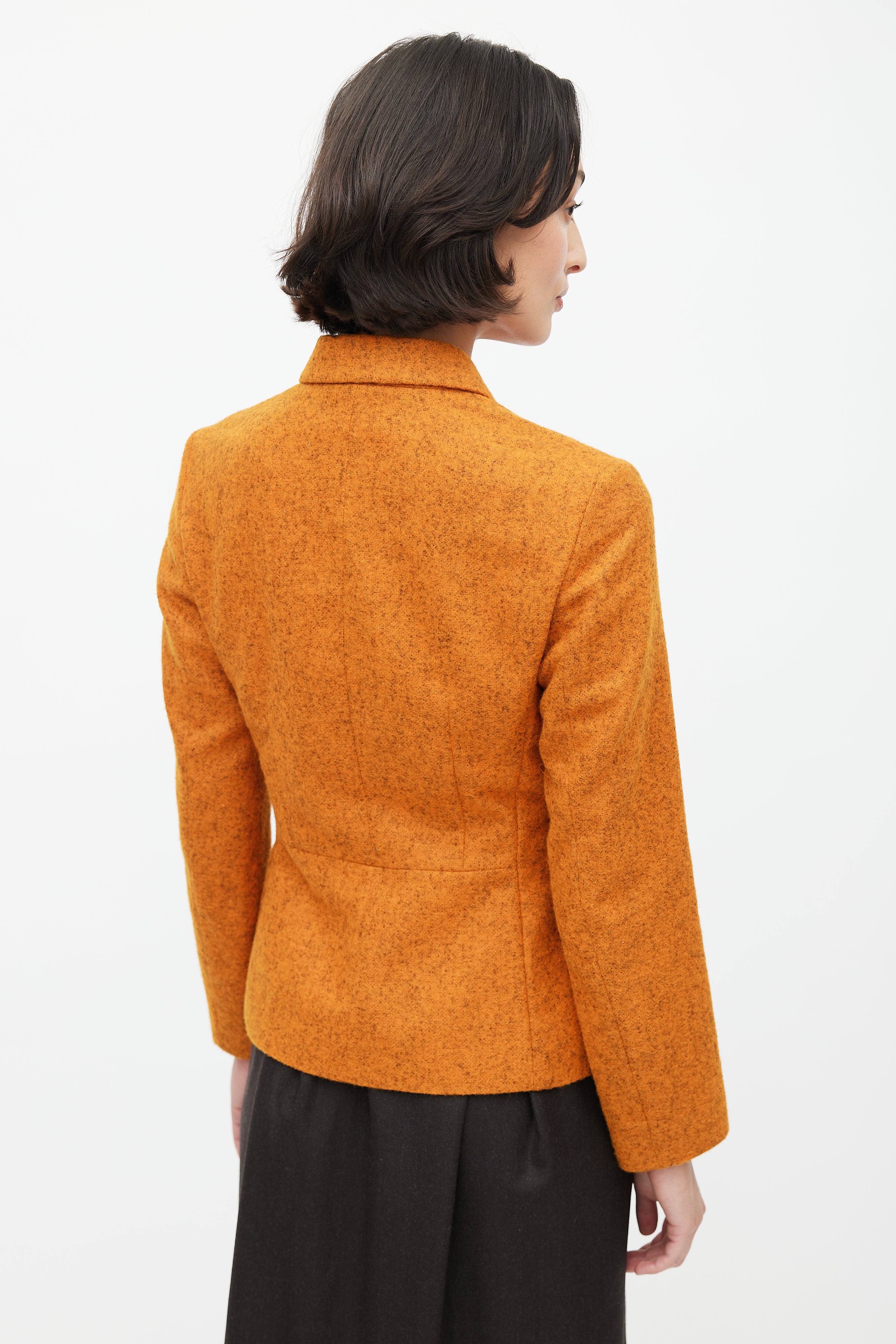 Pre-owned Jil Sander orange and grey alpaca blazer featuring a shawl collar, two flap pockets at hip, and button up front. Lined.