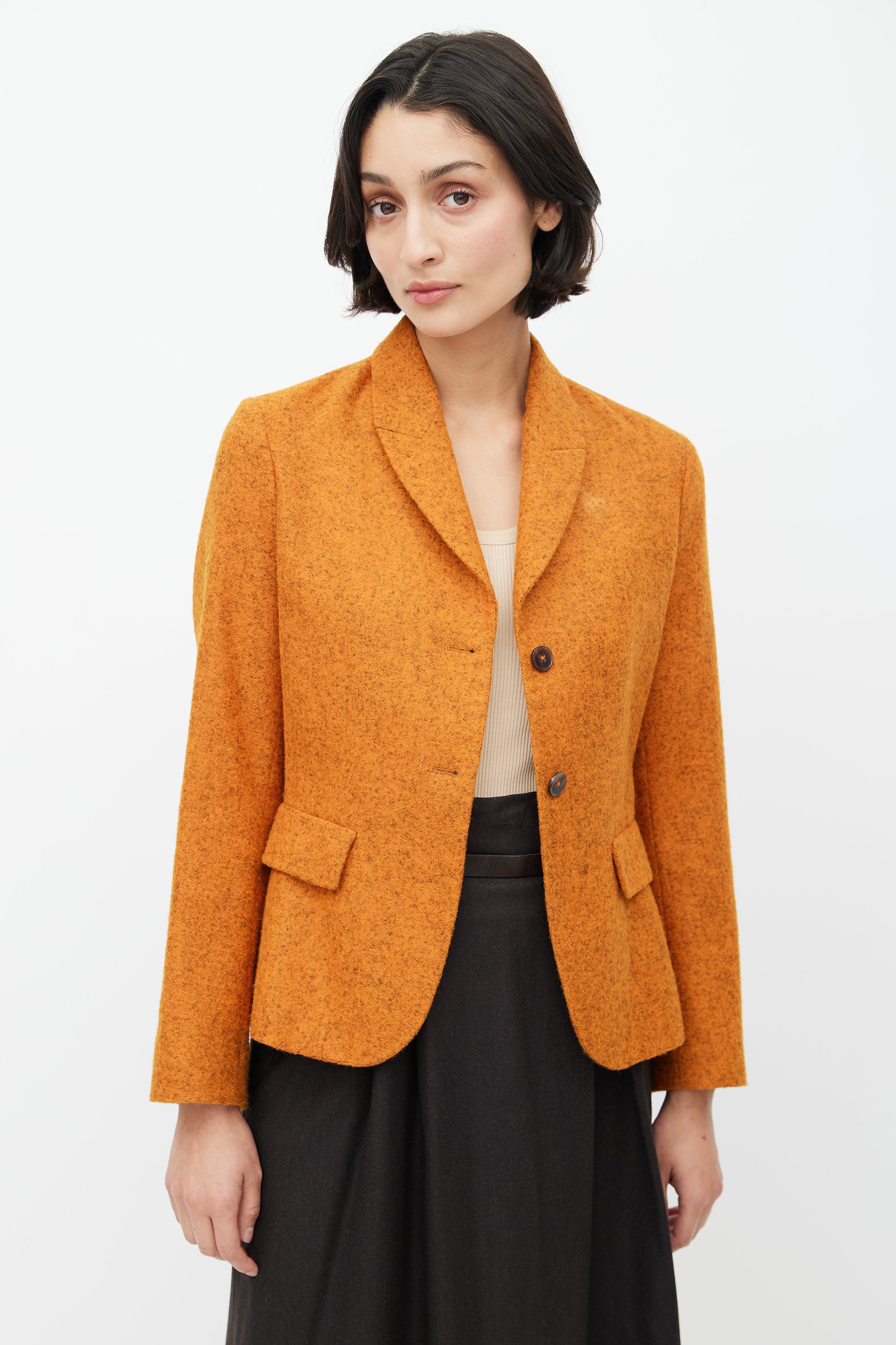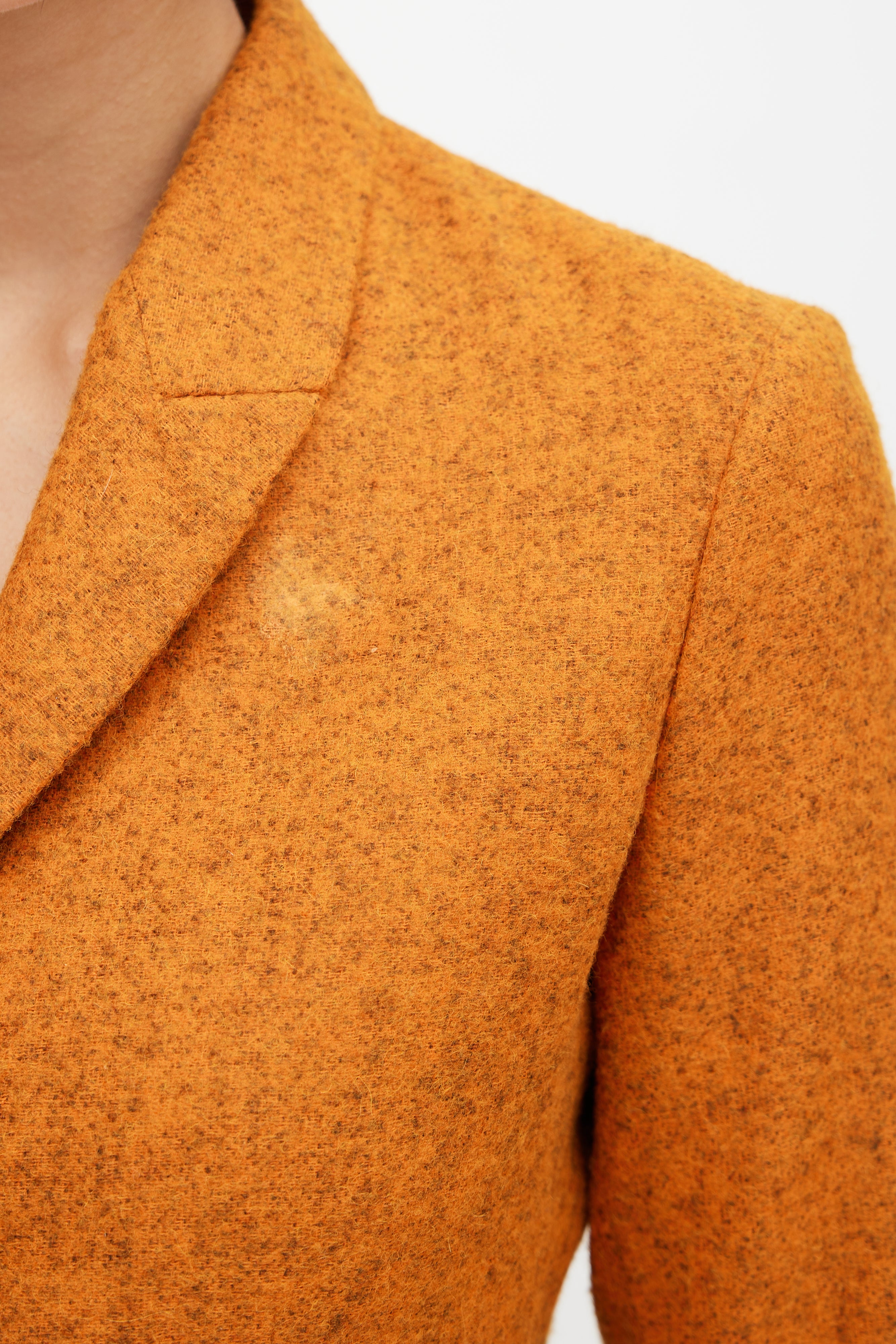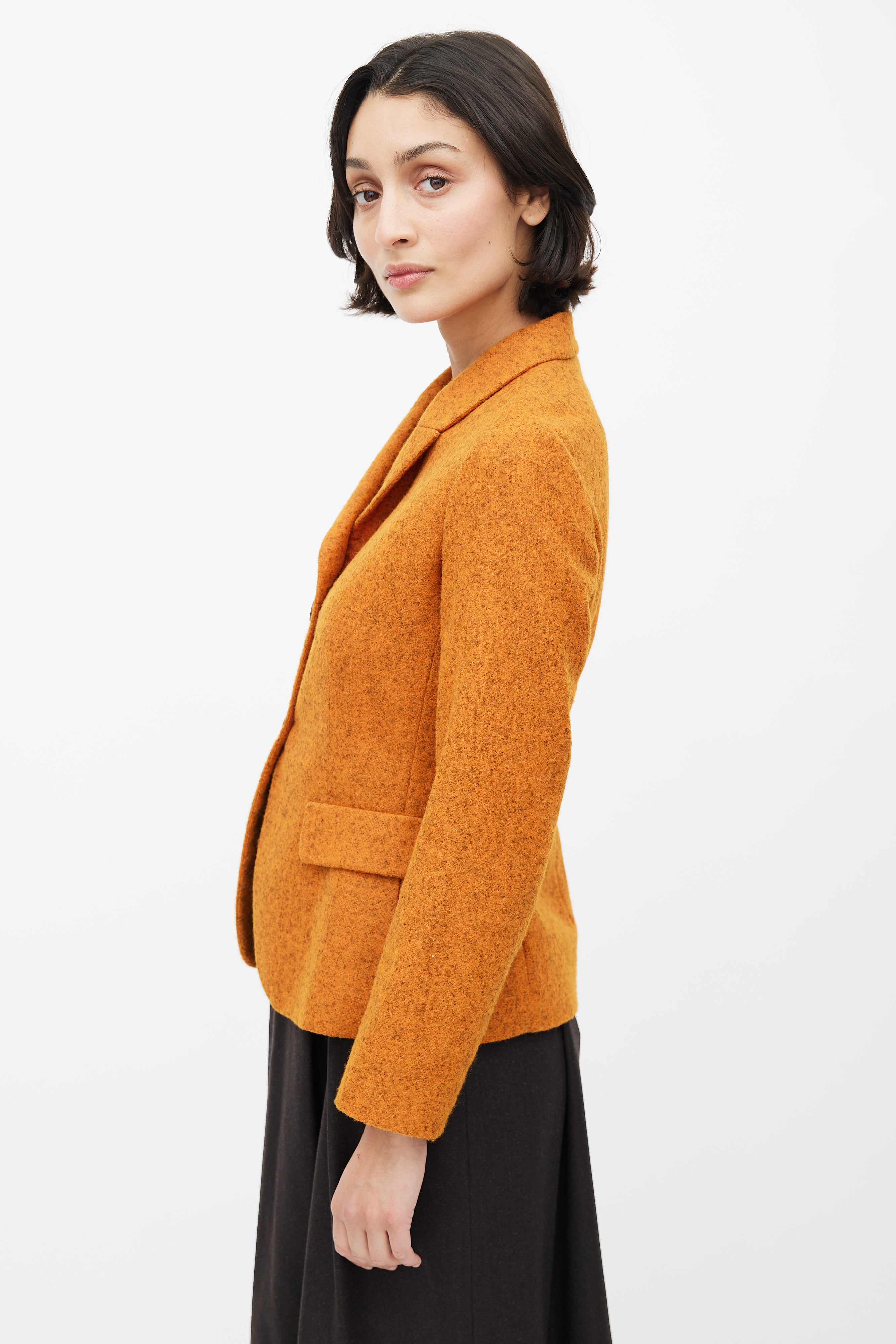 Pre-owned Jil Sander orange and grey alpaca blazer featuring a shawl collar, two flap pockets at hip, and button up front. Lined.