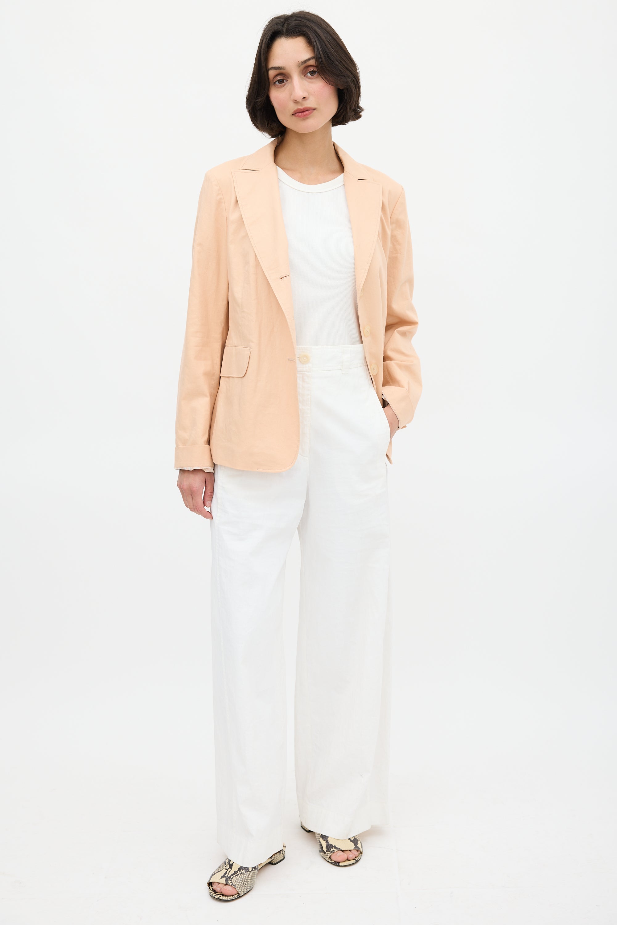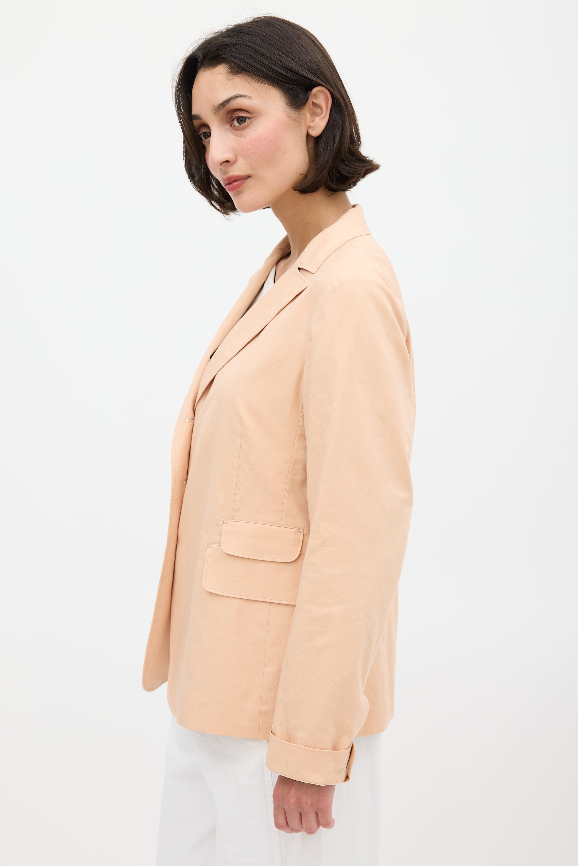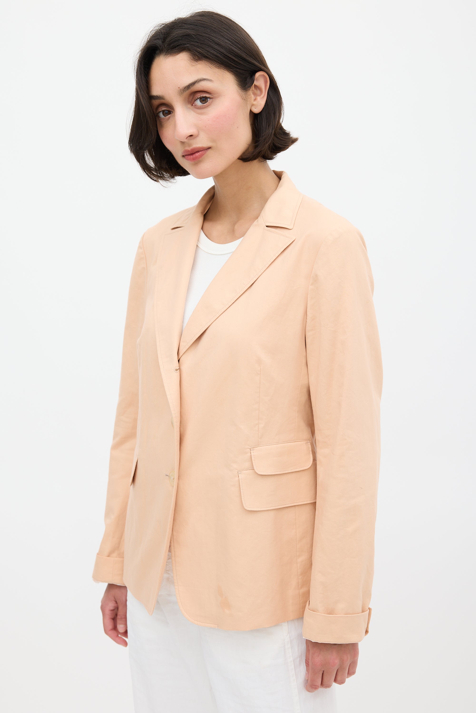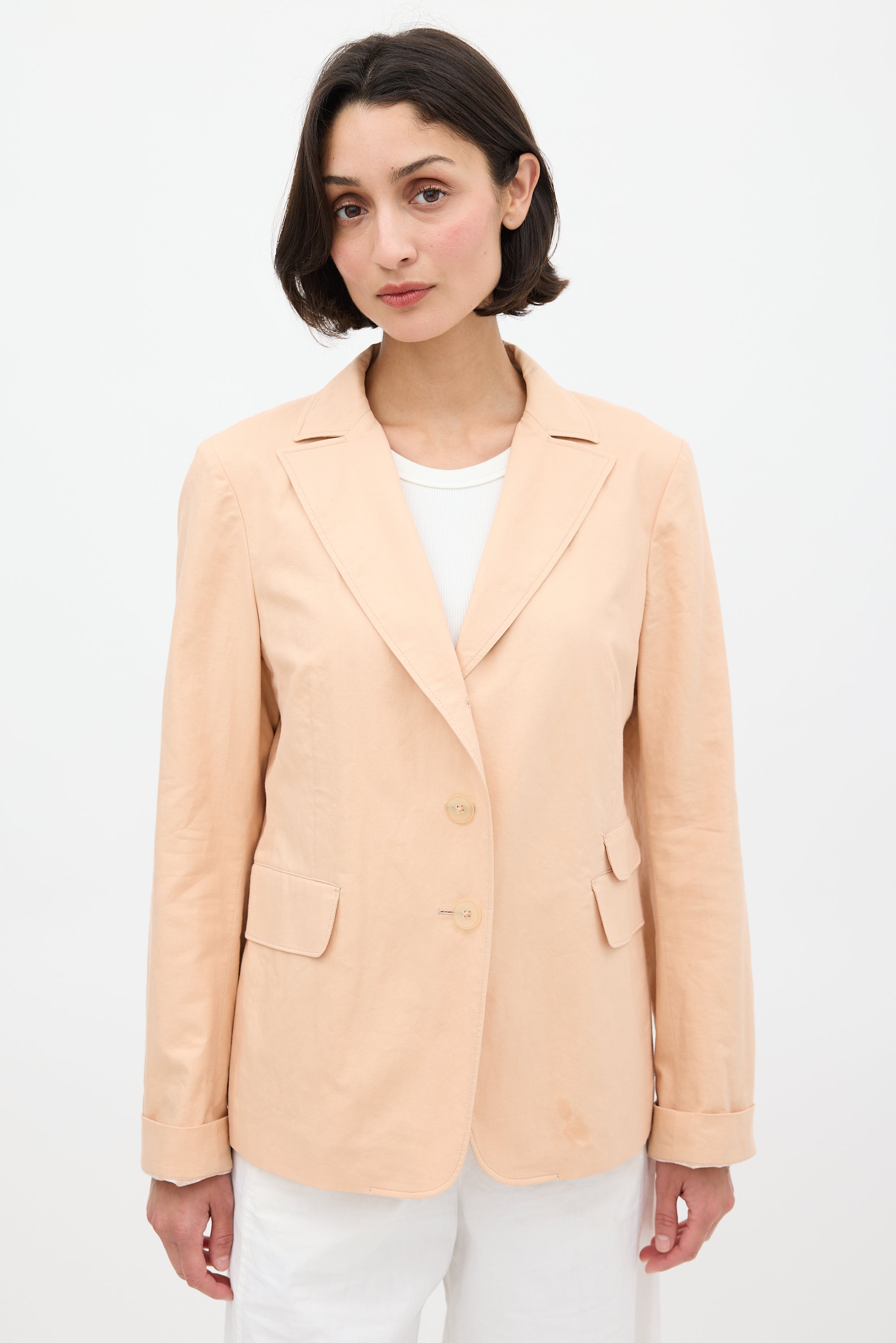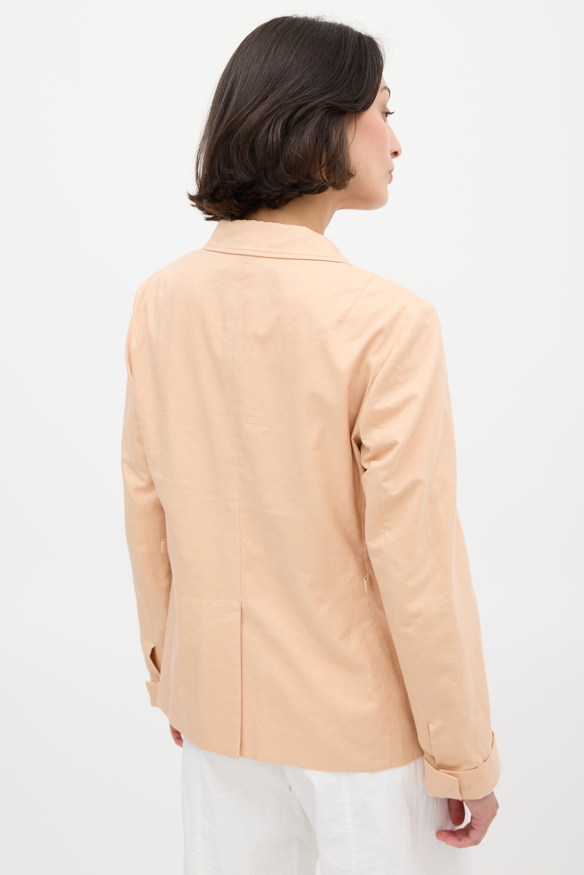 Pre-owned Jil Sander pink cotton blazer featuring a peak lapel, single breasted button up front, three front flap pockets, back vent, and long sleeves with buttoned cuffs. Lined. Clipped to fit model.