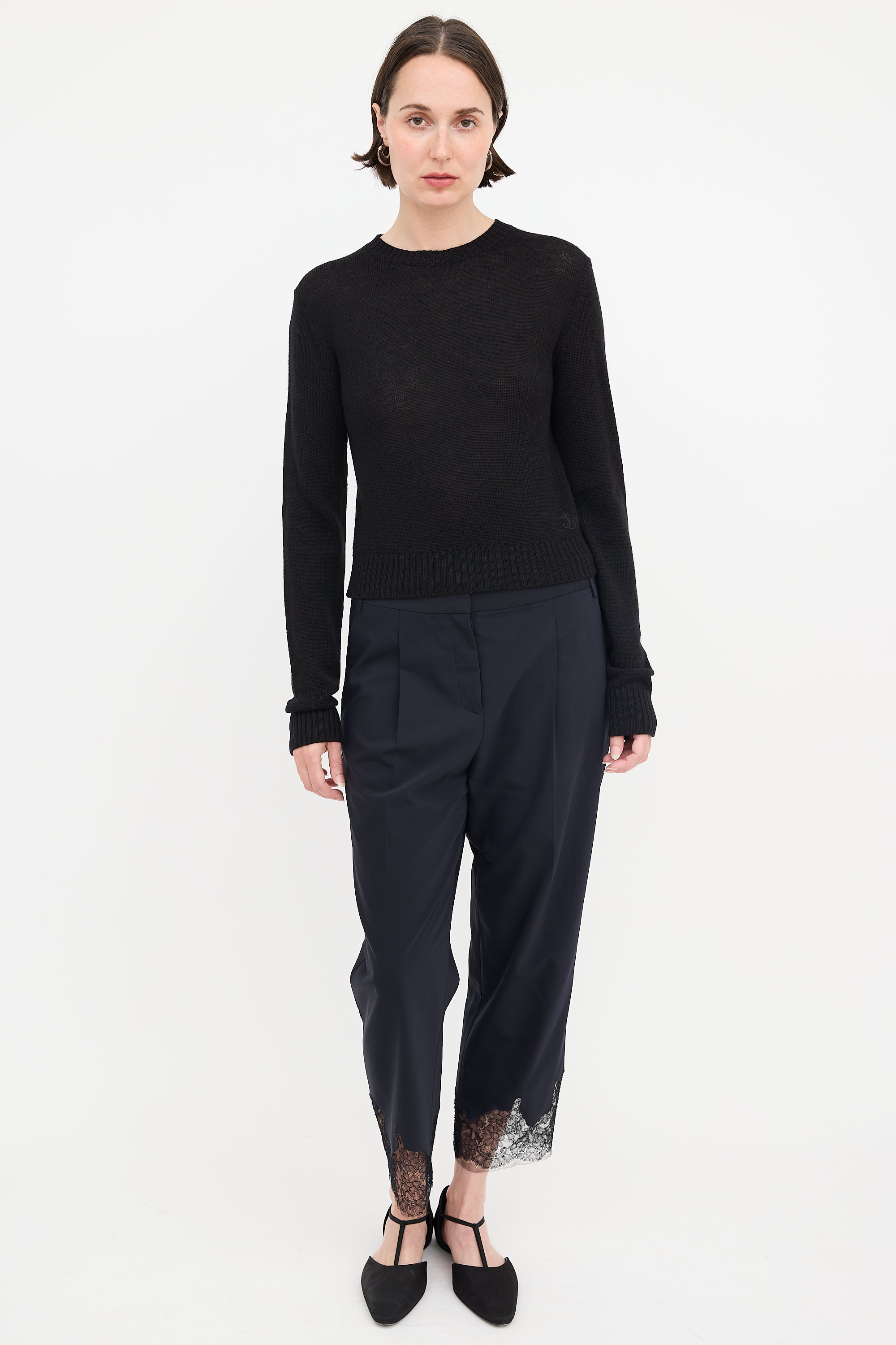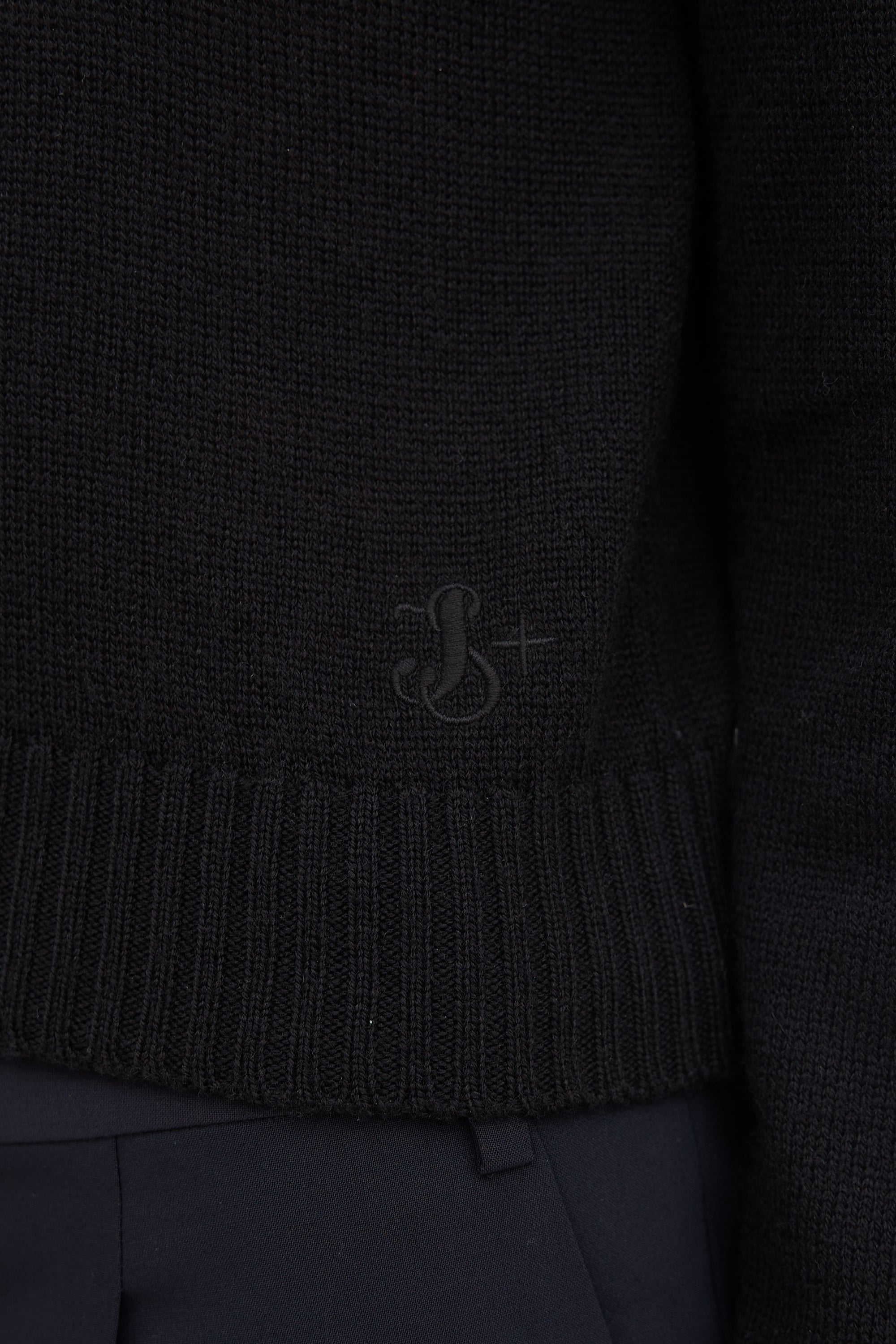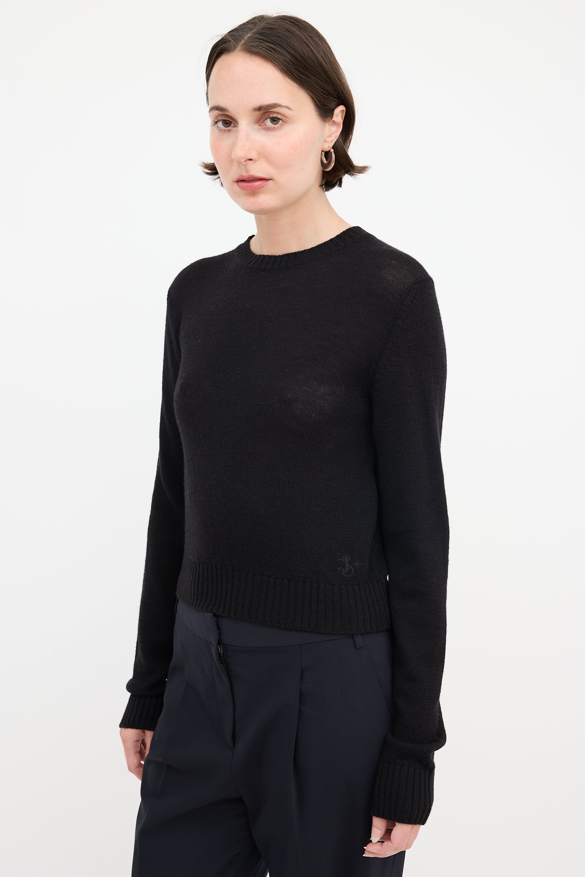 Pre-owned Jil Sander Plus black wool sweater featuring crew neck, tonal embroidered logo at front hem, and ribbed collar, hem, and cuffs.