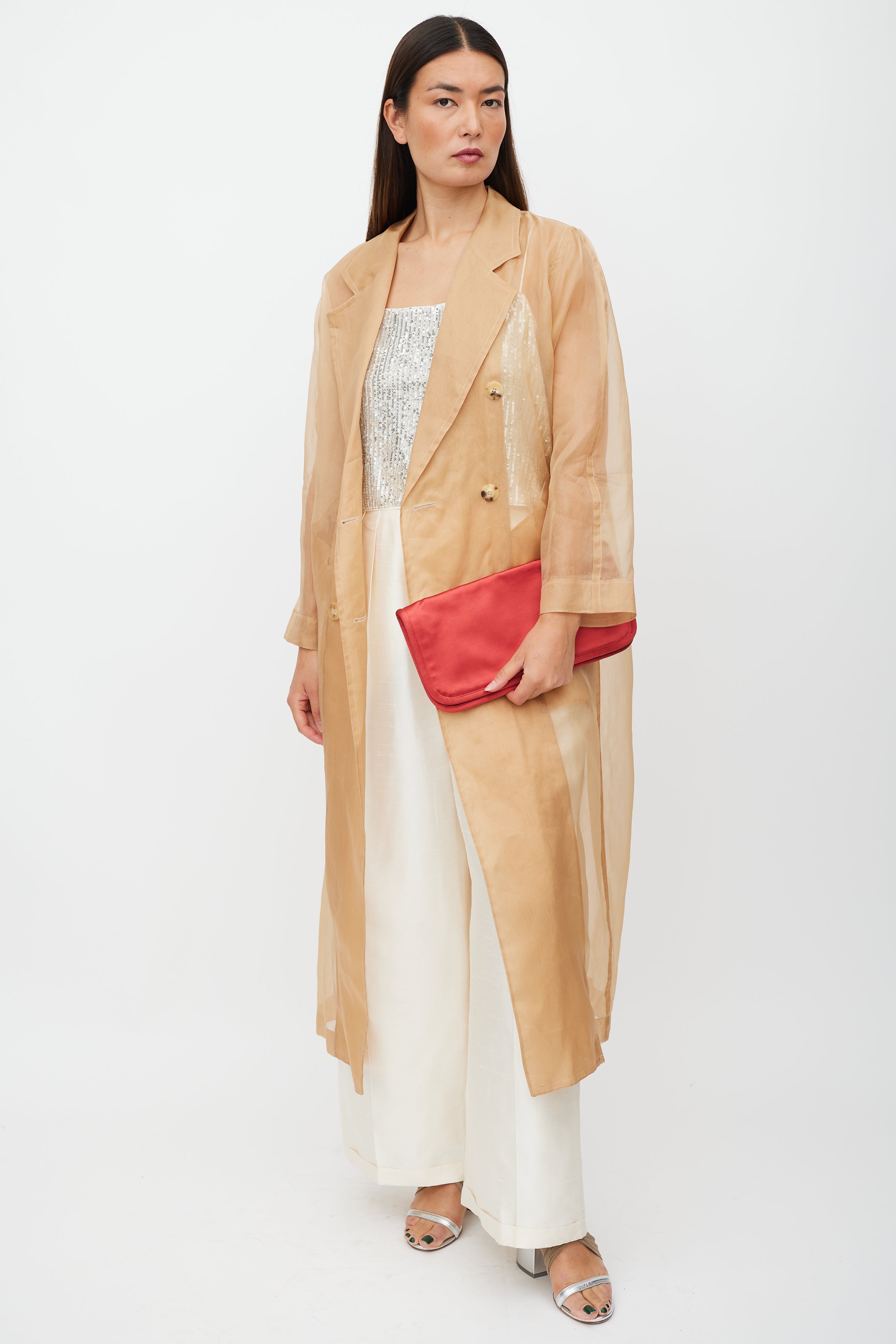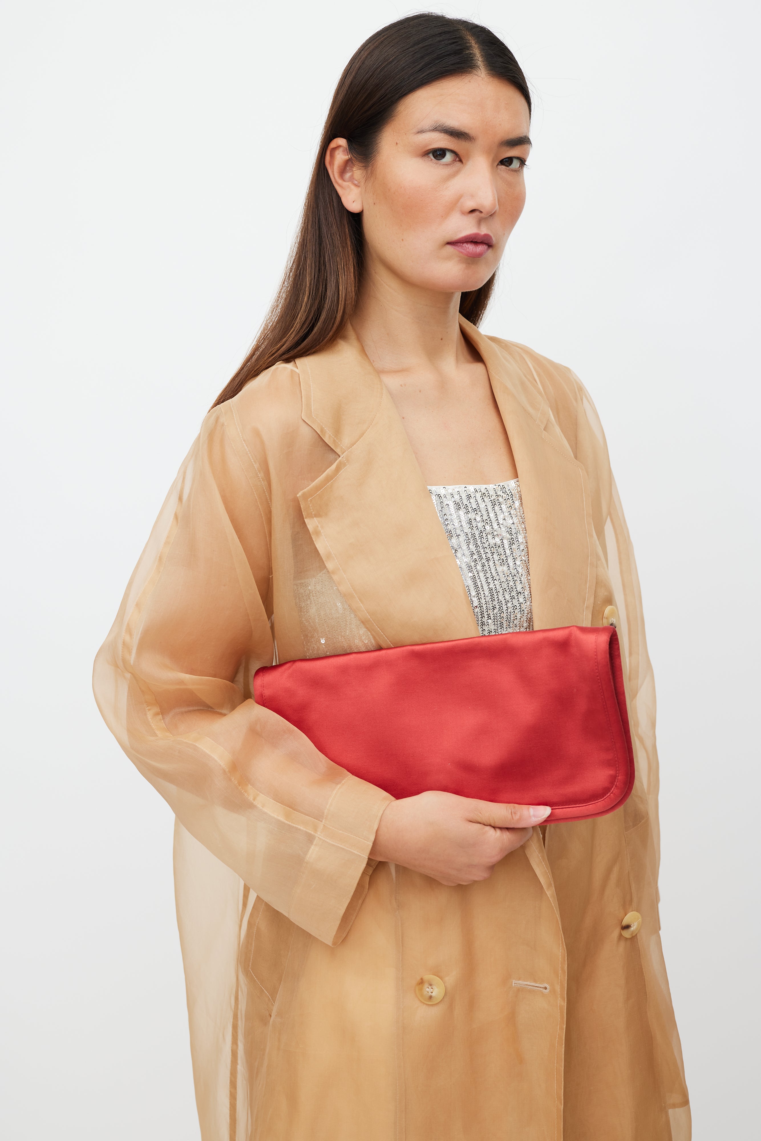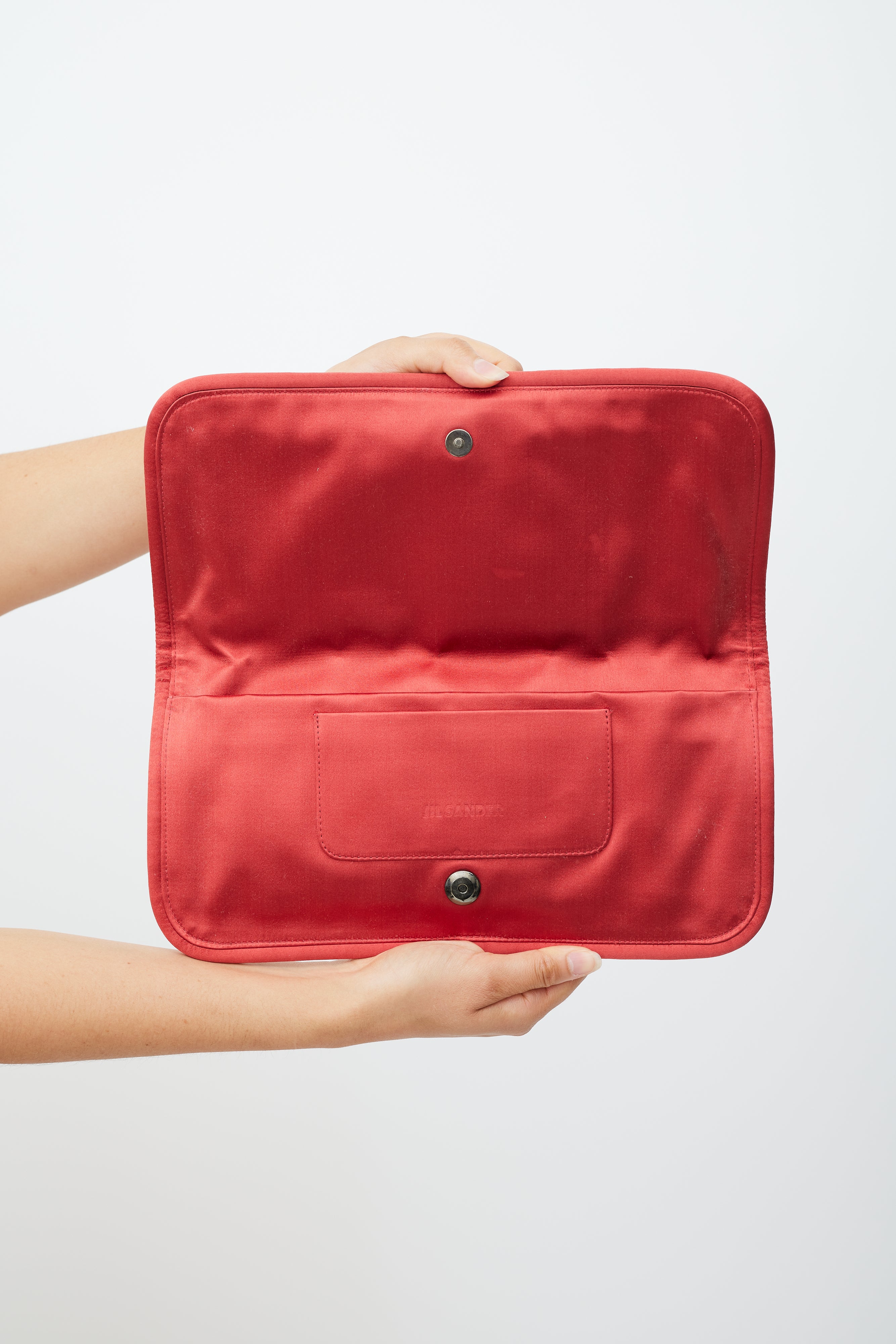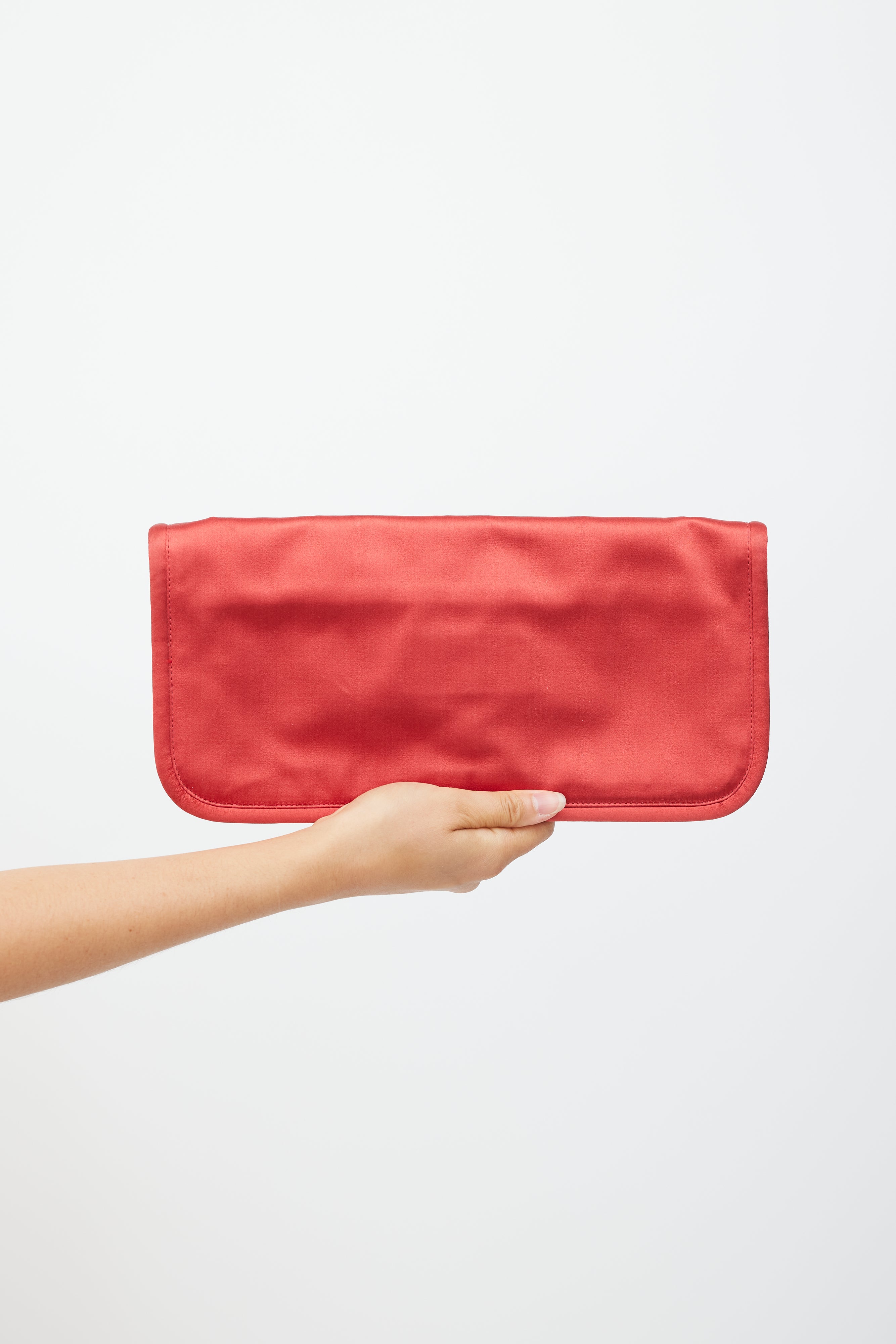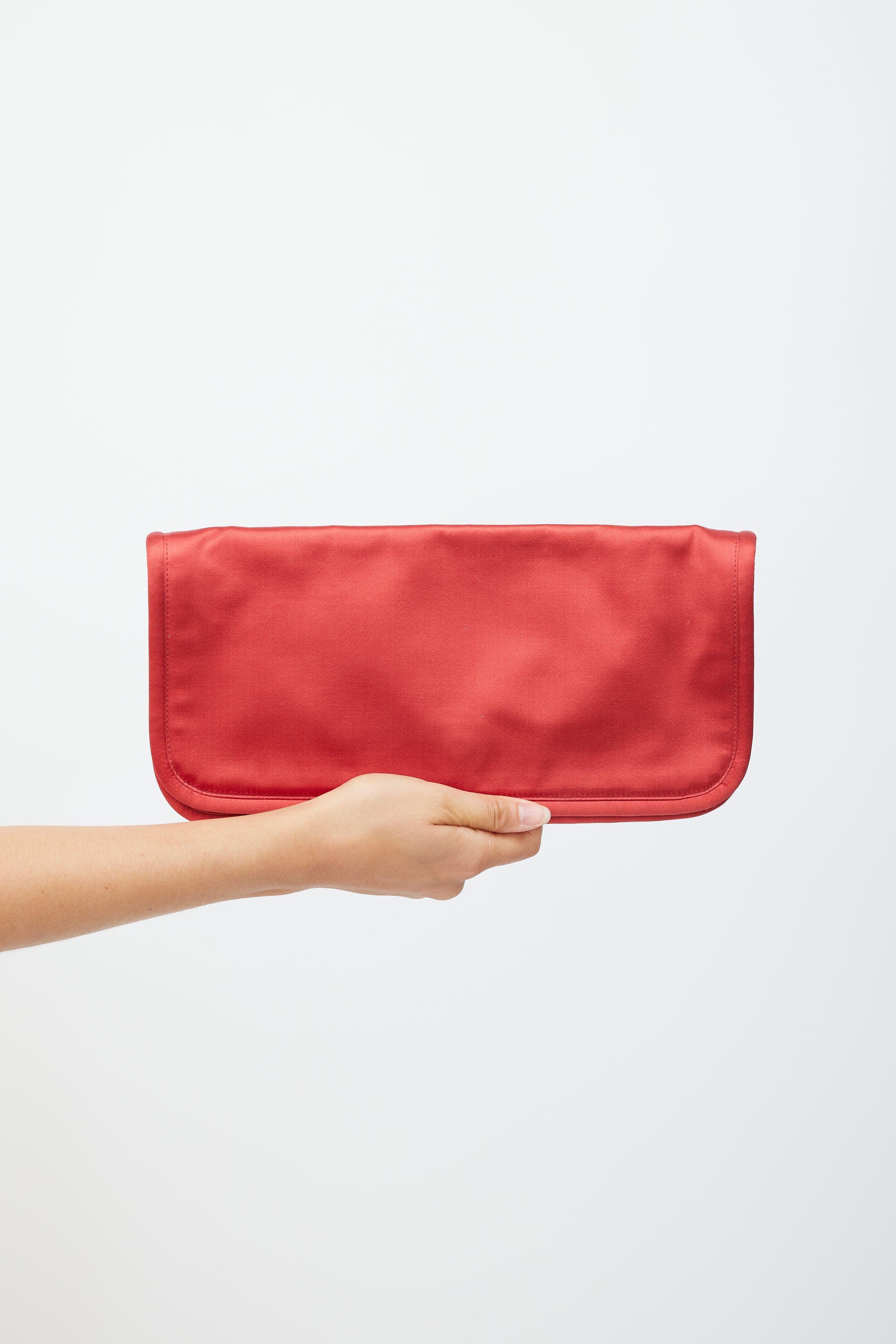 Pre-owned Jil Sander red satin clutch featuring one slip pocket at front with embossed logo, one main compartment, and magnetic fold over closure.