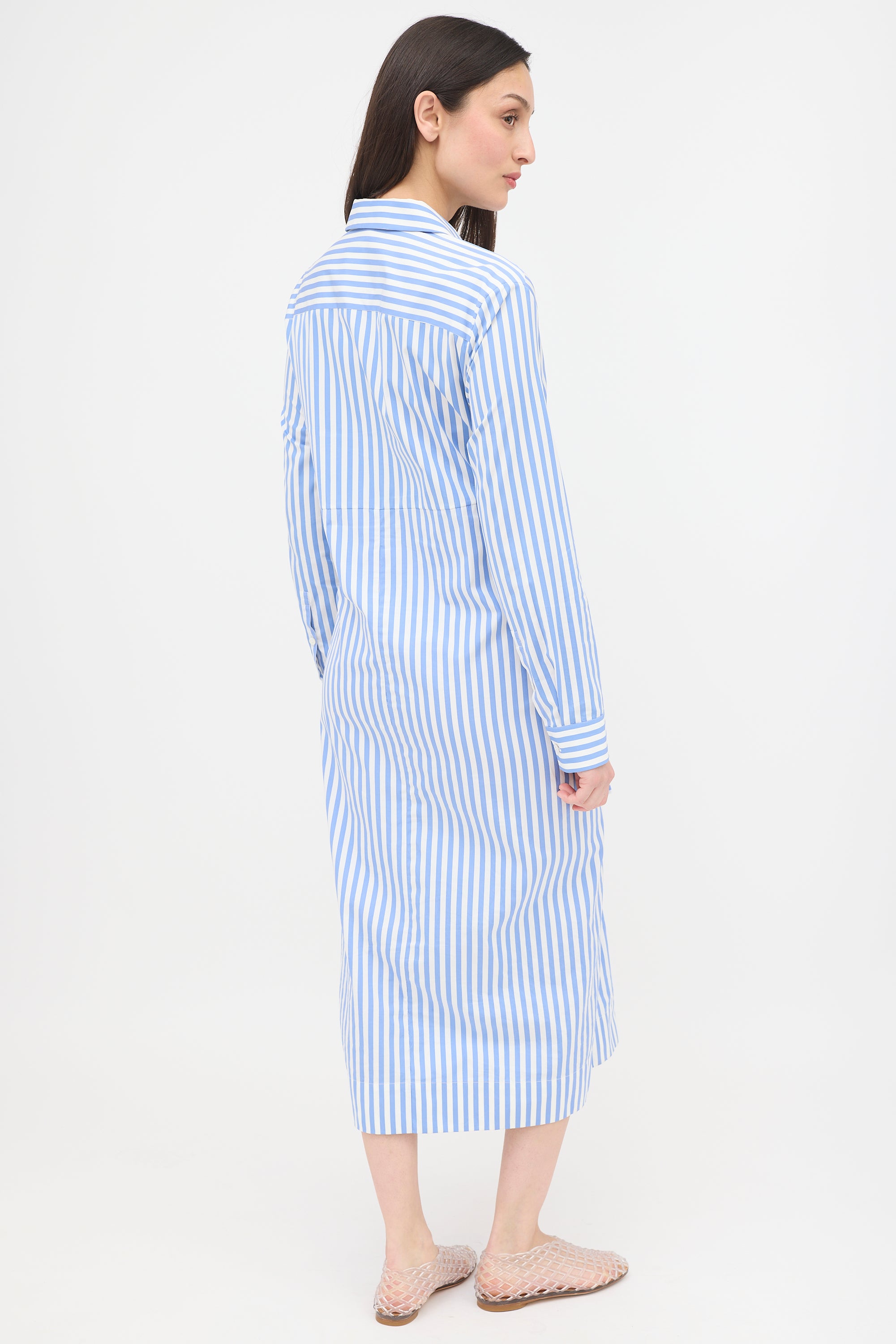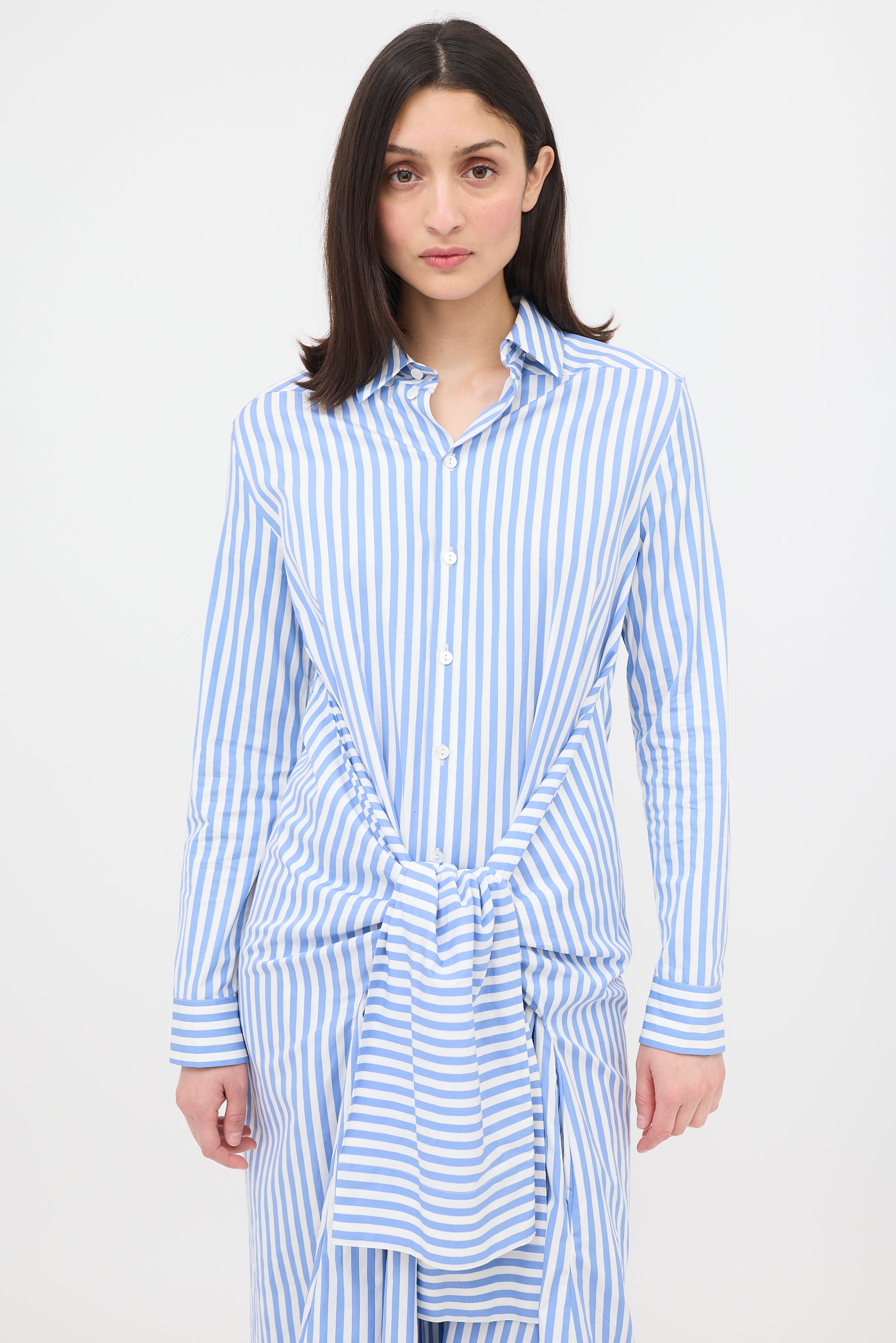 Pre-owned Jil Sander blue and white Mattie midi shirt dress featuring stripe pattern, straight collar, button front, in seam pockets, tie waist, and buttoned cuffs.