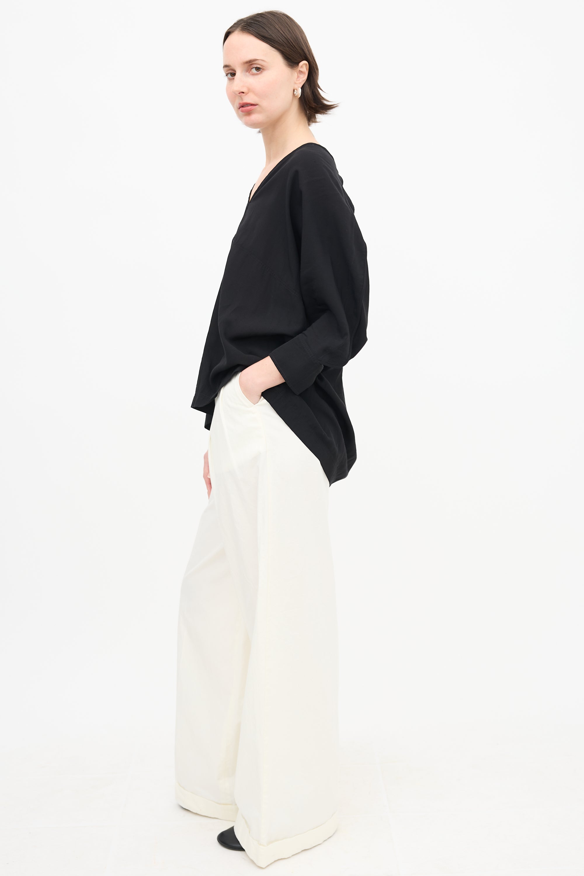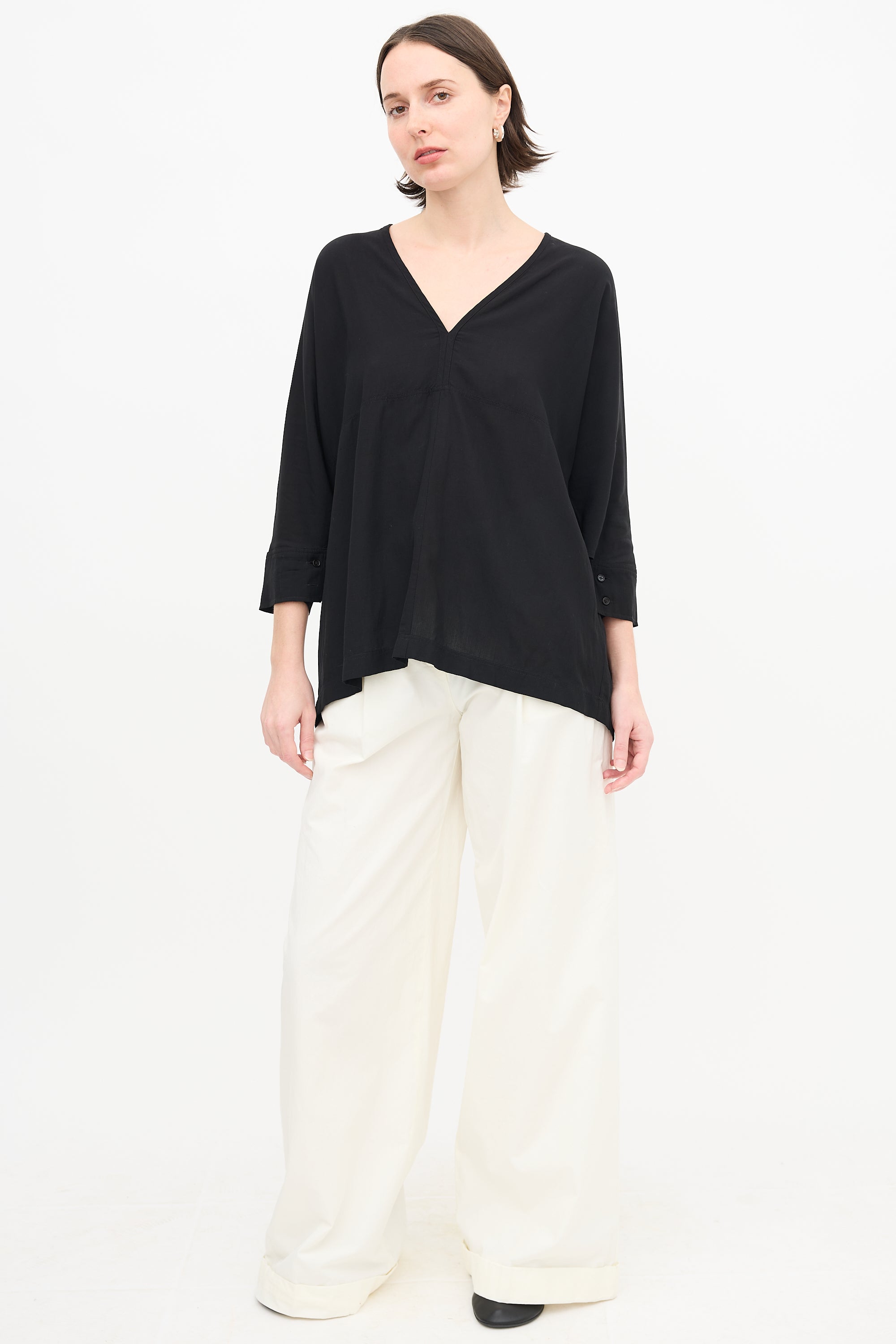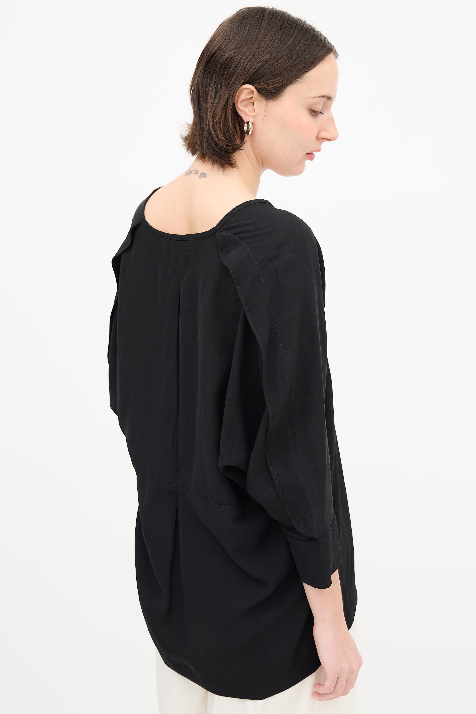 Pre-owned Jil Sander black oversized tunic top featuring a V-neckline, batwing sleeves, buttoned cuffs, back pleating, and a high low hemline.