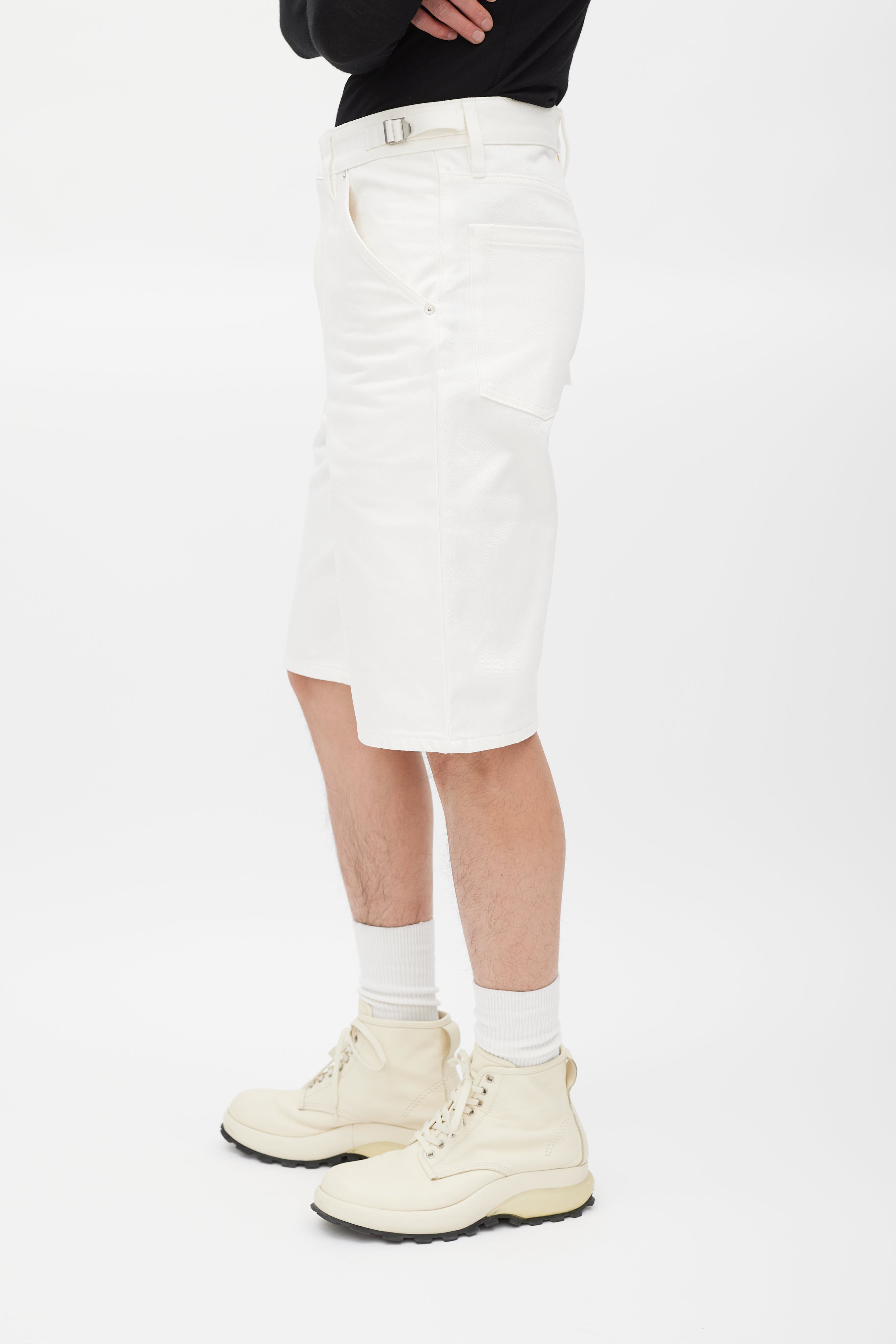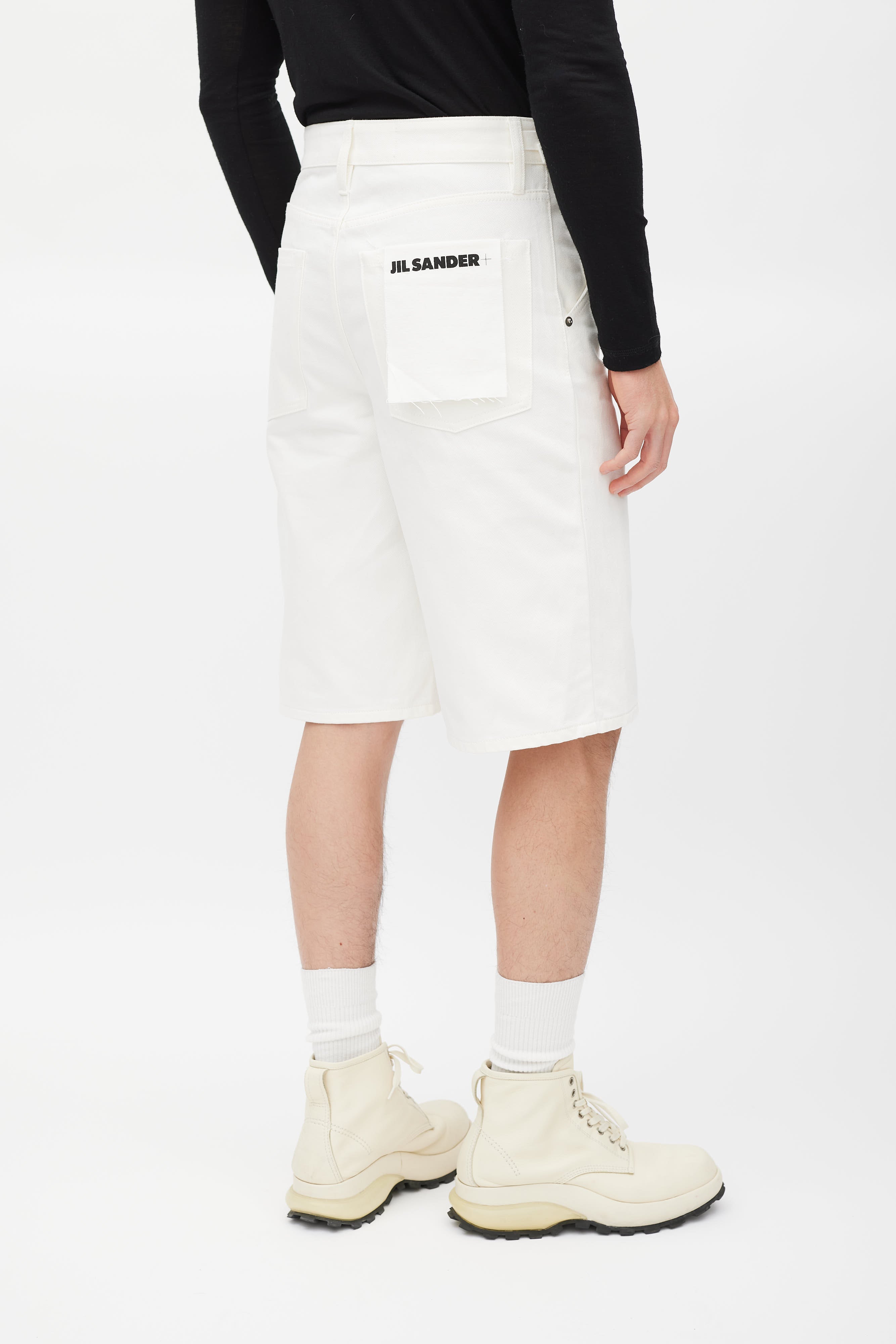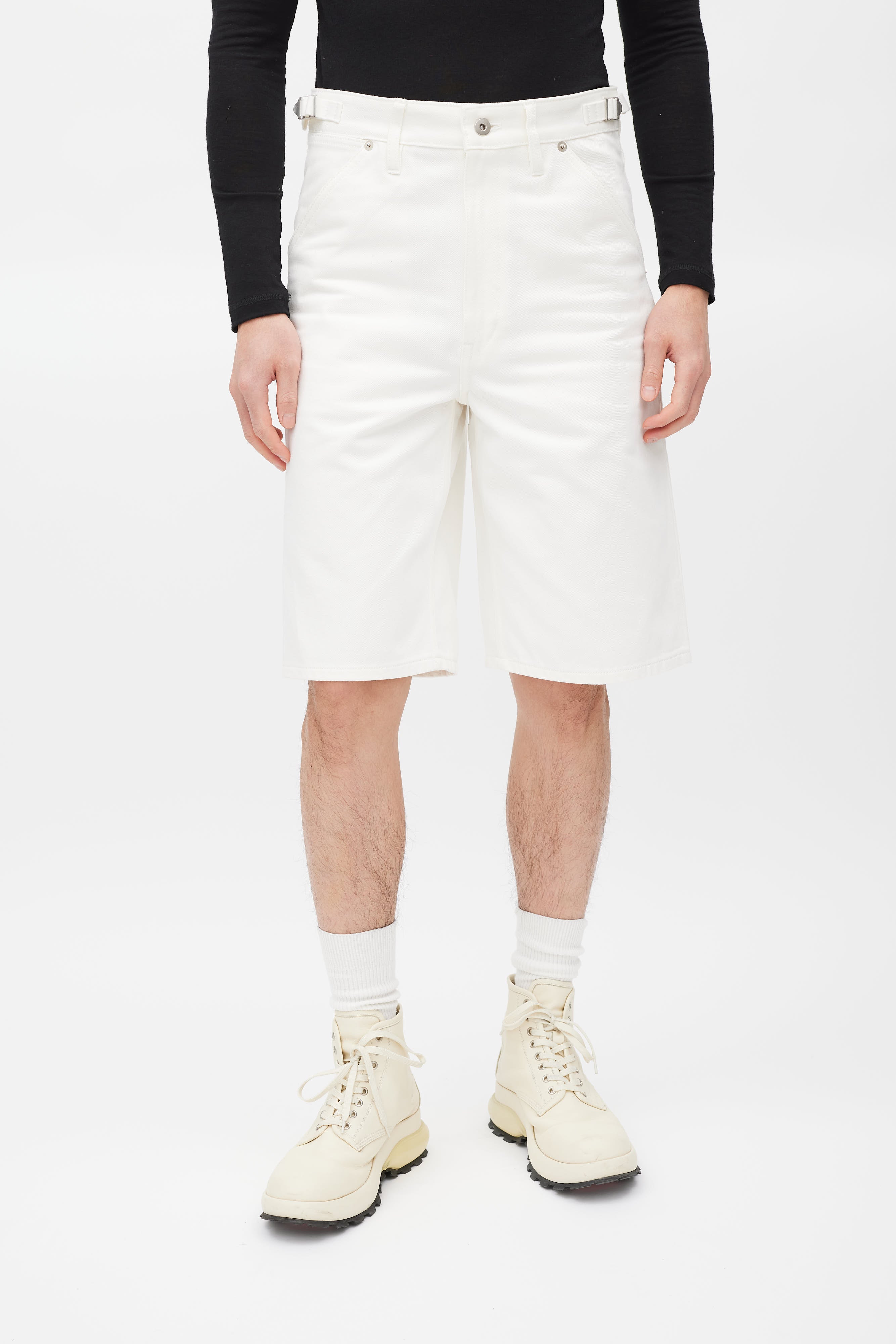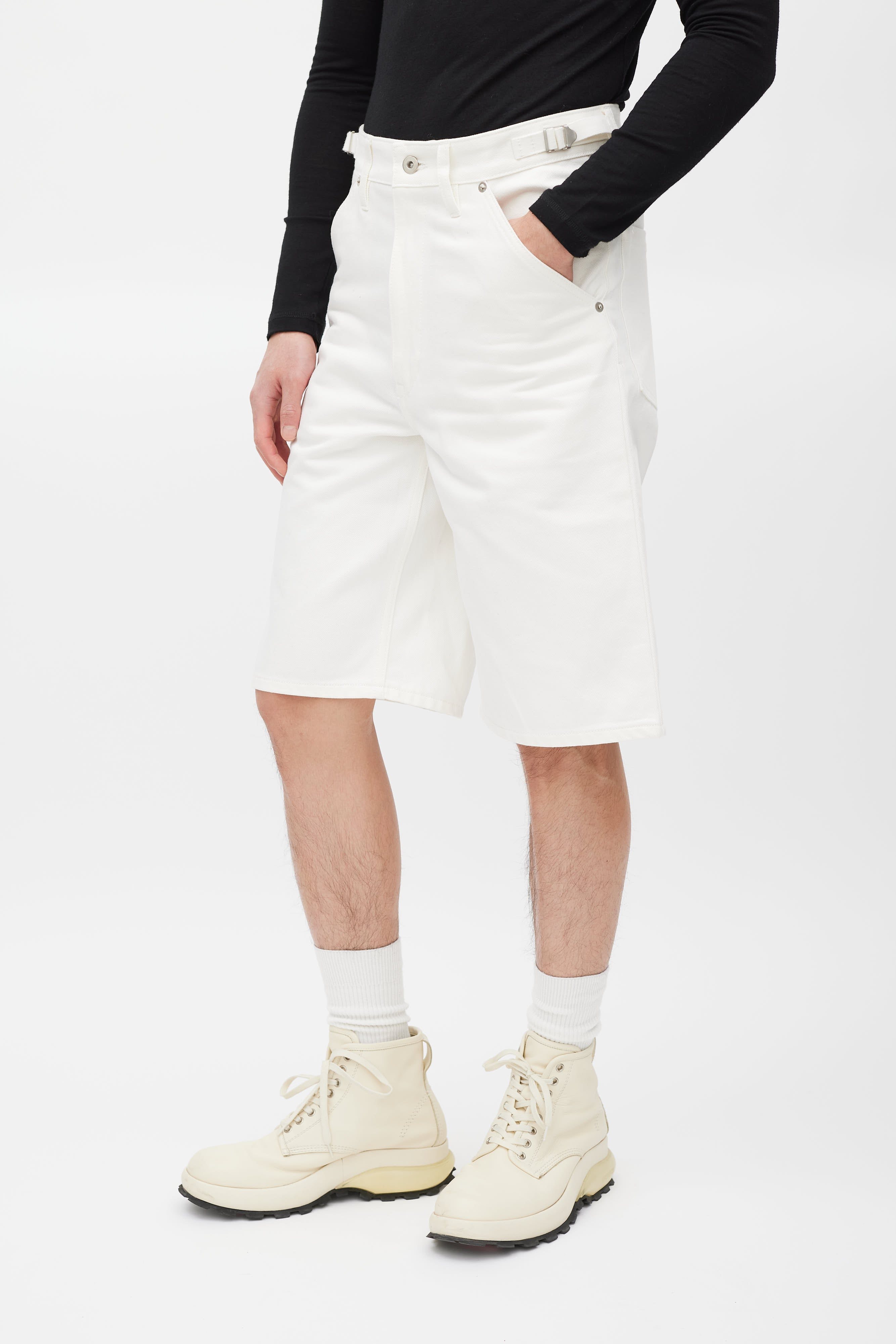 Jil Sander white denim shorts featuring five pocket styling, adjustable straps at waist, wide leg, and zip fly with button closure.