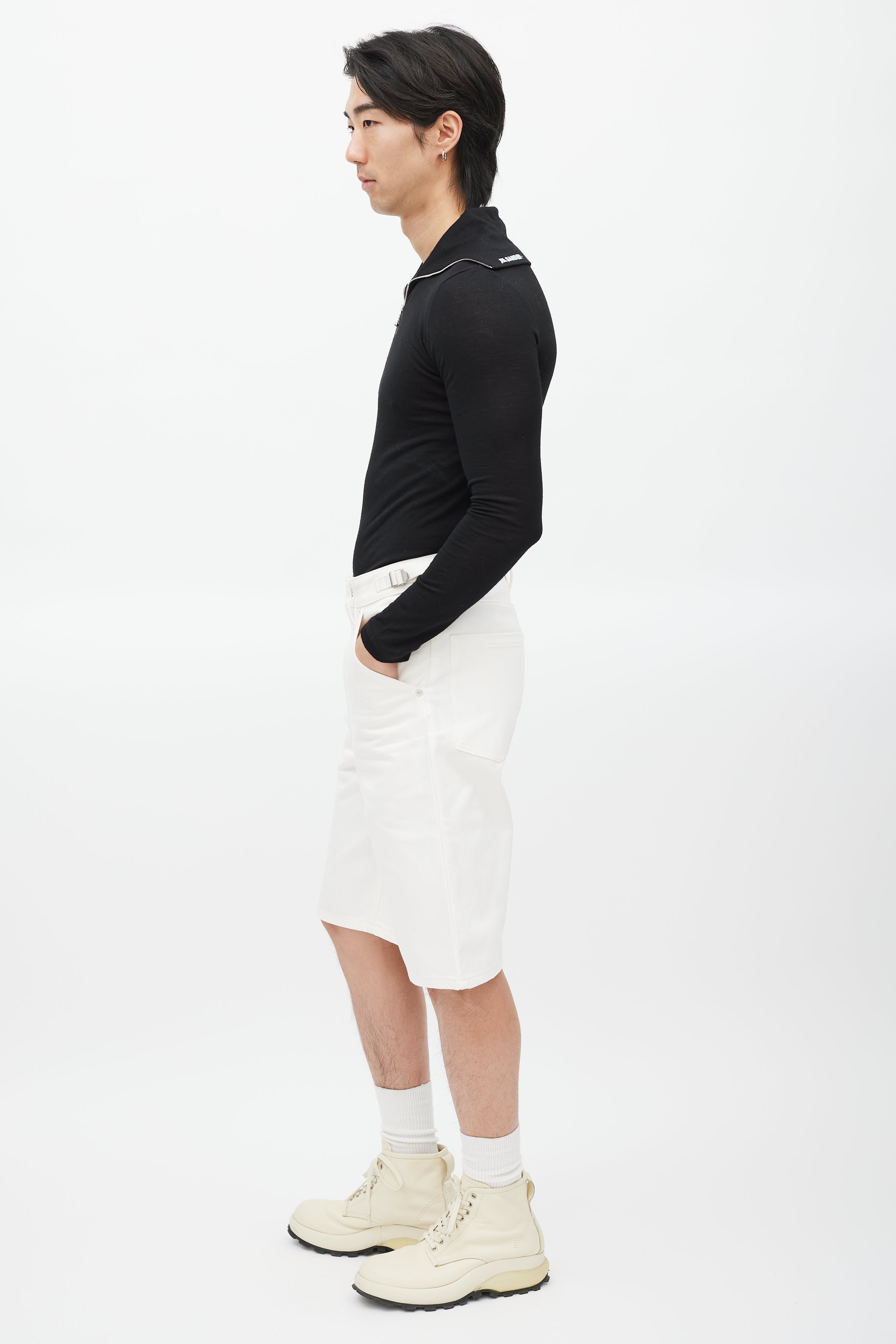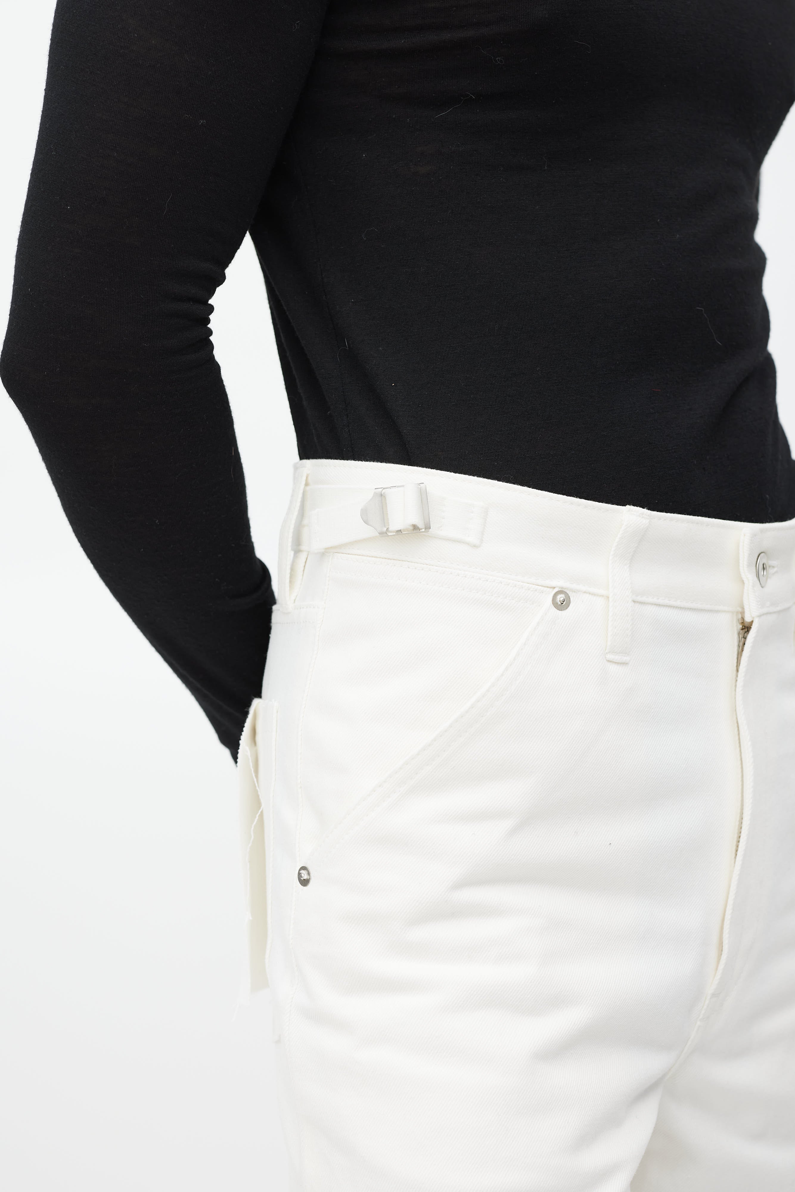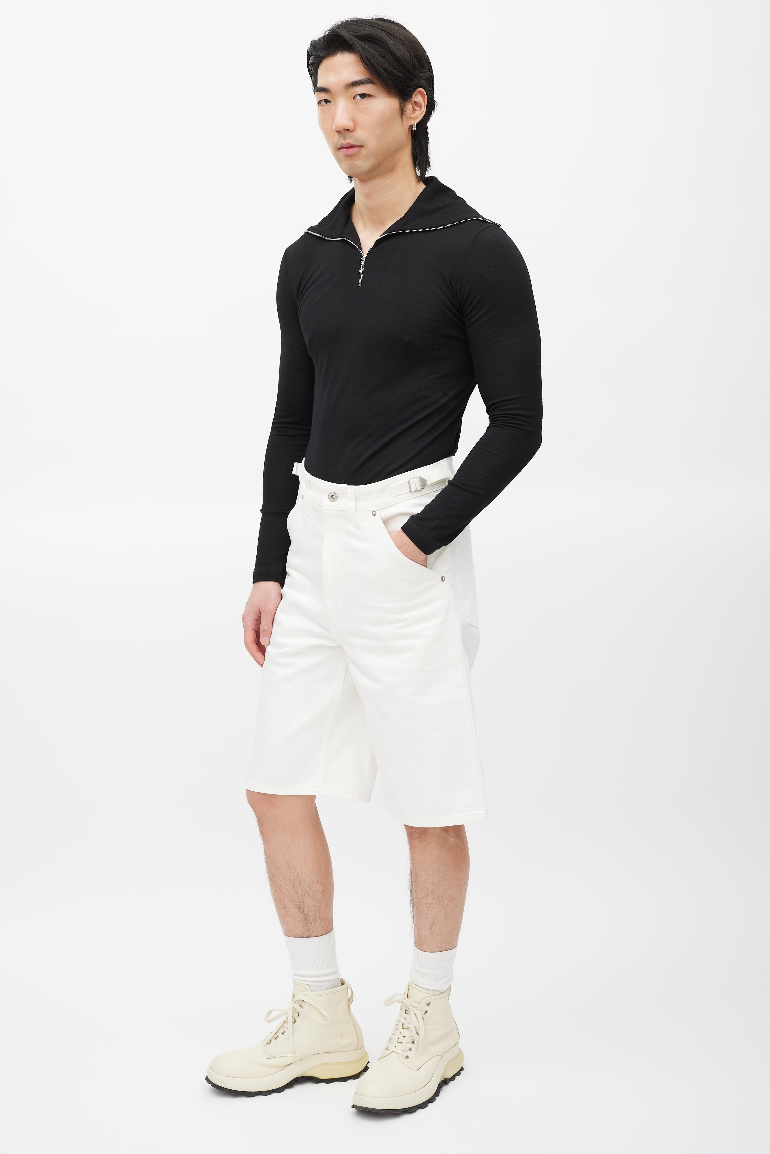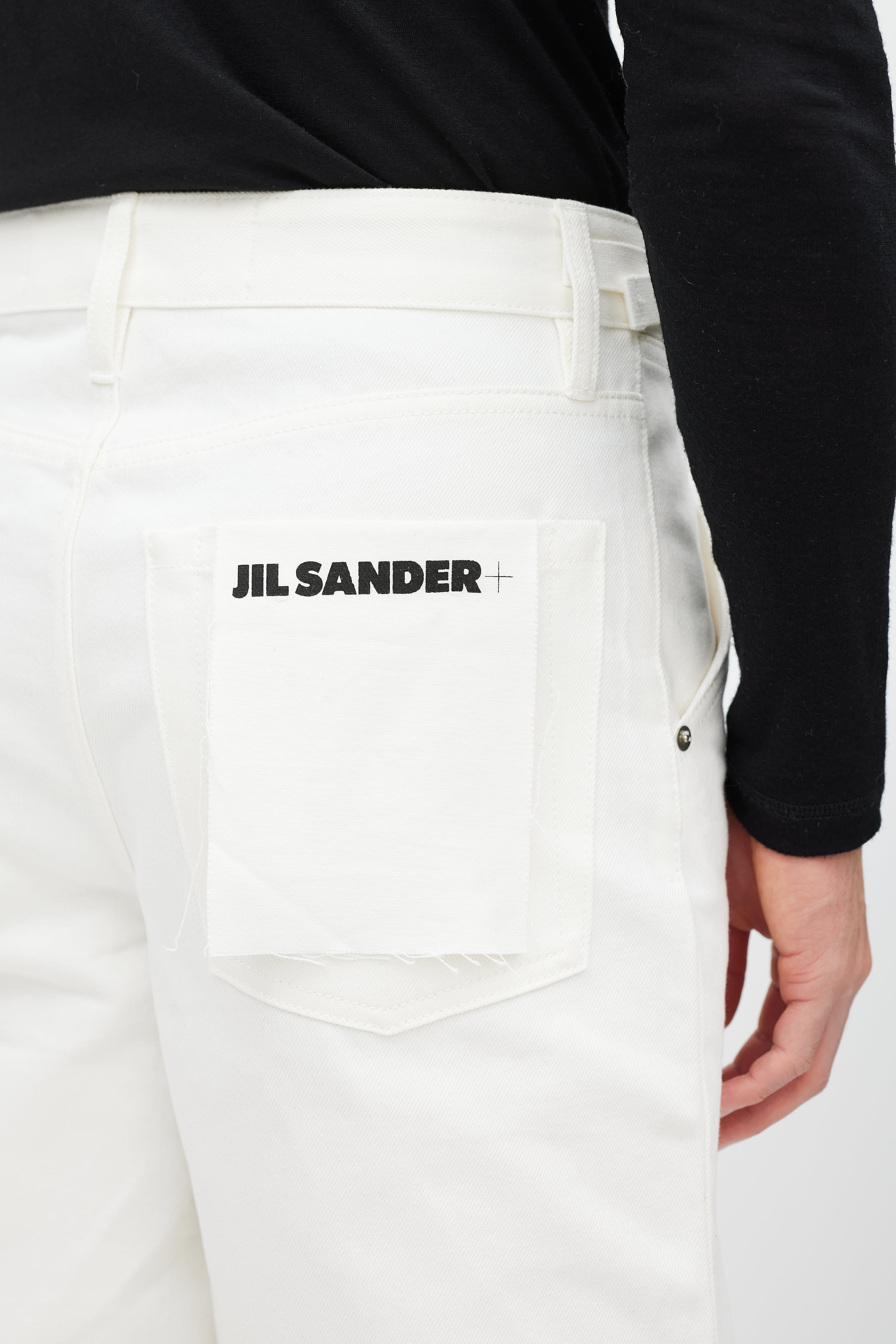 Jil Sander white denim shorts featuring five pocket styling, adjustable straps at waist, wide leg, and zip fly with button closure.