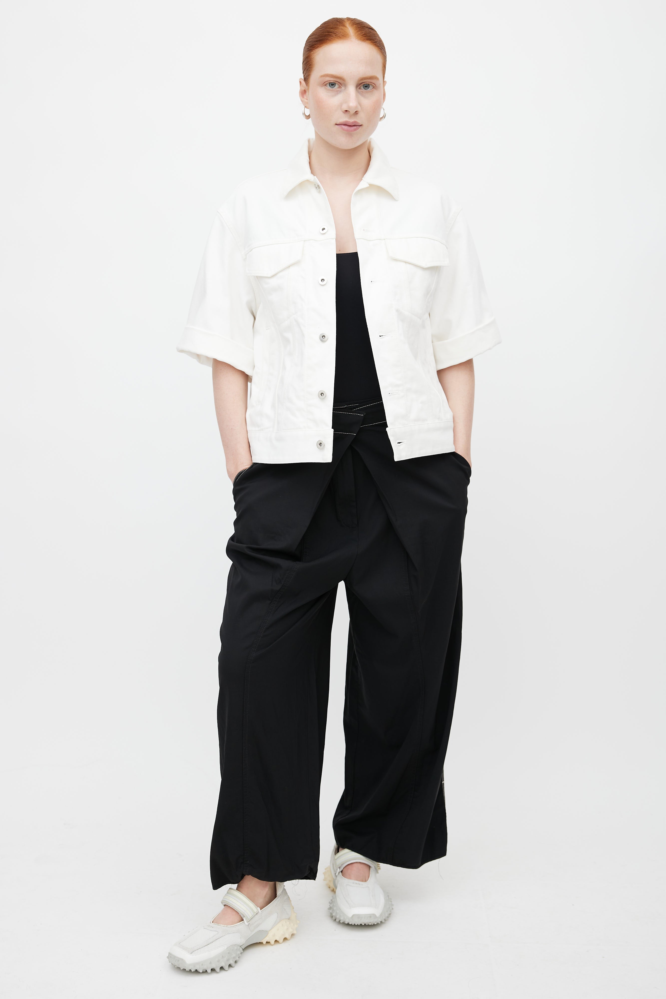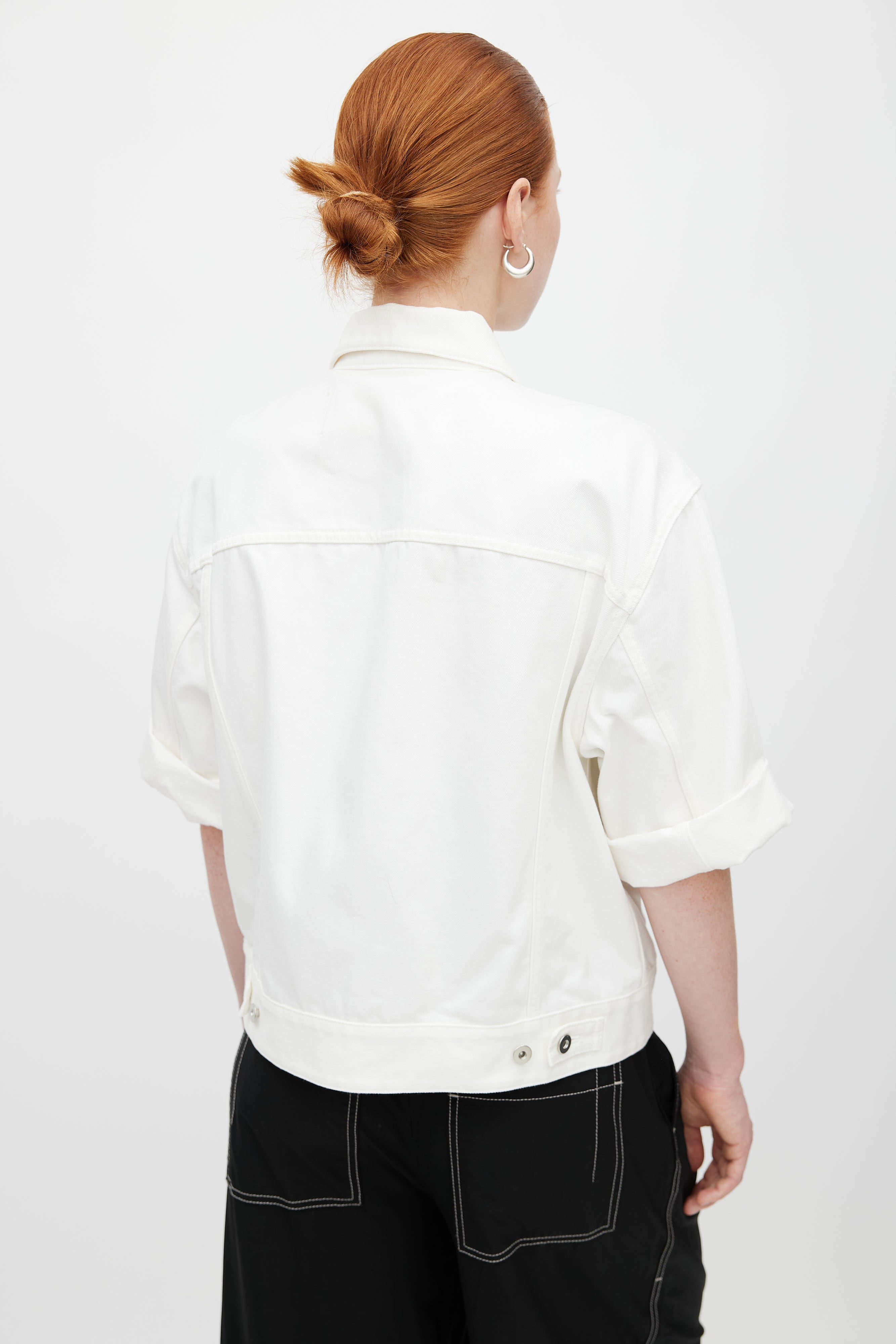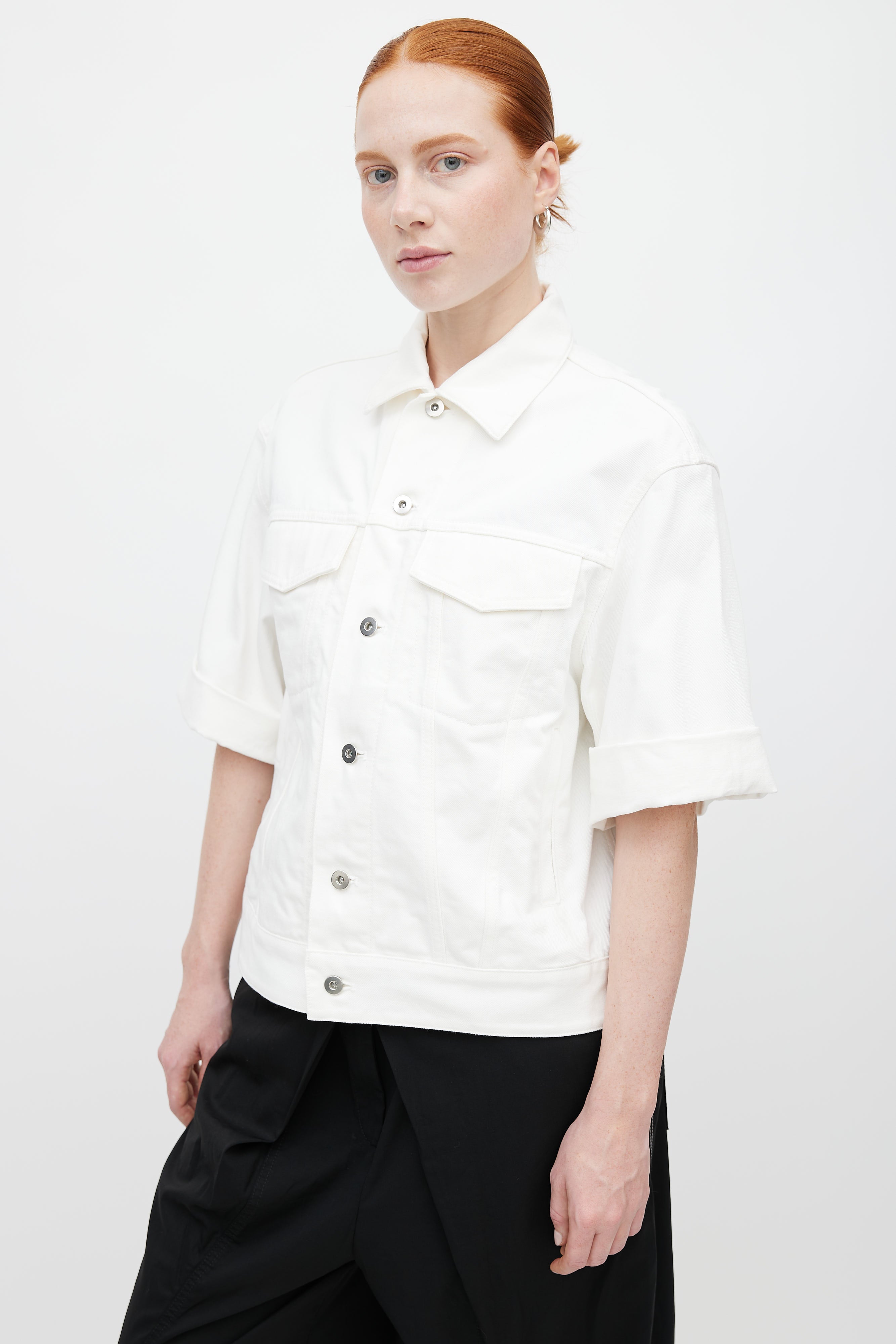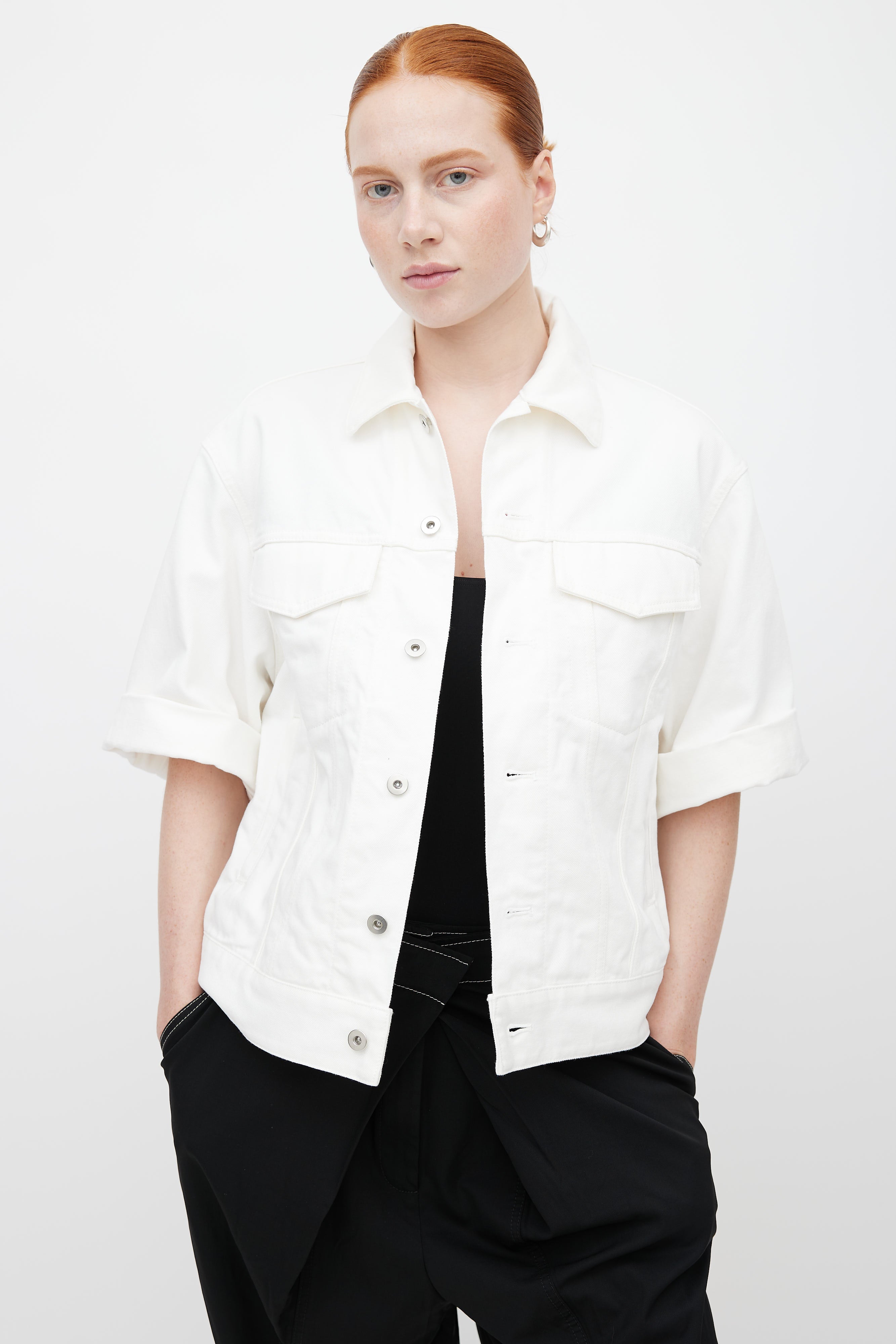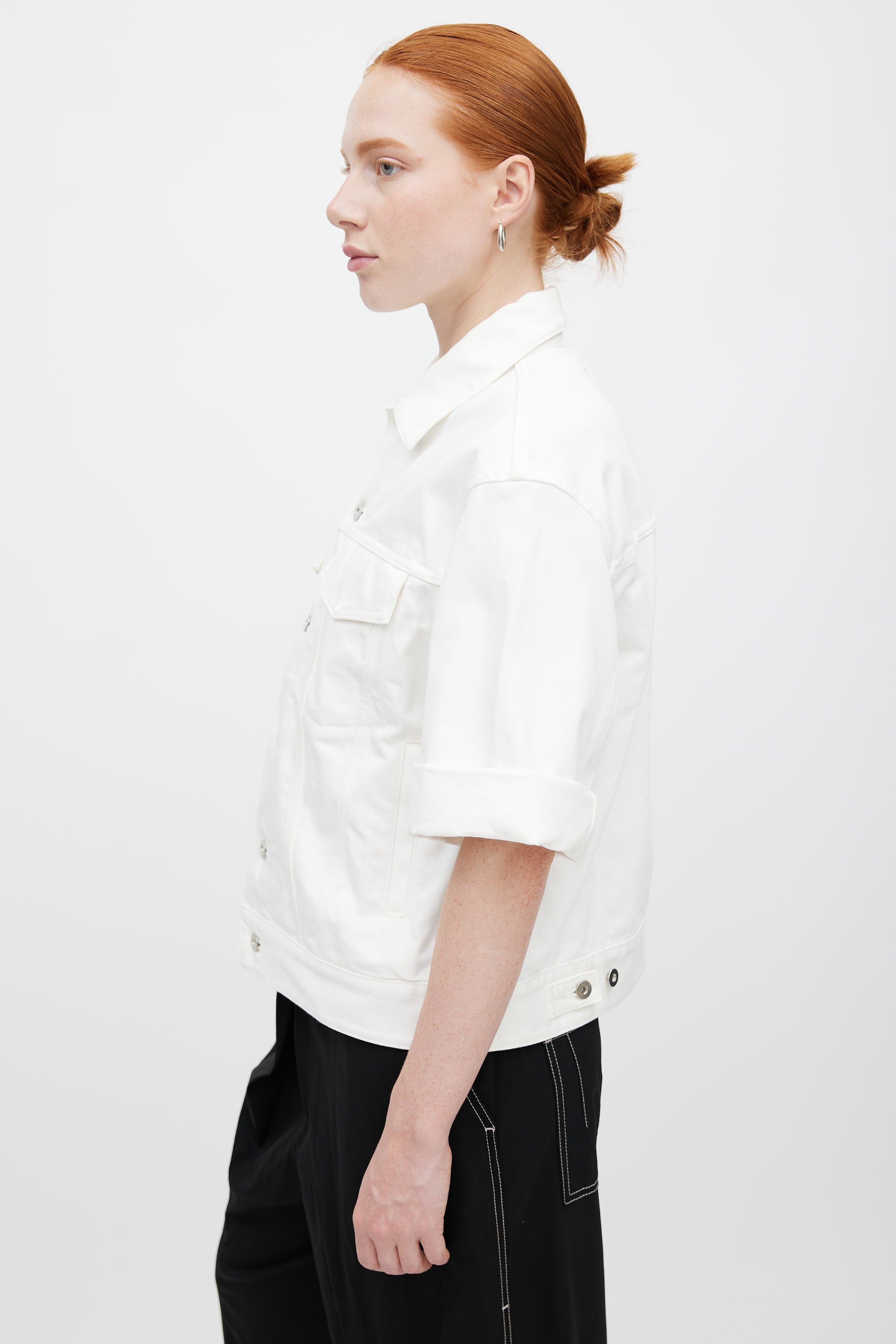 Pre-owned Jil Sander+ white denim jacket featuring button up front, classic collar, two flap chest pockets, two slash hip pockets, and three quarter sleeves.