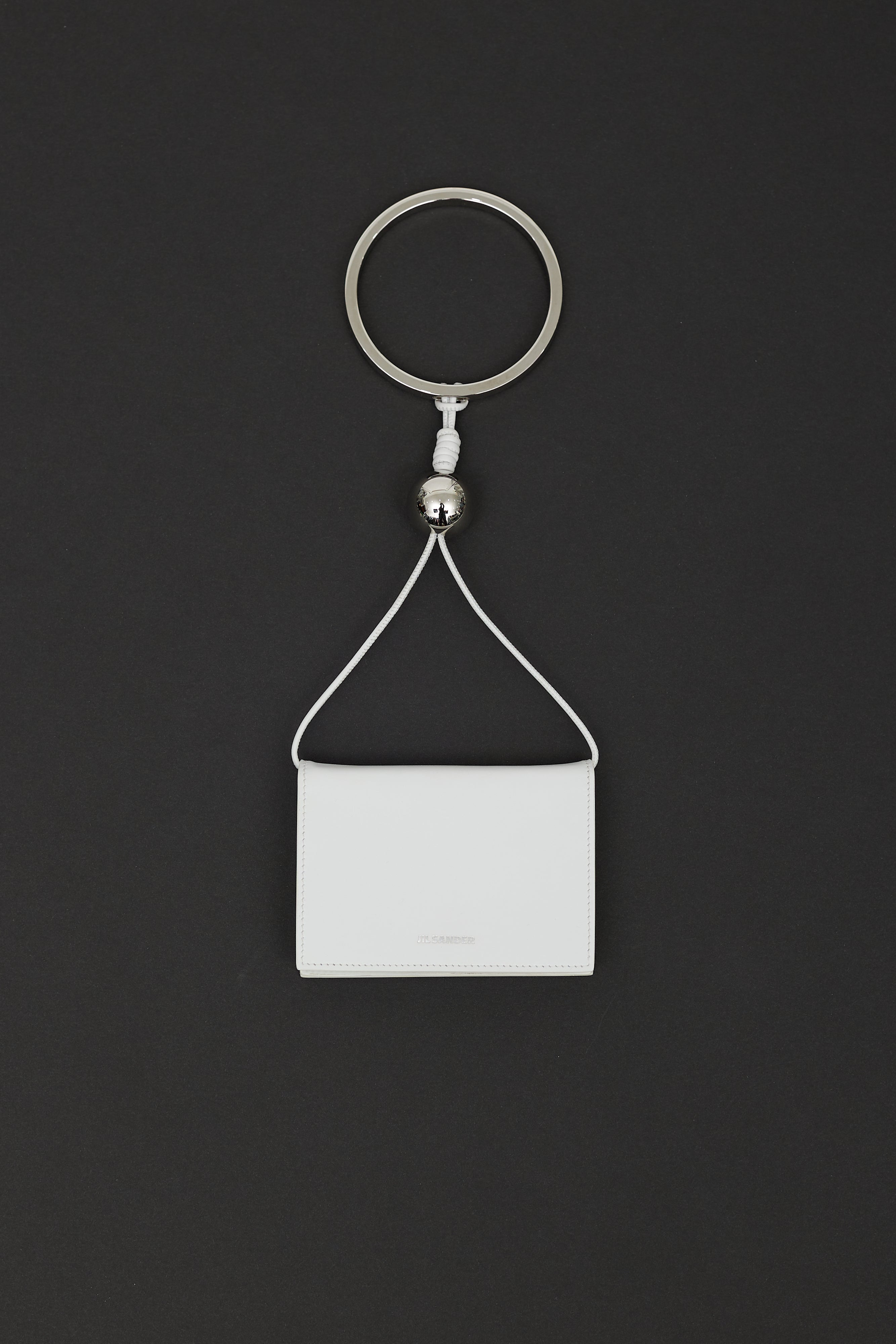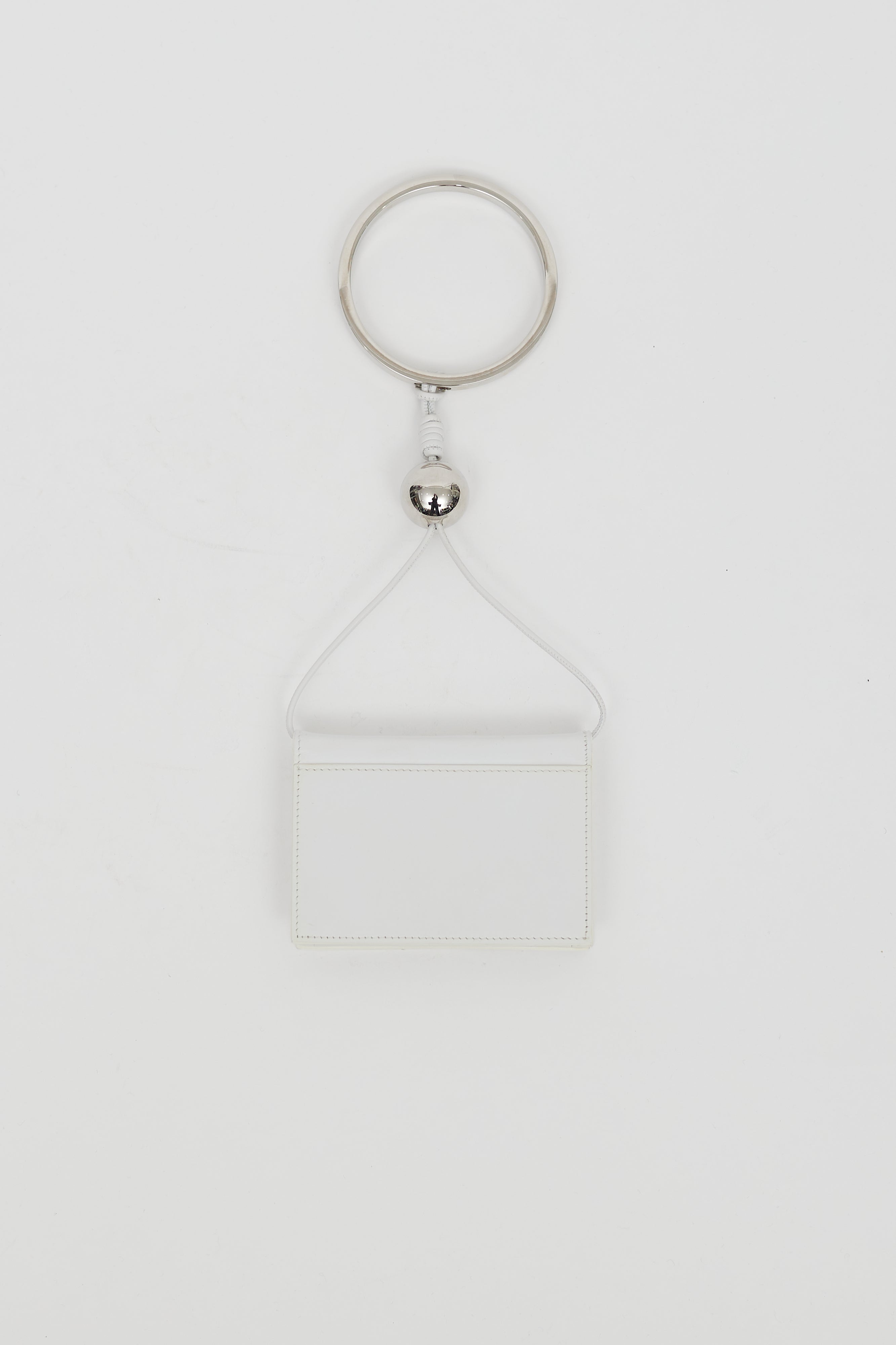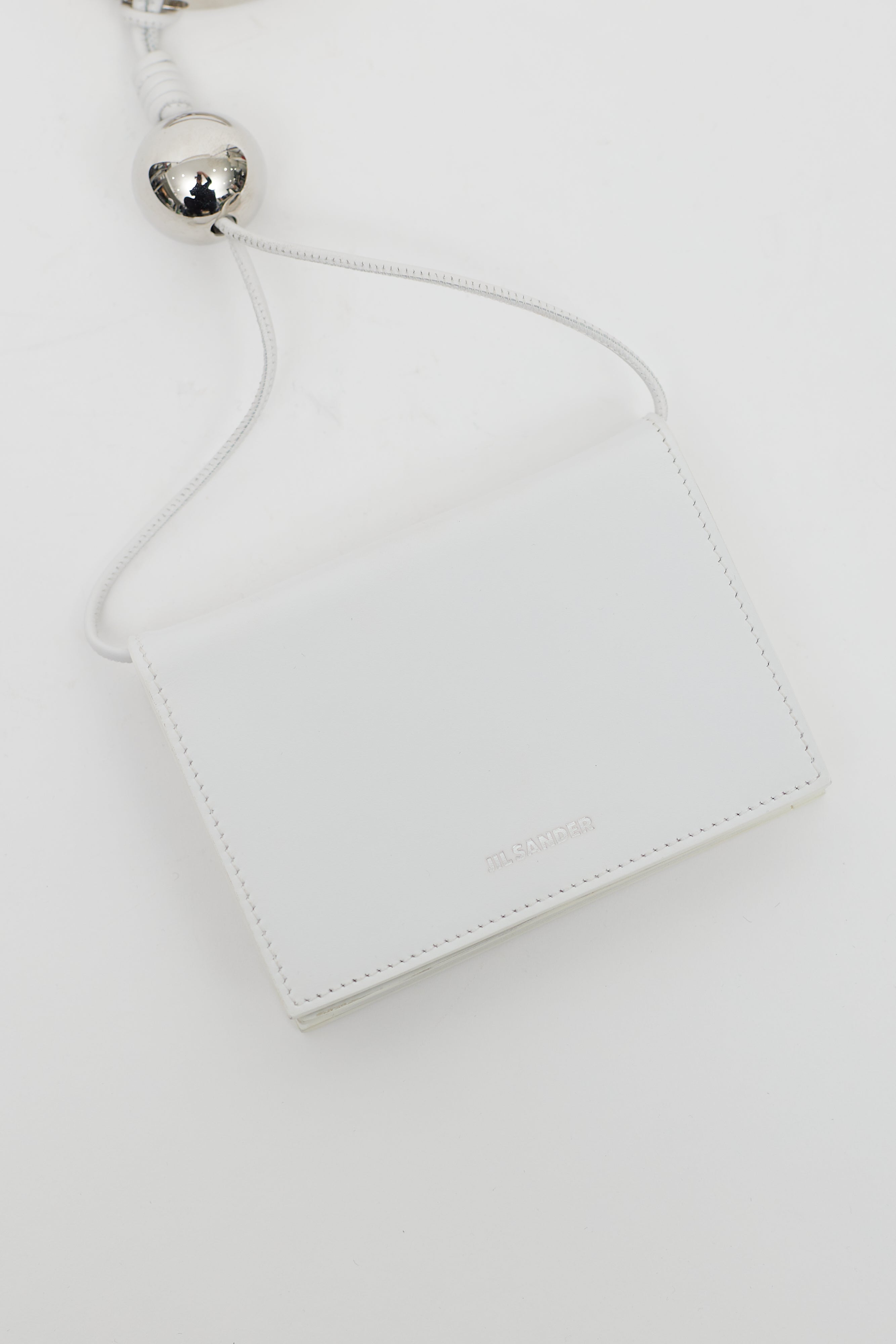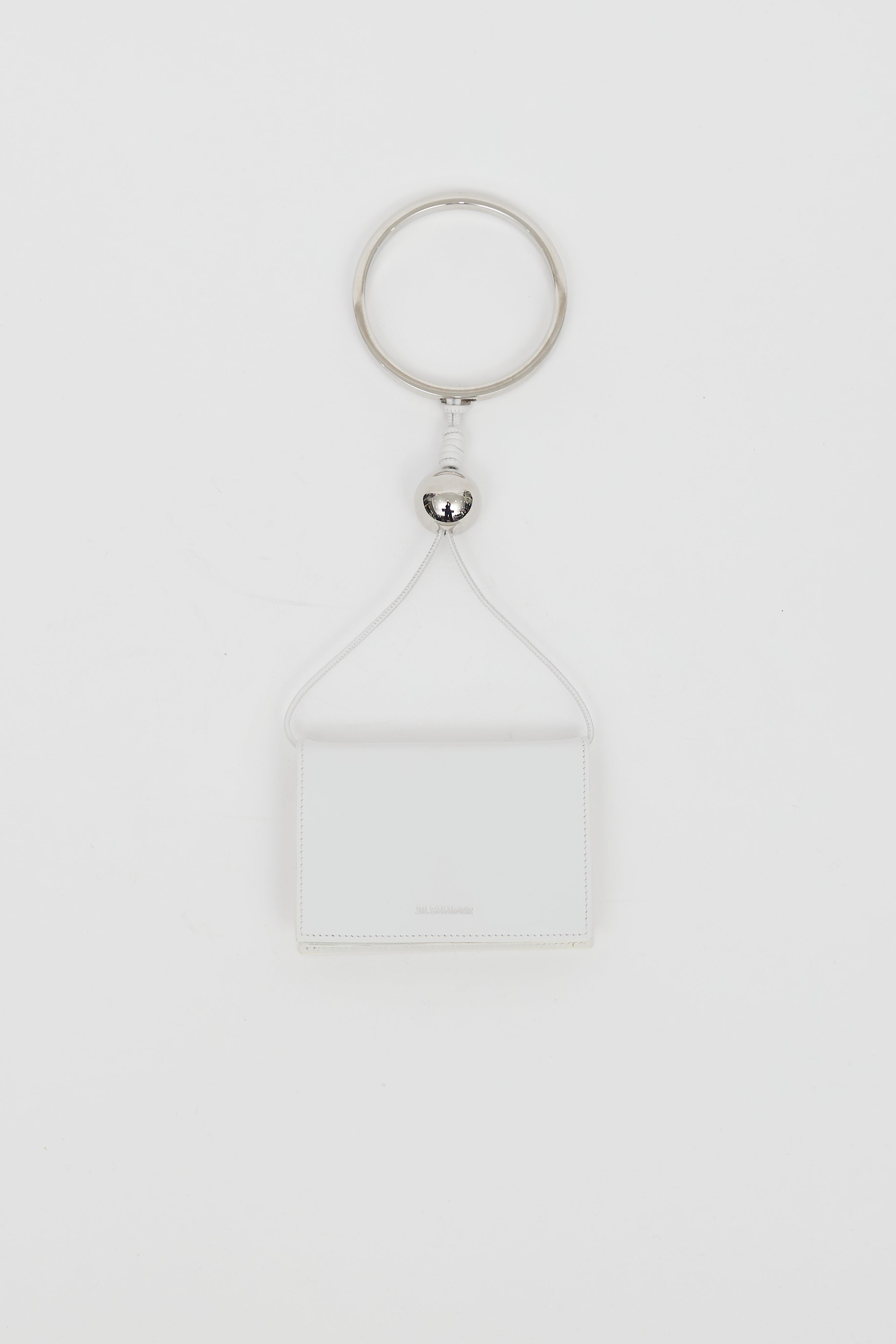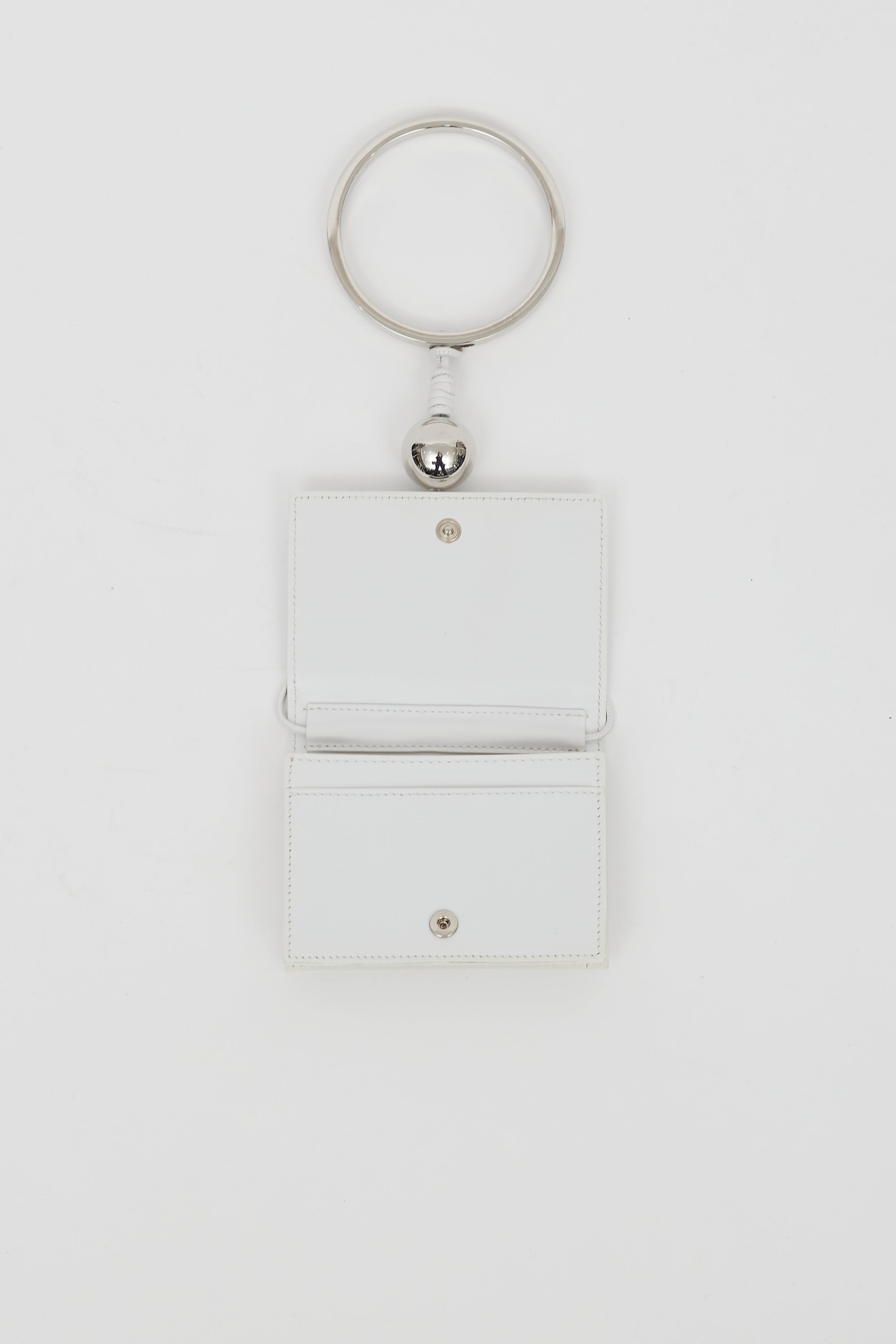 Pre-owned Jil Sander white leather Bracelet wallet featuring silver tone metal bracelet, silver tone oversized bead, silver stamped logo, one slip pocket at back, snap button closure, one main compartment, and one slip pocket under top flap.