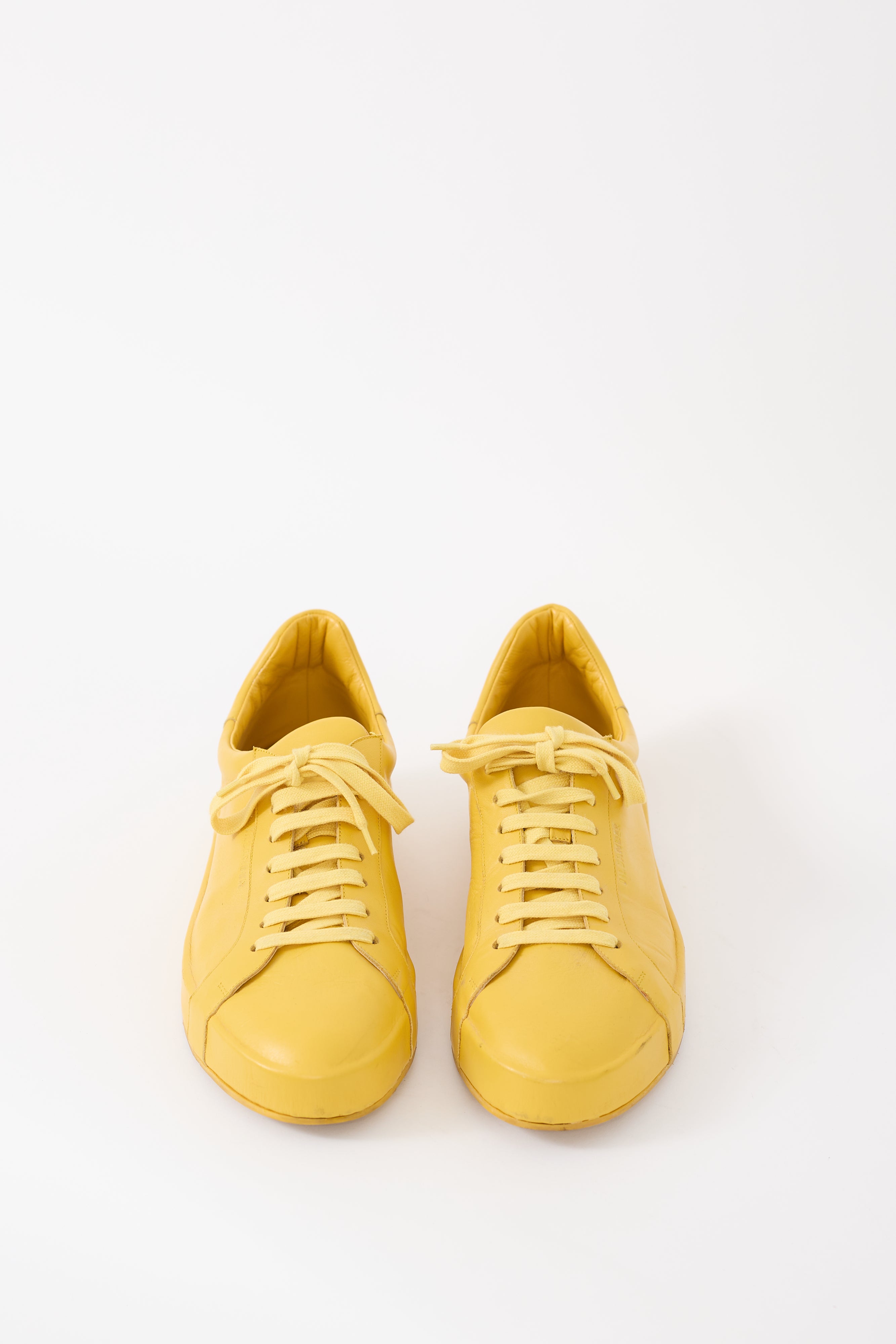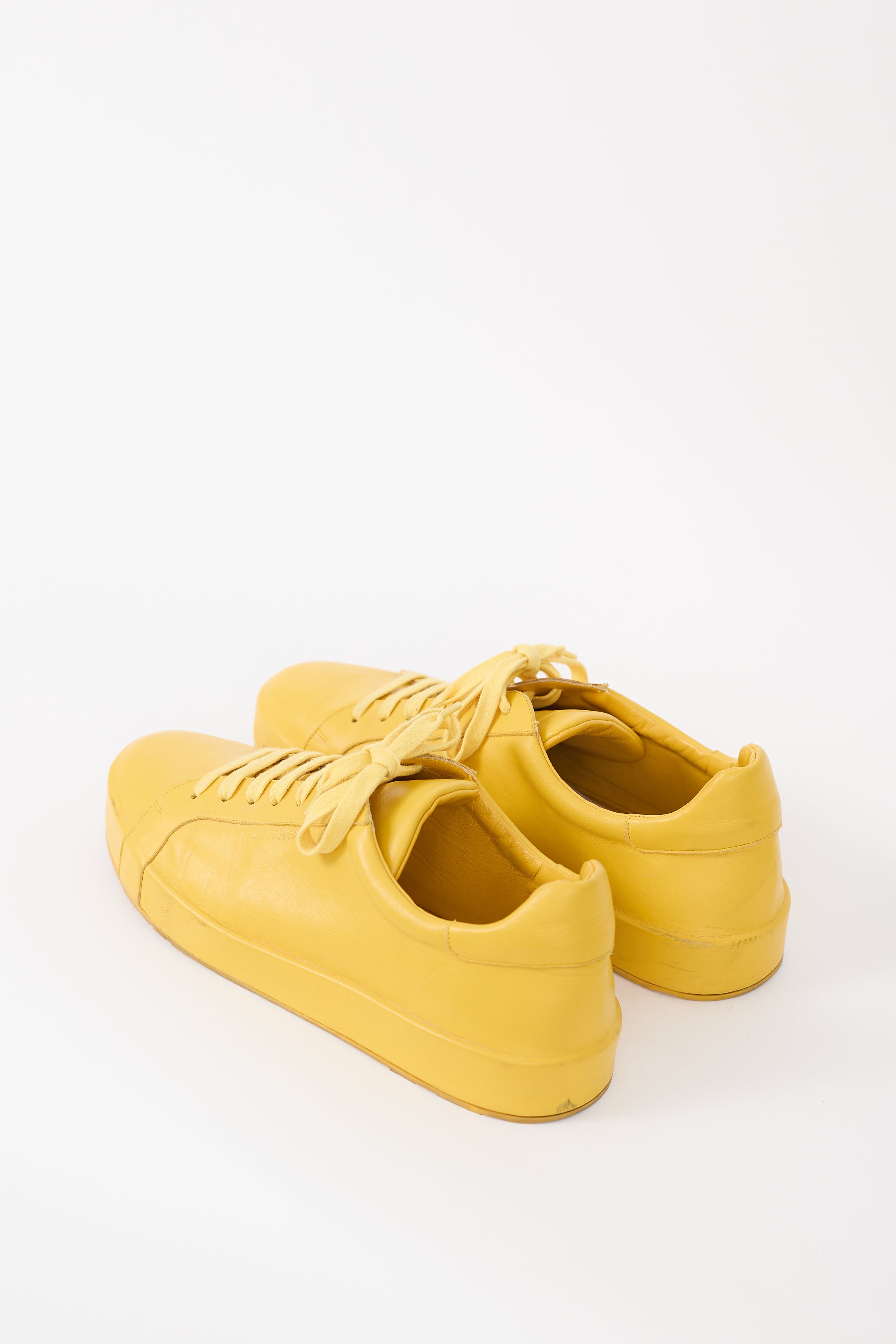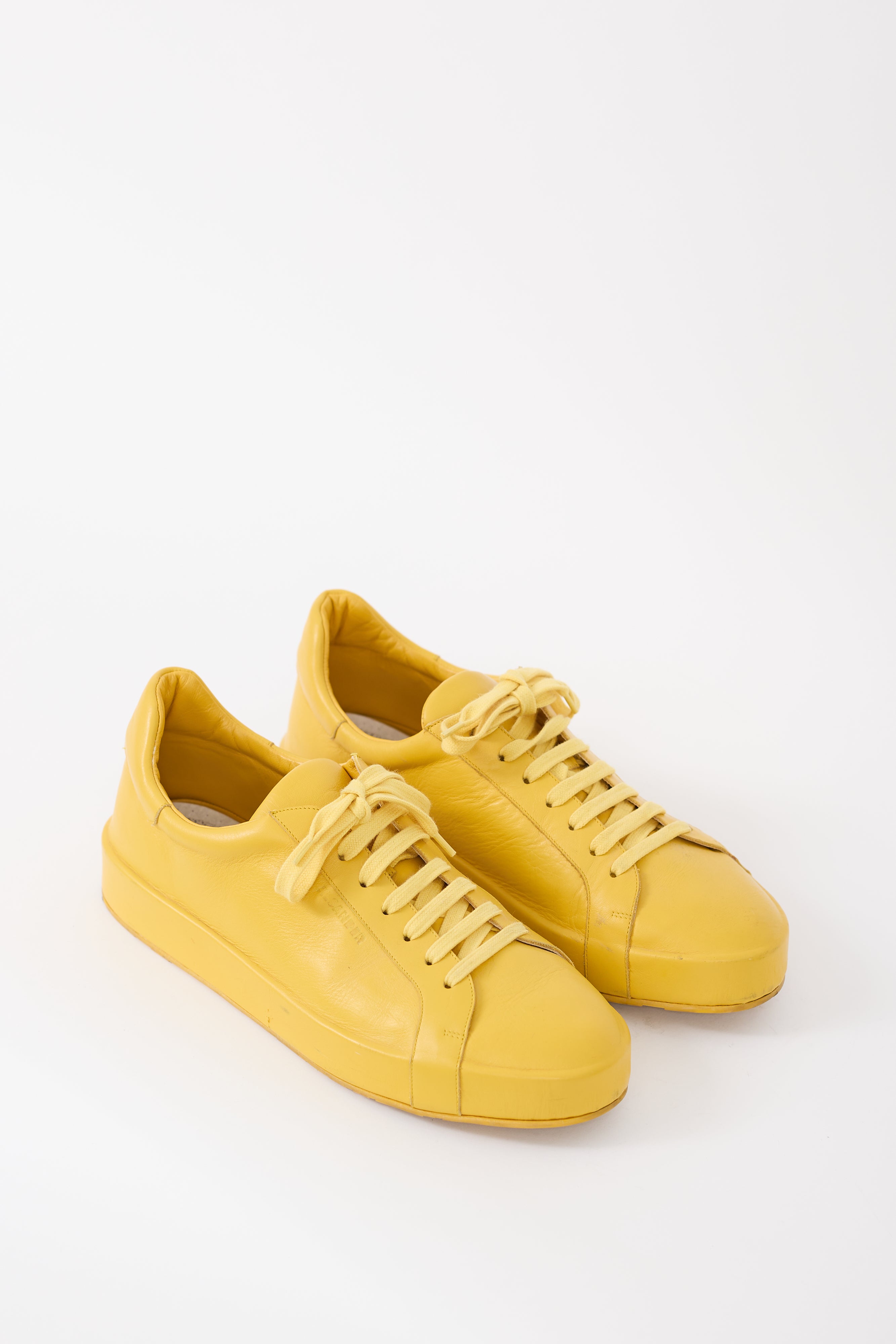 Pre-owned Jil Sander yellow leather sneakers featuring rounded toe, lace up front, debossed logo at eyestay, slip on entry, and covered outsole.