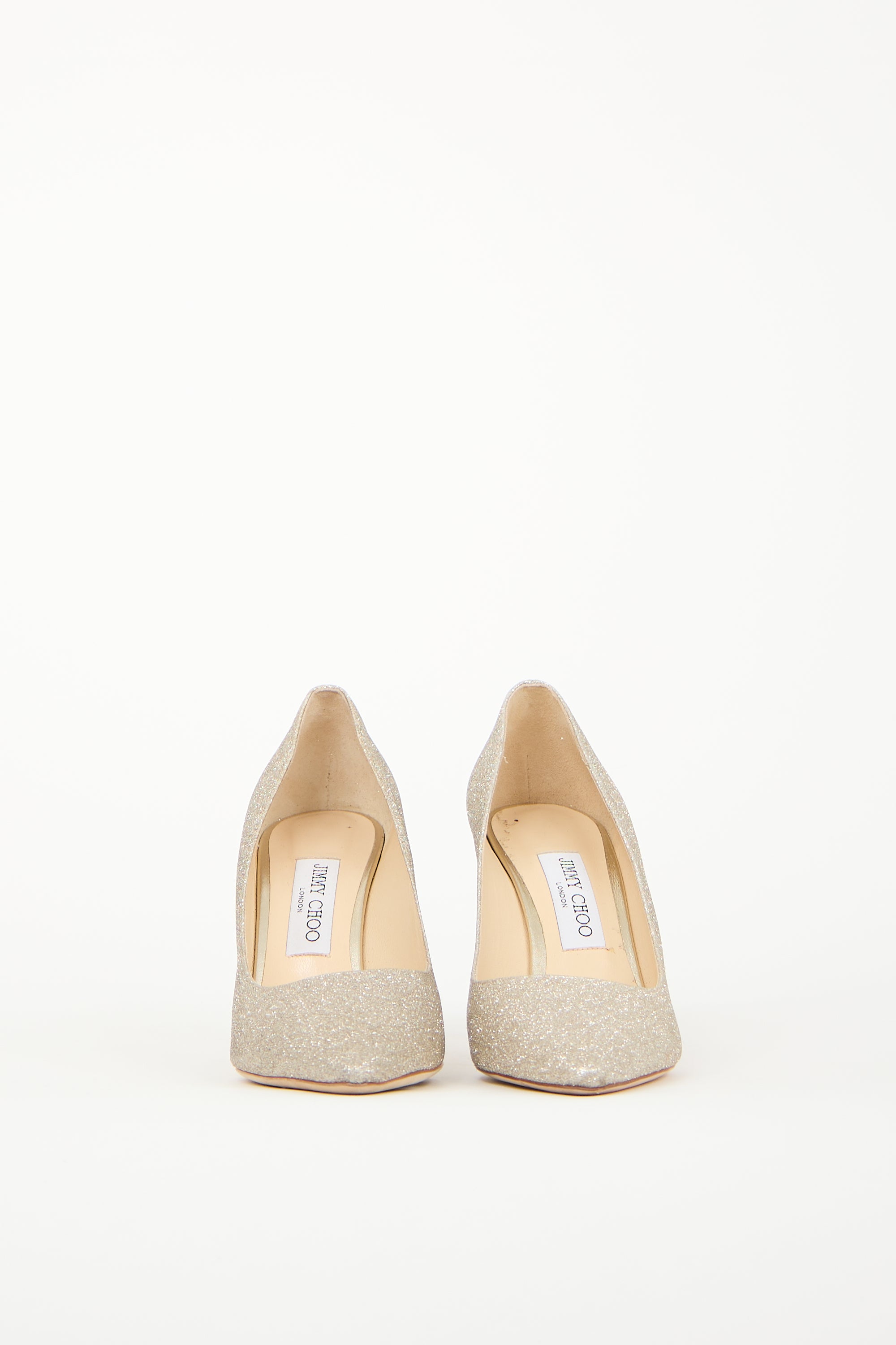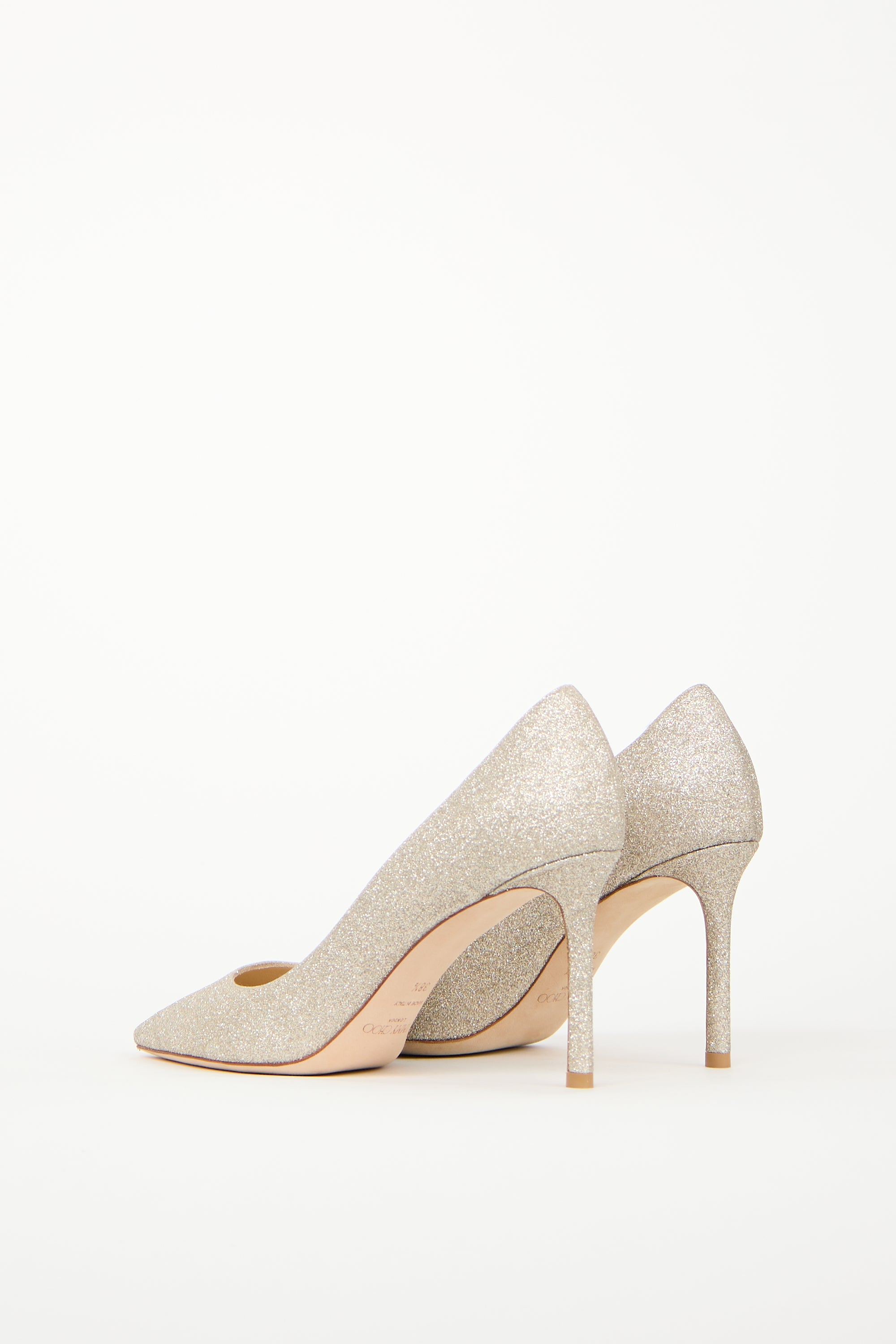 Pre-owned Jimmy Choo silver glitter Romy pumps featuring a pointed toe, slip on entry, and stiletto heel. Come with original dust bag.