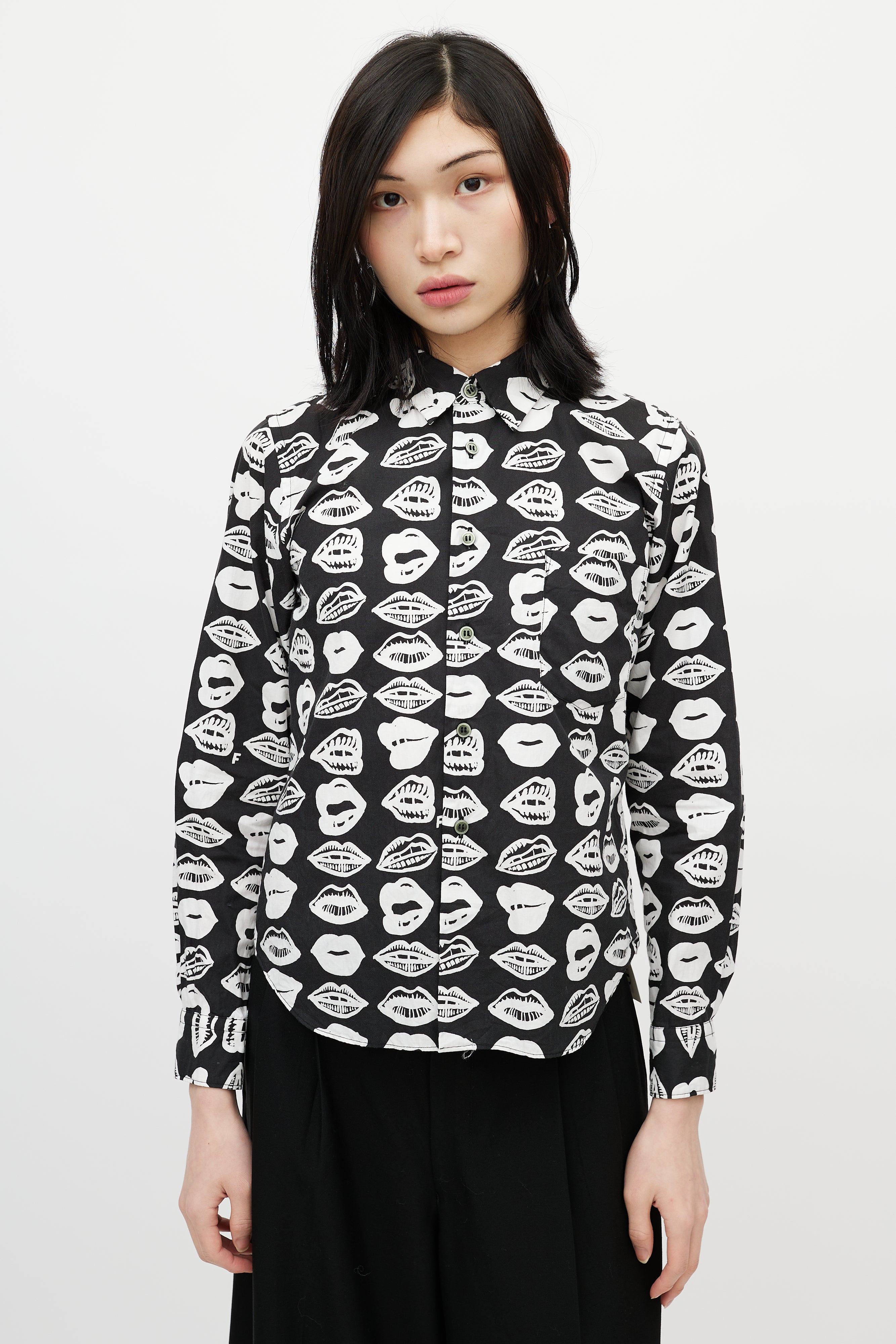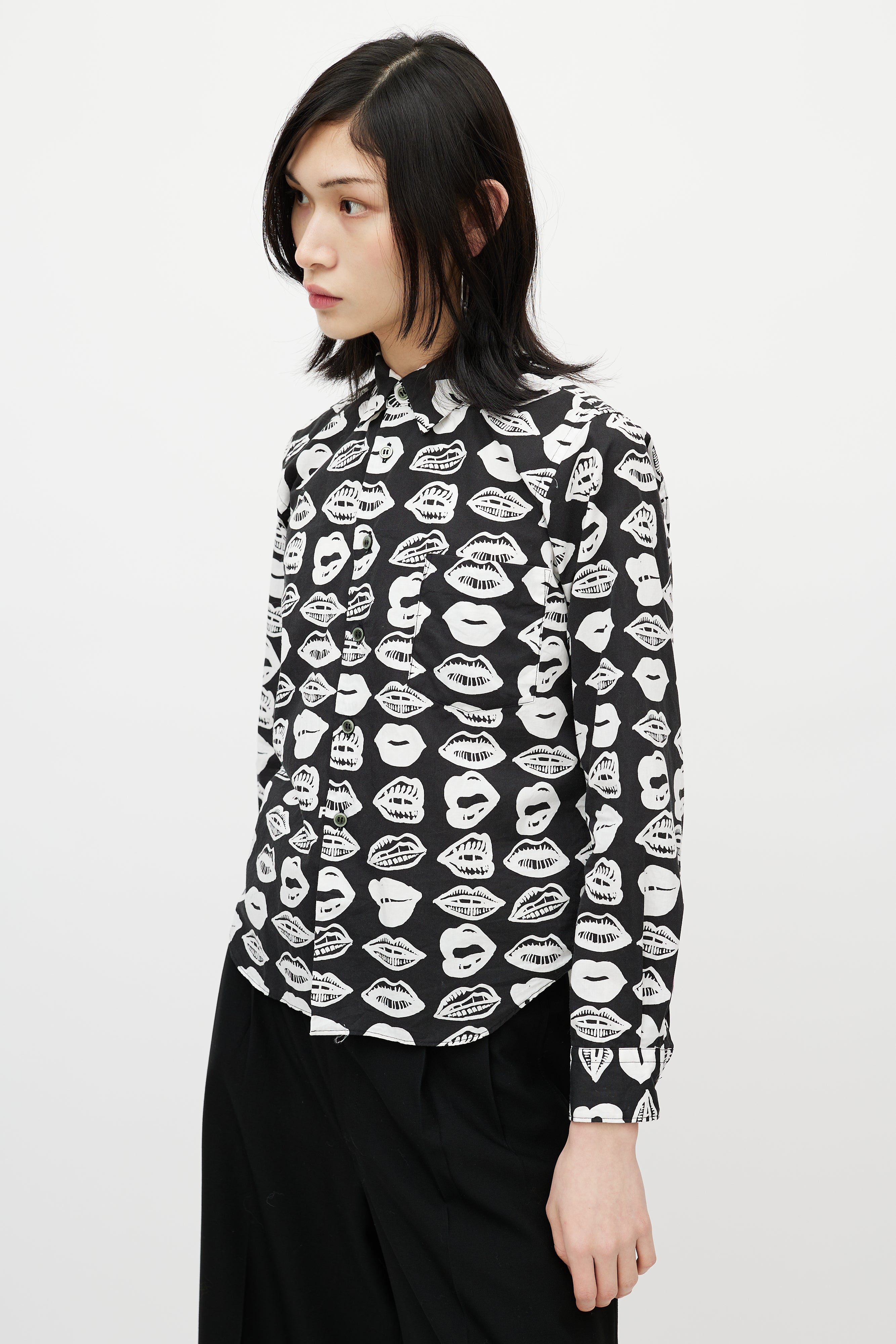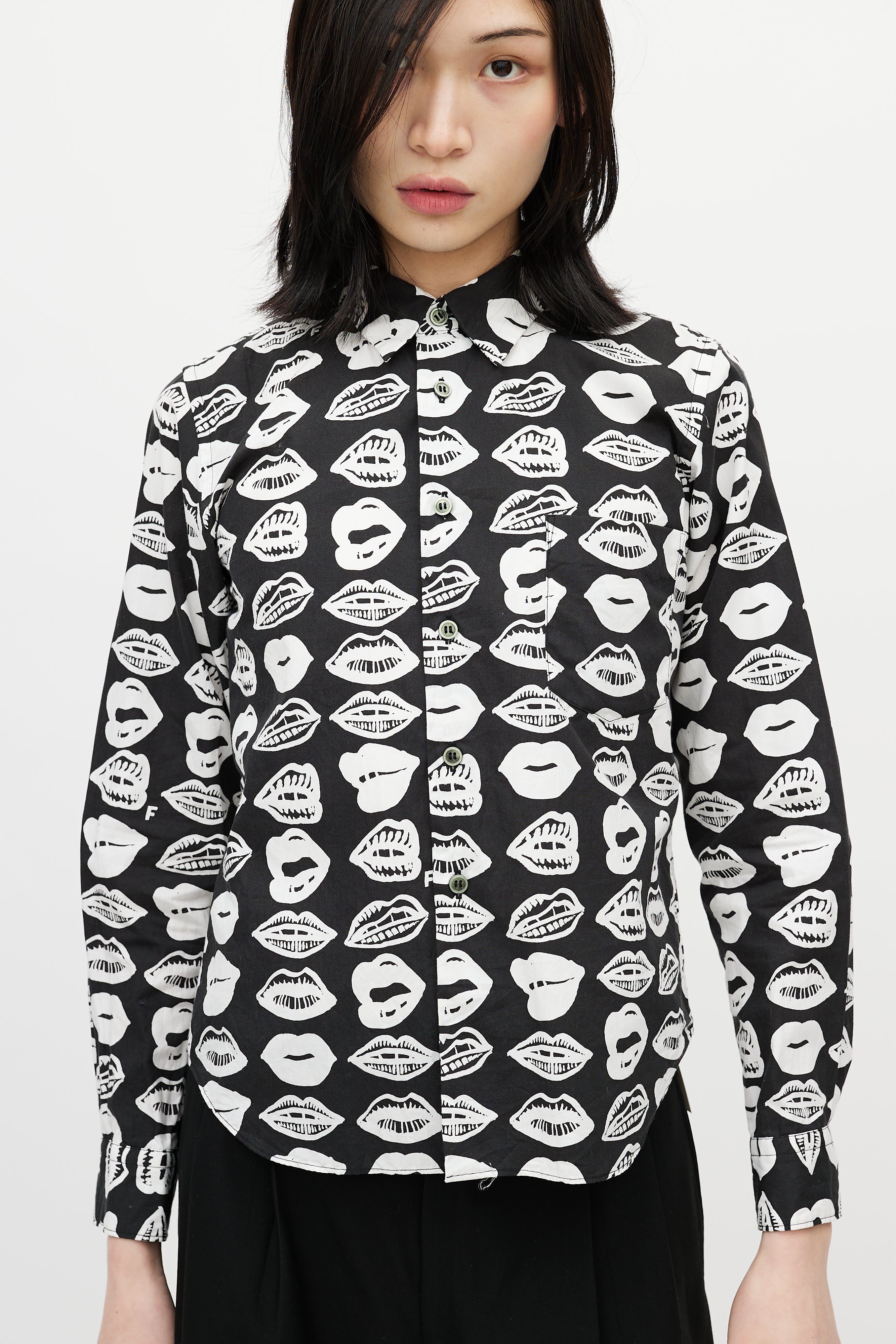 Pre-owned Junya Watanabe black shirt featuring a white lip pattern throughout, pointed collar, long sleeves with buttoned cuffs, one patch pocket at chest, and button up closure.