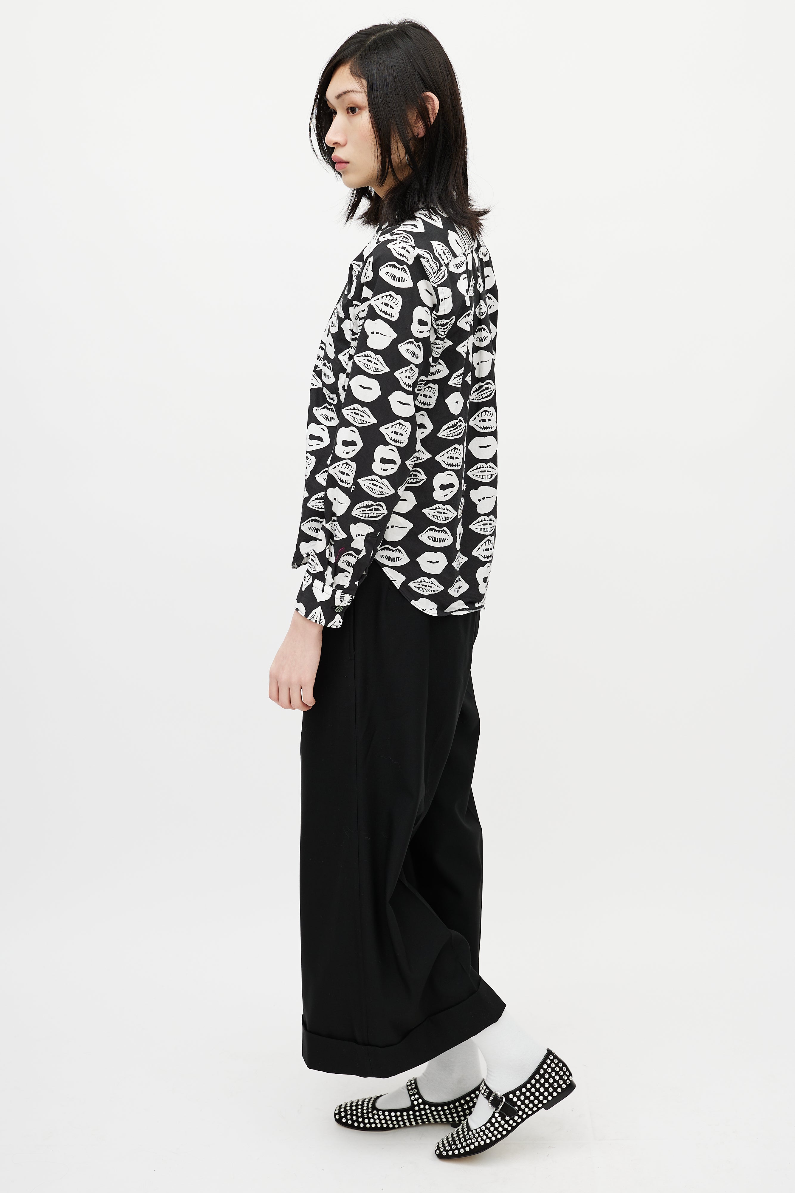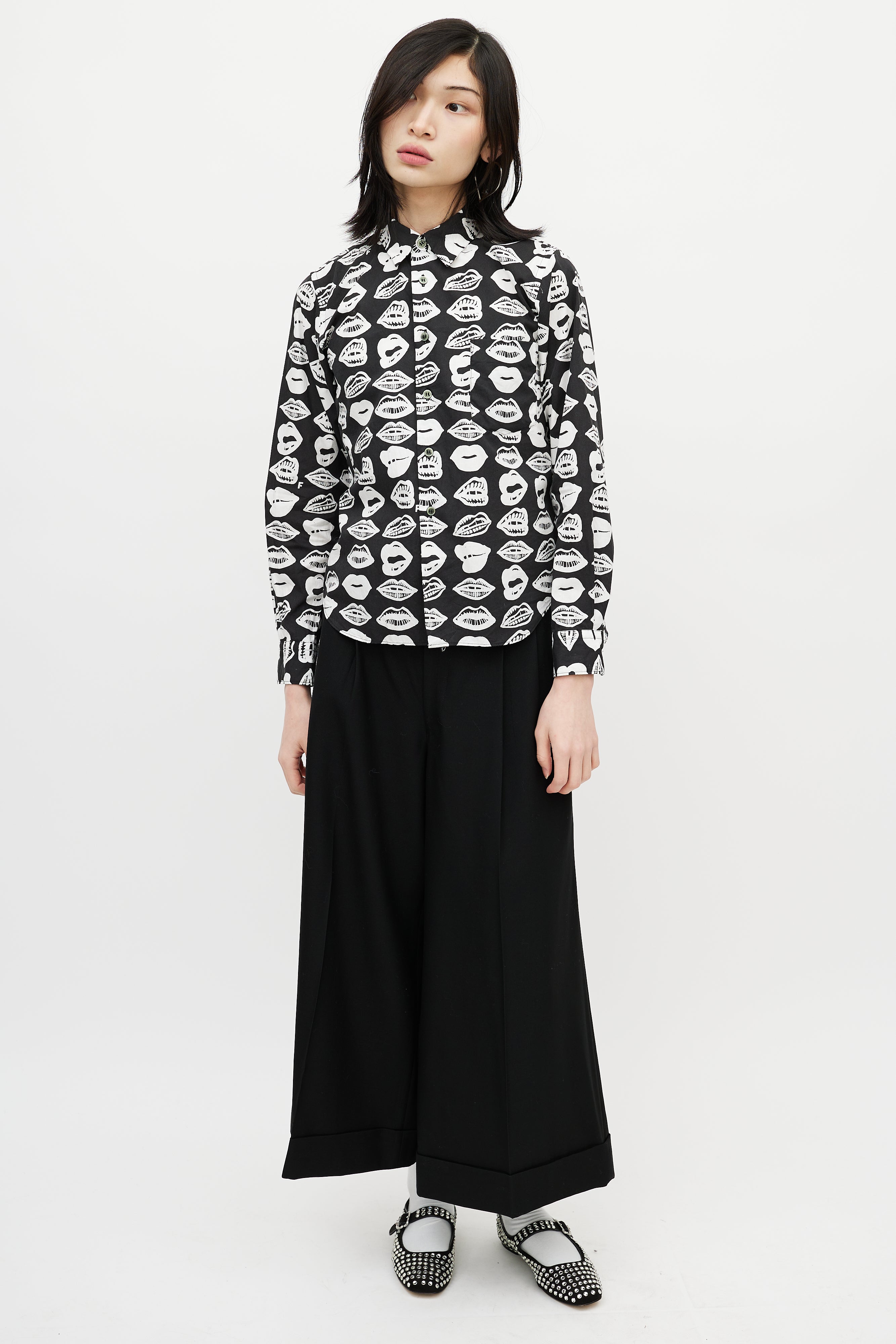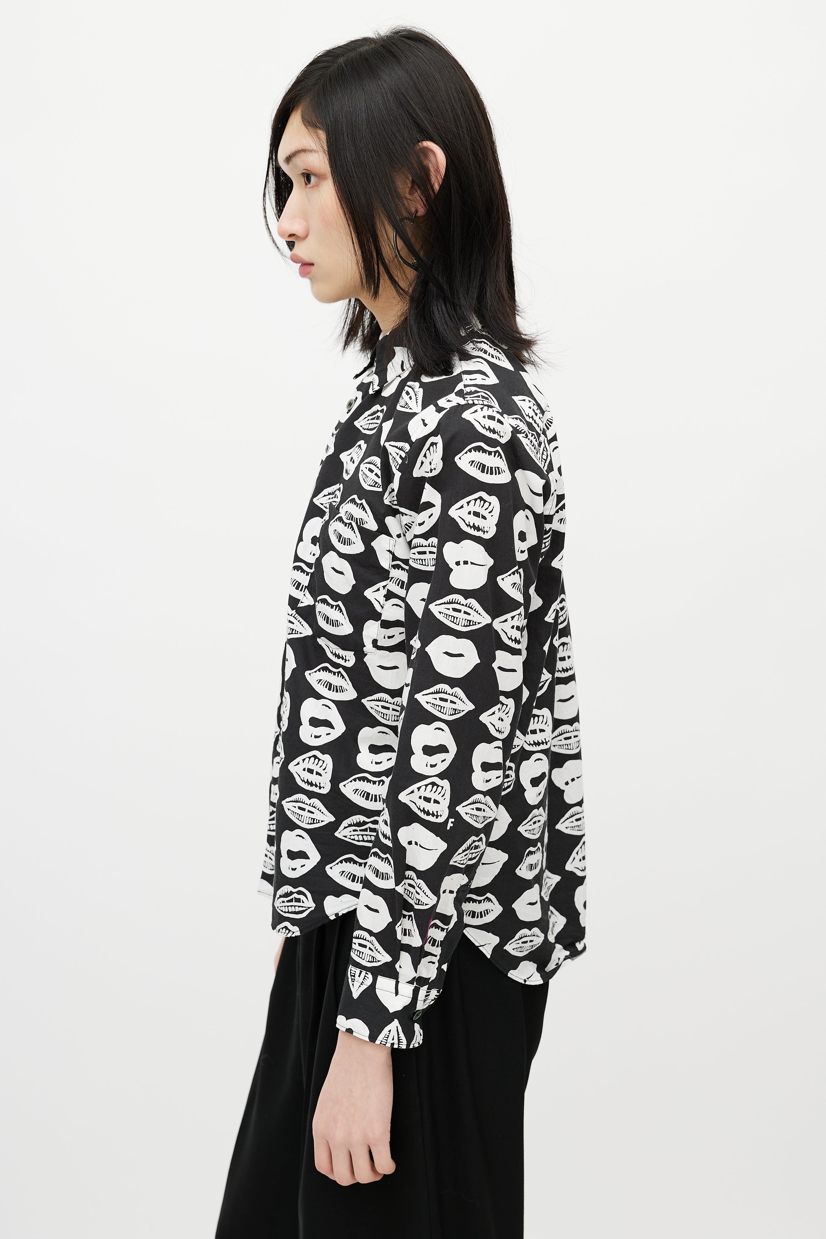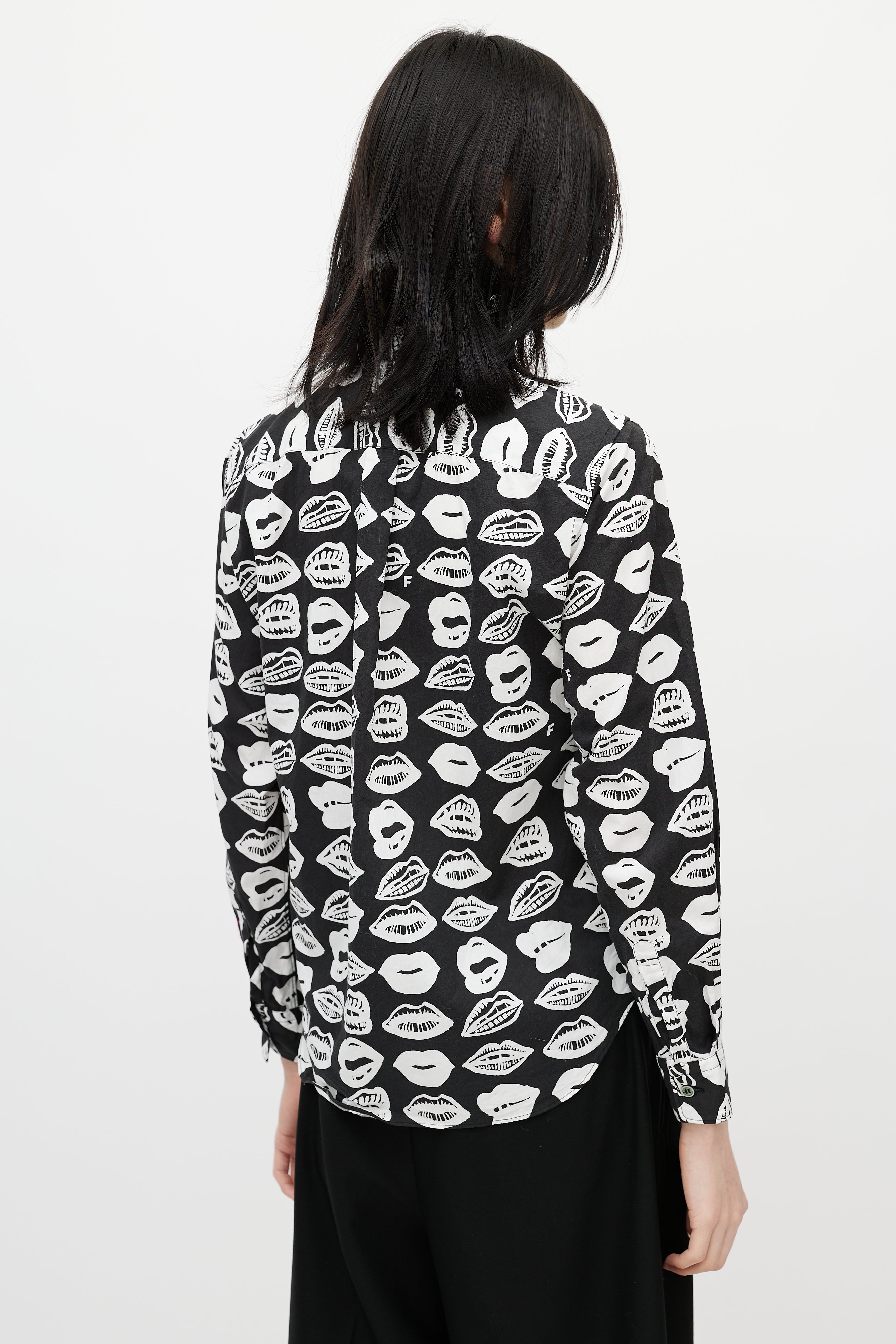 Pre-owned Junya Watanabe black shirt featuring a white lip pattern throughout, pointed collar, long sleeves with buttoned cuffs, one patch pocket at chest, and button up closure.