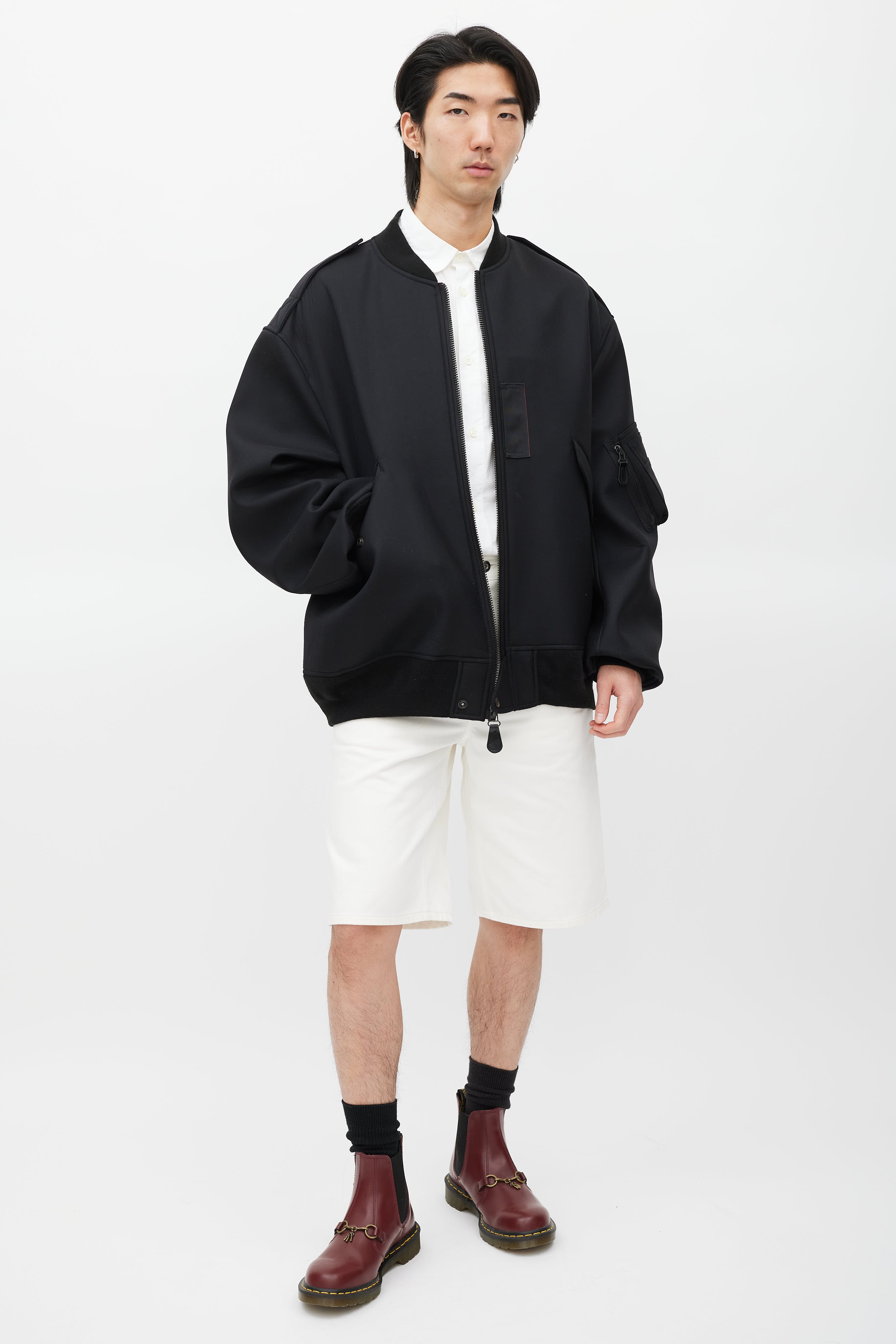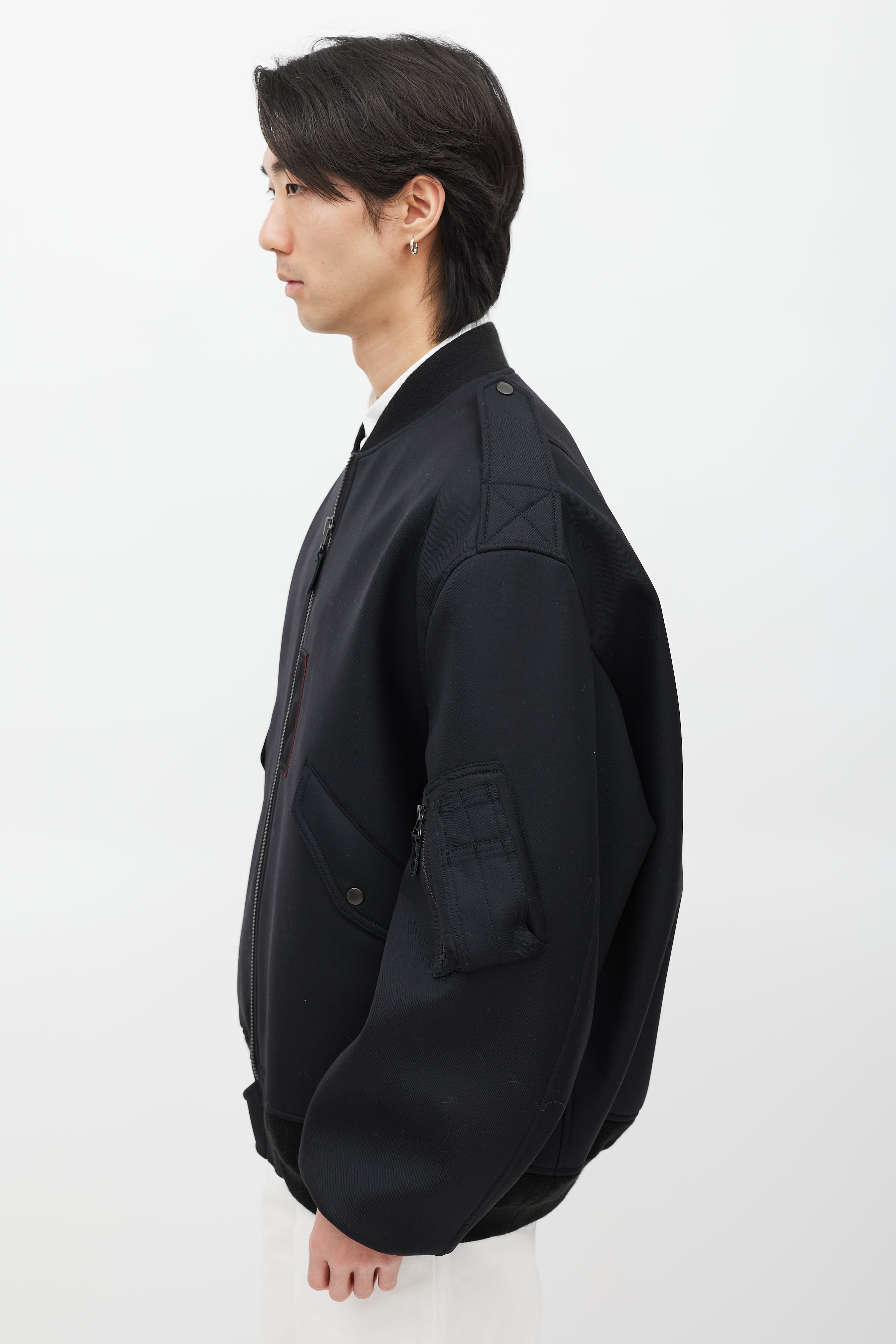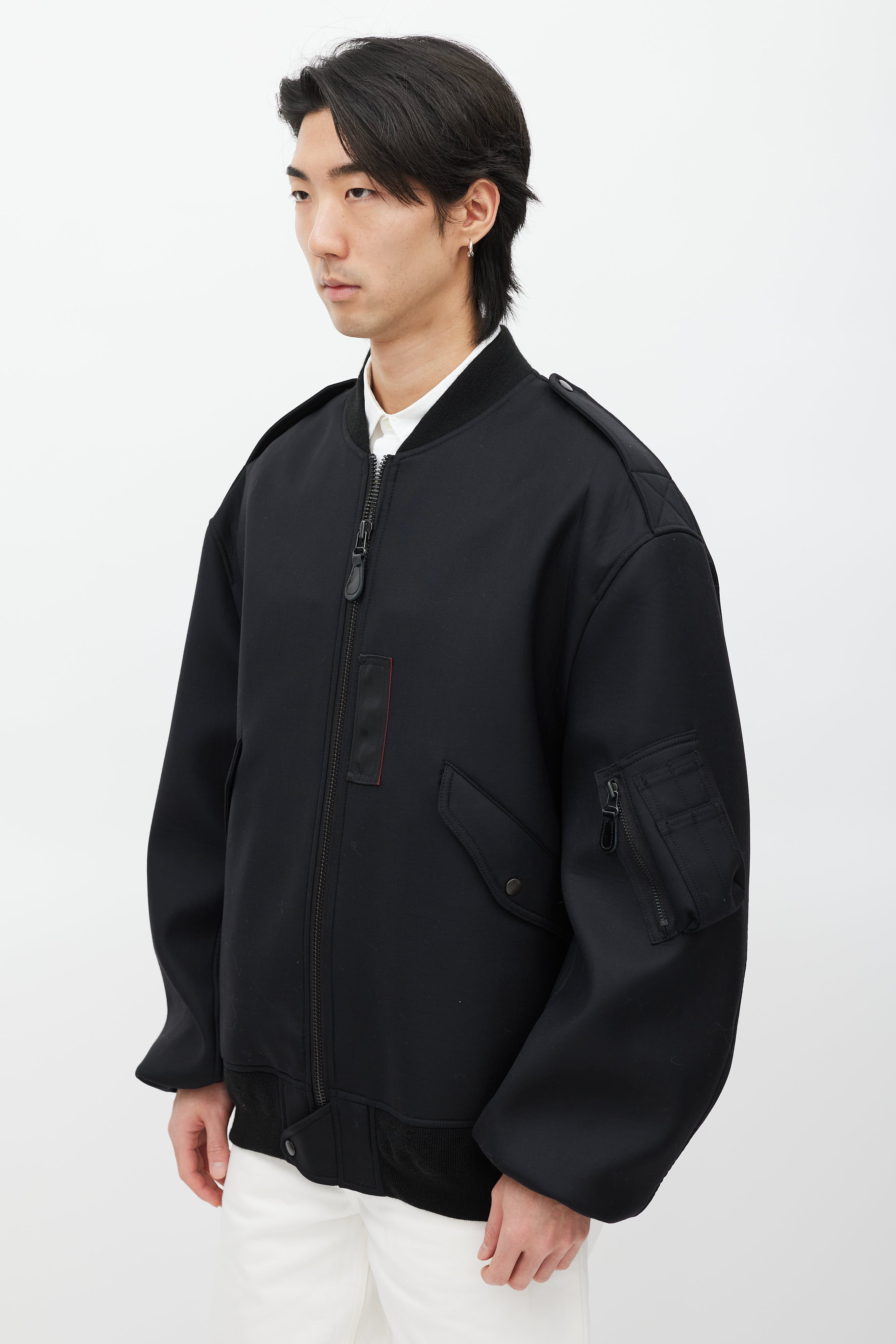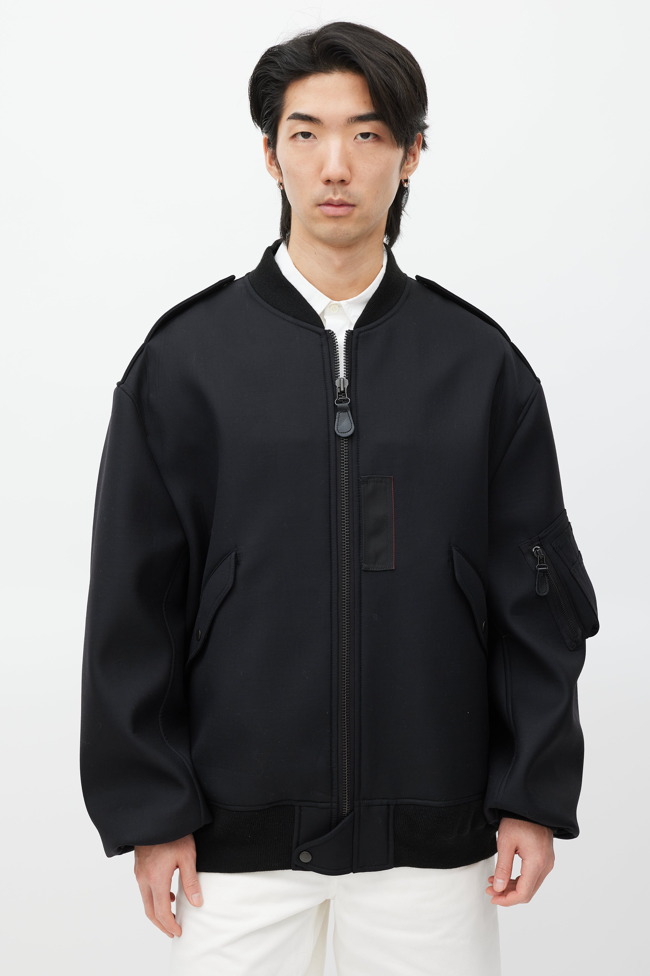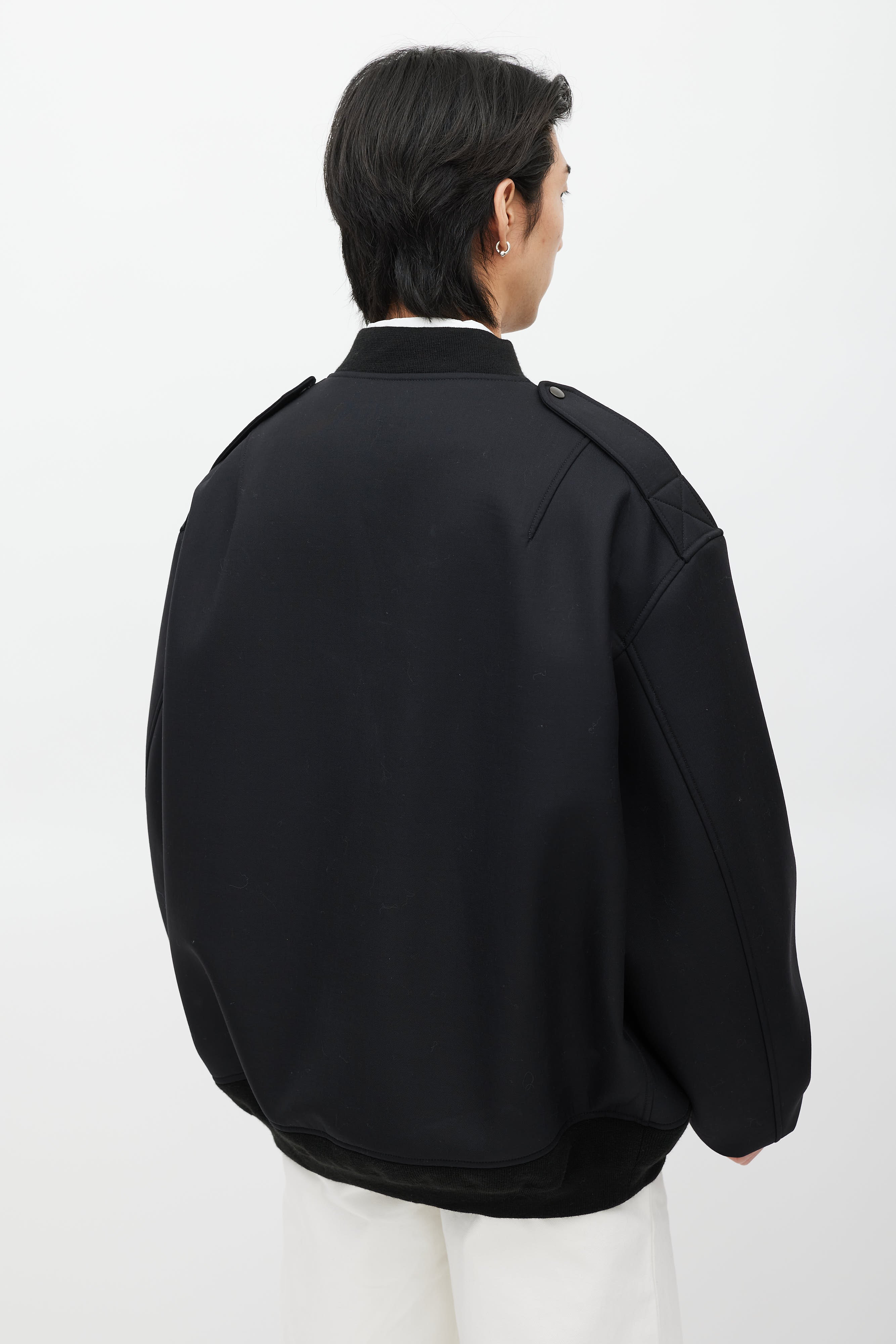 Junya Watanabe black wool bomber jacket featuring a stand collar, long sleeves, one cargo pocket at arm, epaulets at shoulder, two slip pockets at hip, and zip closure. Lined.