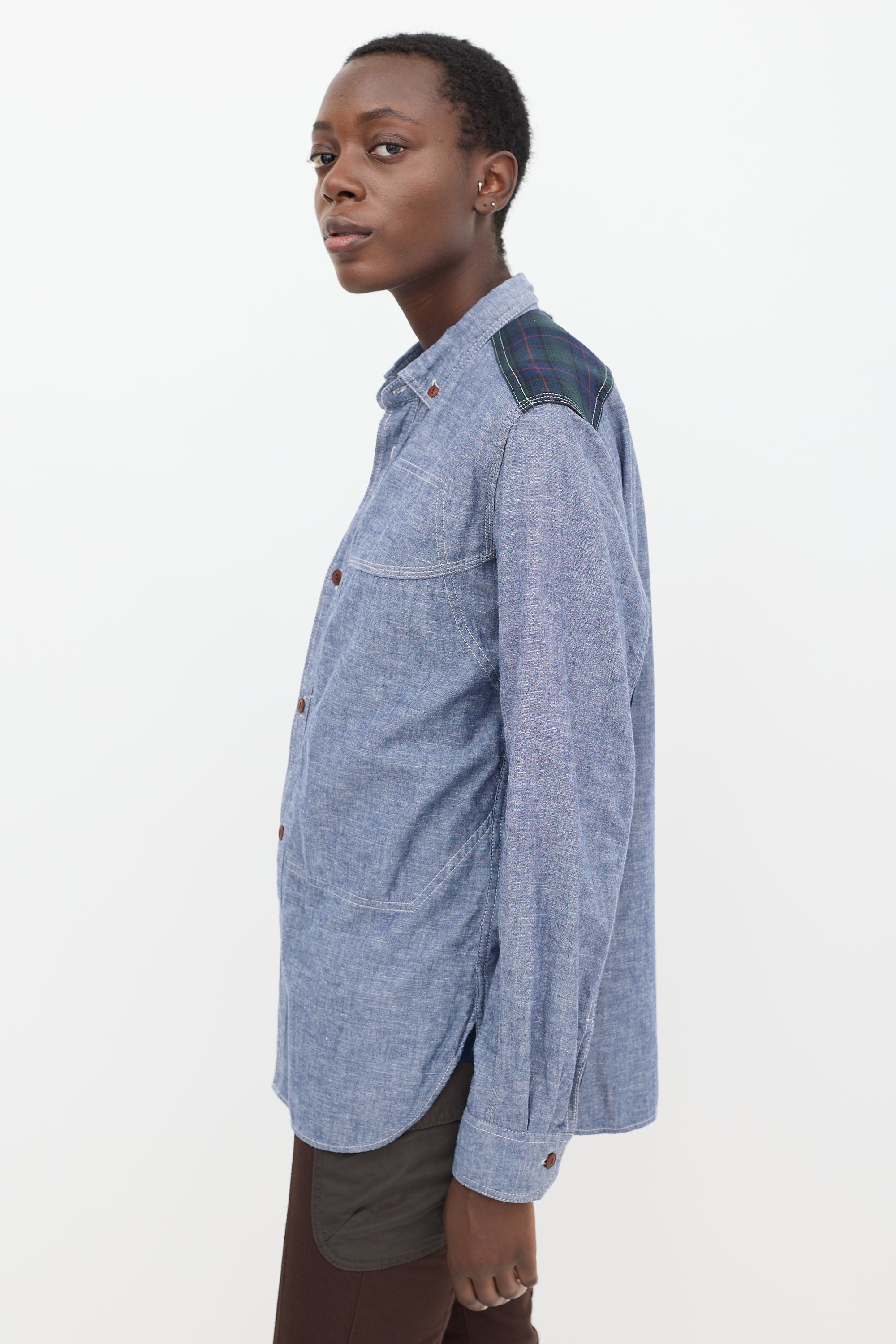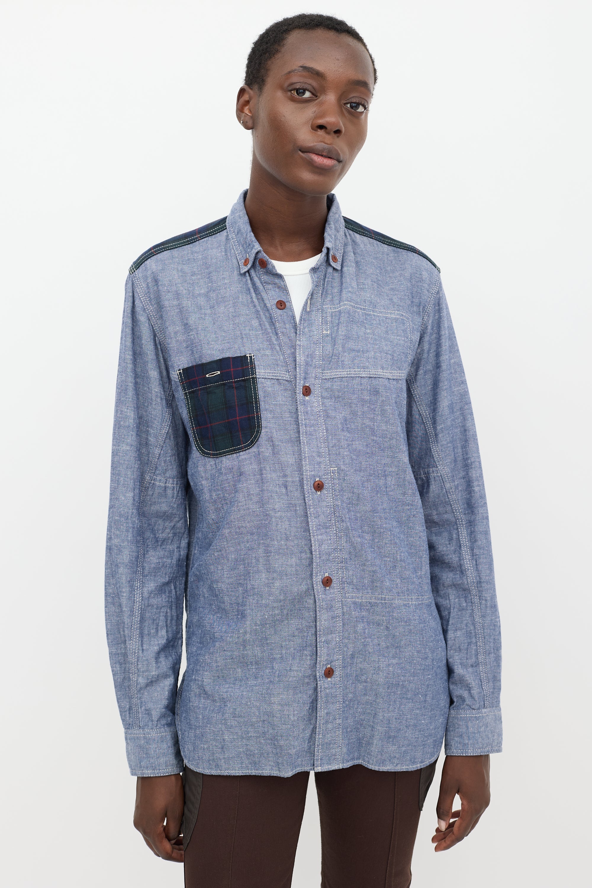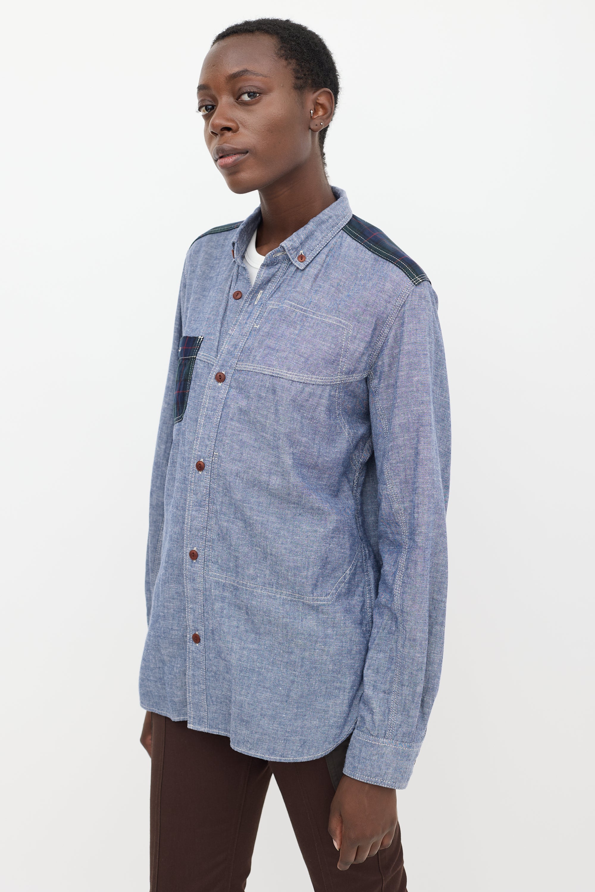 Pre-owned Junya Watanabe blue chambray shirt featuring green plaid trim, pointed button down collar, long sleeves with buttoned cuffs, one patch pocket at chest, and button up closure.