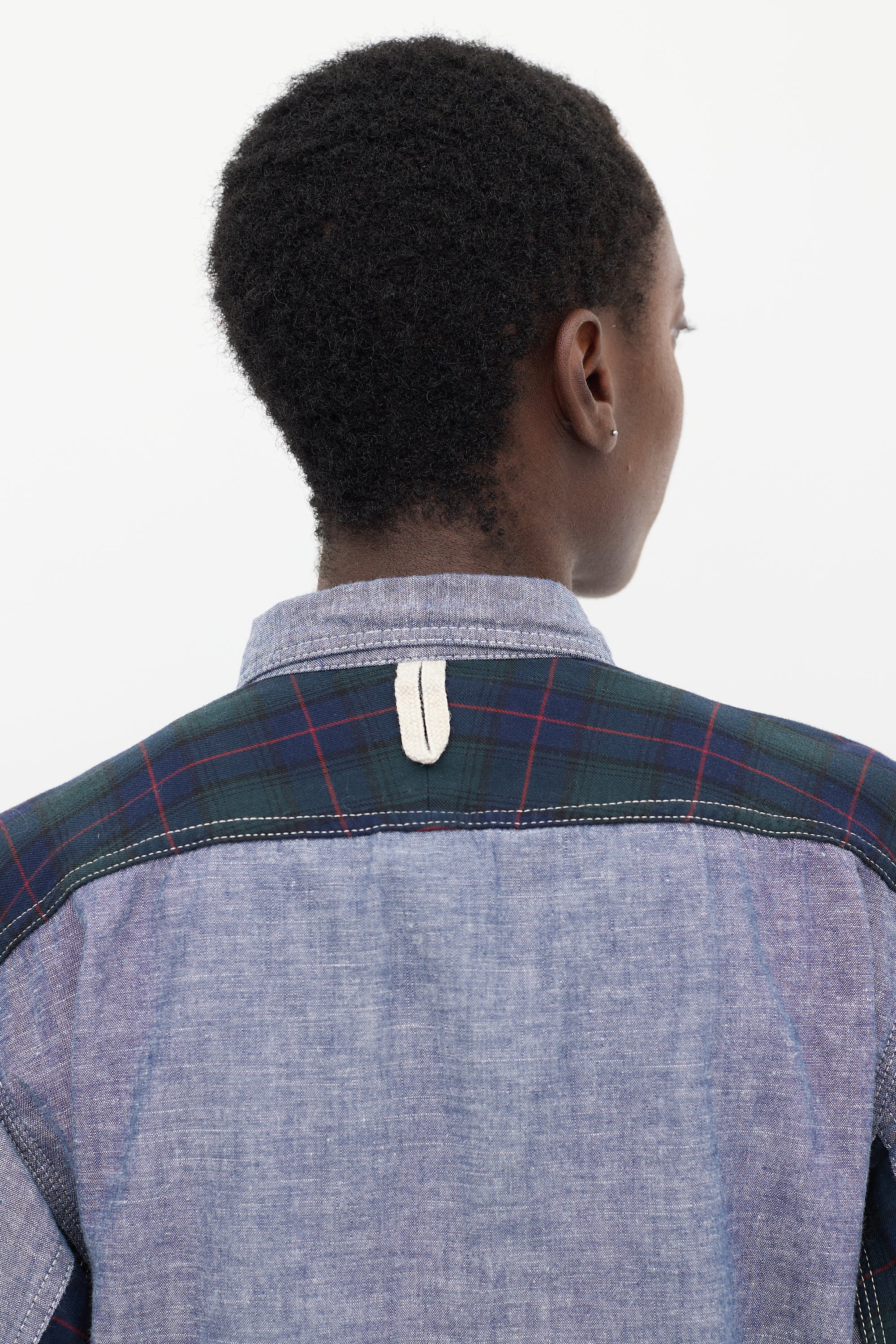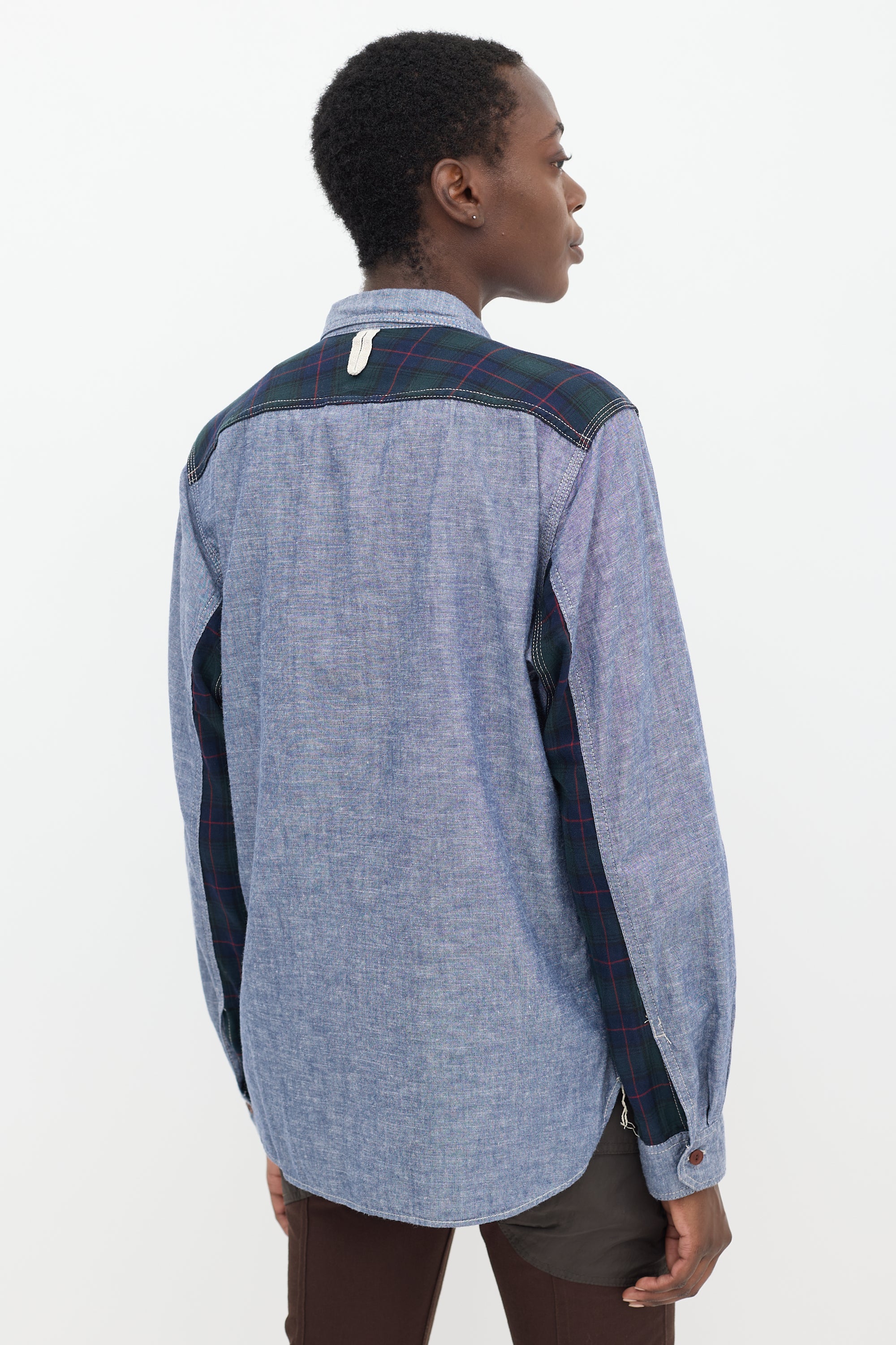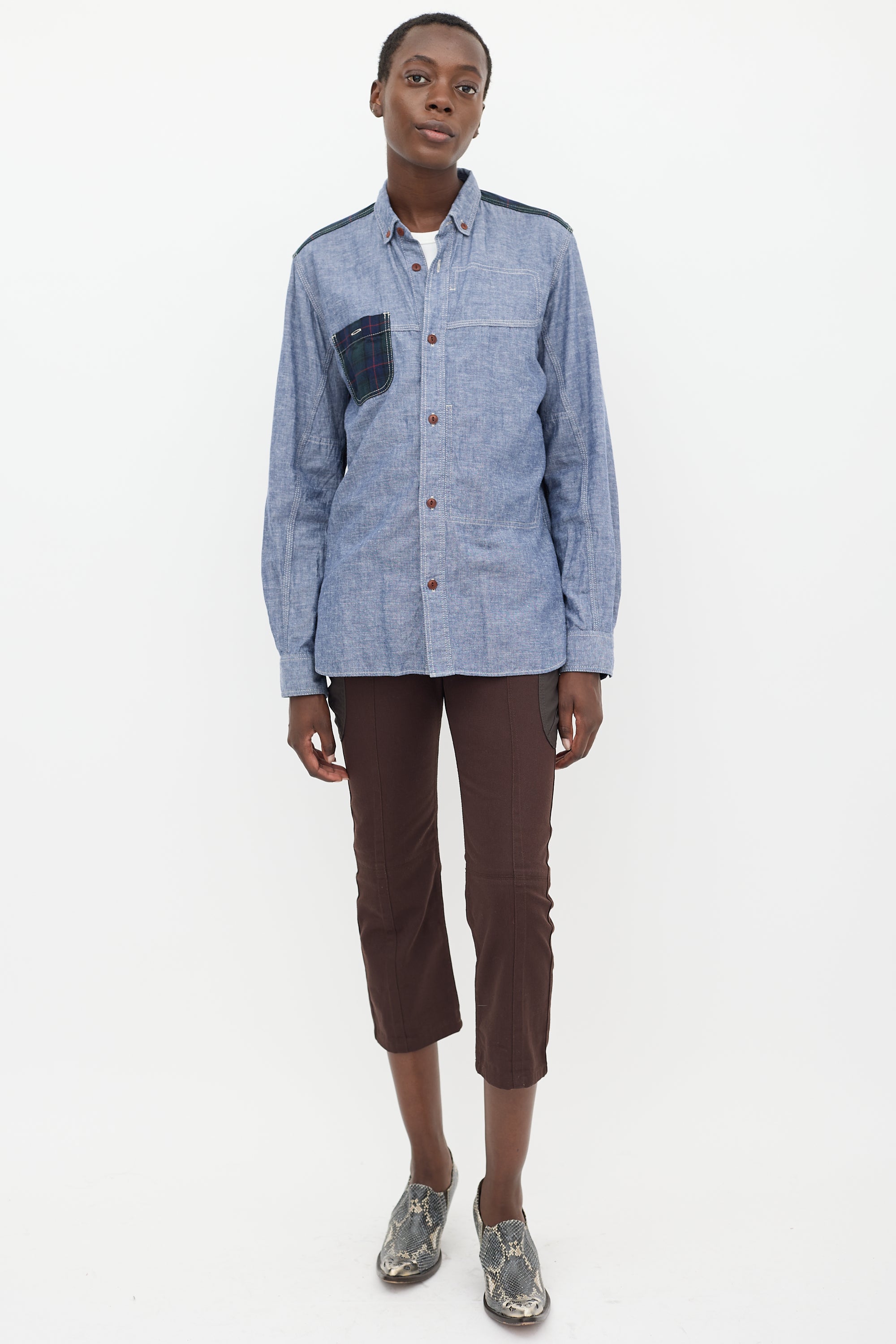 Pre-owned Junya Watanabe blue chambray shirt featuring green plaid trim, pointed button down collar, long sleeves with buttoned cuffs, one patch pocket at chest, and button up closure.