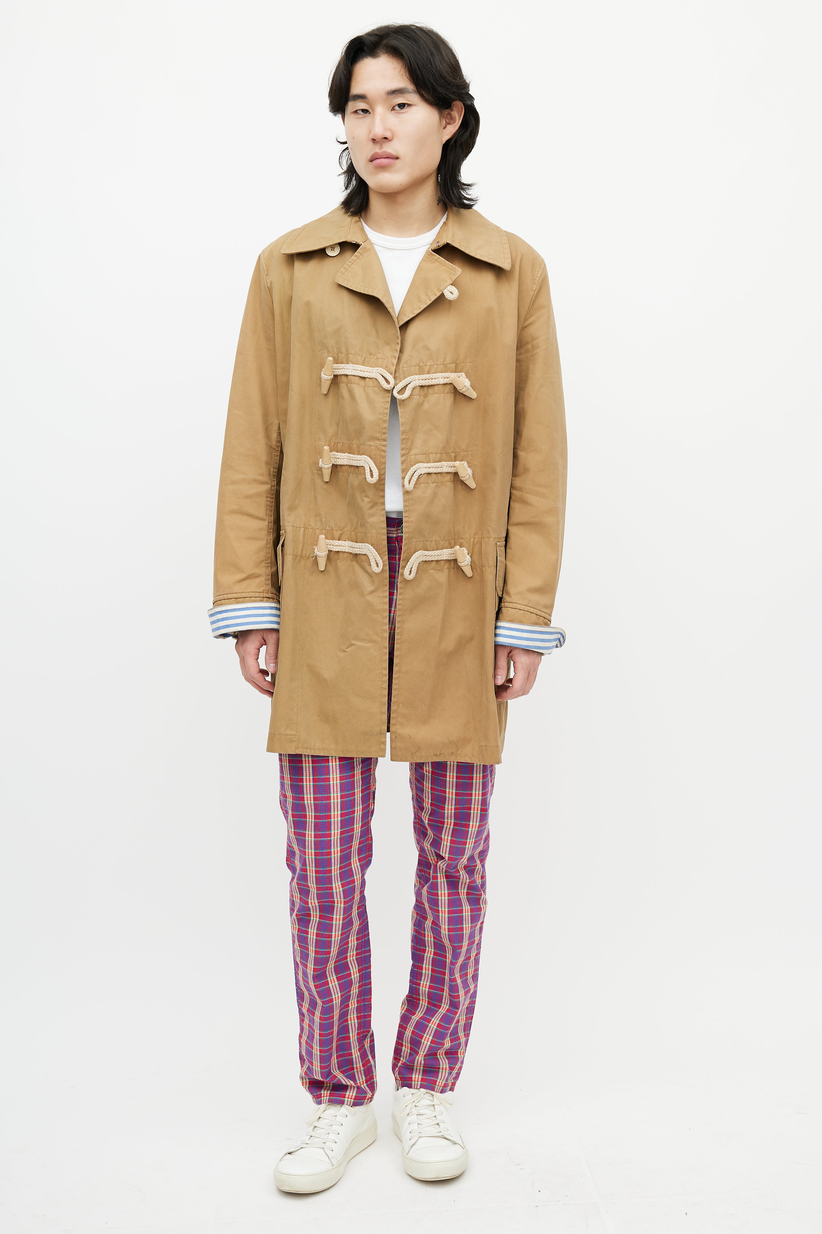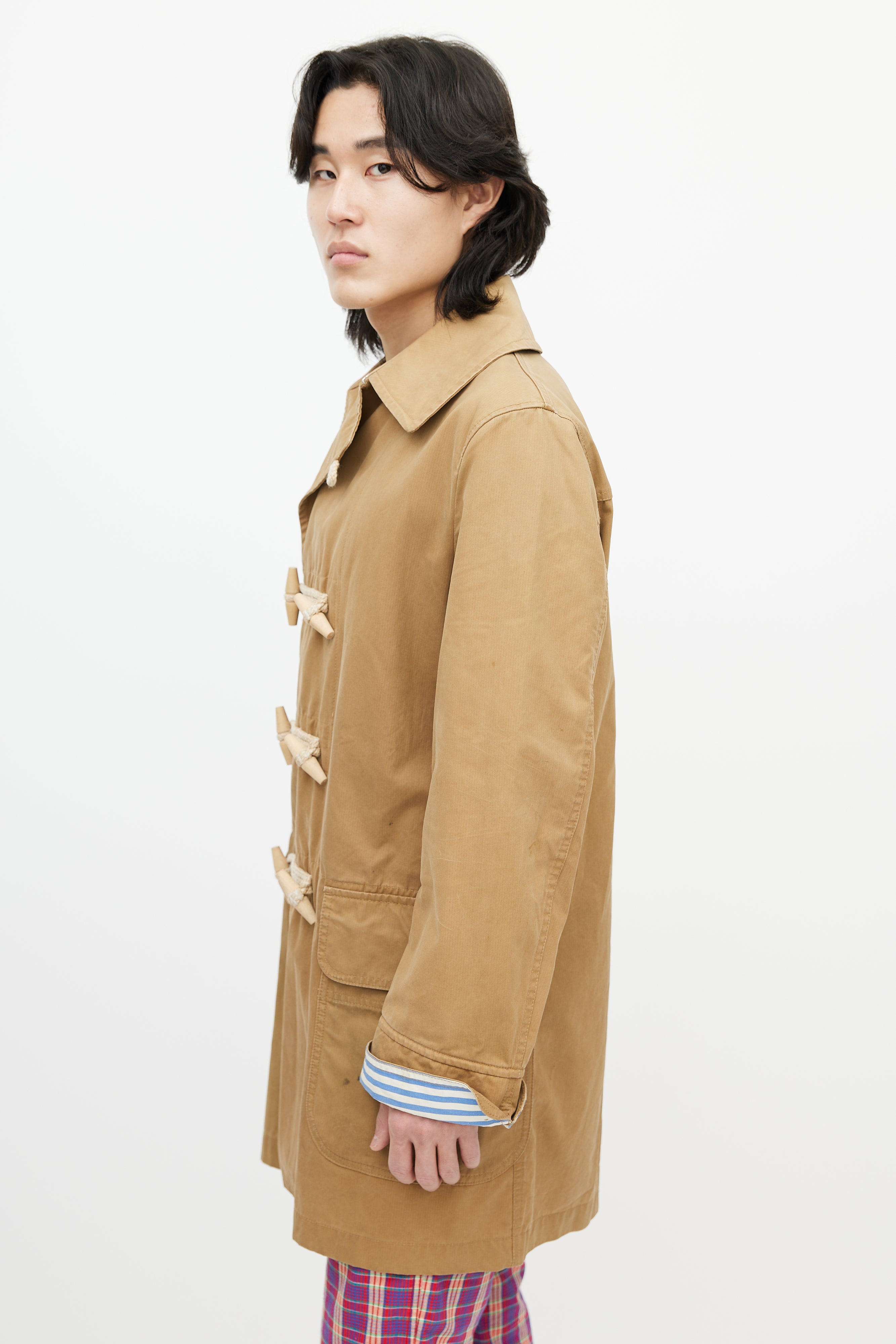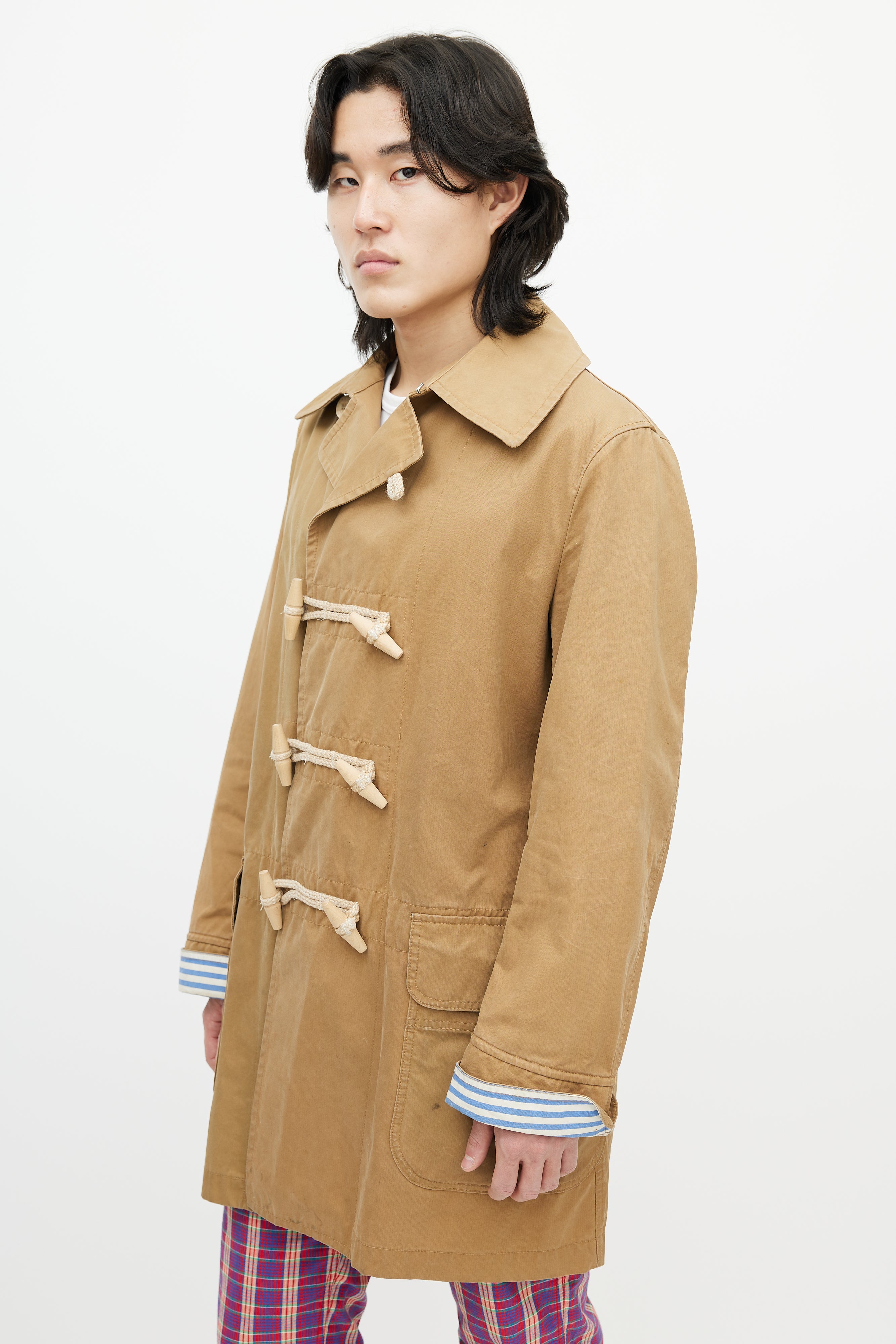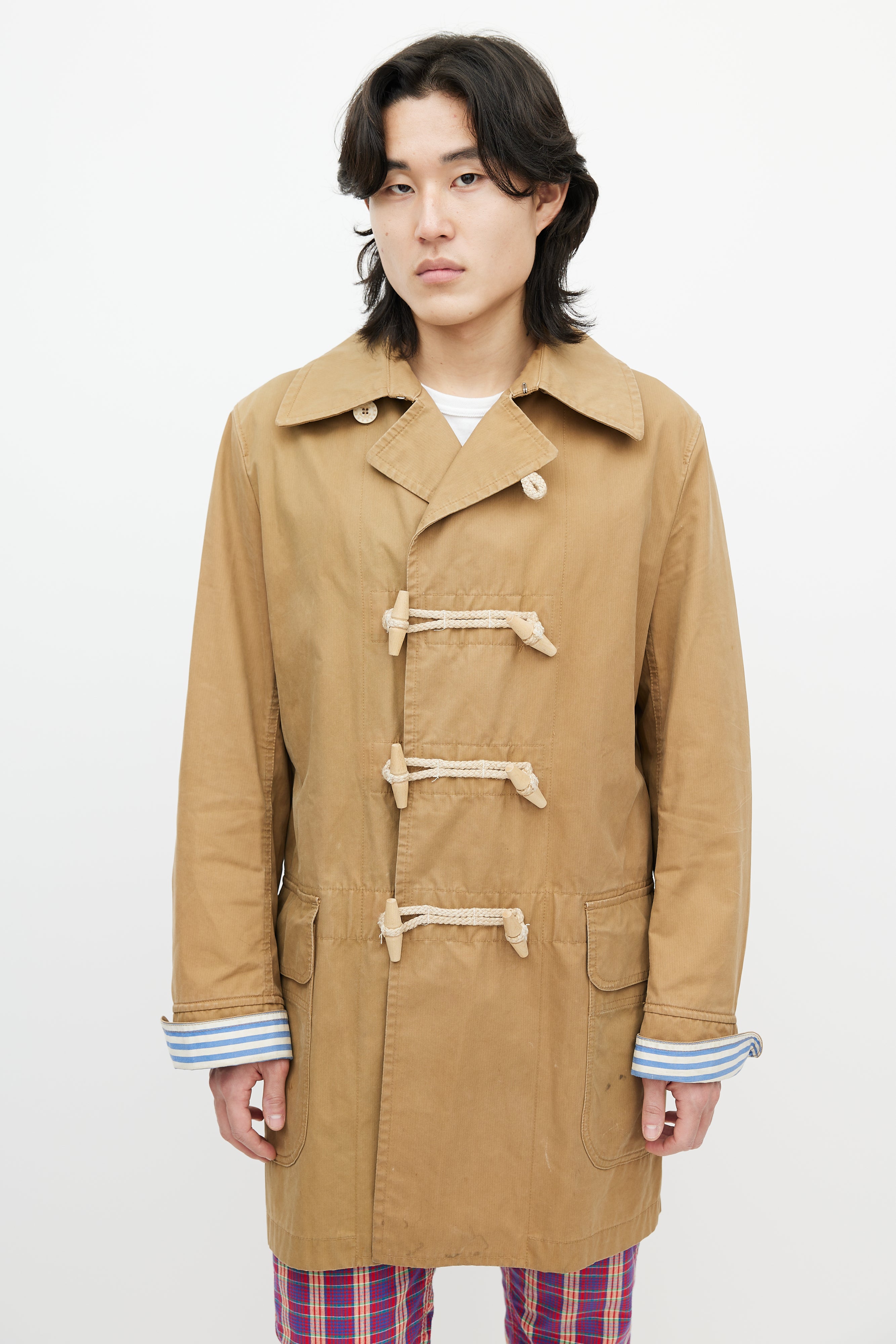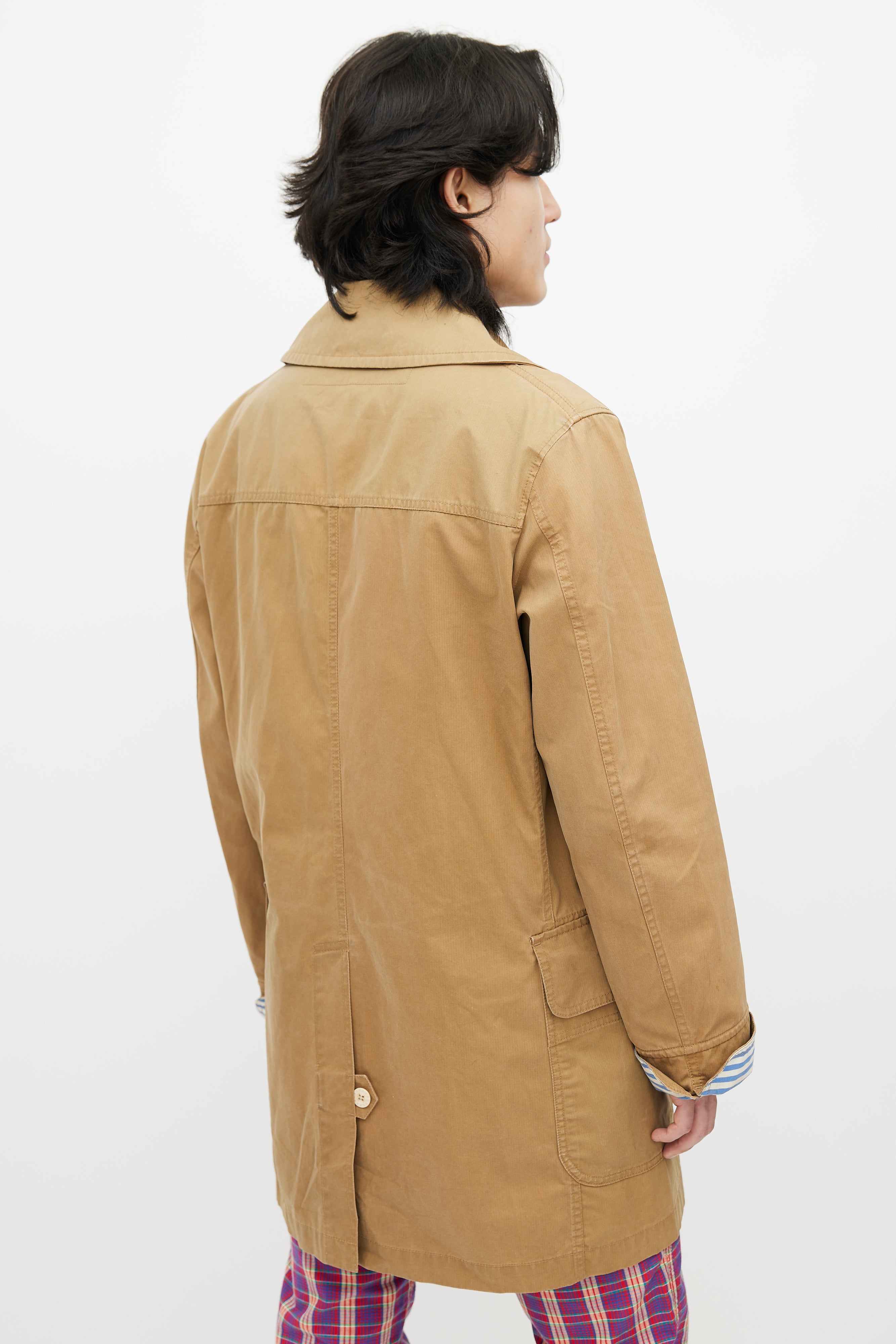 Pre-owned Junya Watanabe brown waxed coat featuring a pointed collar, long sleeves with striped cuffs, two flap pockets at hip, and toggle closure.
