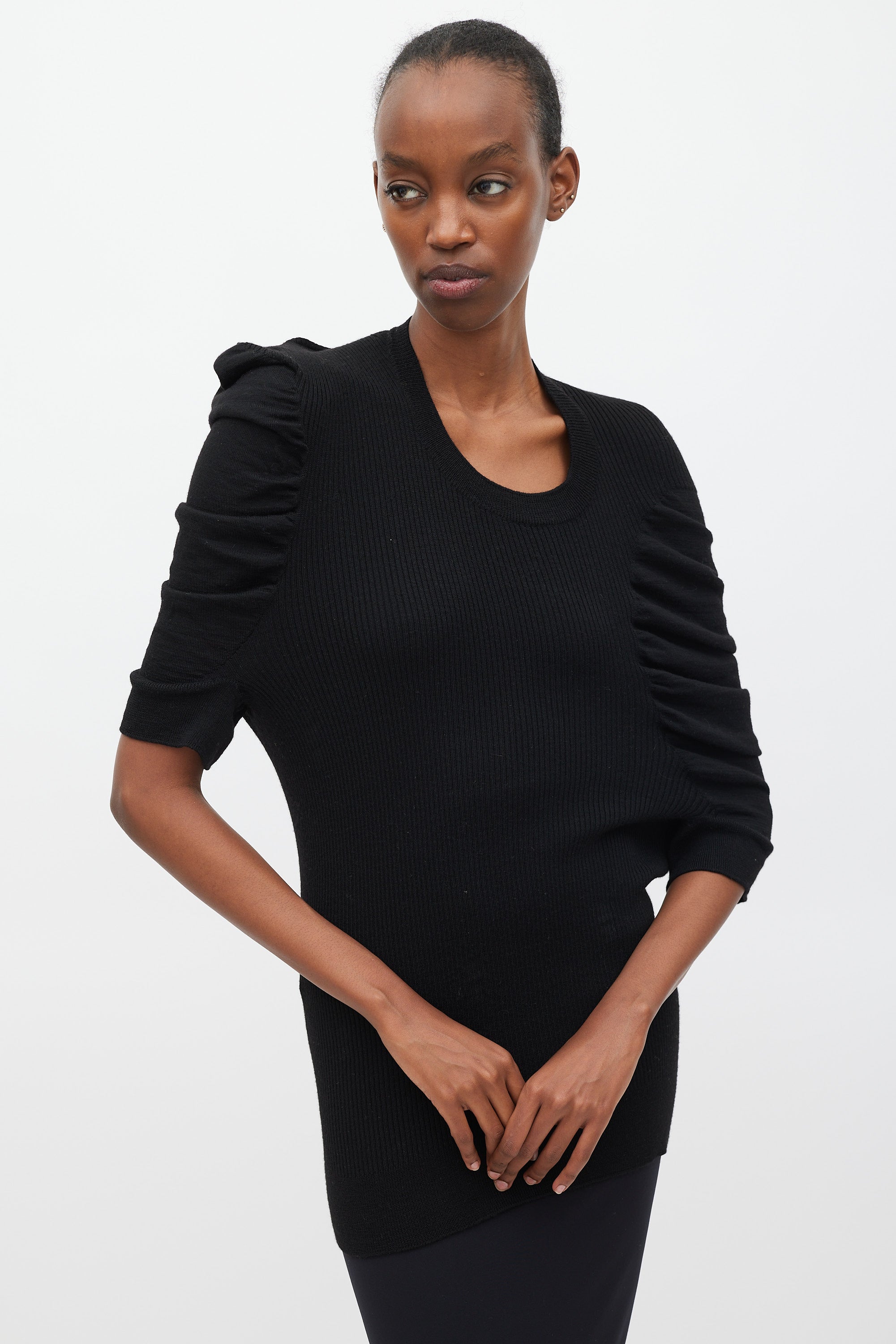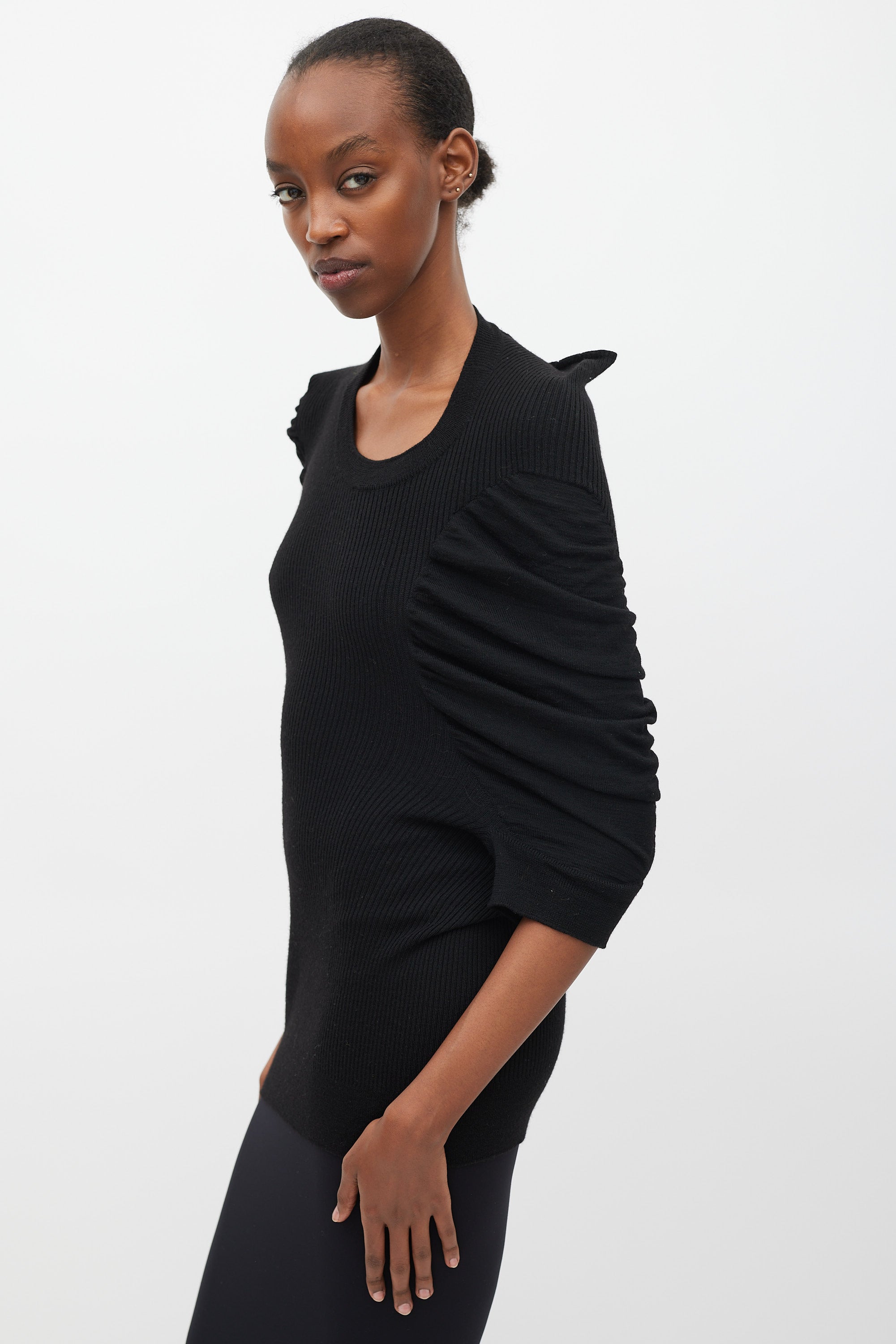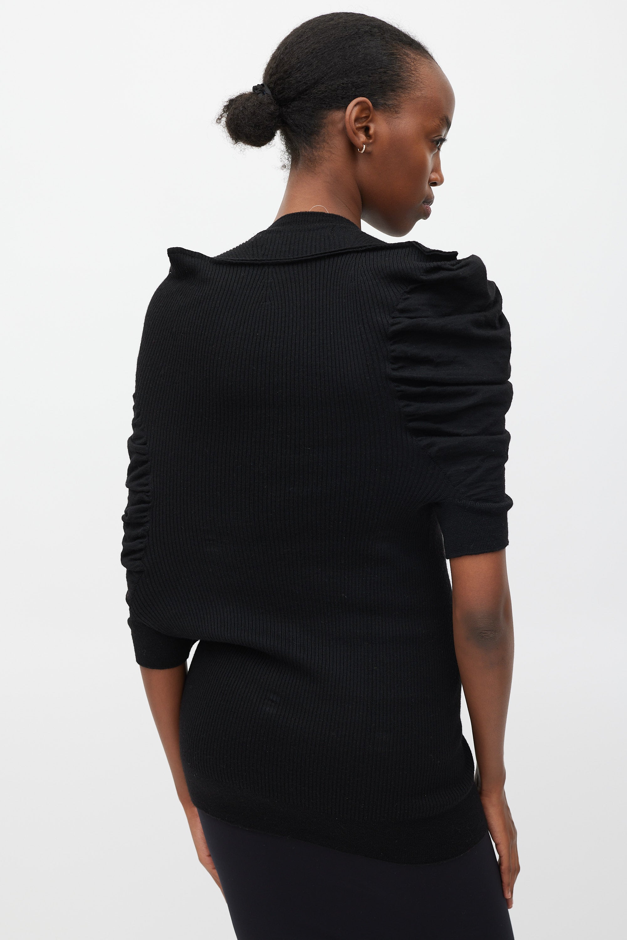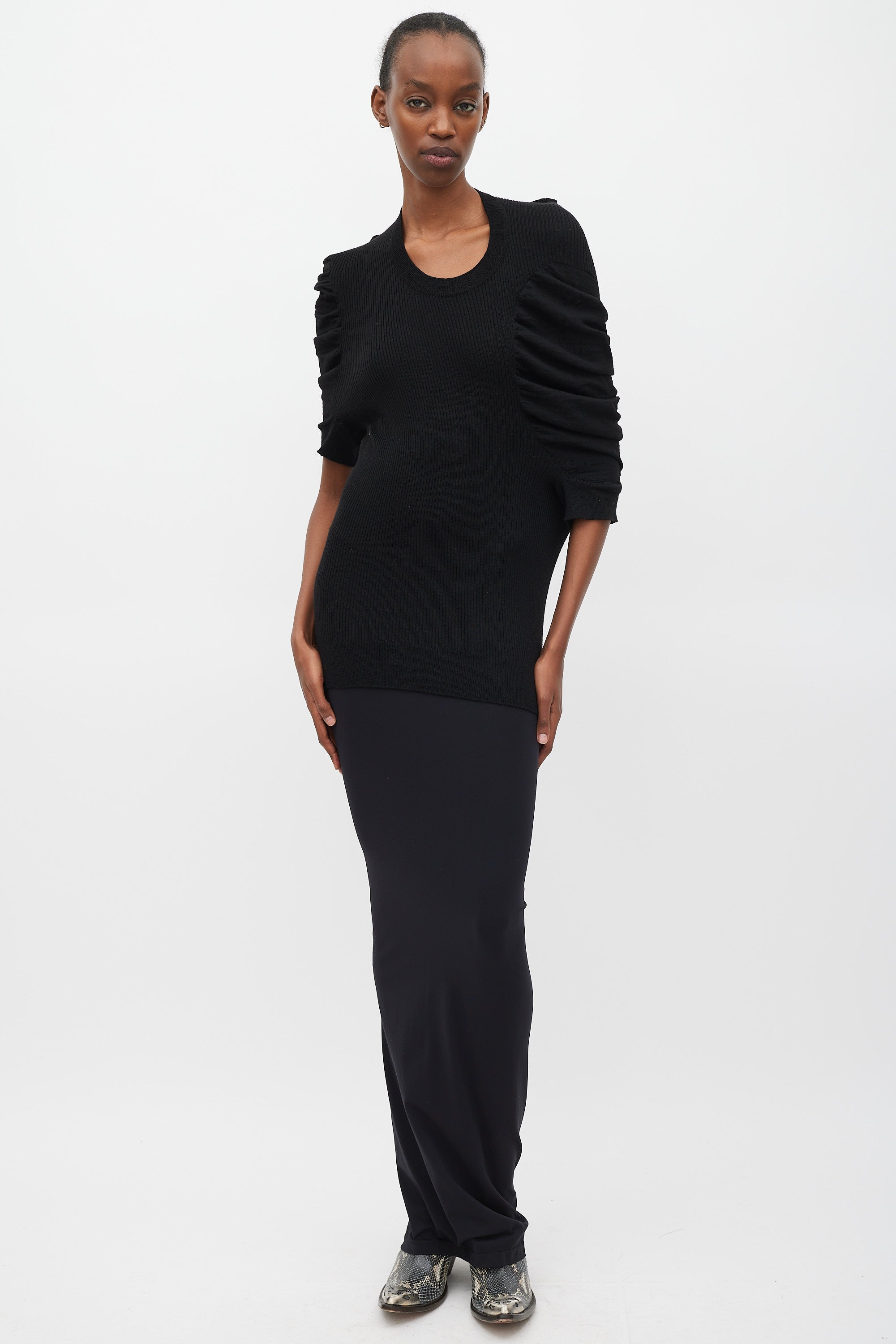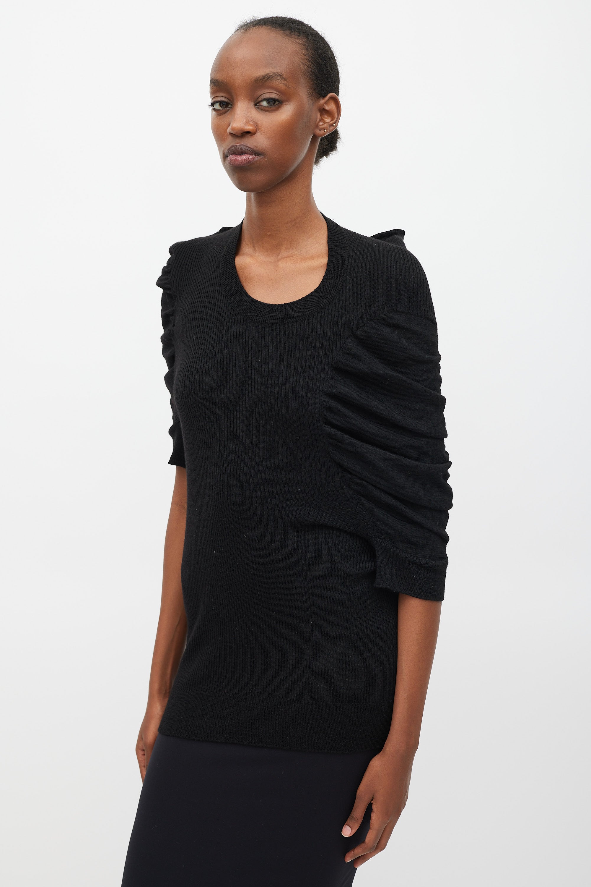 Pre-owned Junya Watanabe Comme des Garçons black ribbed knit top featuring a round neck, asymmetric cut and gathered three quarter sleeves.
