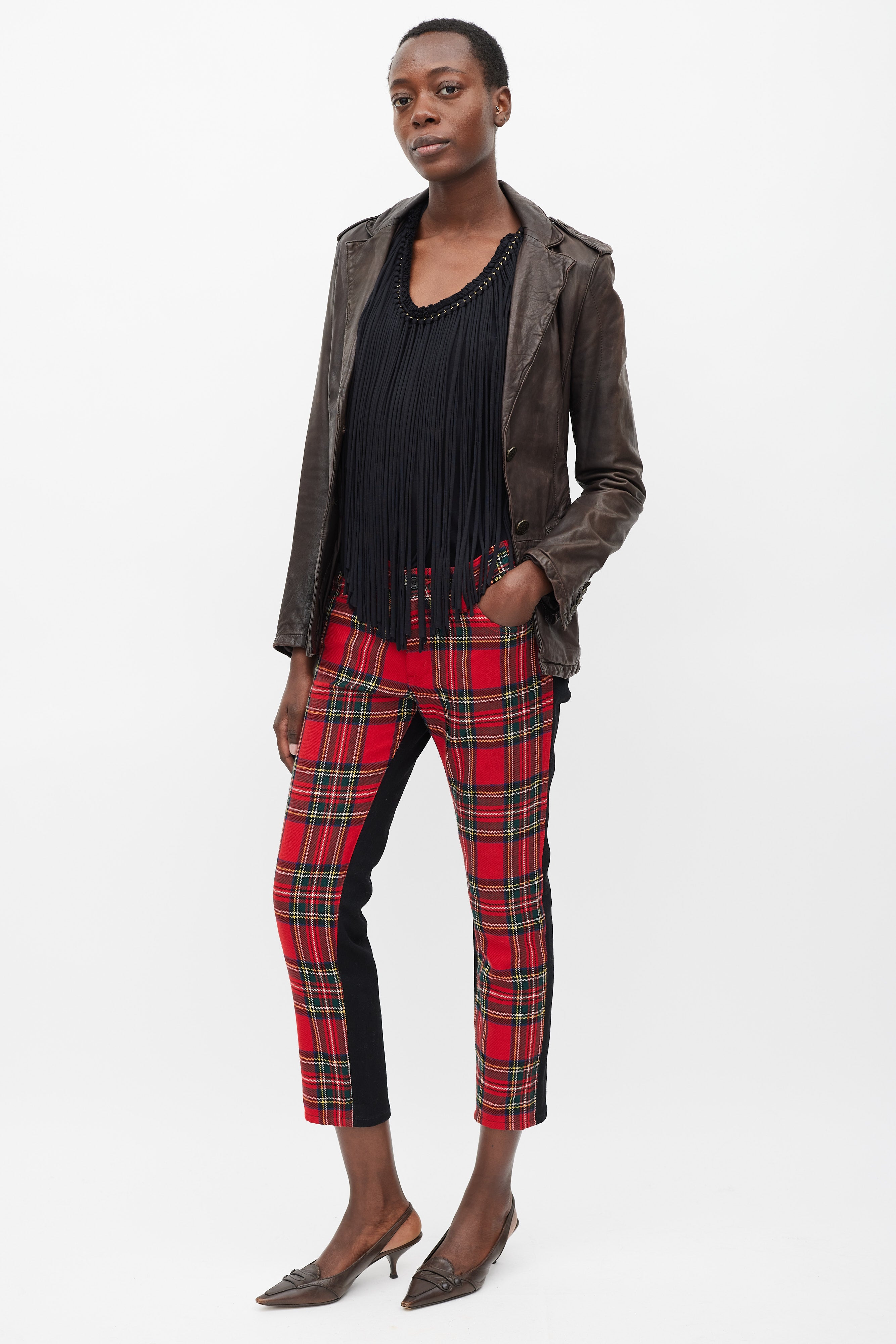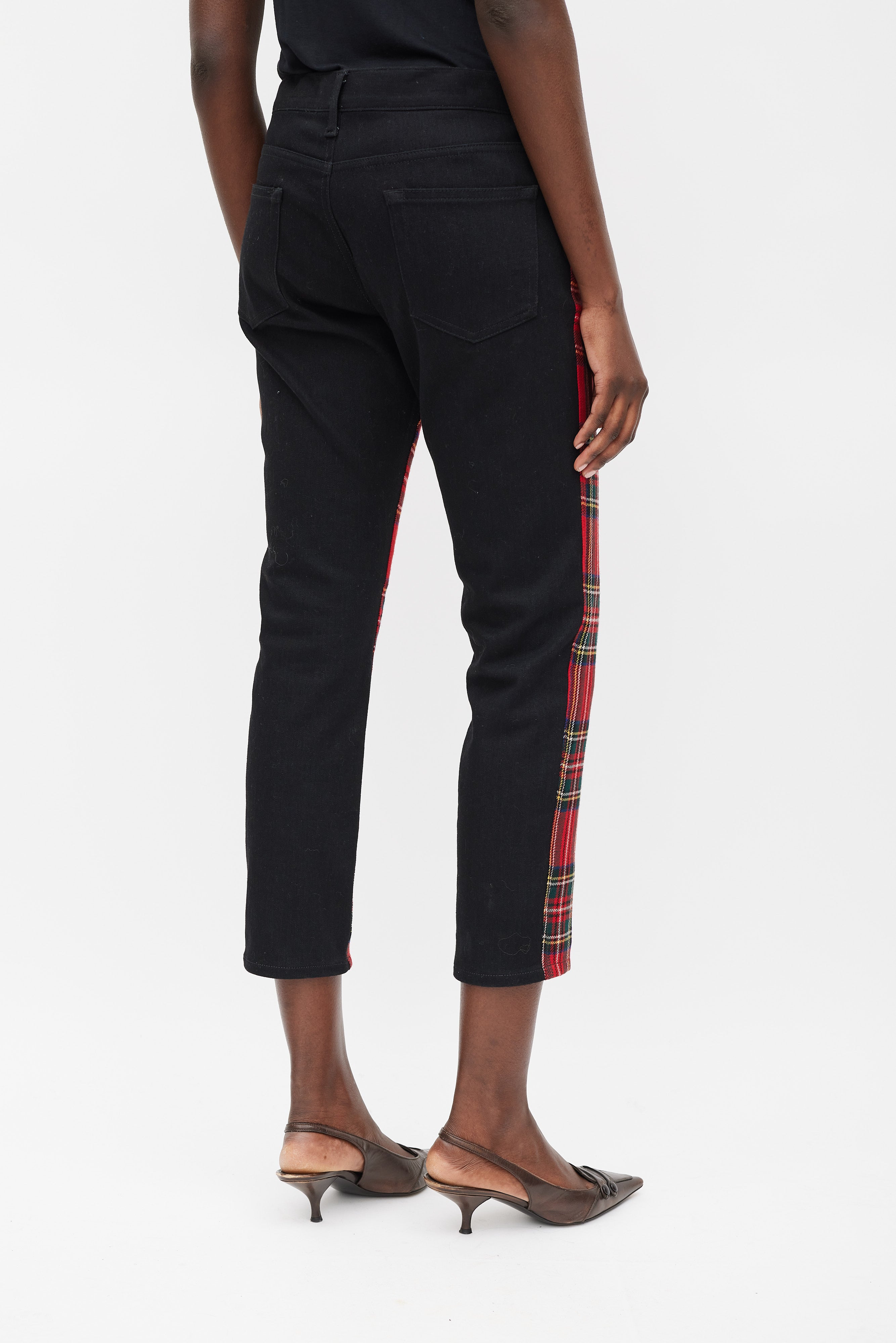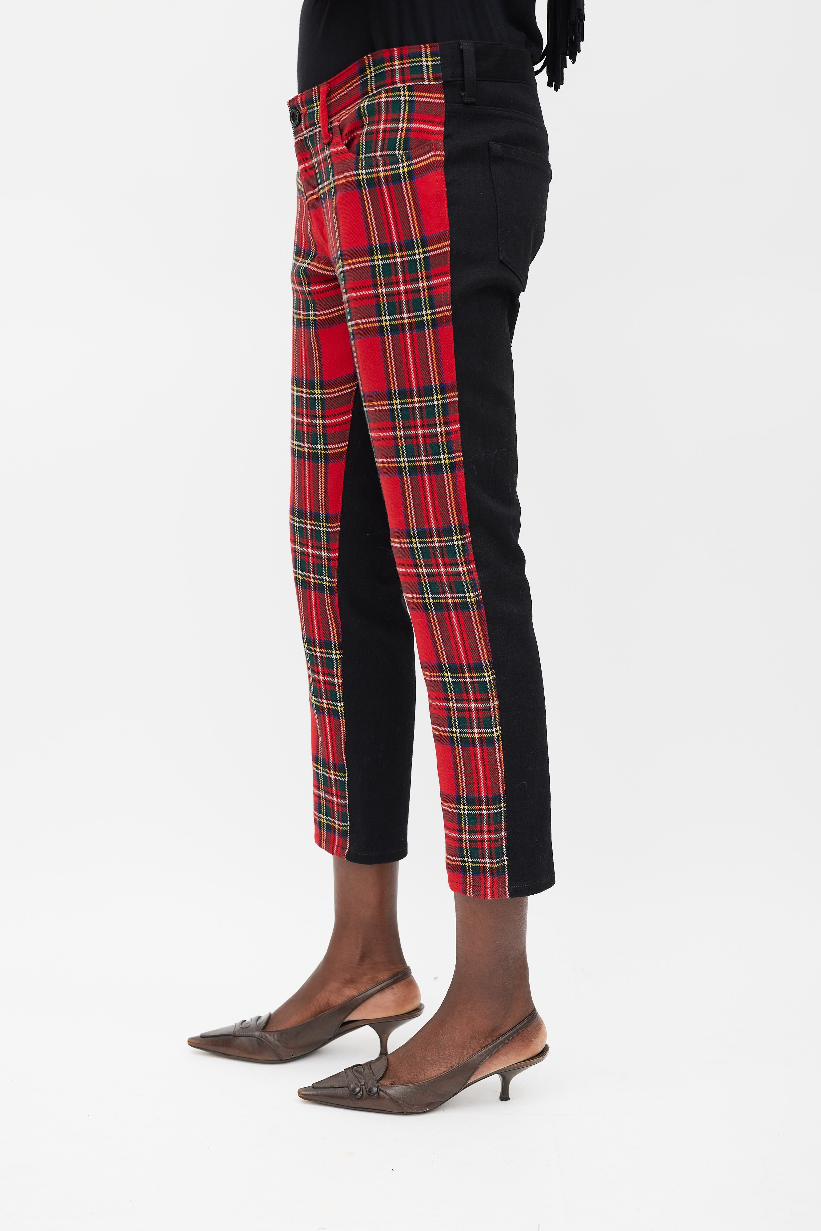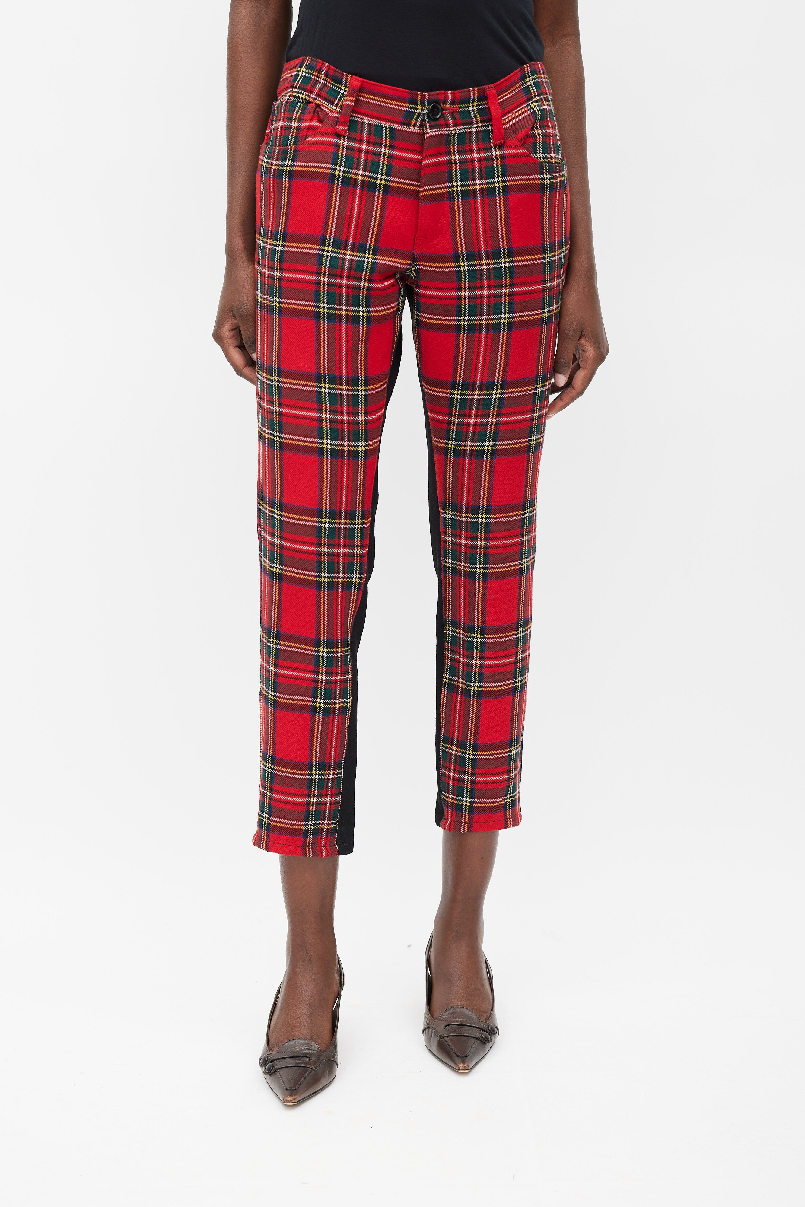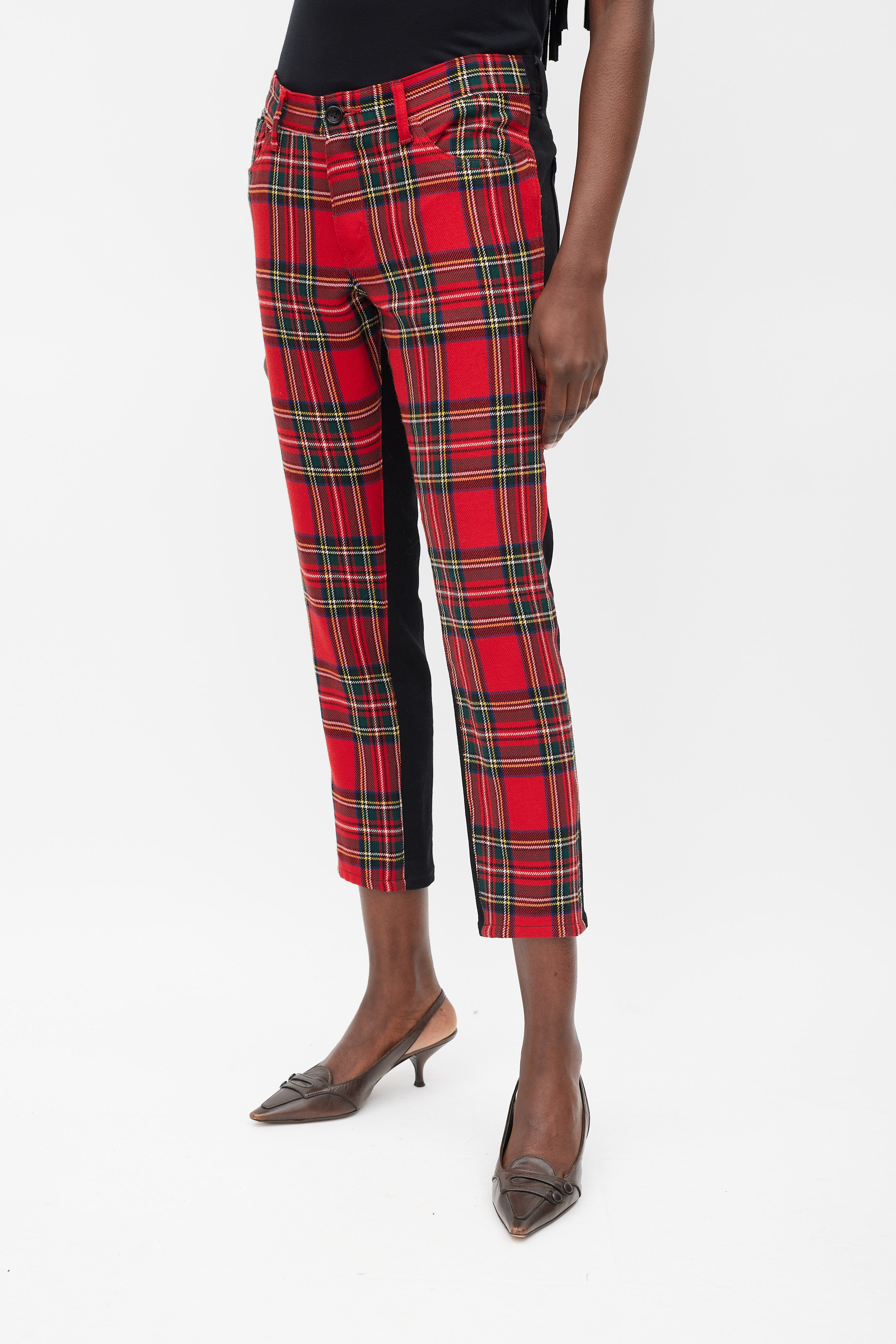 Pre-owned Junya Watanabe X Comme des Garçons trousers featuring a slim fit, red and multicolour plaid front, solid black back, five pocket styling, and front zip closure. Clipped to fit model.