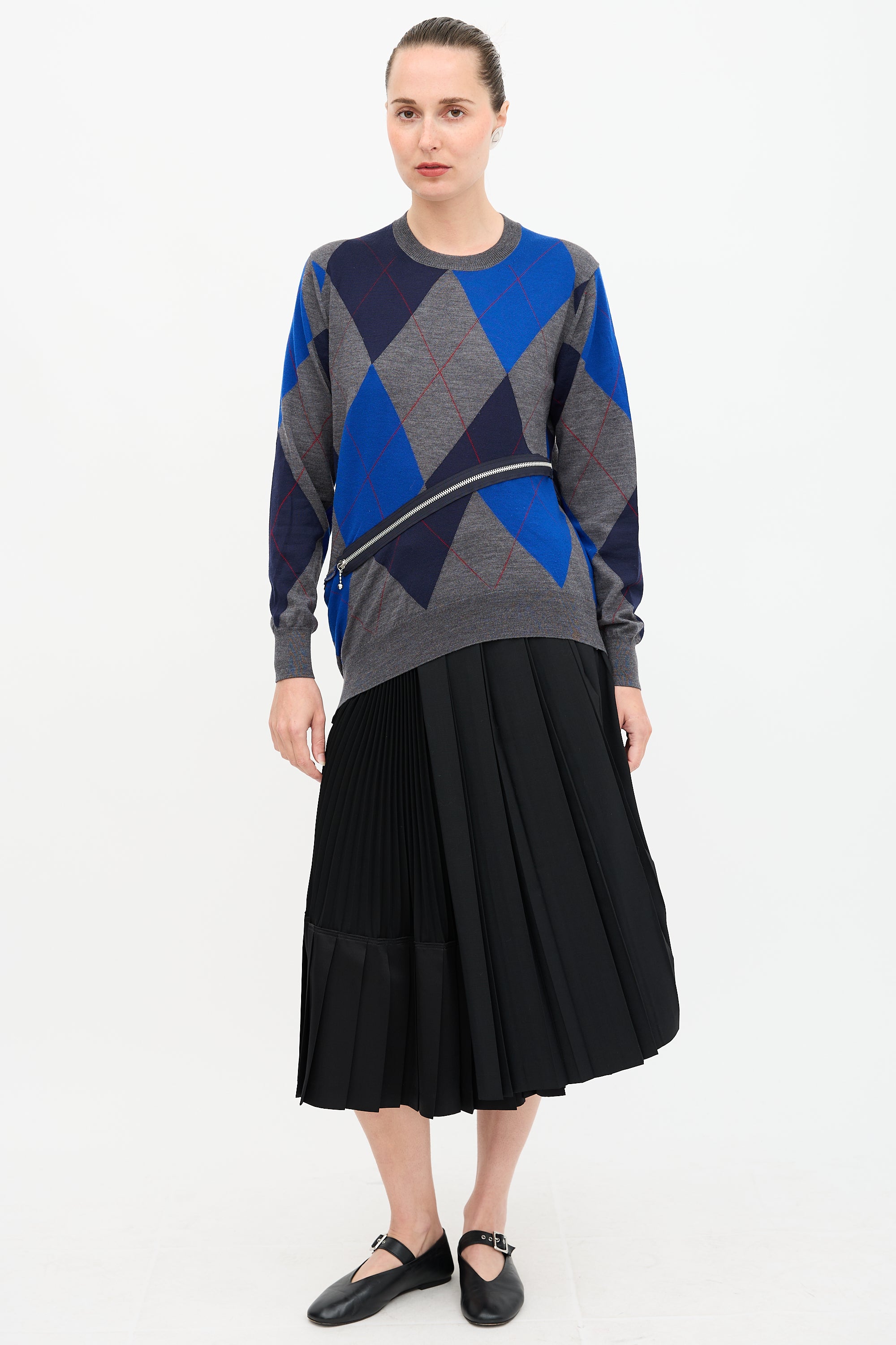 Pre-owned Junya Watanabe wool sweater featuring grey and blue argyle pattern, crew neckline, front zip detail, and hi-low hem.