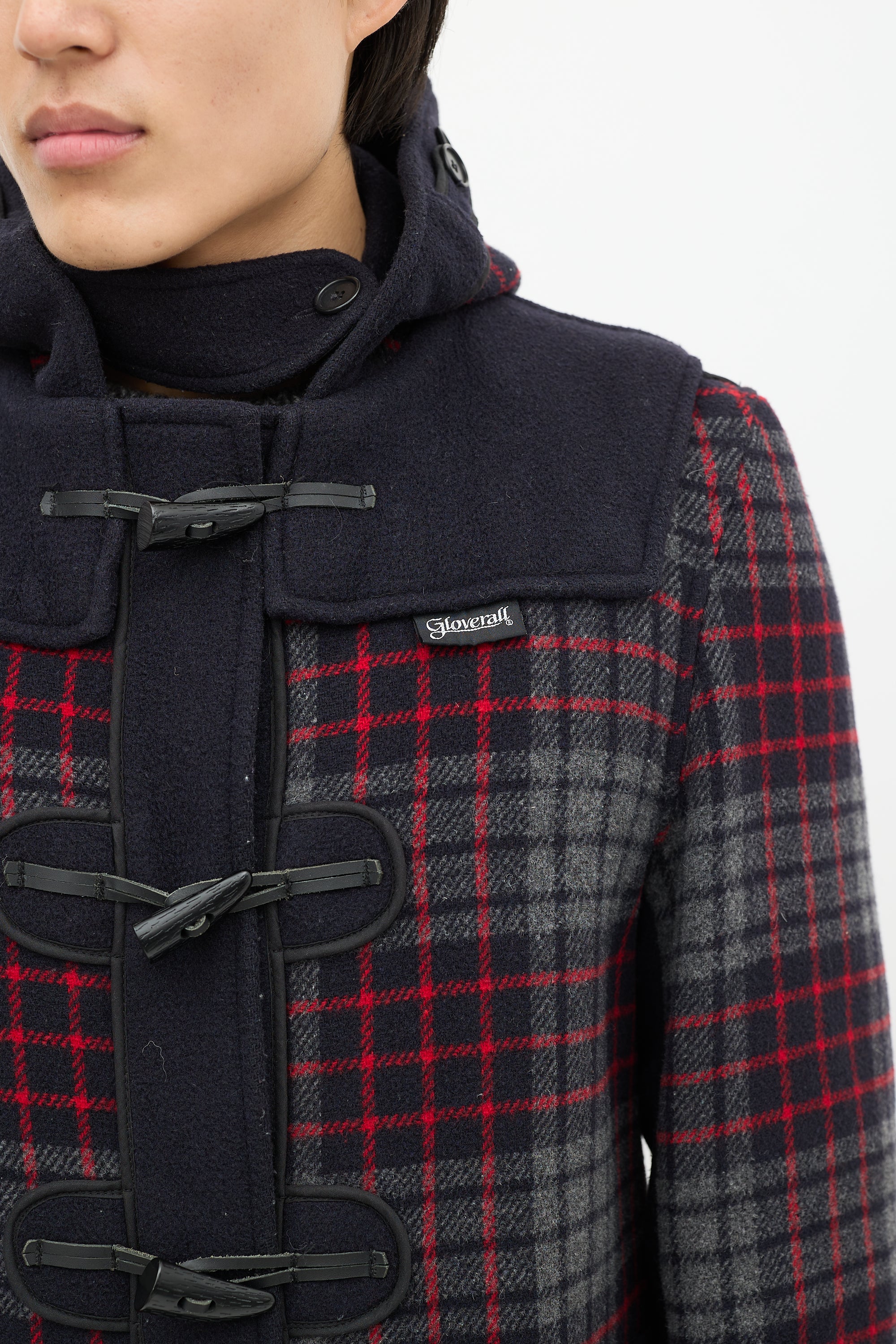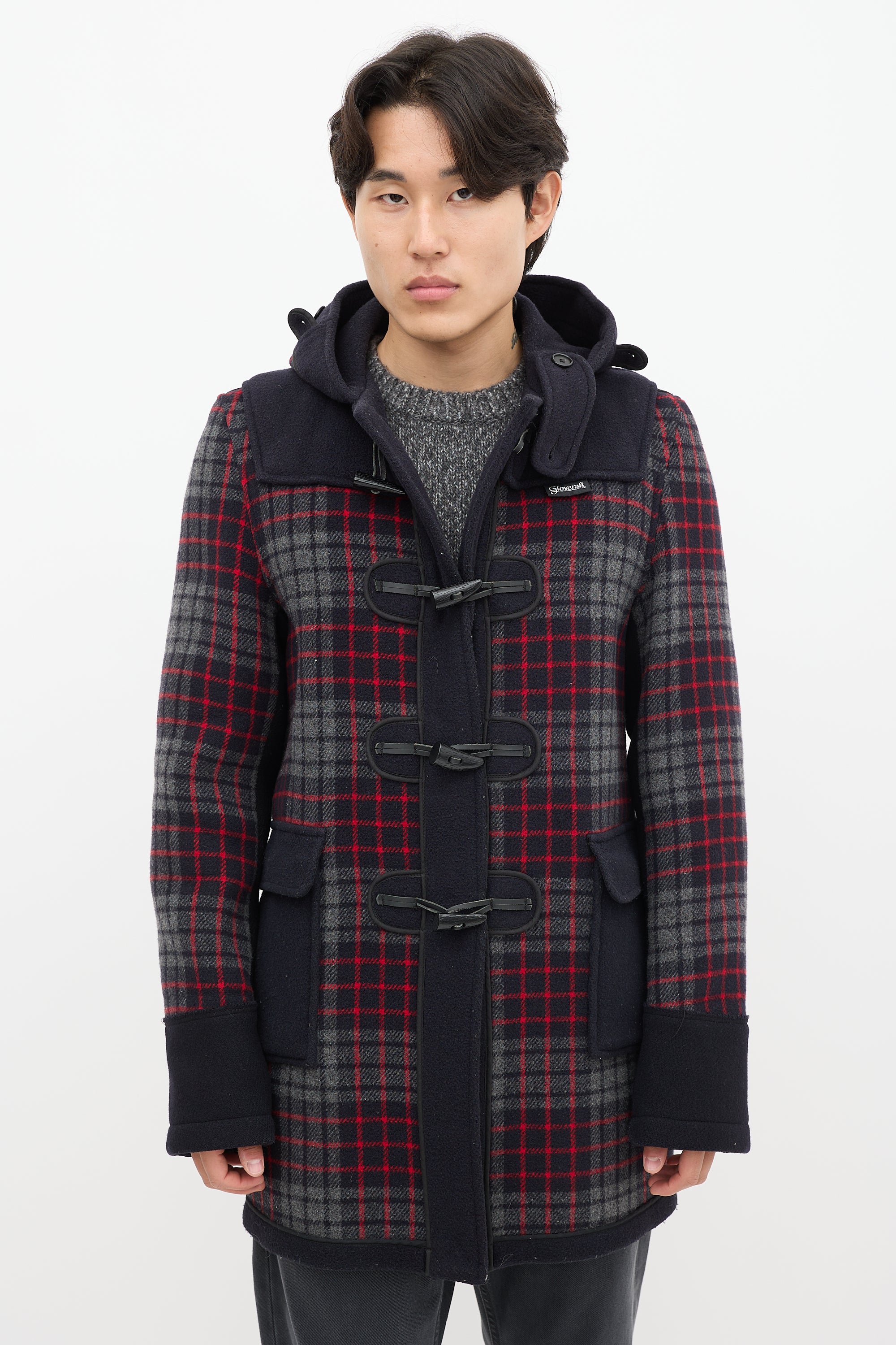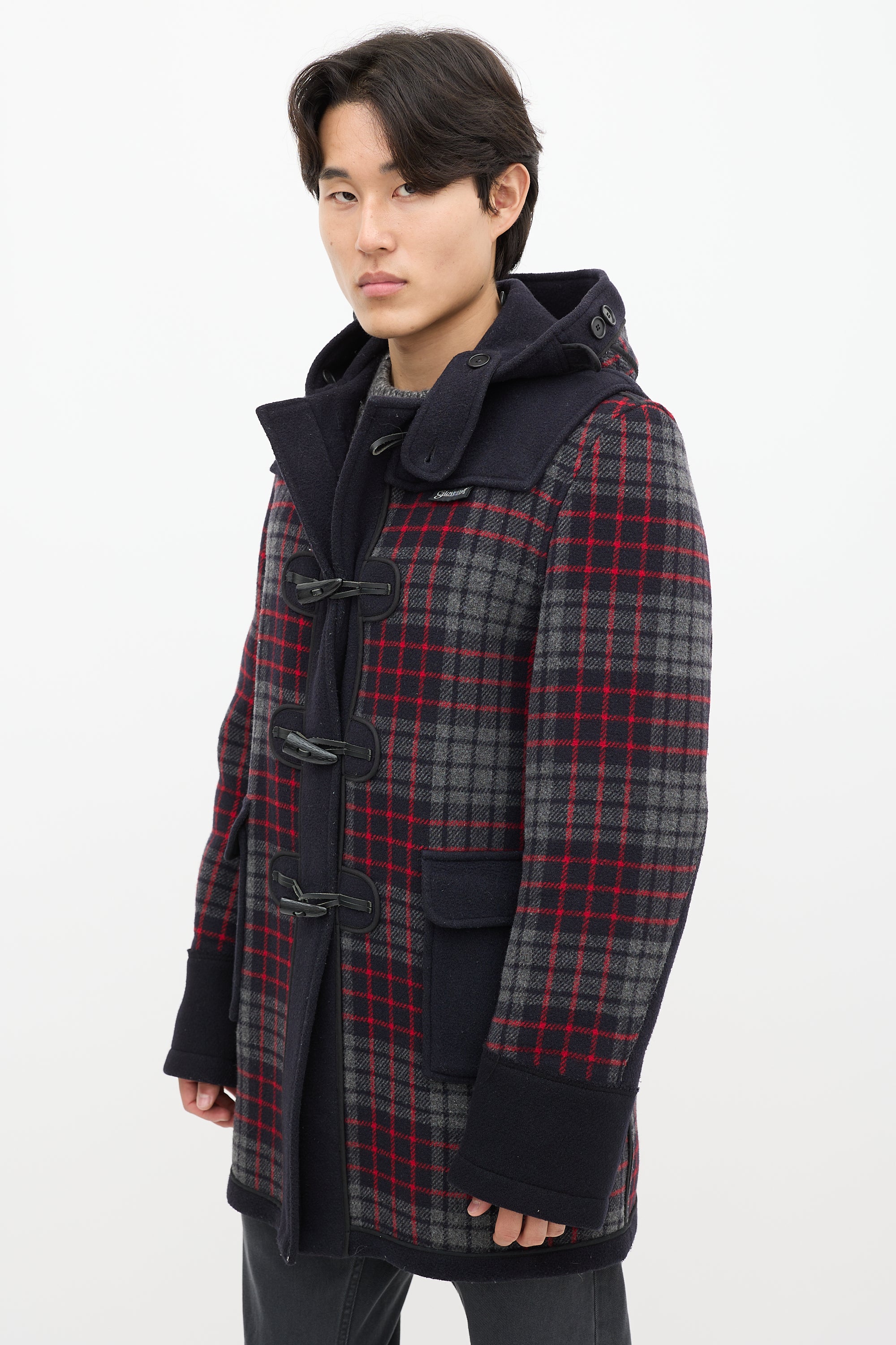Pre-owned Junya Watanabe x Gloverall navy wool coat featuring a multicolour plaid pattern throughout, attached hood, long sleeves, two patch pockets at hip, logo patch at hip, and toggle closure.