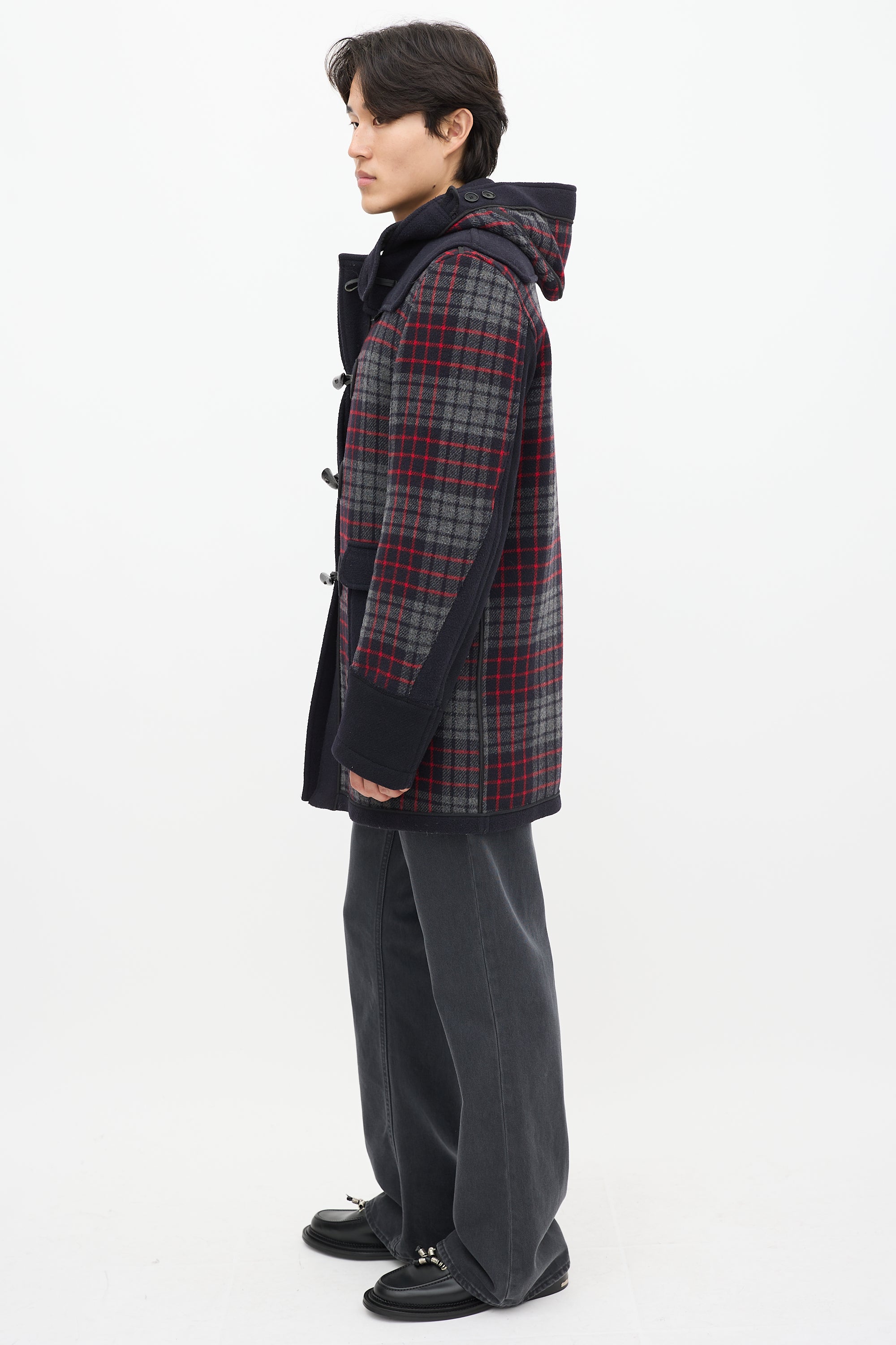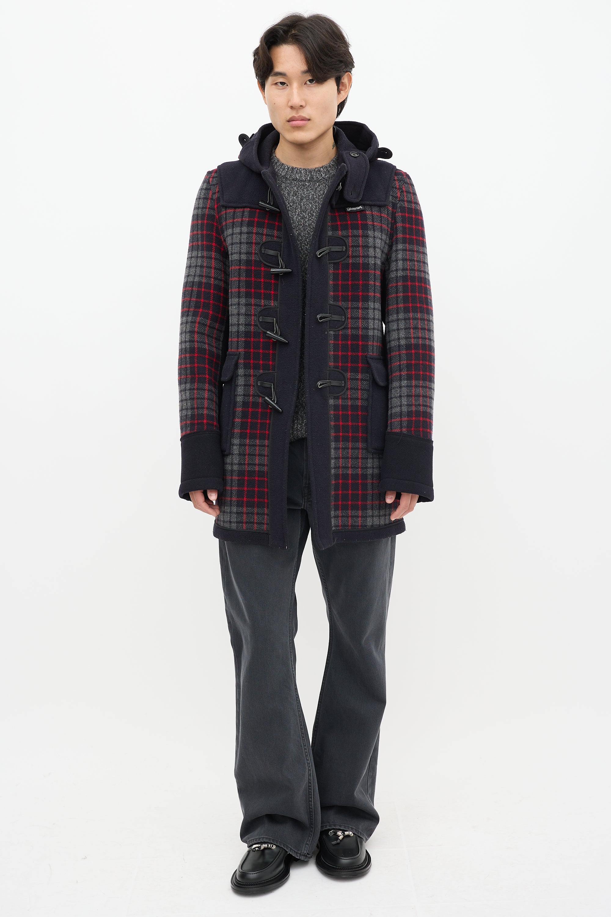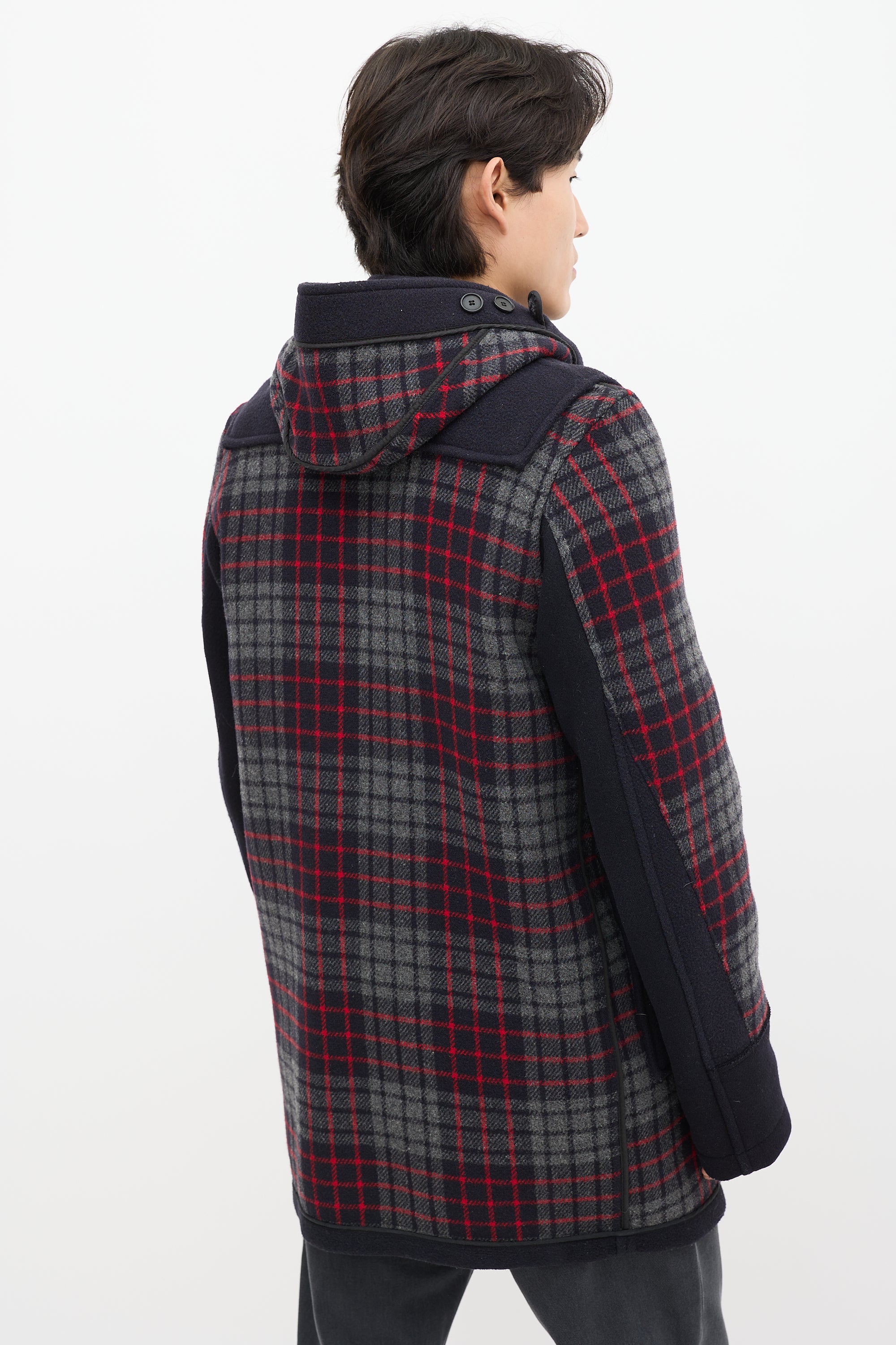 Pre-owned Junya Watanabe x Gloverall navy wool coat featuring a multicolour plaid pattern throughout, attached hood, long sleeves, two patch pockets at hip, logo patch at hip, and toggle closure.