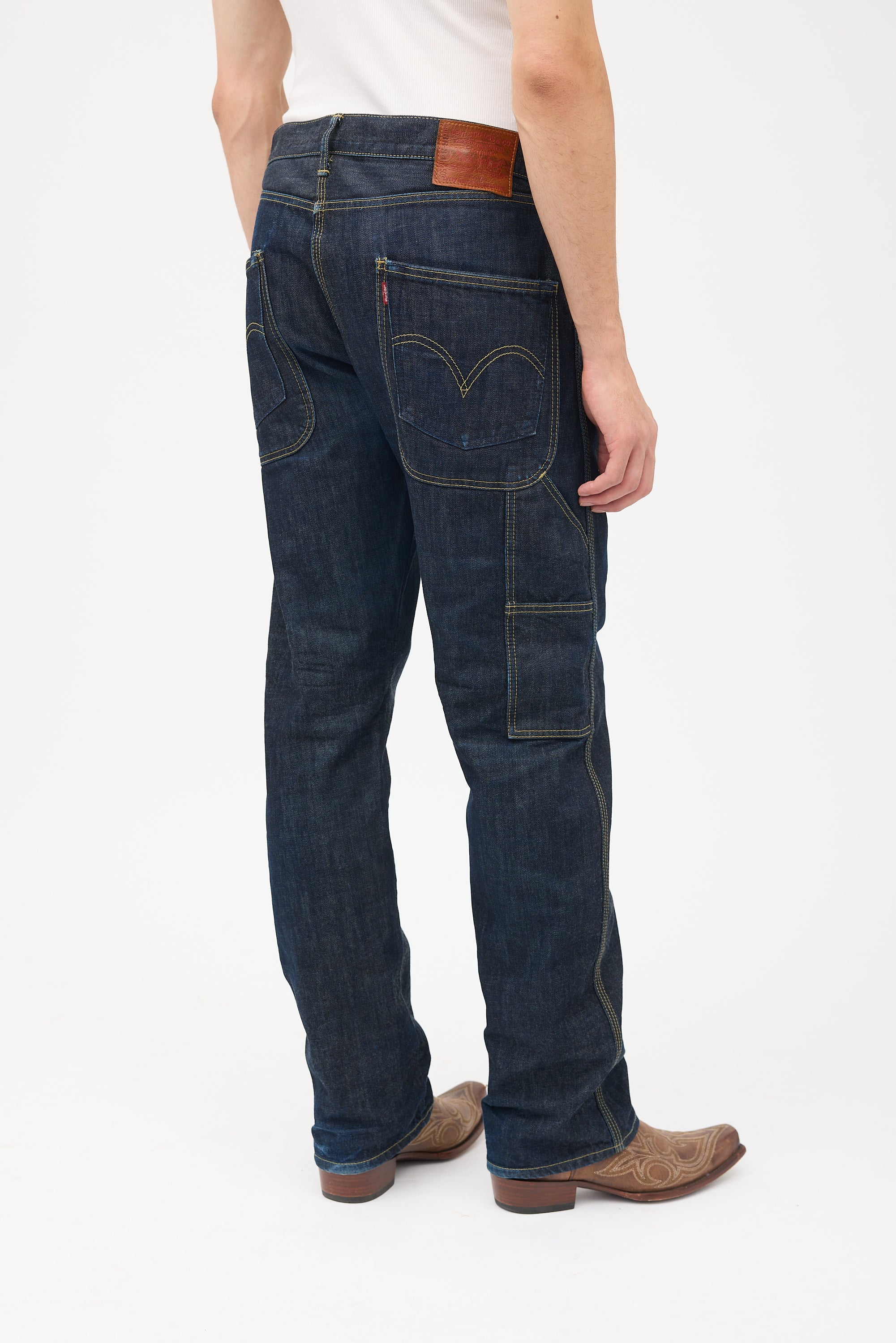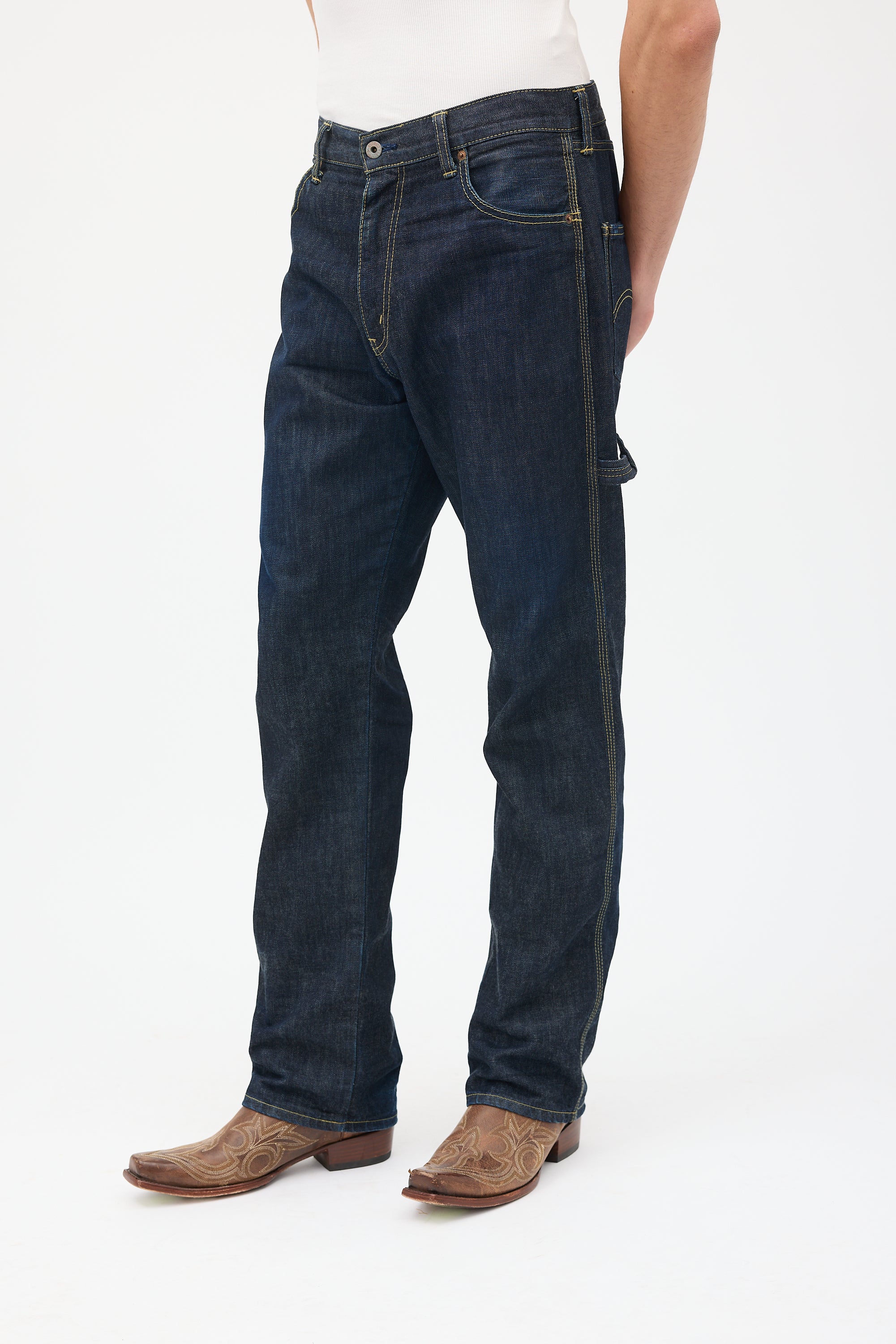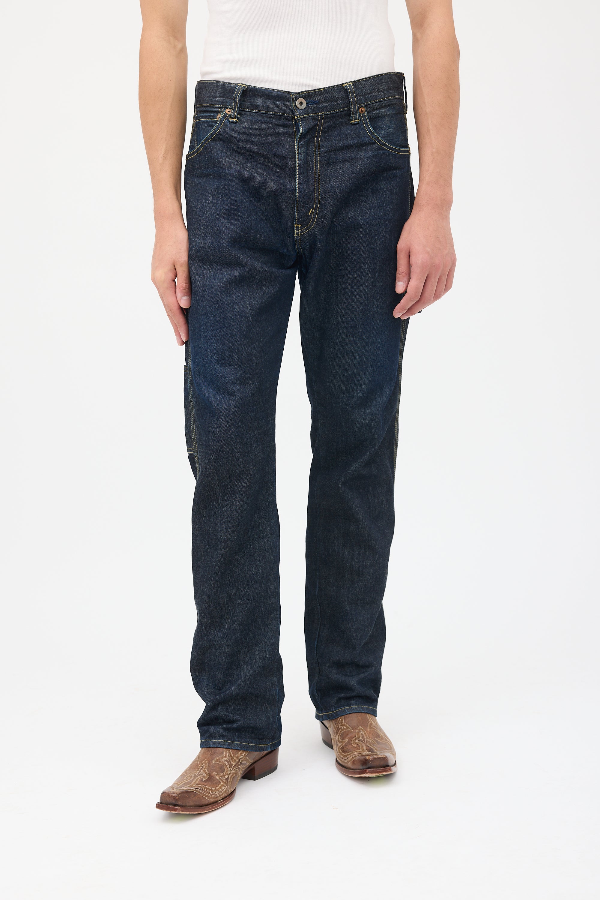 Pre-owned Junya Watanabe x Levi's dark wash jeans featuring belt loops, zip fly, five pocket styling, jacron patch at back, loop at left hip, and two slip pockets at right hip. Clipped to fit model.
