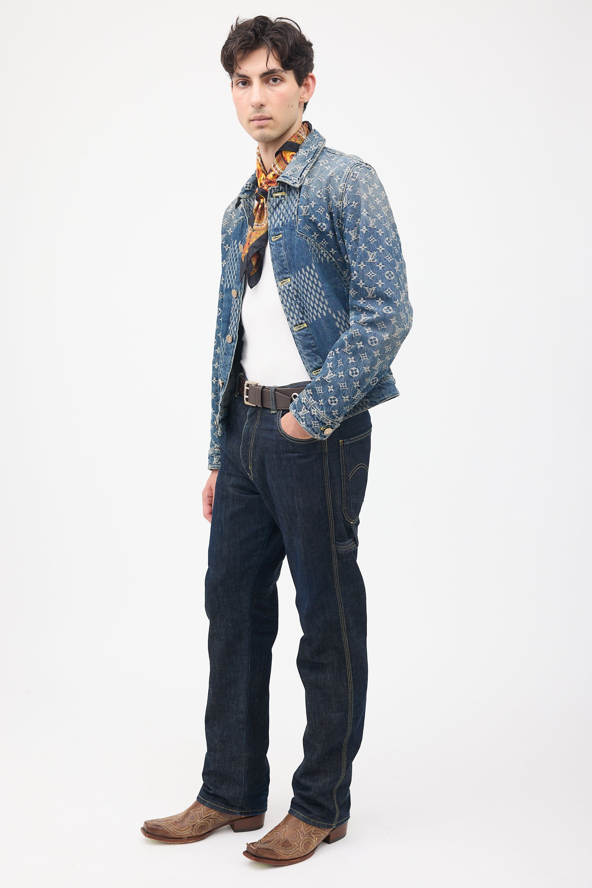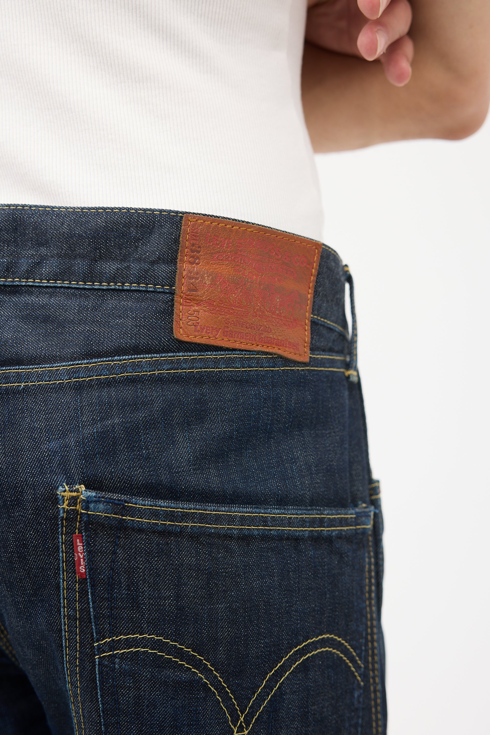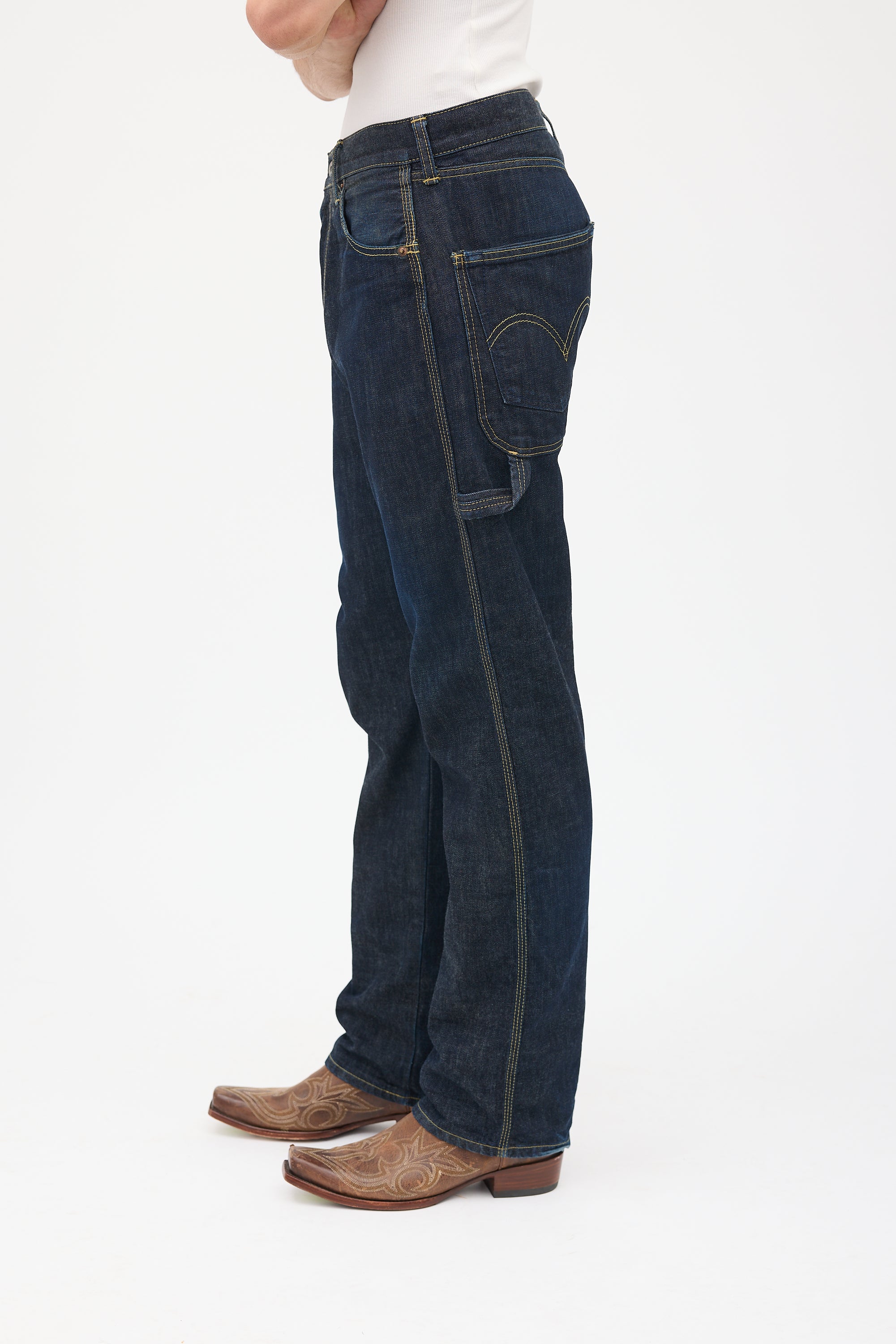 Pre-owned Junya Watanabe x Levi's dark wash jeans featuring belt loops, zip fly, five pocket styling, jacron patch at back, loop at left hip, and two slip pockets at right hip. Clipped to fit model.