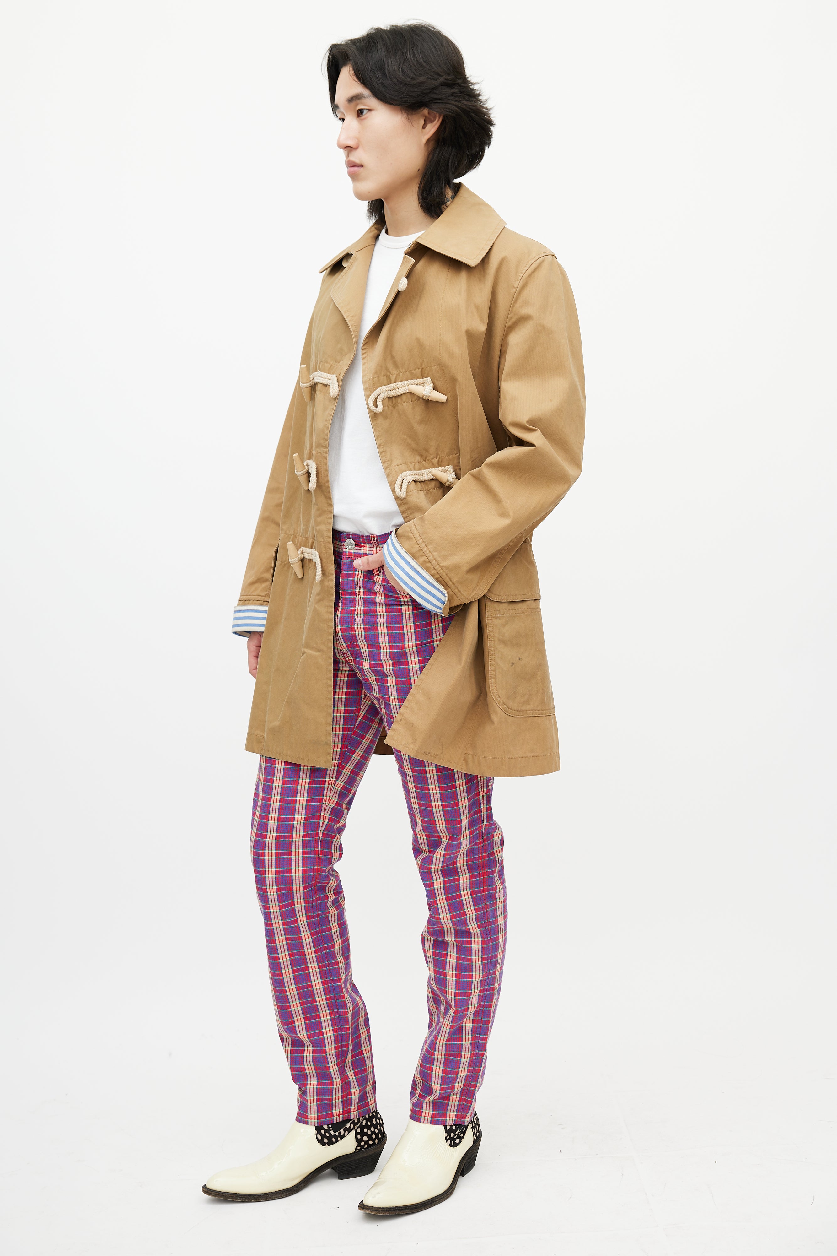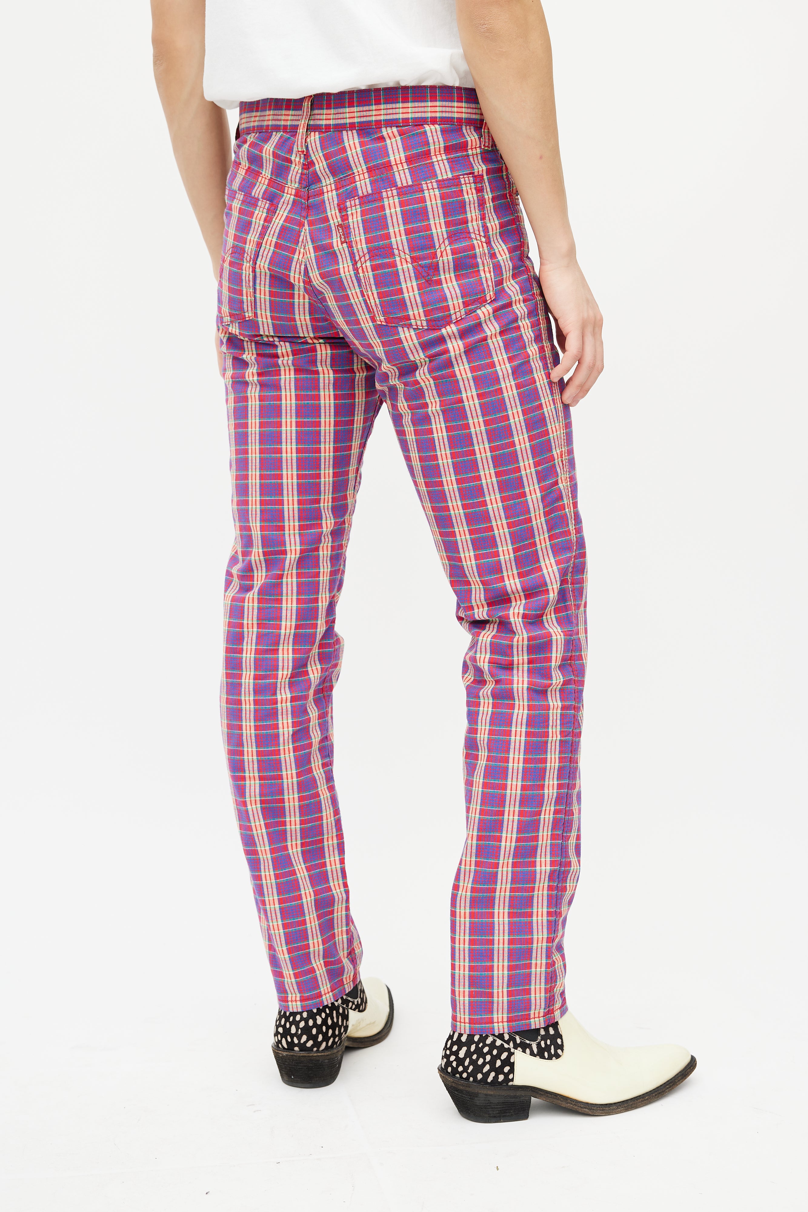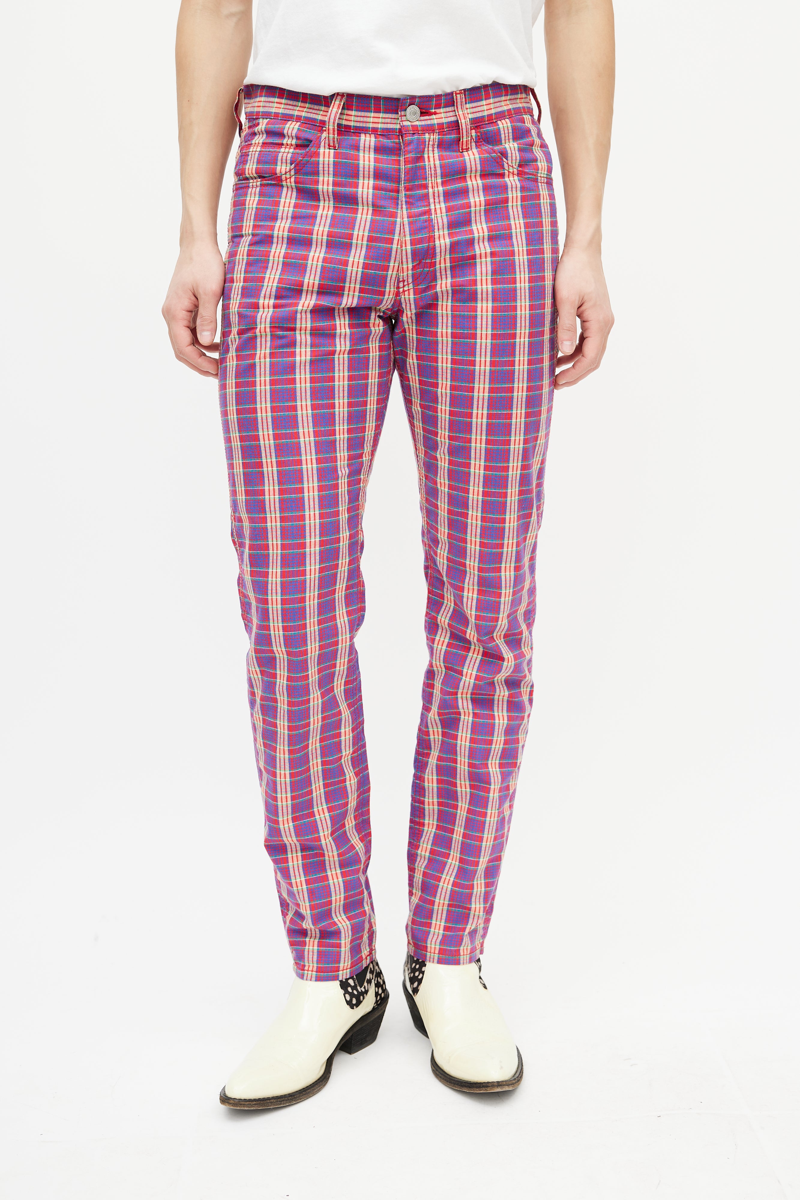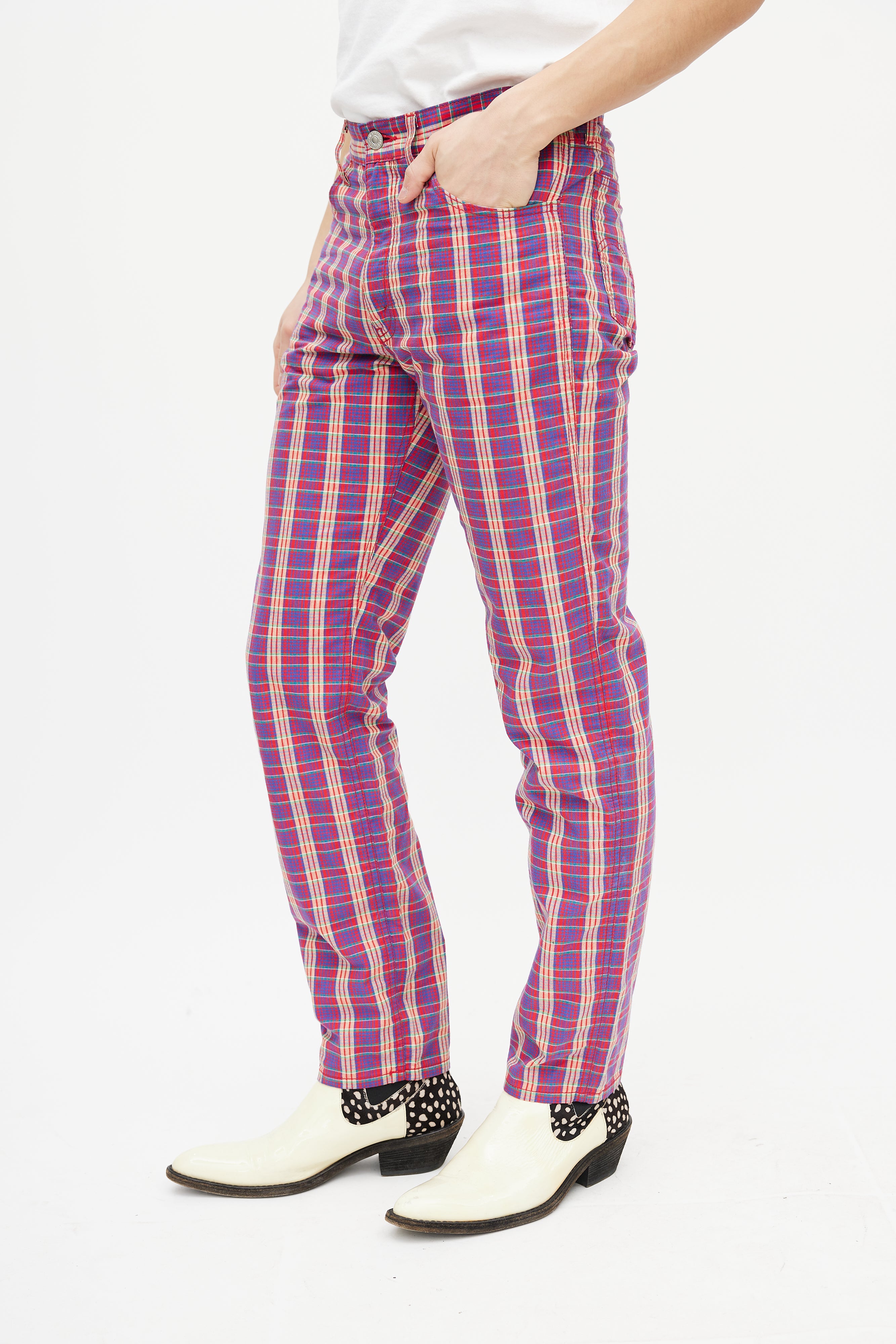 Pre-owned Junya Watanabe x Levis purple trousers featuring a multicolour plaid pattern throughout, five pocket styling, slim leg, and zip fly with button closure.