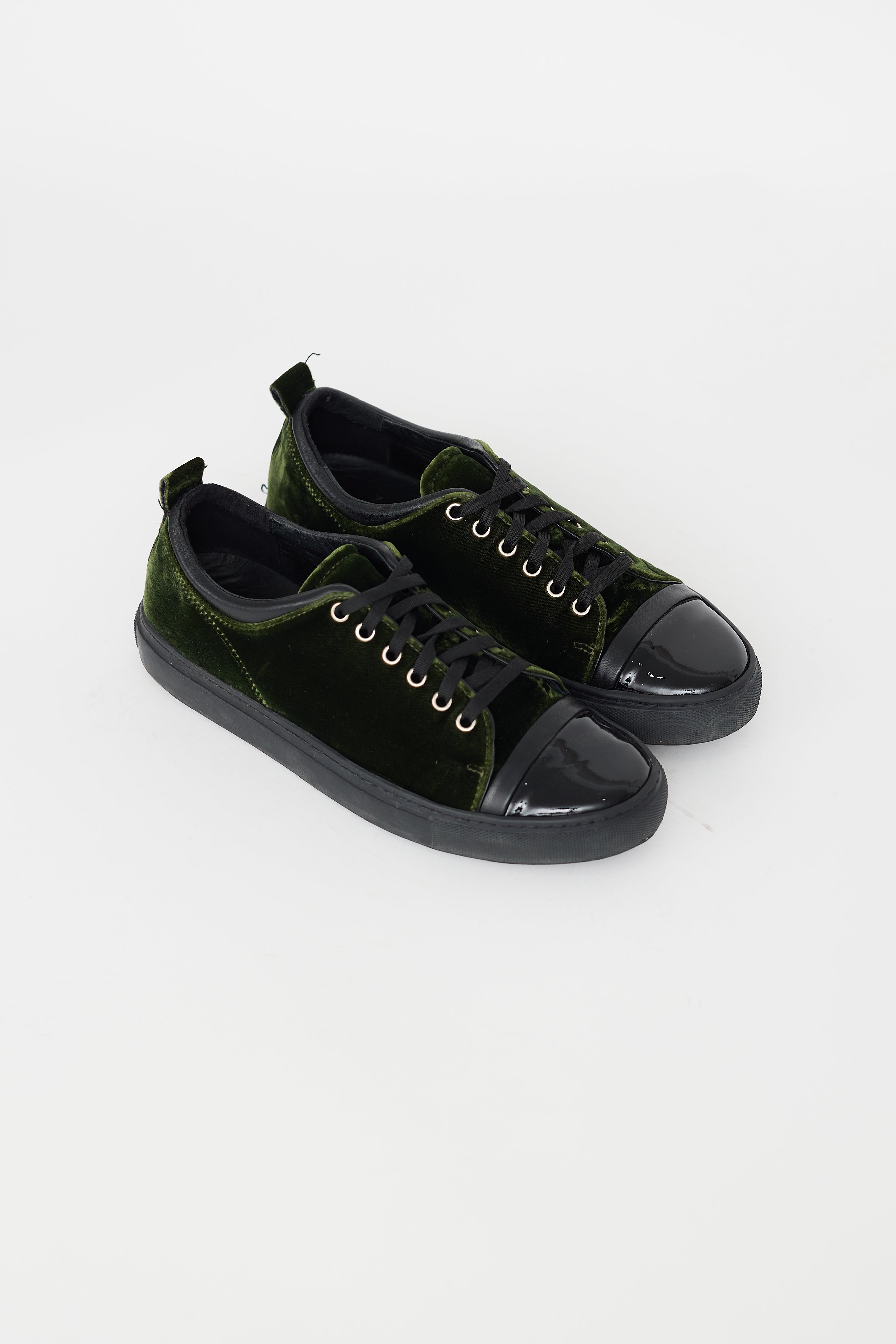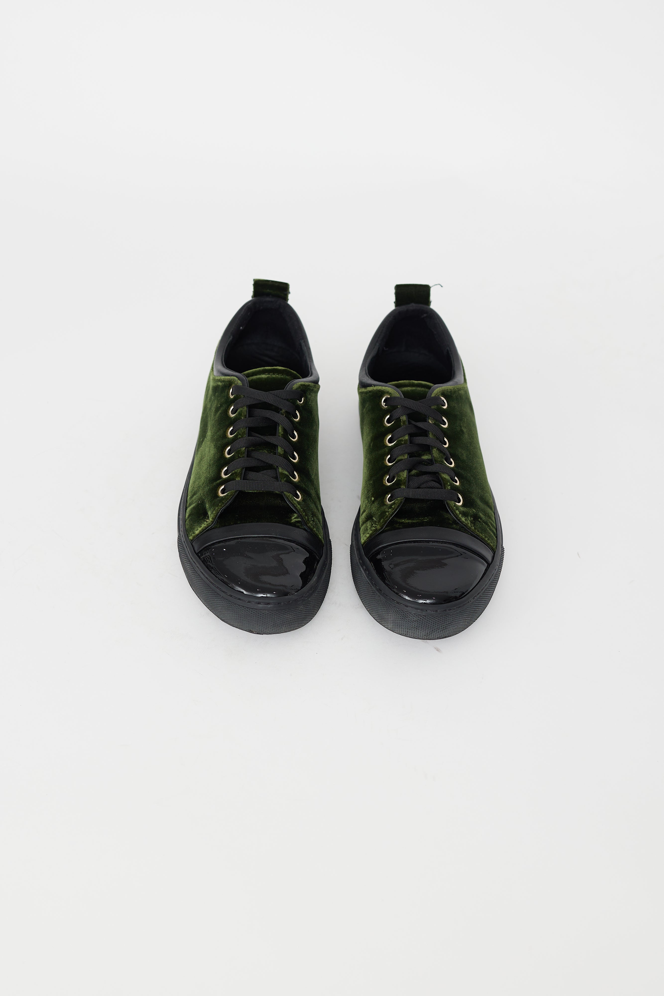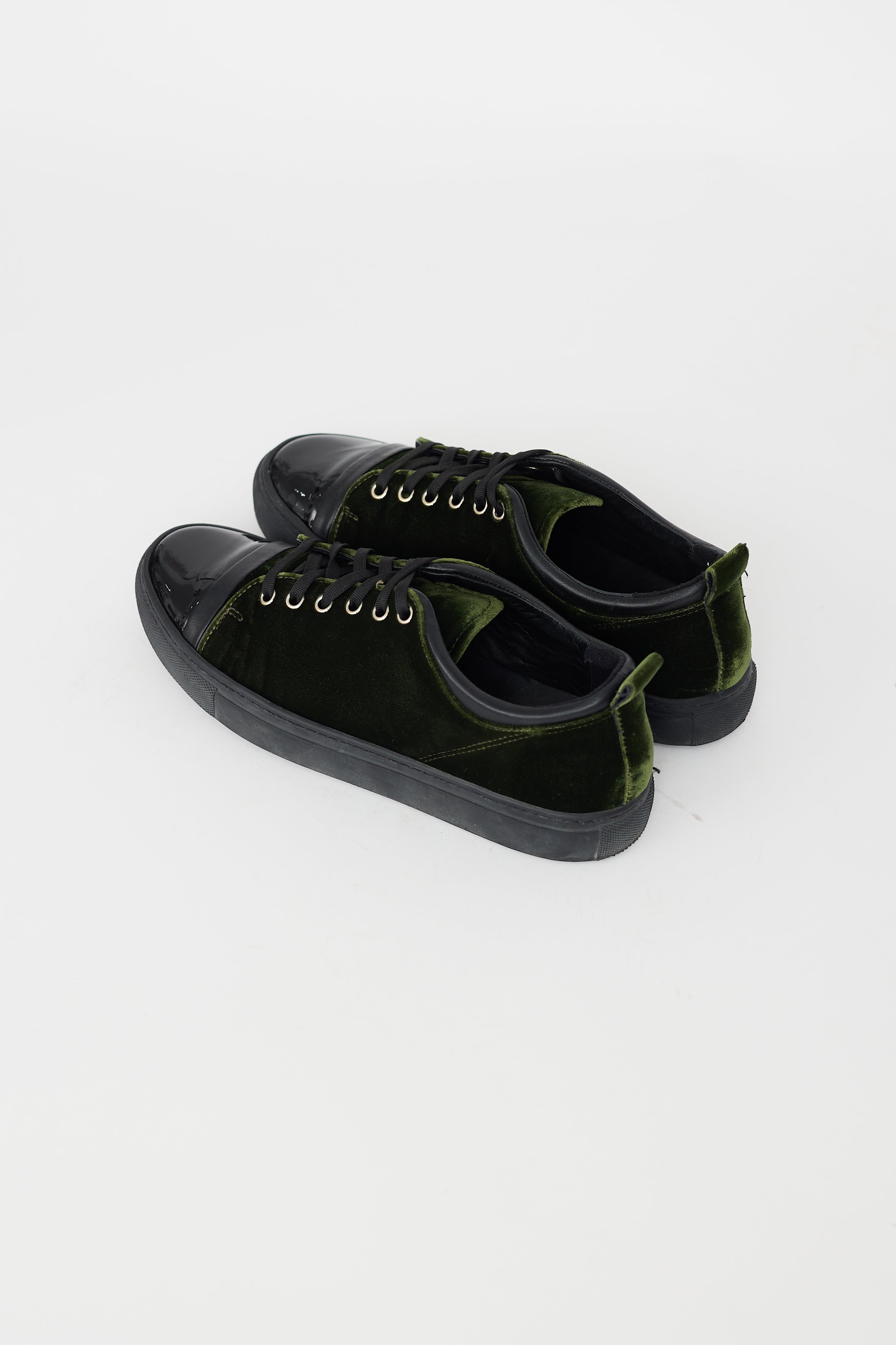 Pre-owned Lanvin sneakers featuring dark green velvet upper, velvet pull loop at counter, black patent leather cap toe, black lace up front, and black rubber midsole. Comes with original box.